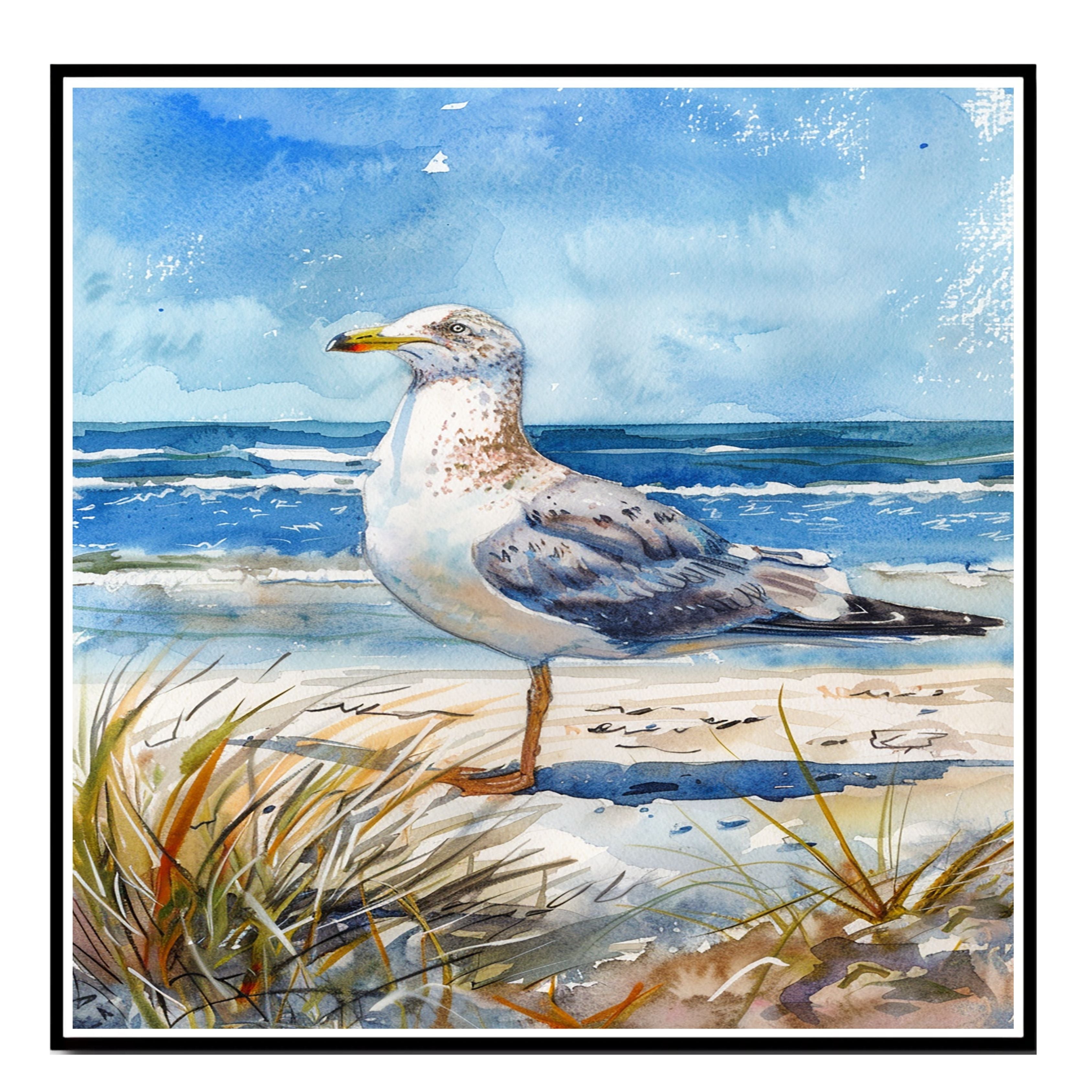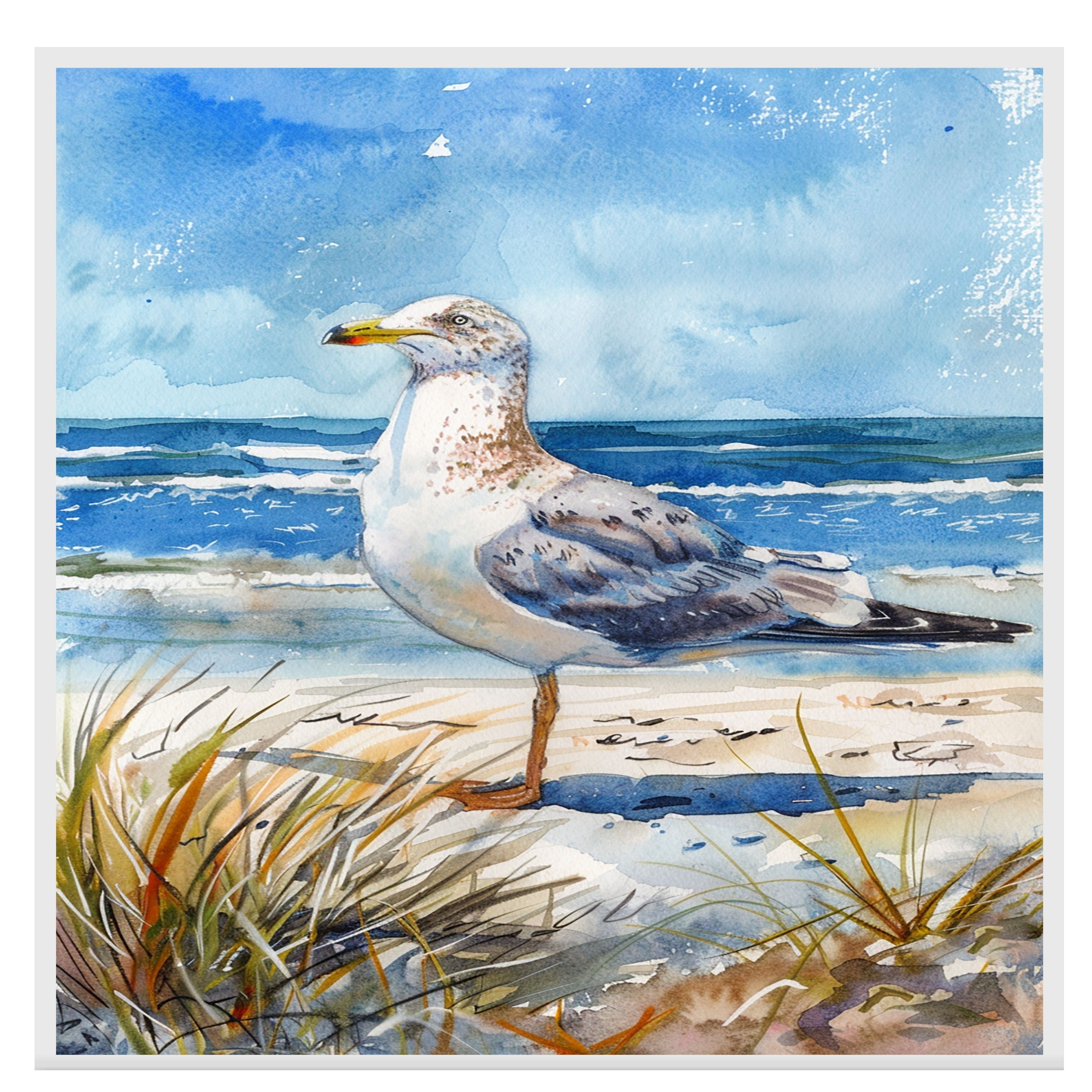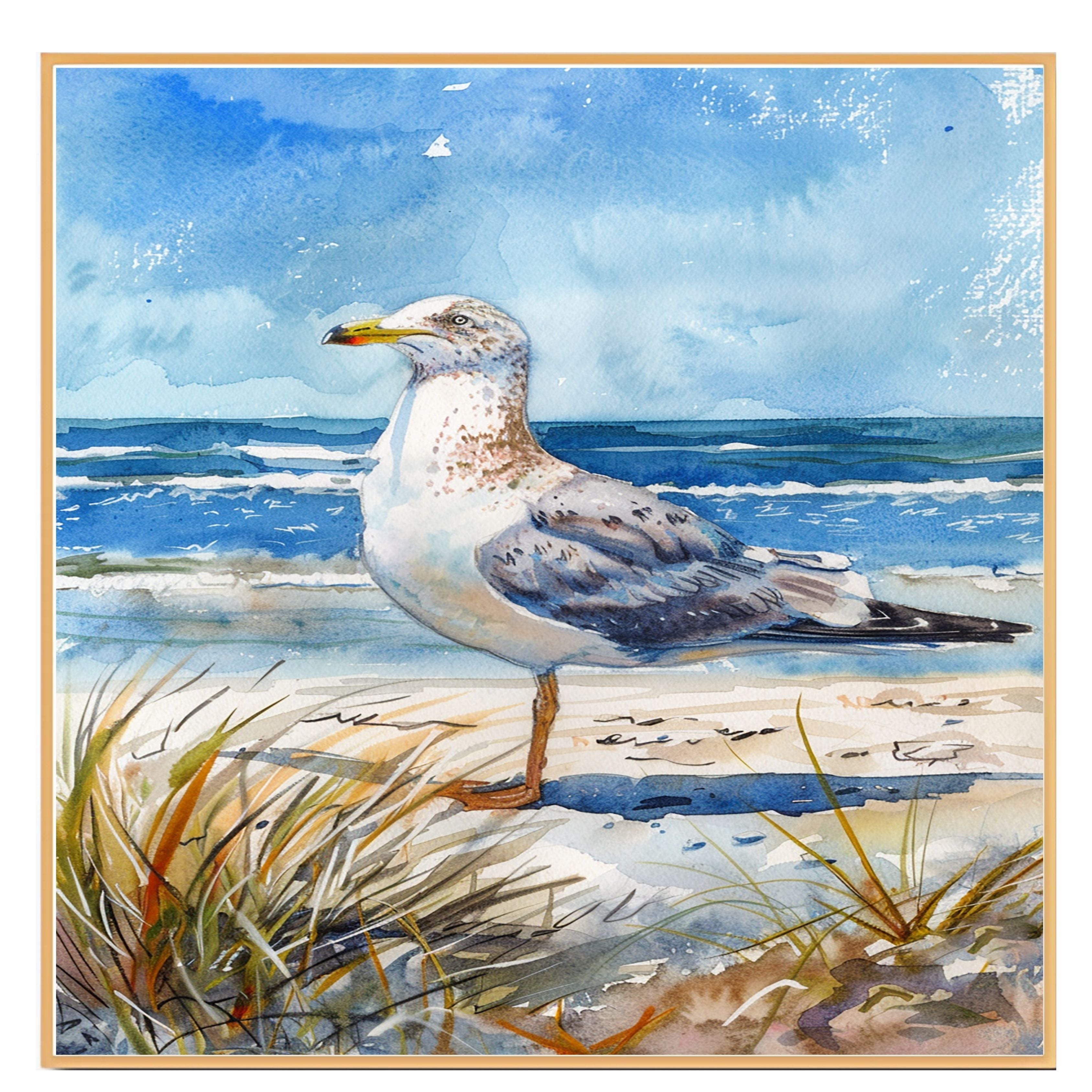 A tranquil watercolor painting of a seagull gazing over the waves from a sandy beach. A perfect tribute to coastal wildlife and ocean serenity.
