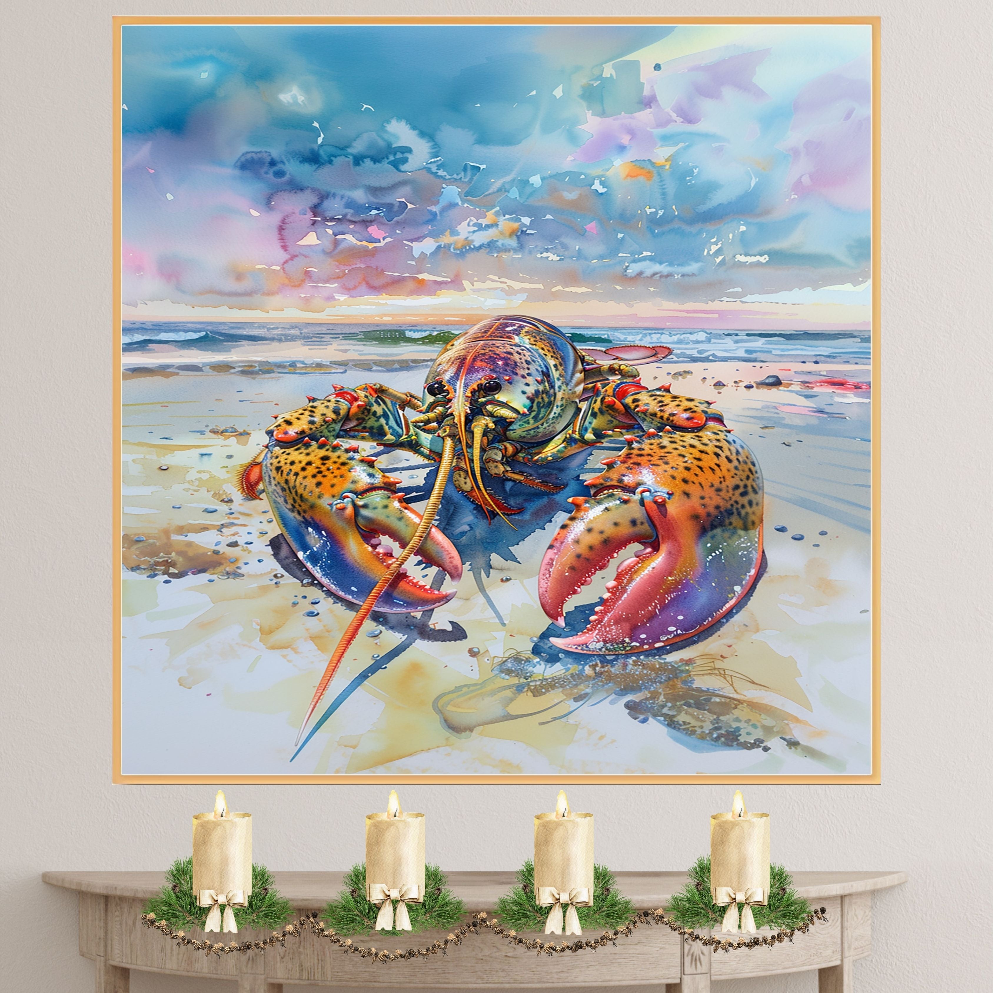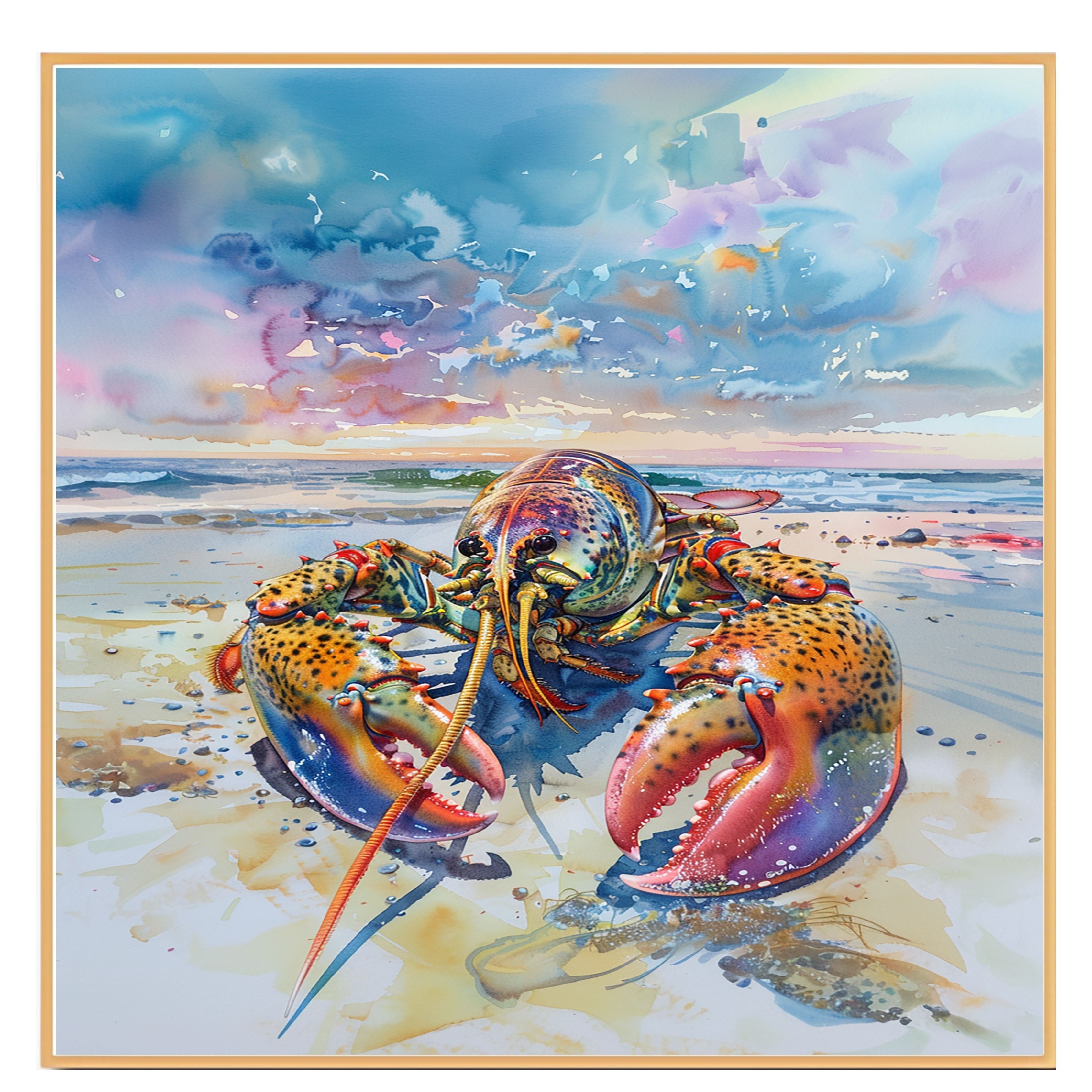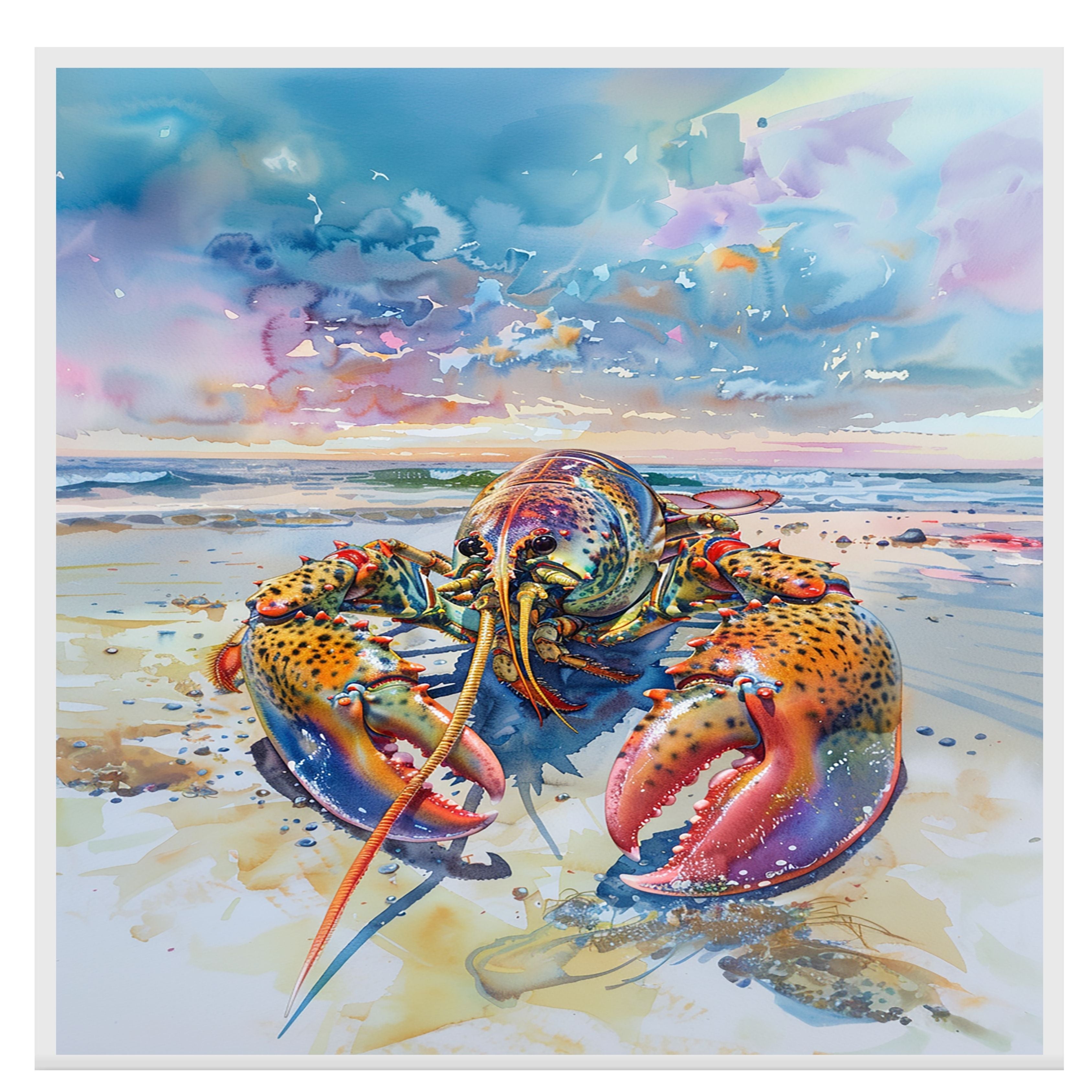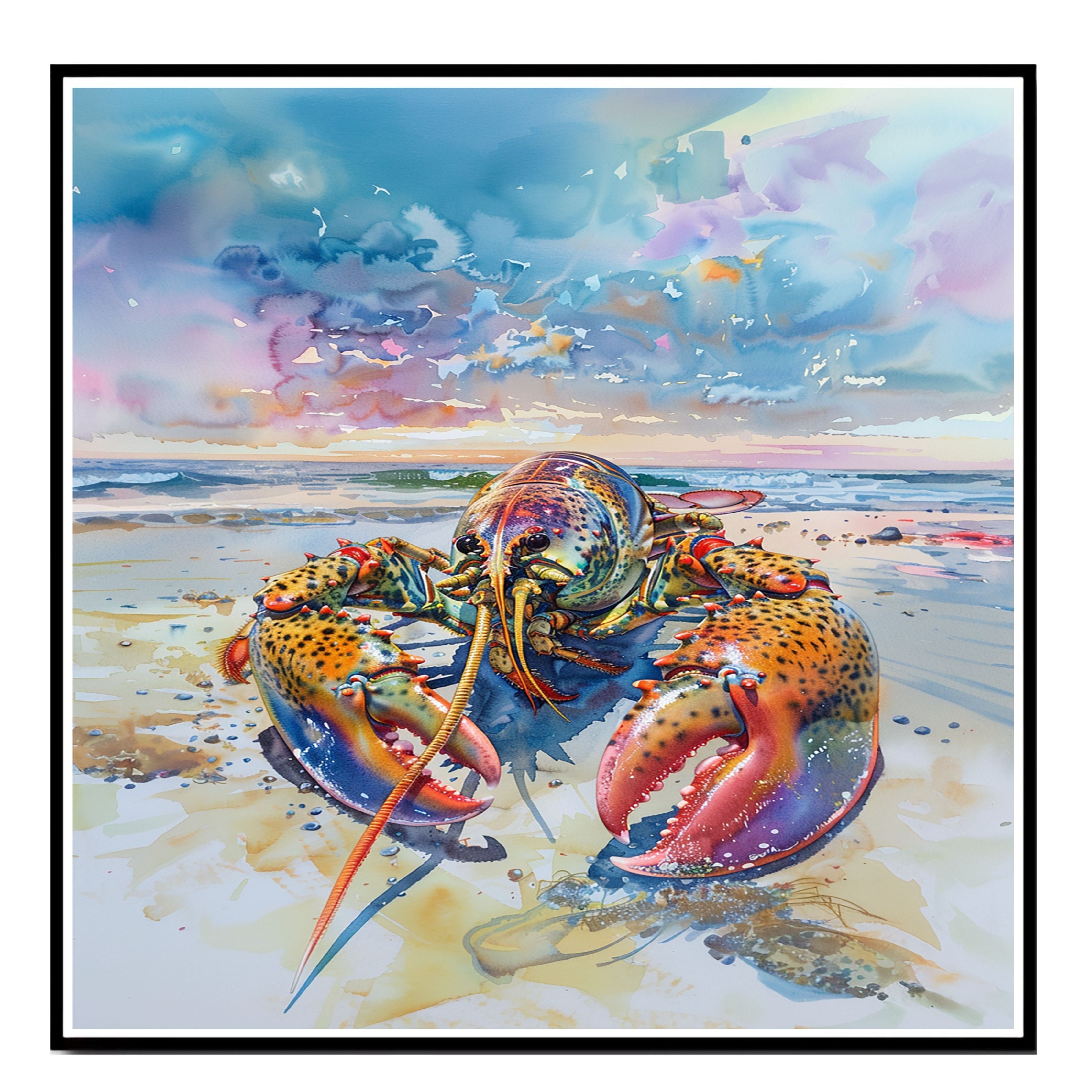 Add a splash of color and marine personality to your space with this striking watercolor painting of a vibrant lobster on the beach. Rich in detail and painted with bold blues, reds, and golds, the lobster stands against a serene shoreline and a dramatic, colorful sky. This artwork is perfect for seafood lovers, coastal decor fans, or anyone drawn to bold ocean-inspired art. It brings both whimsy and elegance to any setting.