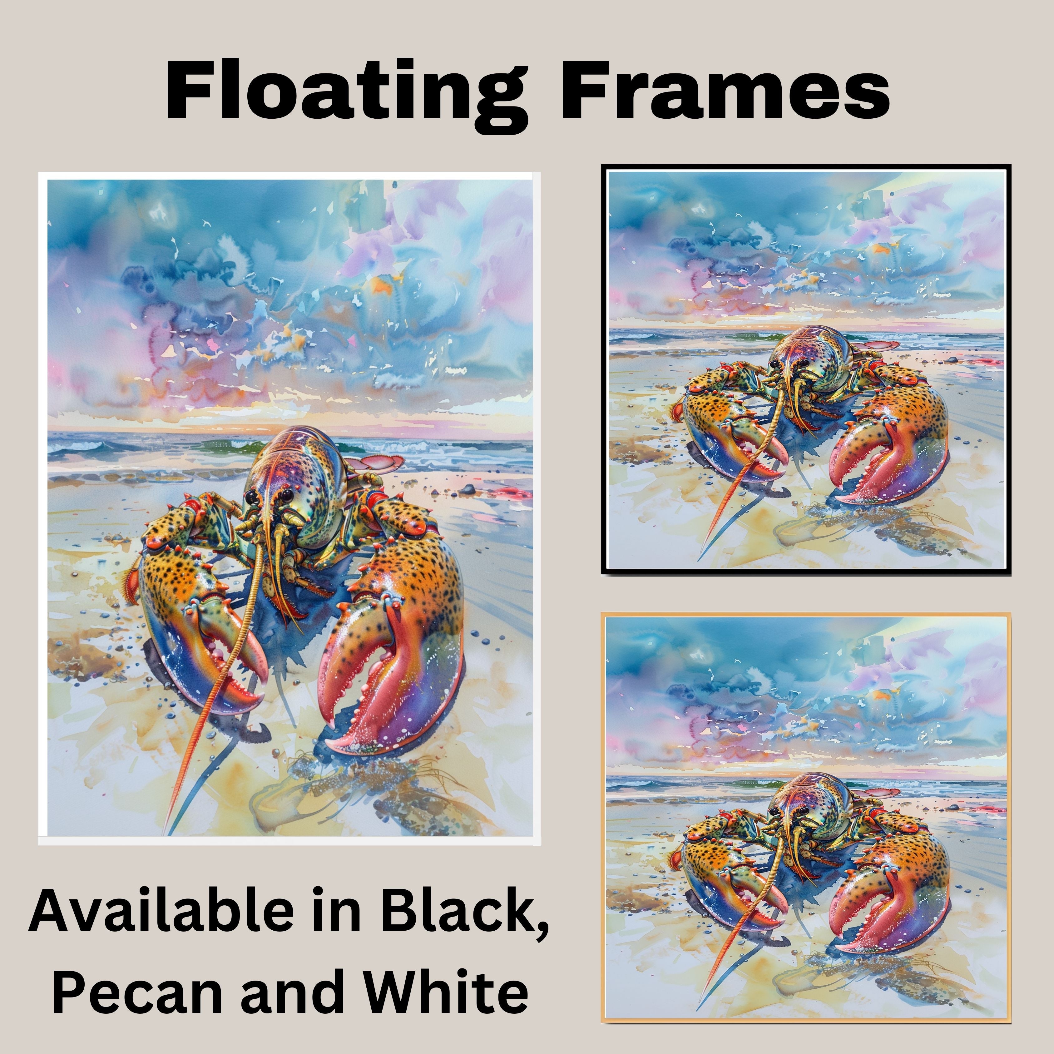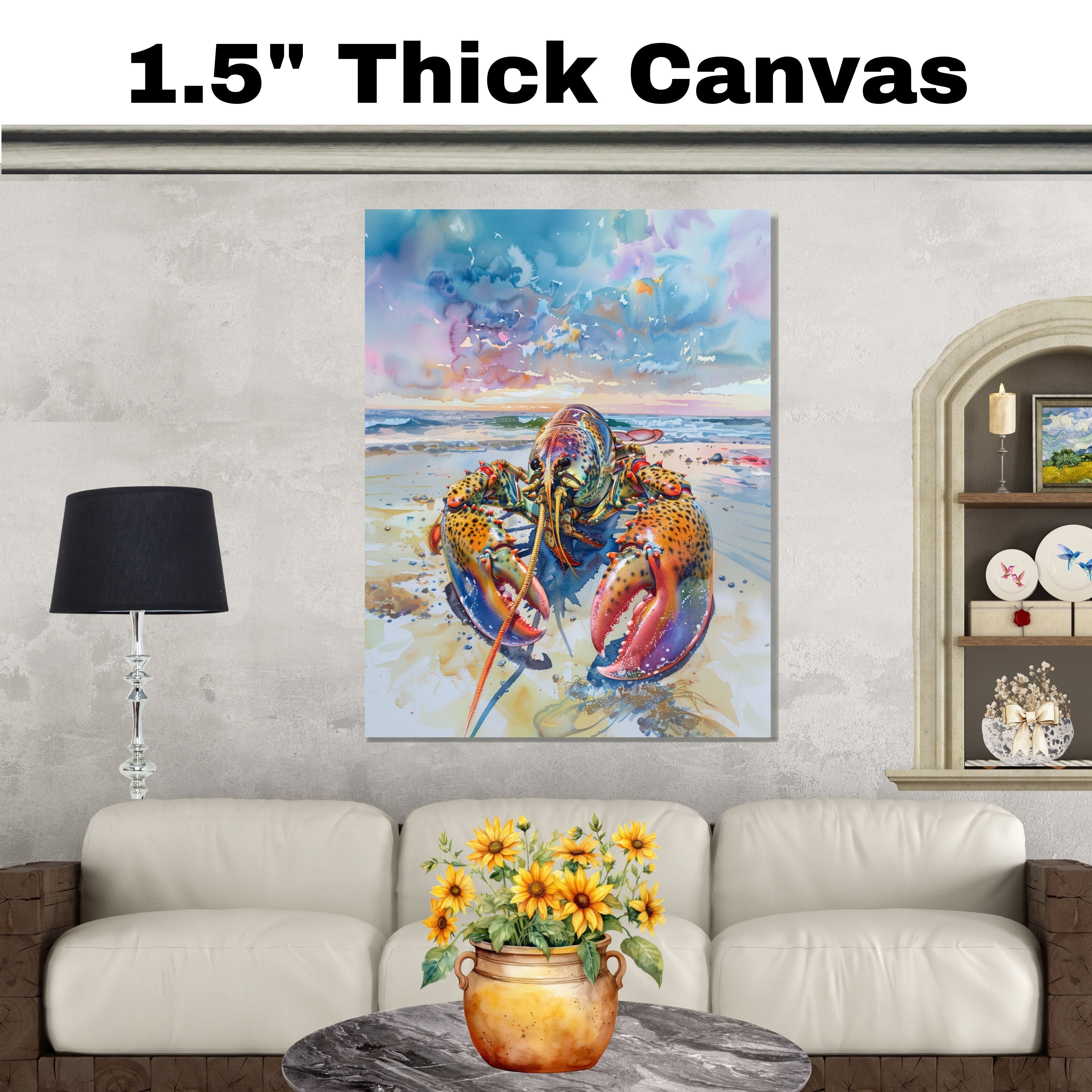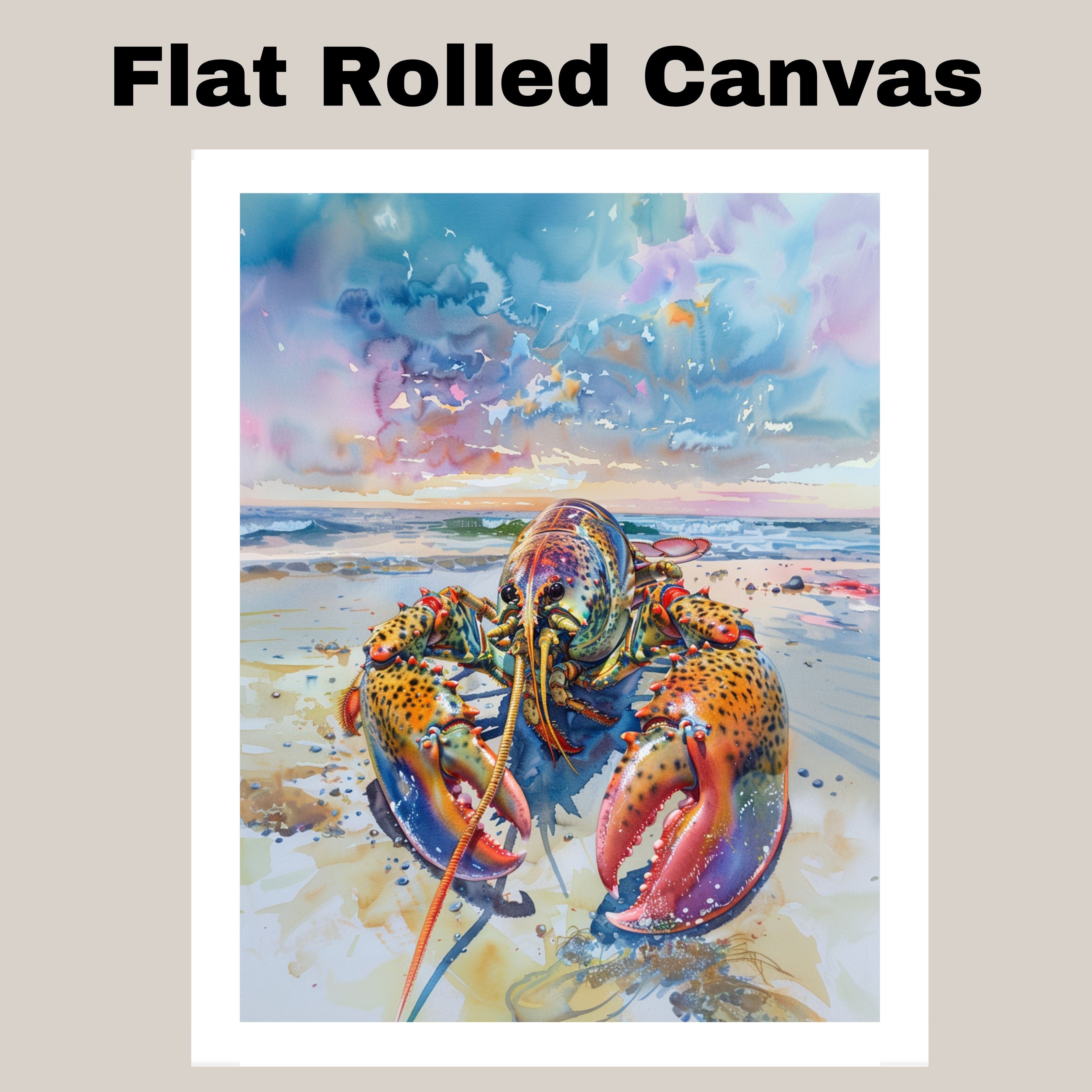 Watercolor Painting of a Vibrant Lobster on the Beach with Ocean Waves and Dramatic Sky in Coastal Marine Style on Ready to Hang 1.5" Thick Canvas Wrap, Floating Framed Canvas, Flat Rolled Canvas