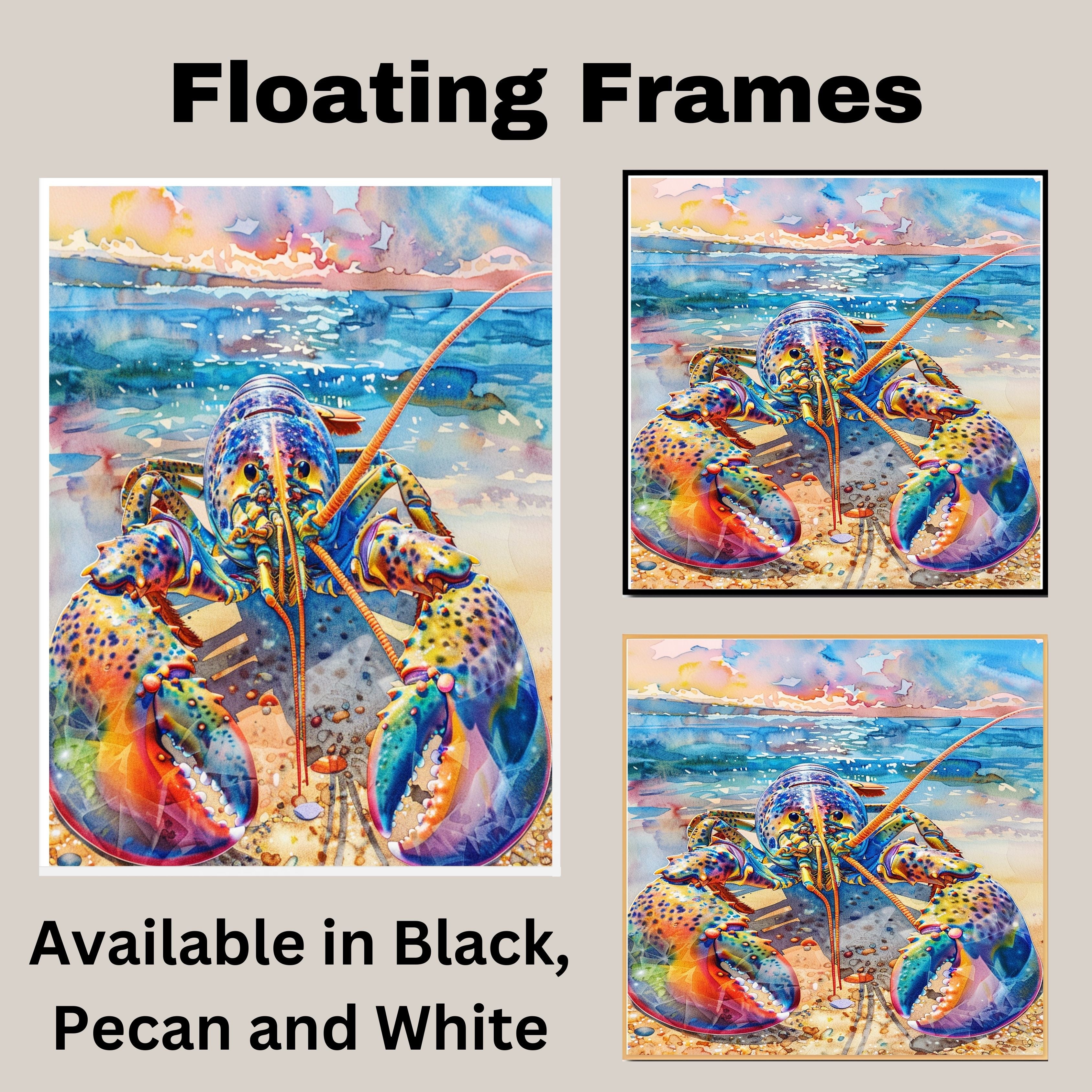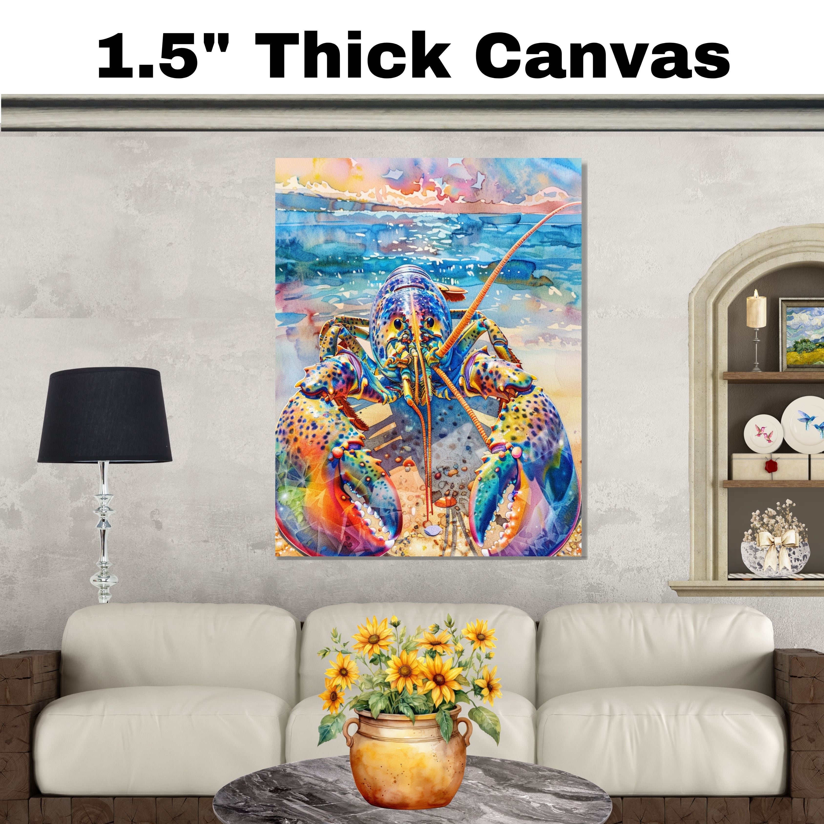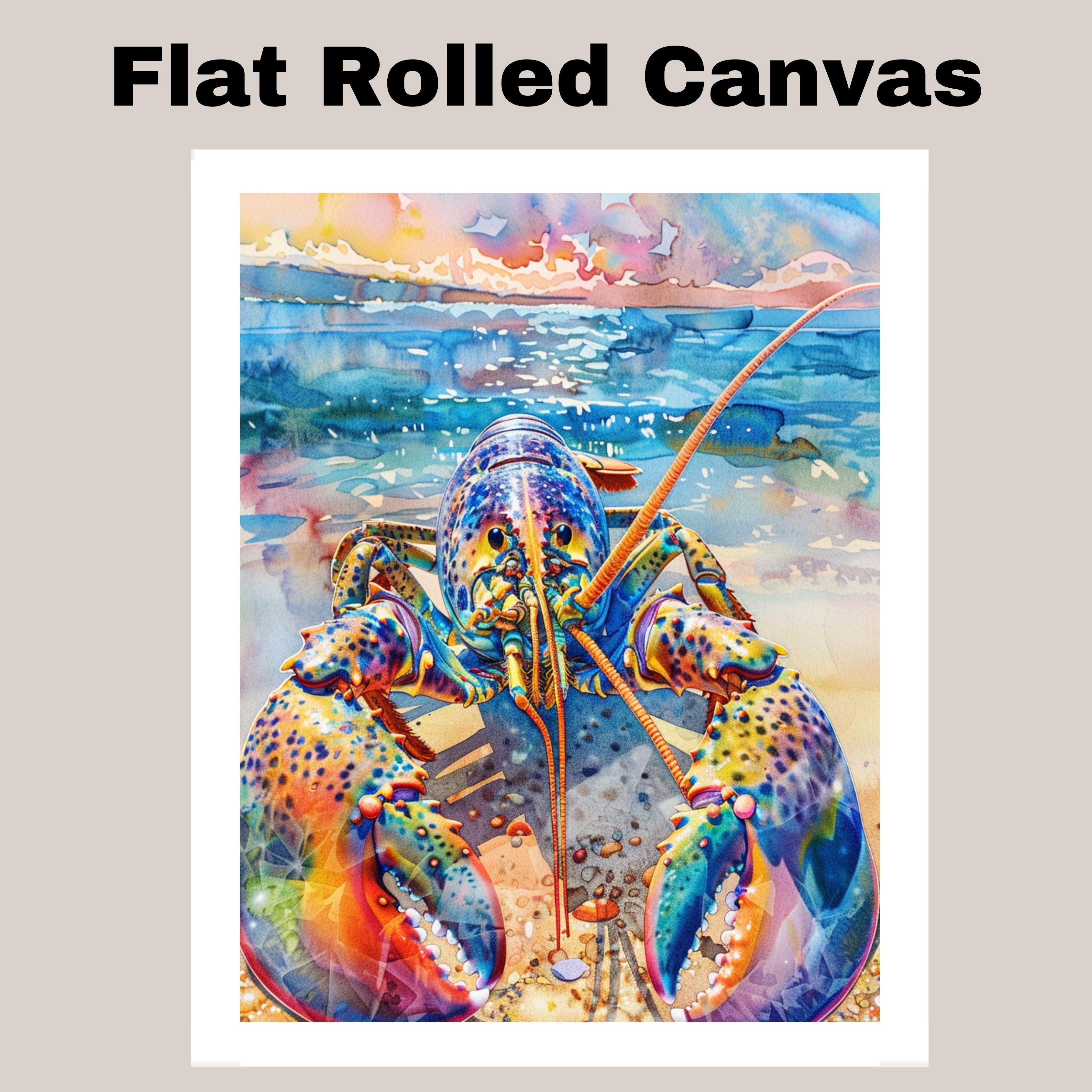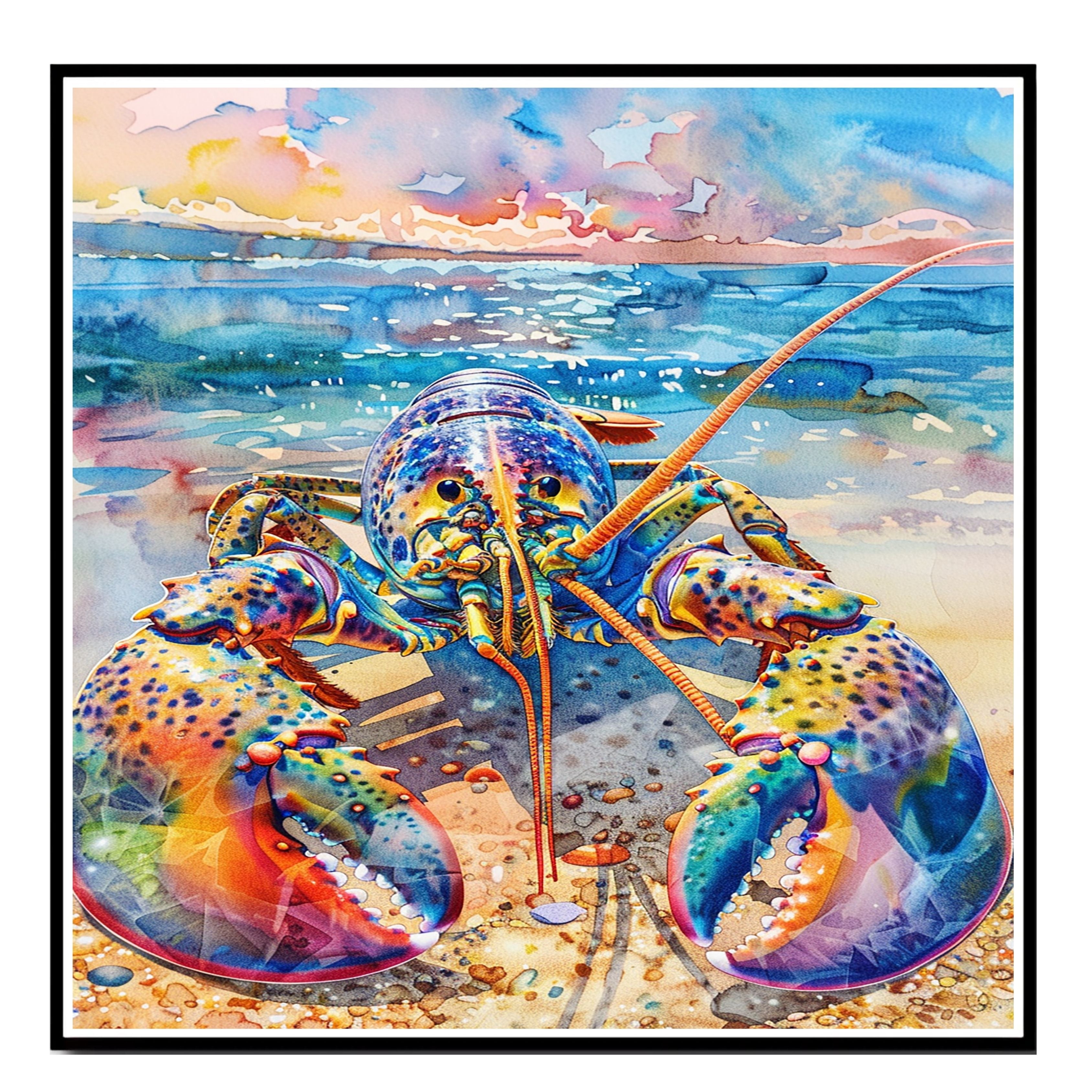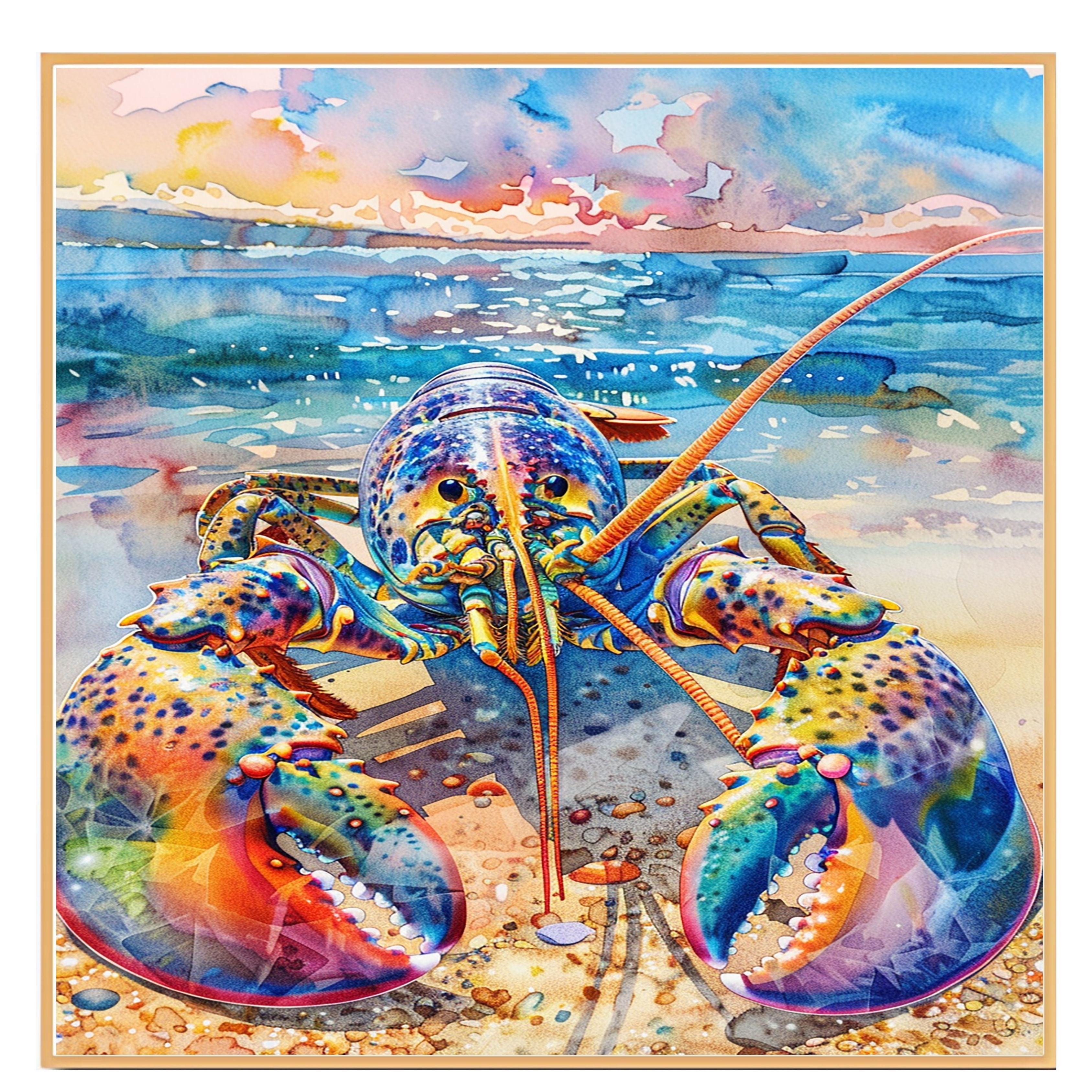 This vivid watercolor painting captures a striking multicolored lobster resting on a pebble-strewn beach, with the ocean stretching out behind it under a luminous, multihued sky. Rich details and rainbow tones bring the lobster to life, blending marine realism with artistic expression. Ideal for coastal spaces, seafood enthusiasts, or ocean art collectors, this piece radiates personality, charm, and coastal adventure.