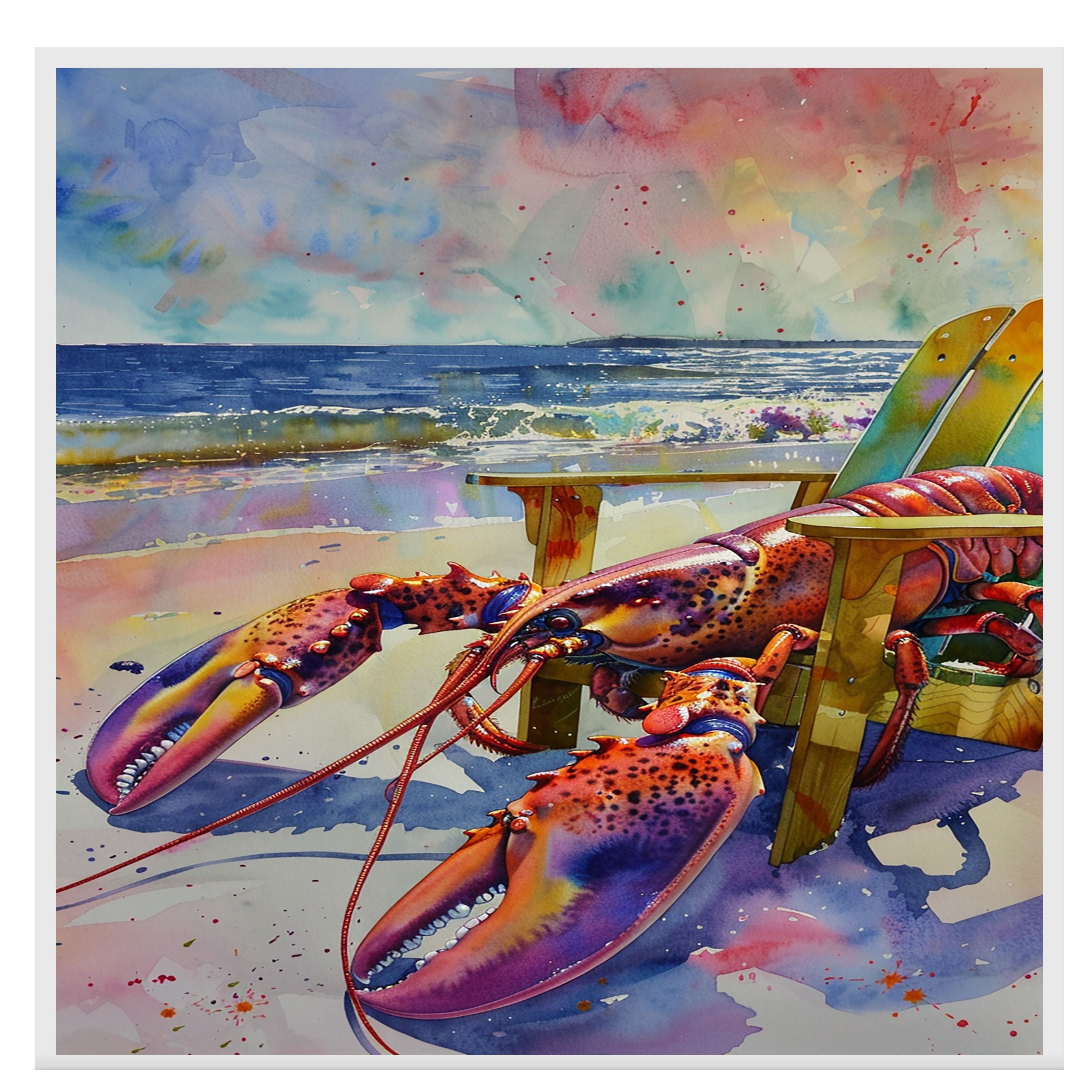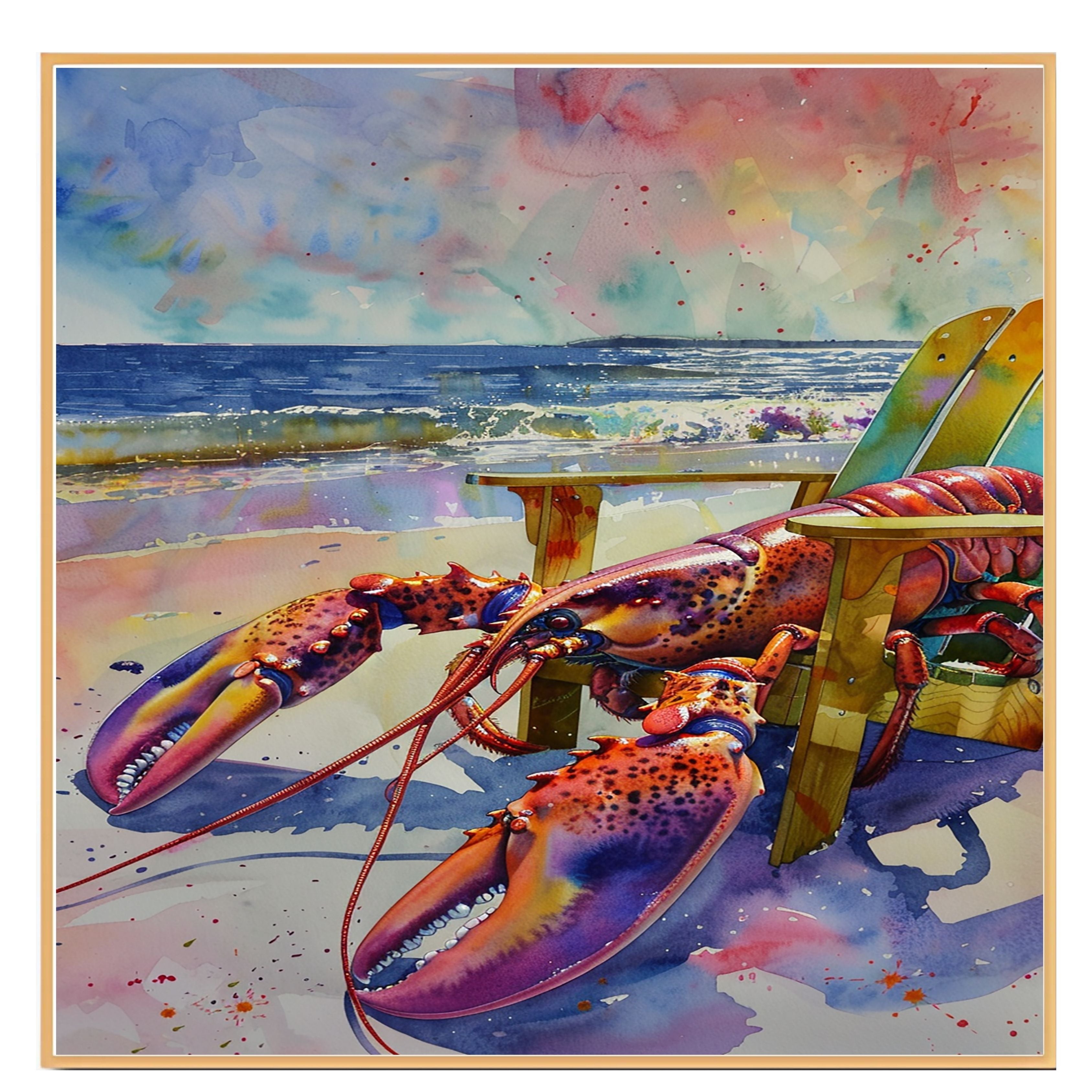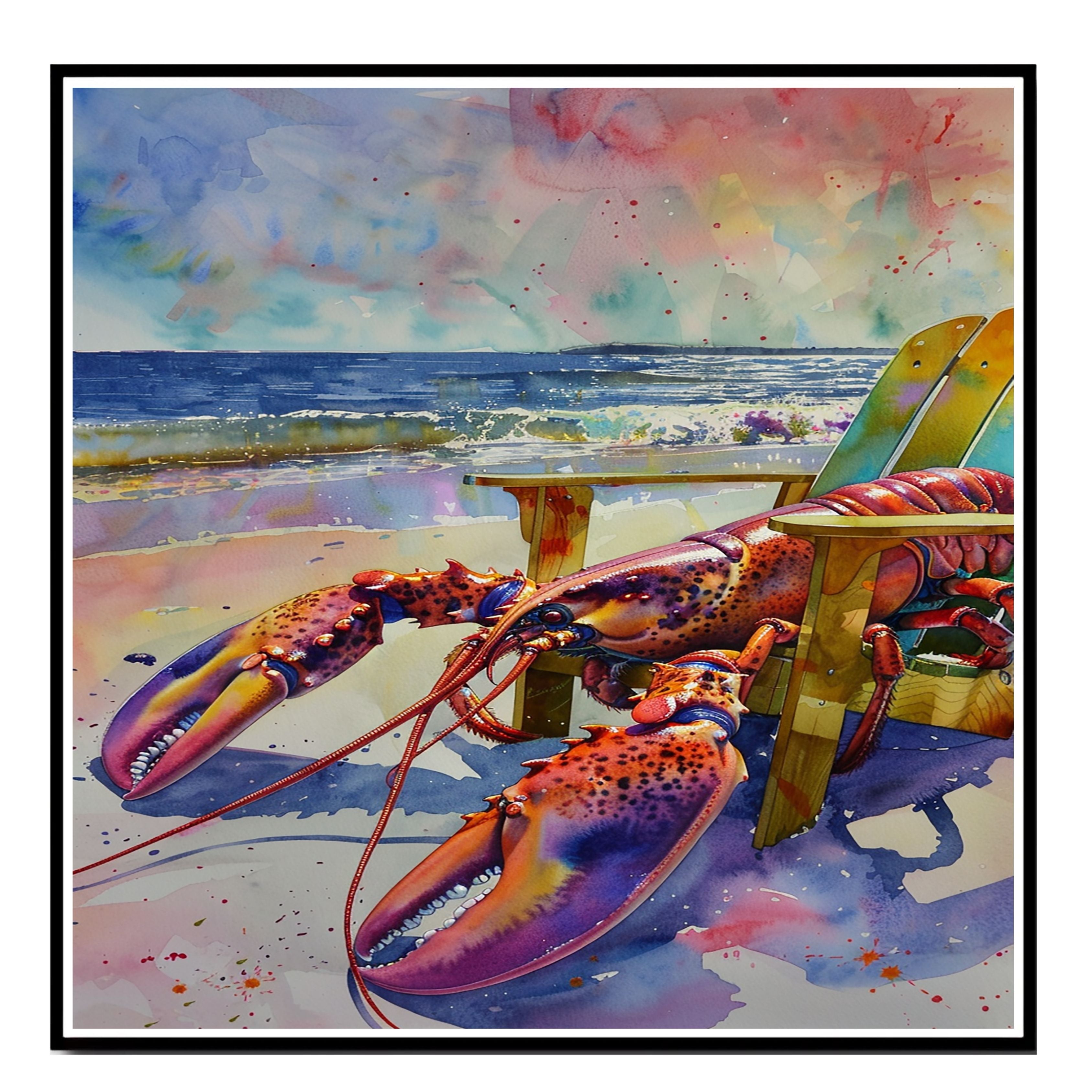 This playful watercolor artwork captures a whimsical scene of a multicolored lobster lounging on a wooden beach chair by the ocean. Rich in color and personality, the lobster’s vibrant hues of red, blue, and orange pop against the soft sand, rolling waves, and a dreamy pastel sunset. Perfect for beach lovers, coastal kitchens, or anyone with a love for quirky marine life, this piece adds a burst of fun and charm to any space.