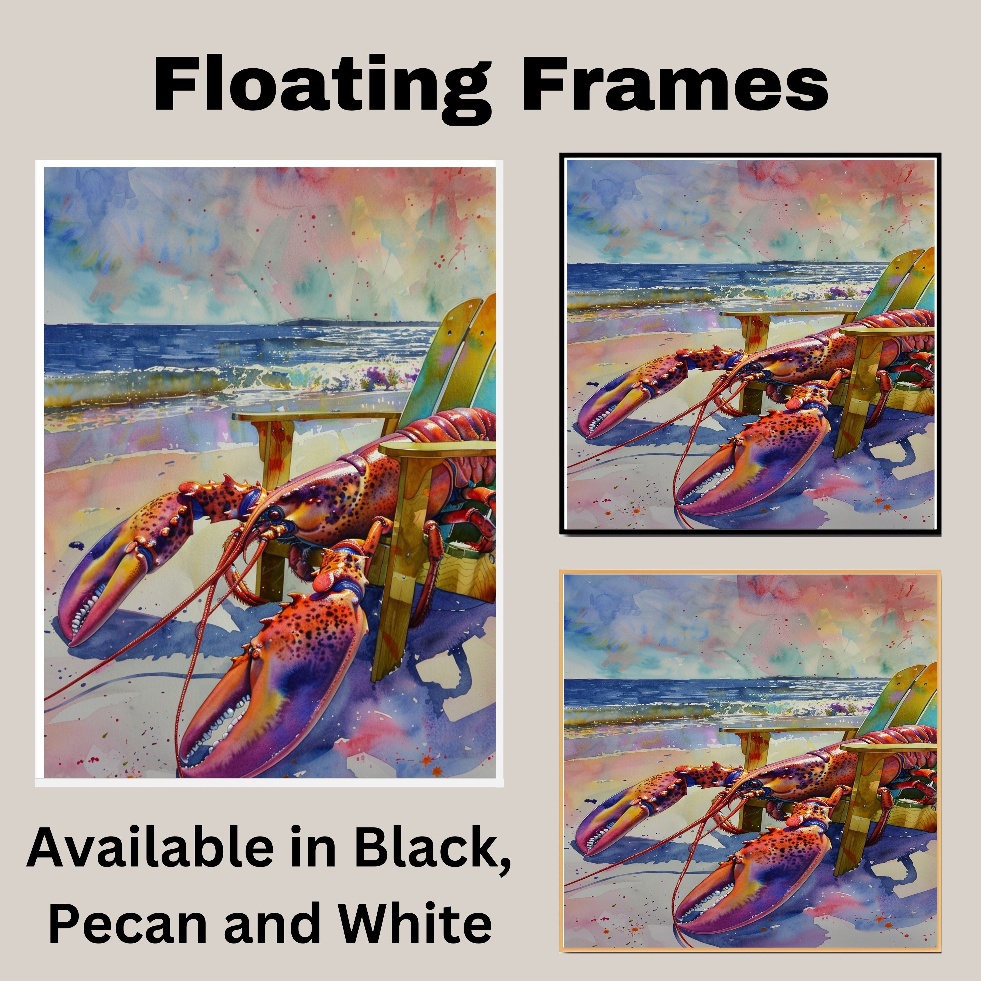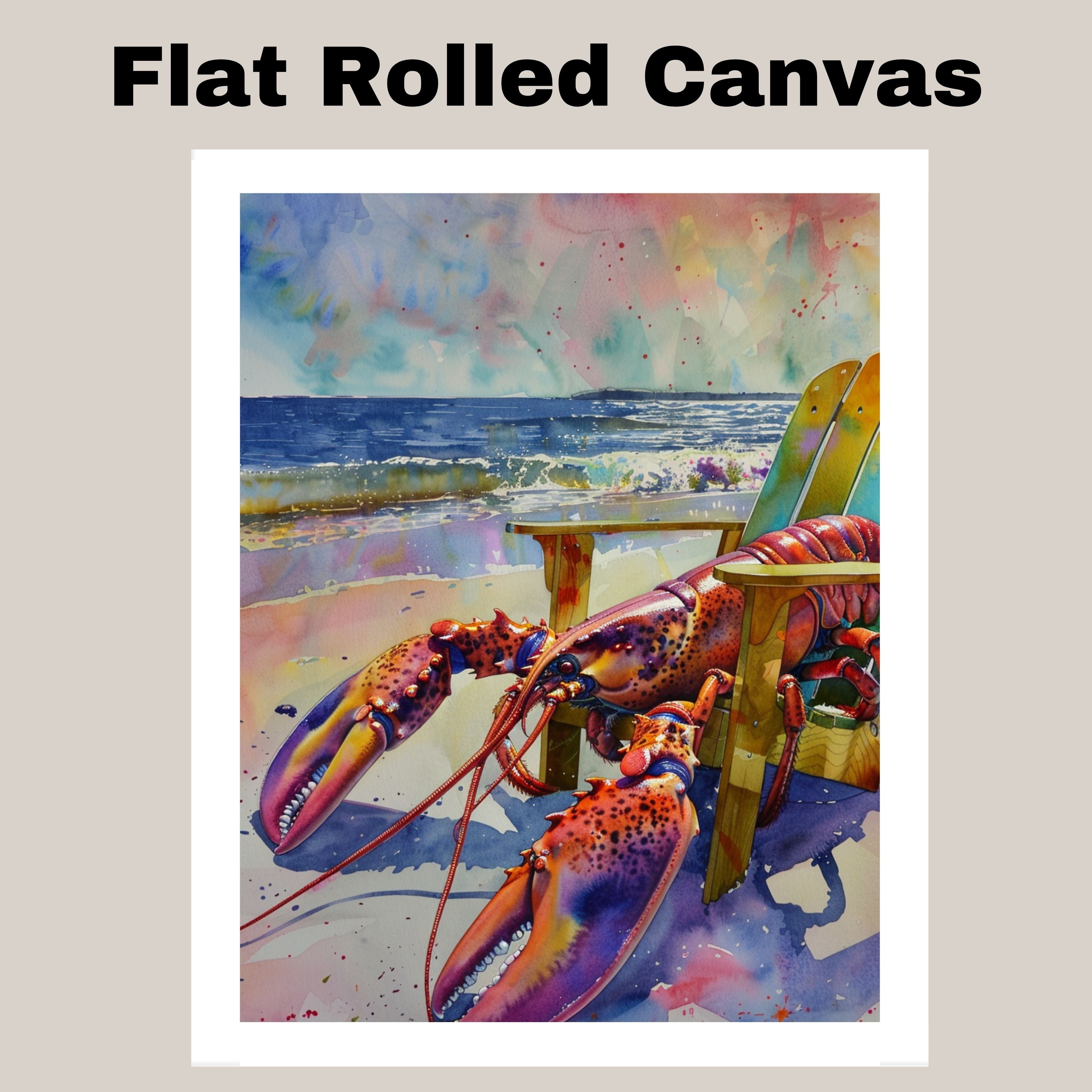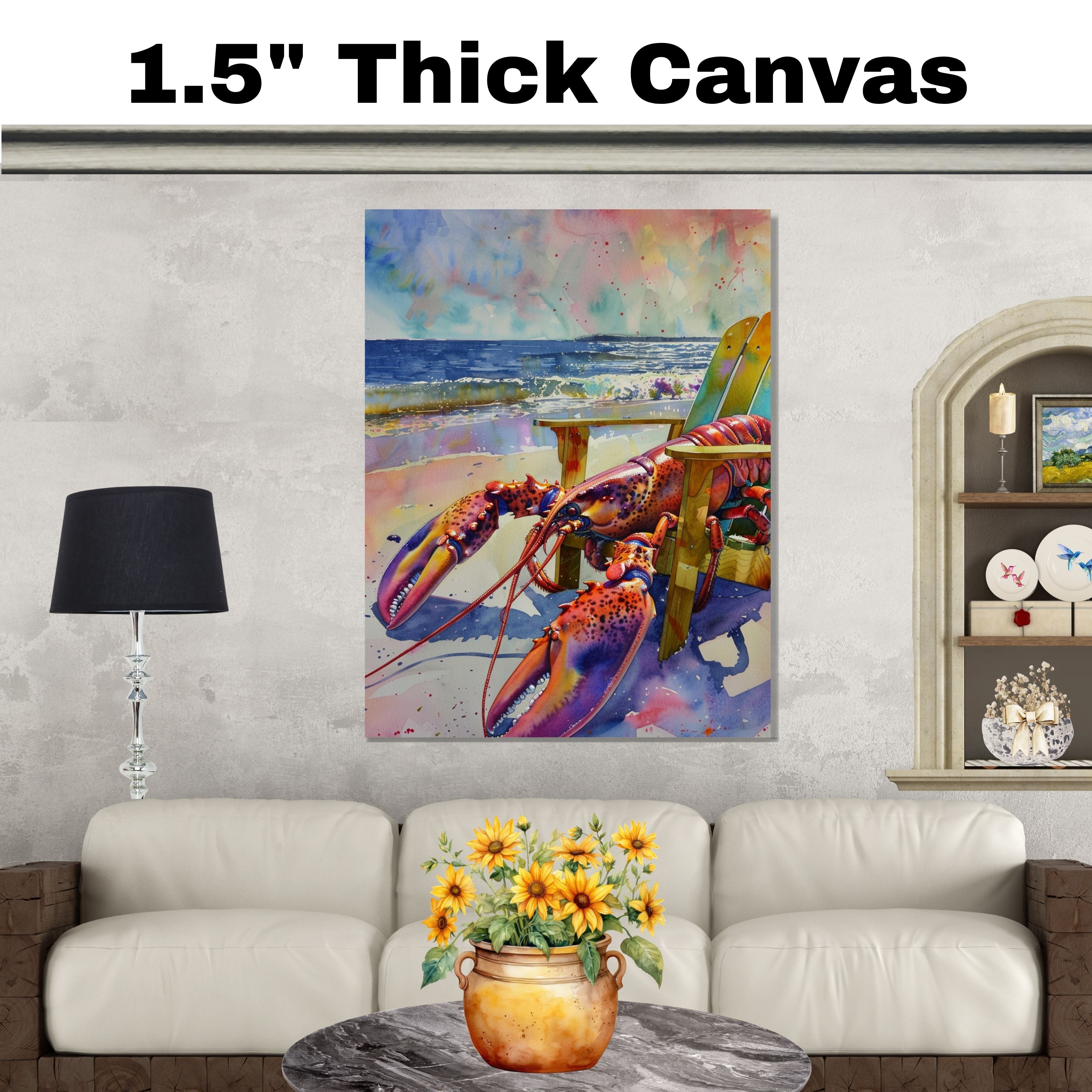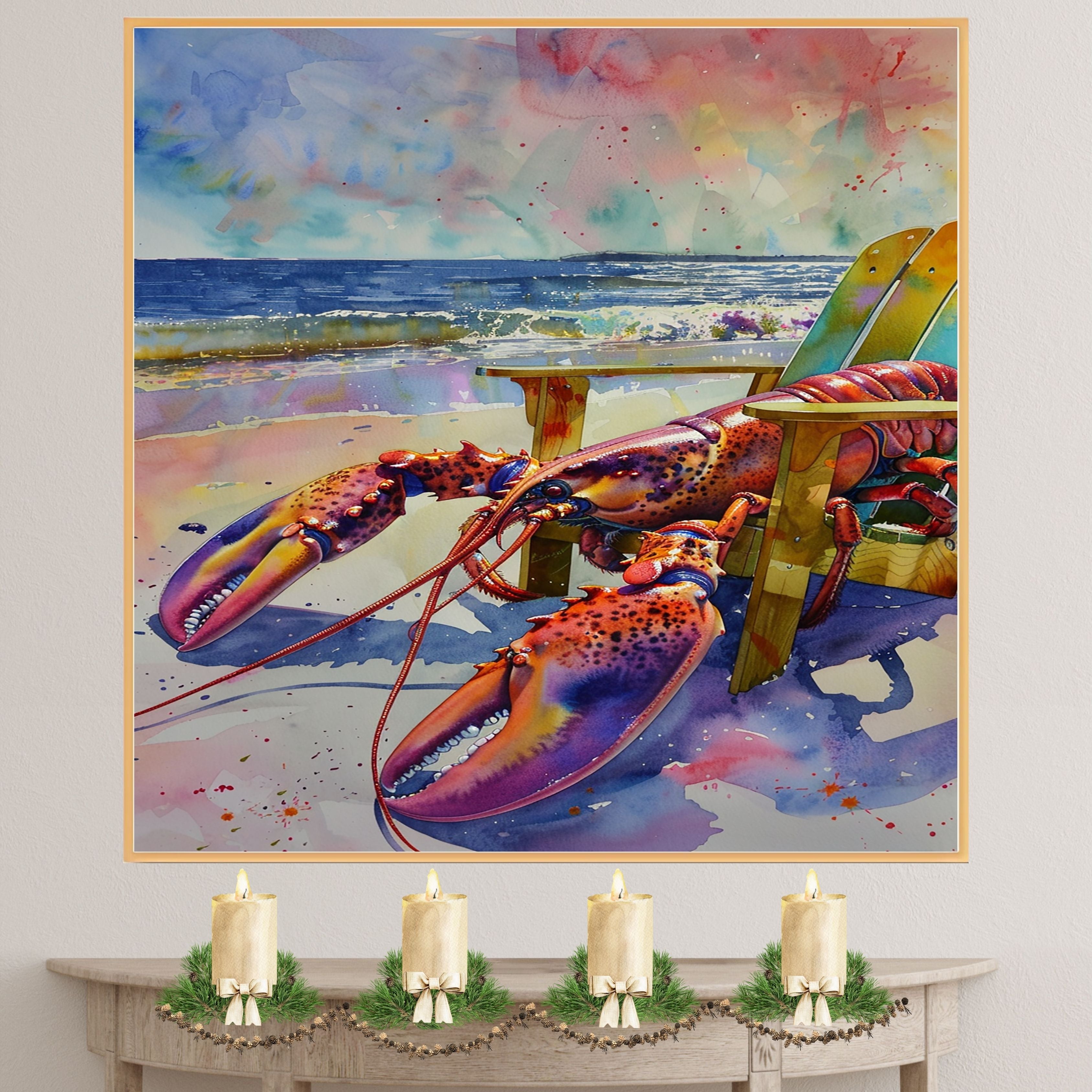 This playful watercolor artwork captures a whimsical scene of a multicolored lobster lounging on a wooden beach chair by the ocean. Rich in color and personality, the lobster’s vibrant hues of red, blue, and orange pop against the soft sand, rolling waves, and a dreamy pastel sunset. Perfect for beach lovers, coastal kitchens, or anyone with a love for quirky marine life, this piece adds a burst of fun and charm to any space.