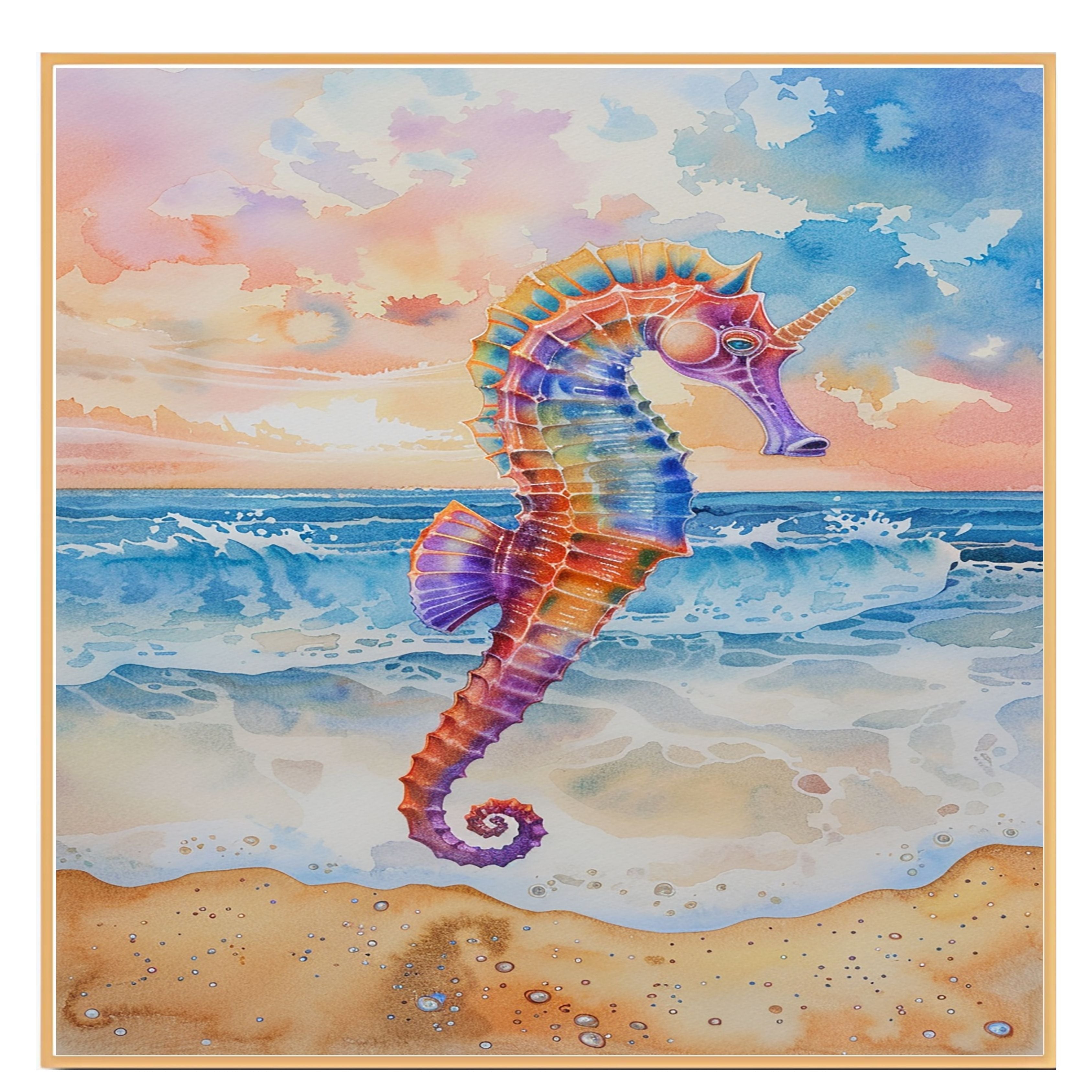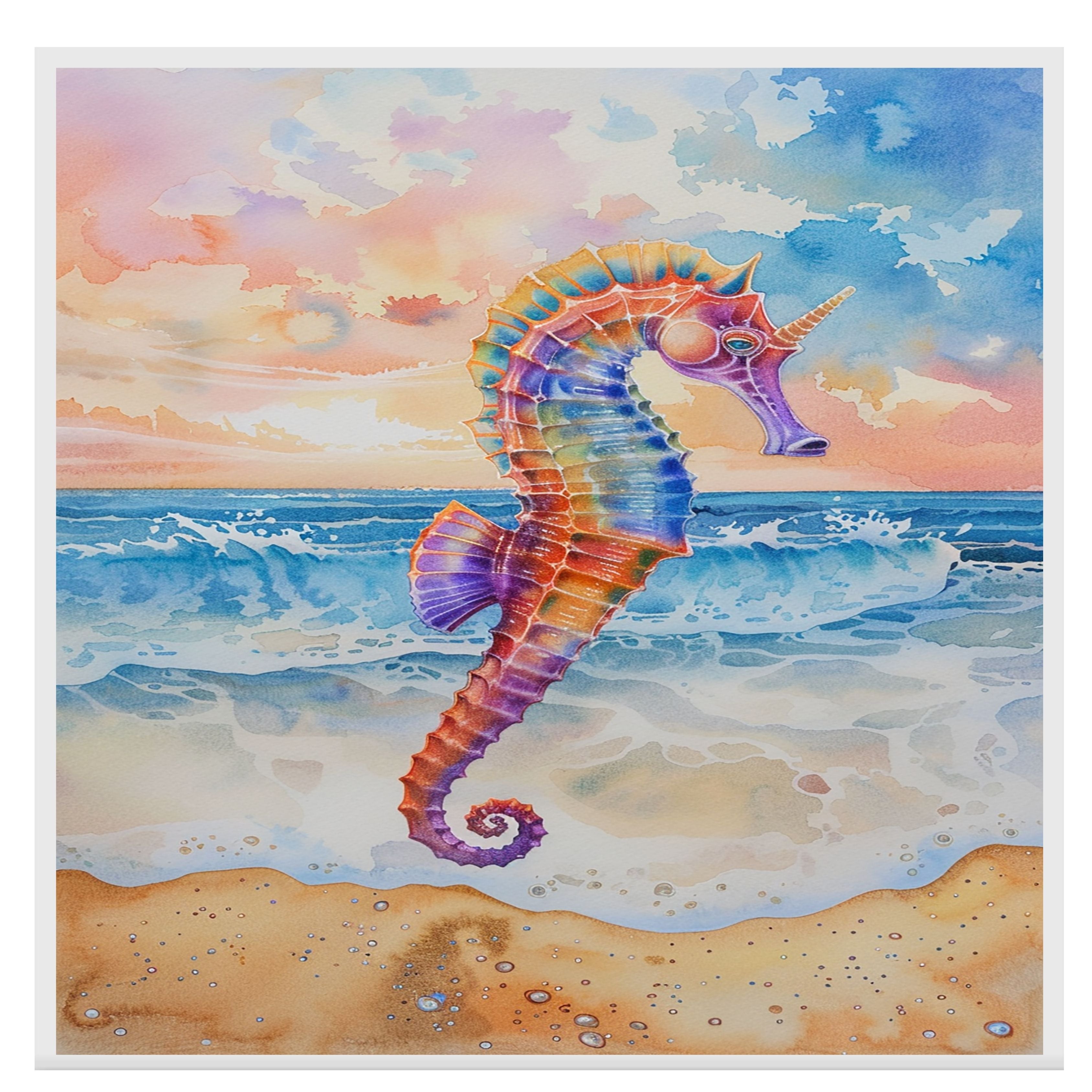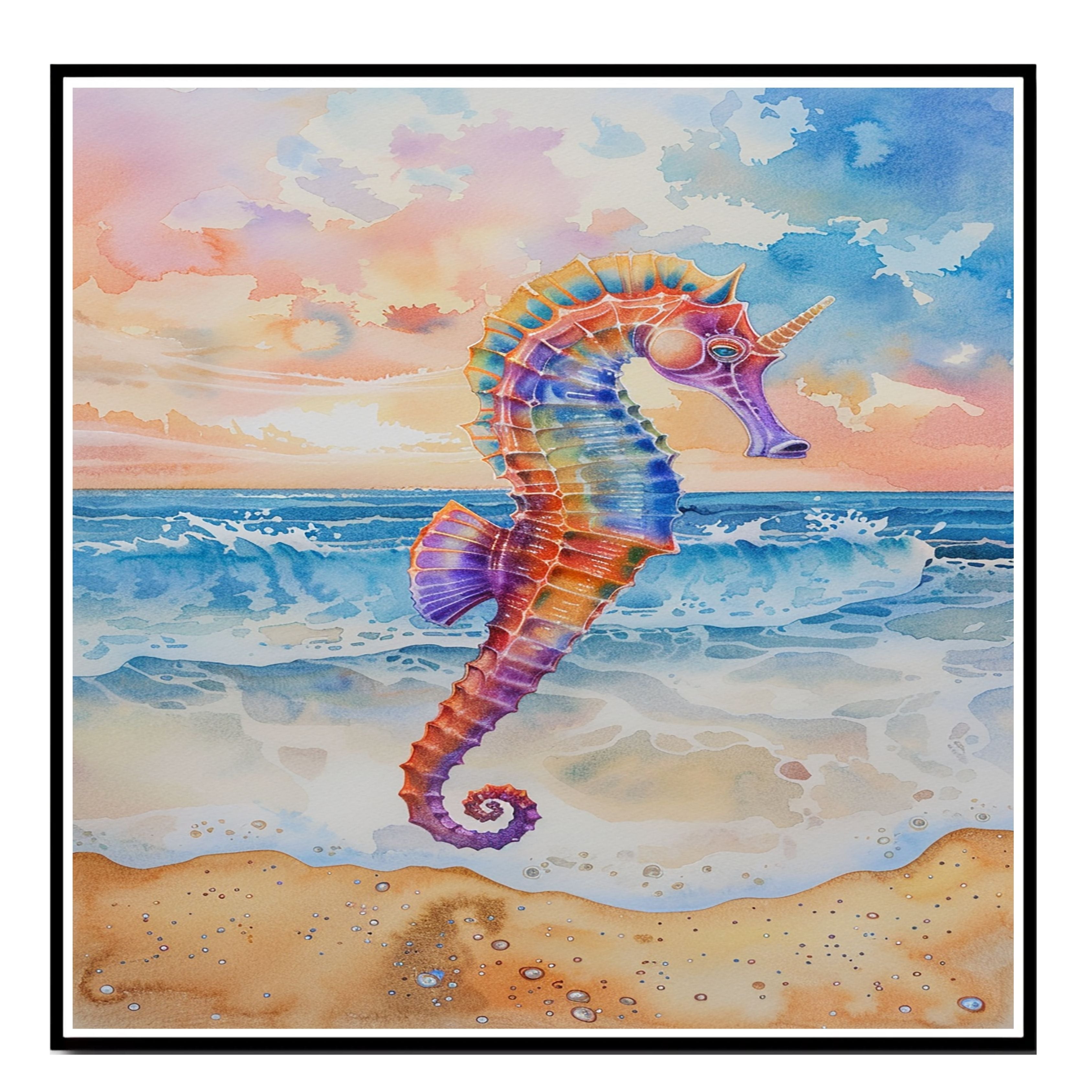 Immerse yourself in coastal charm with this vibrant watercolor painting of a whimsical seahorse. Perched where waves meet sand, the seahorse features a kaleidoscope of colors that reflect the gentle ocean light and dreamy sunset sky. A delightful nautical scene for sea life lovers and beach enthusiasts.