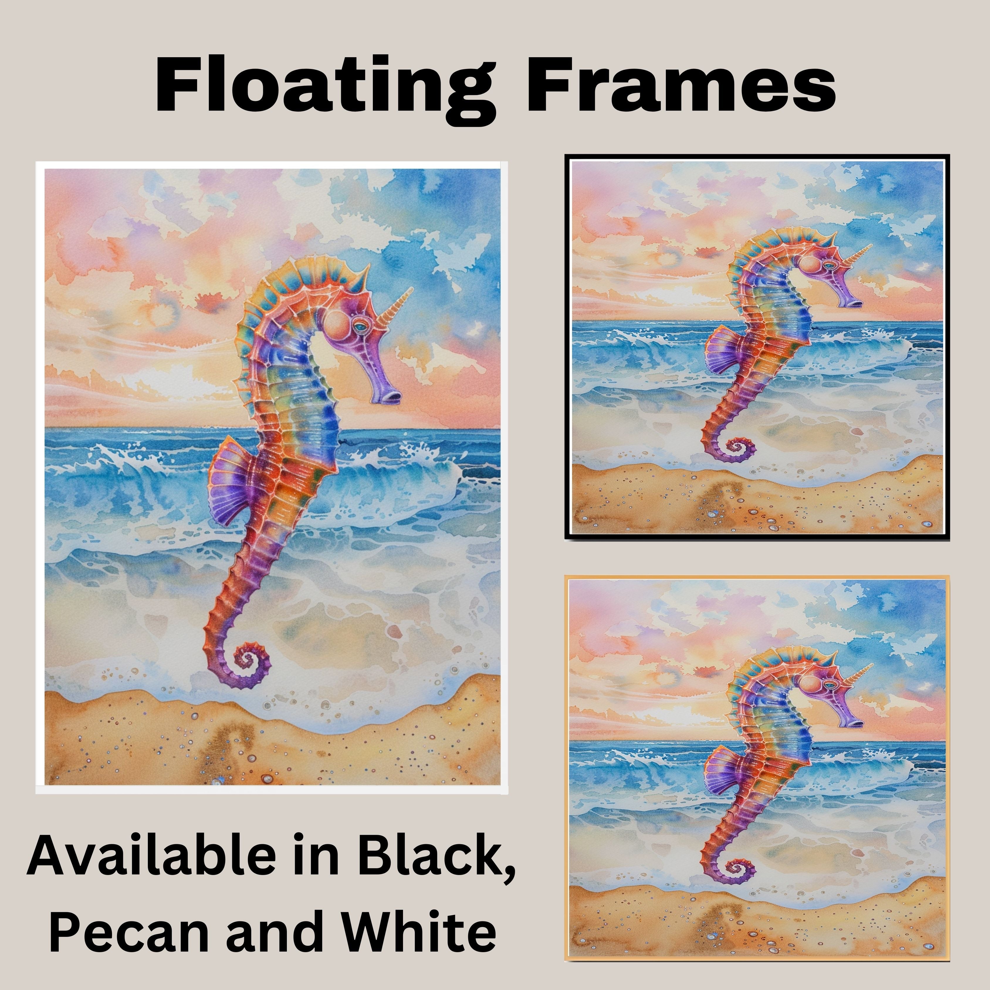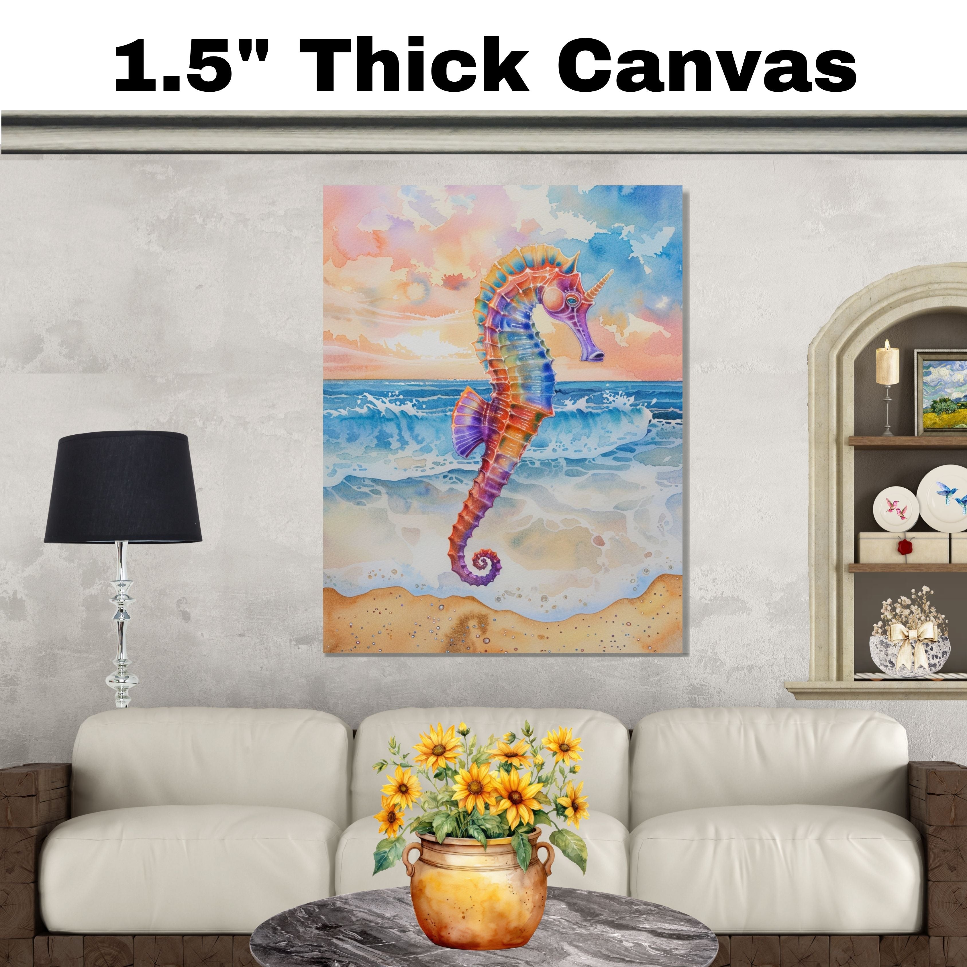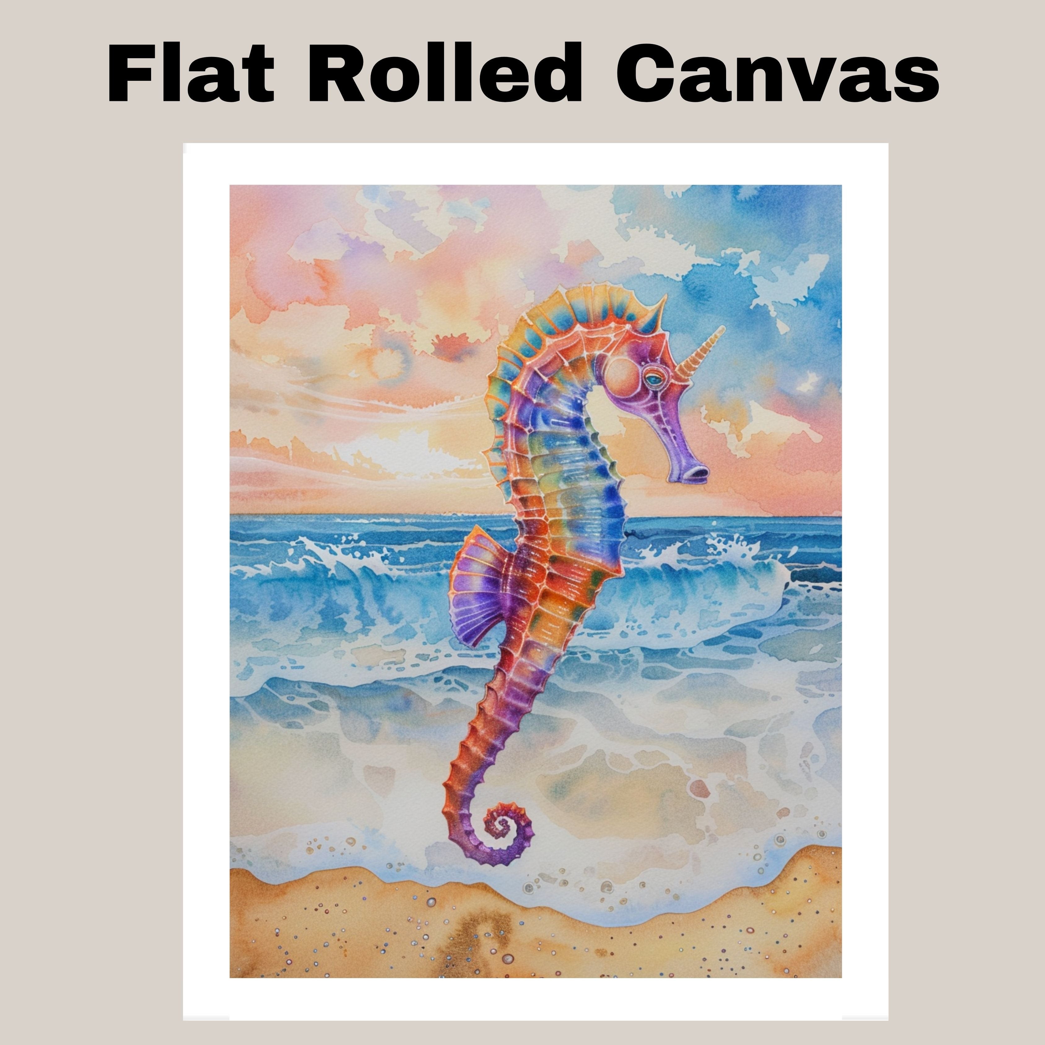 Immerse yourself in coastal charm with this vibrant watercolor painting of a whimsical seahorse. Perched where waves meet sand, the seahorse features a kaleidoscope of colors that reflect the gentle ocean light and dreamy sunset sky. A delightful nautical scene for sea life lovers and beach enthusiasts.