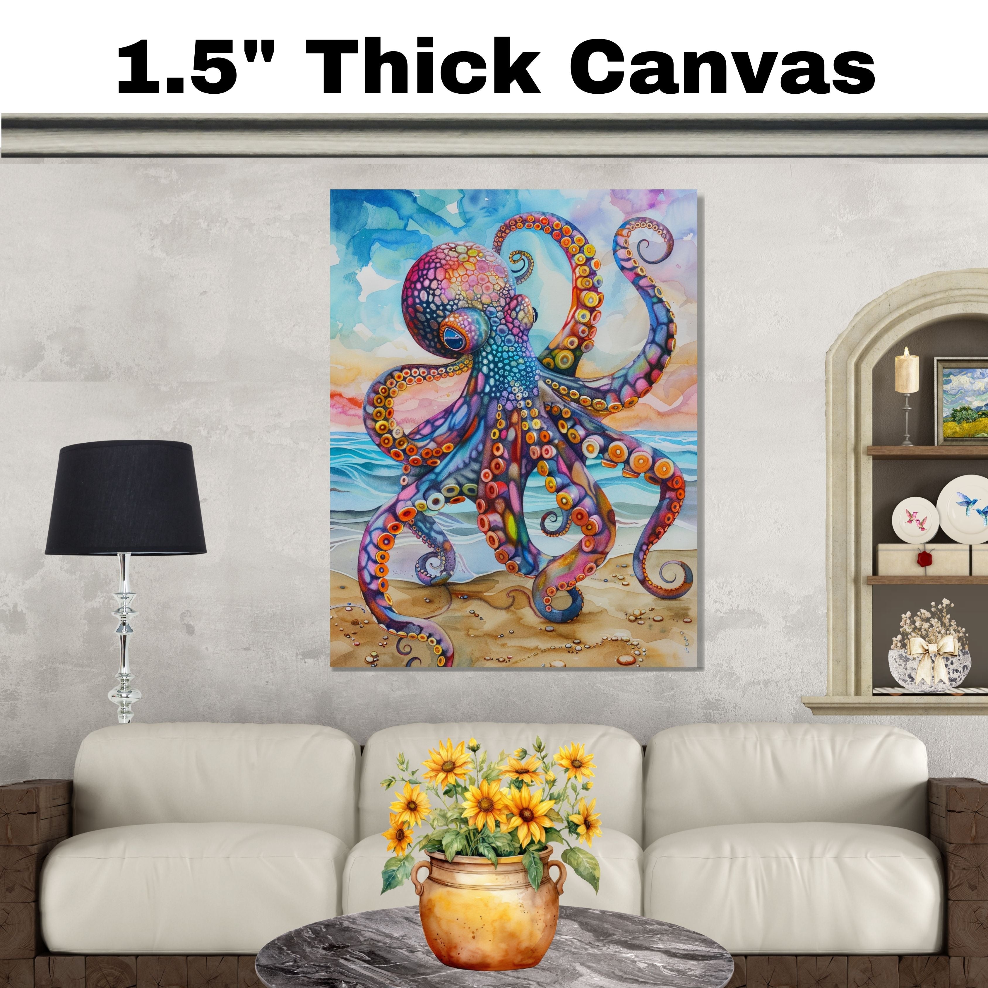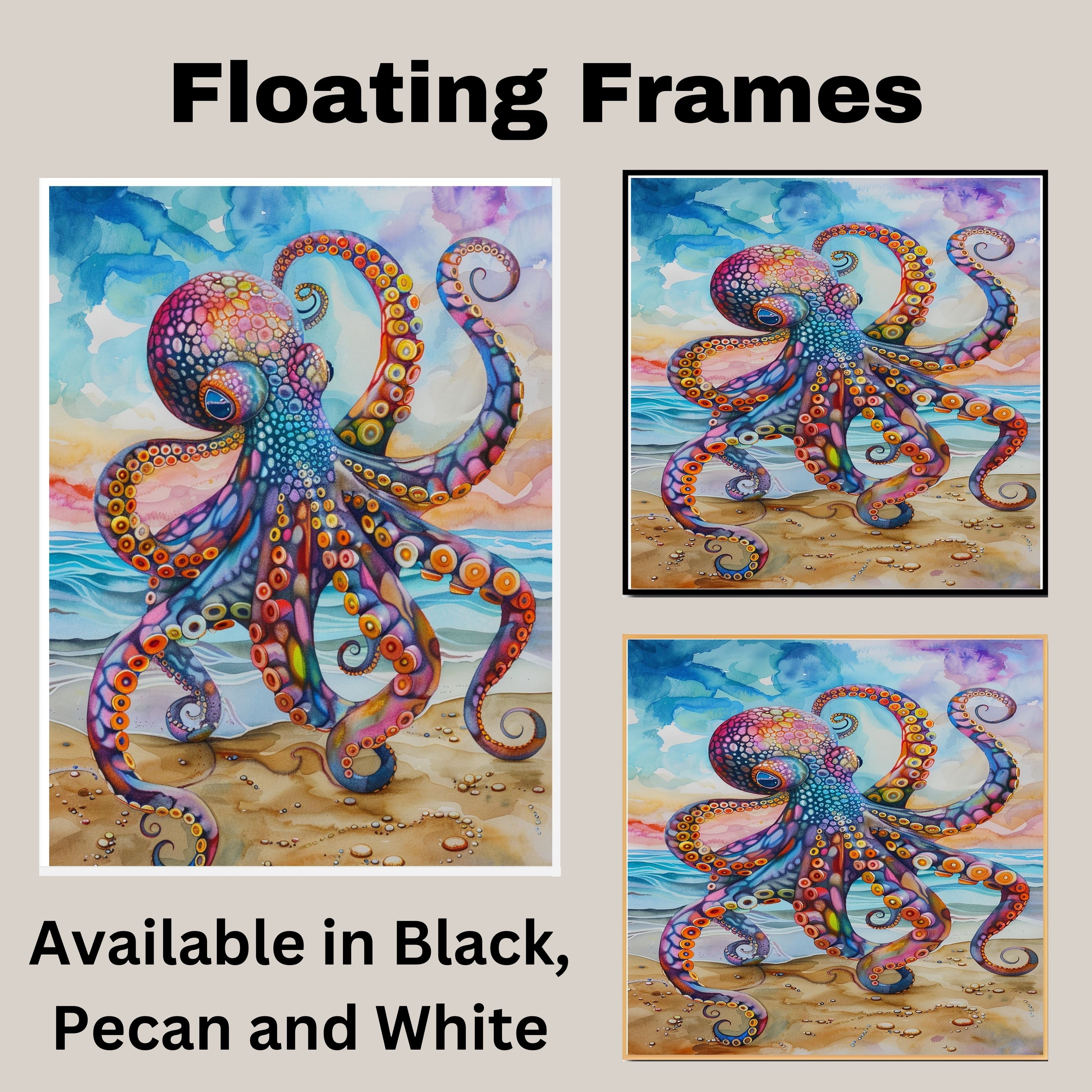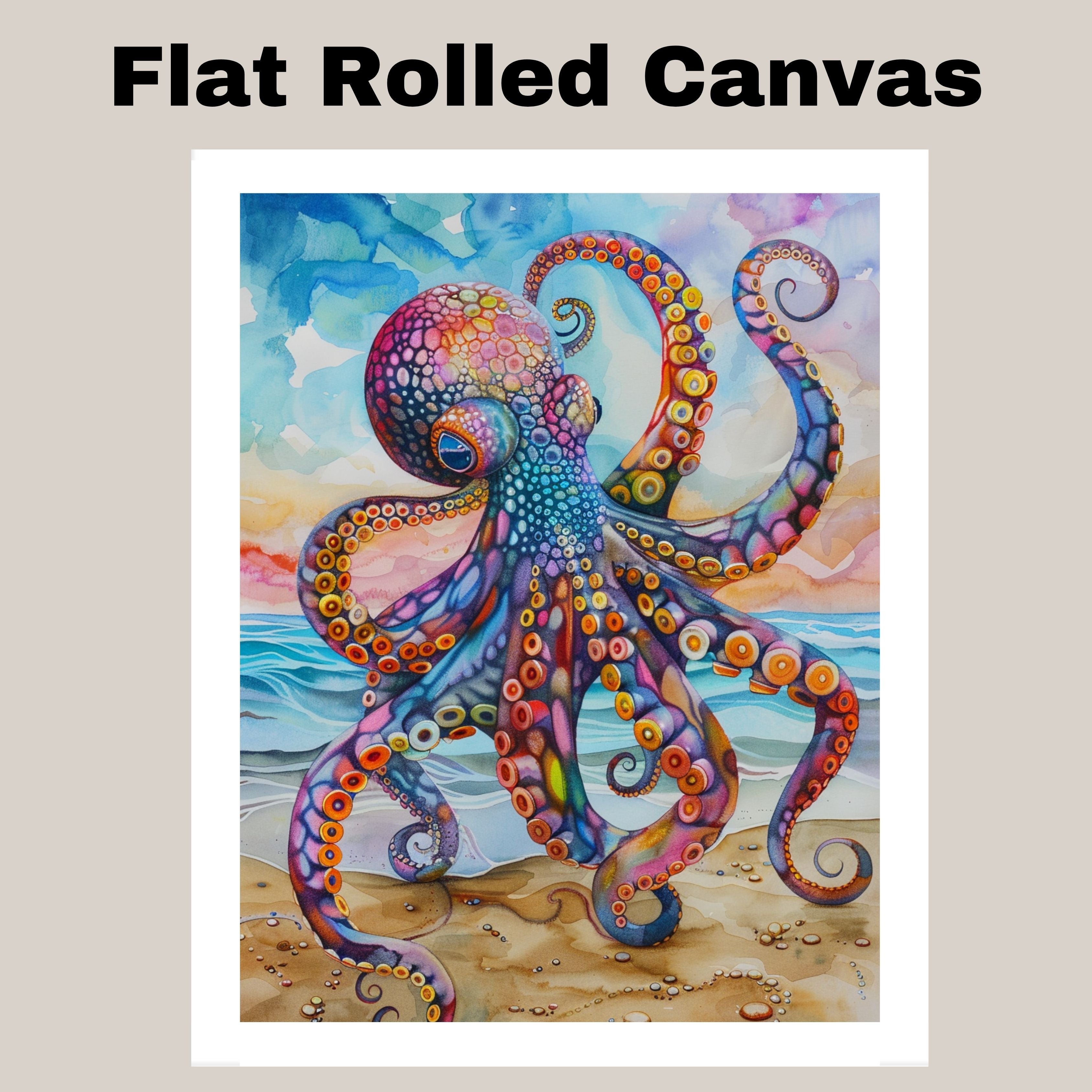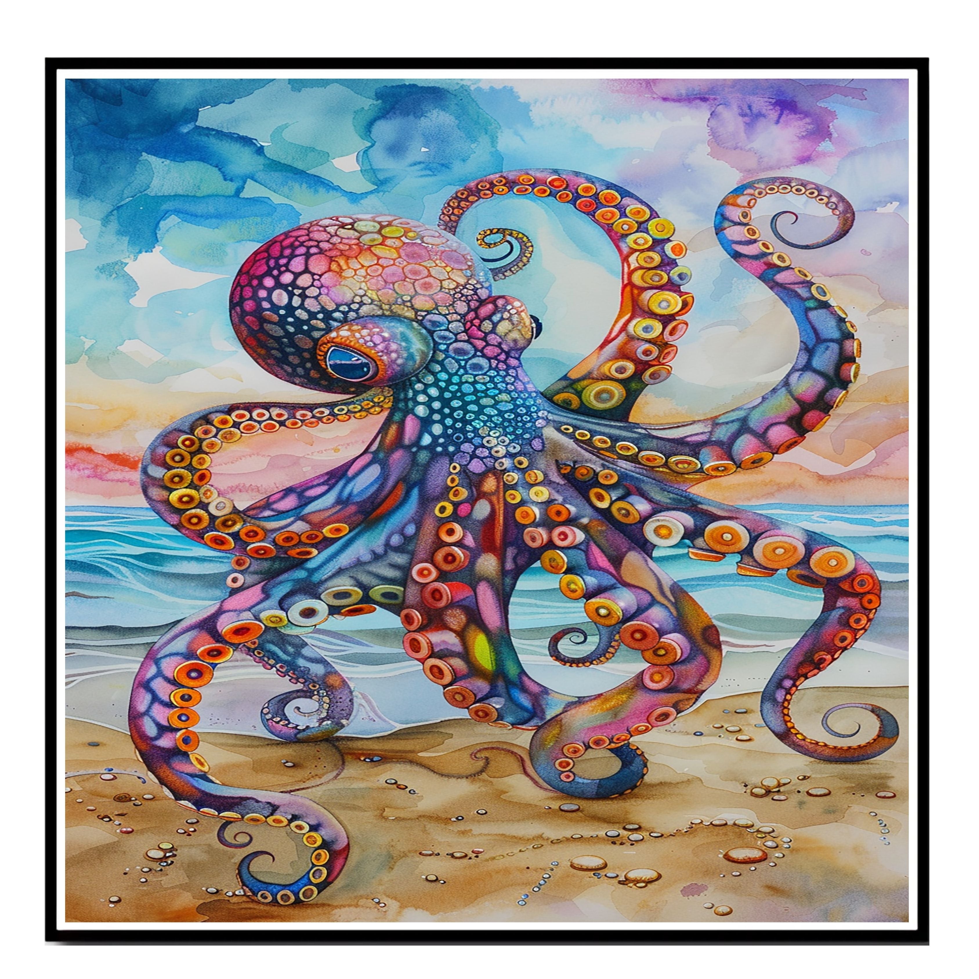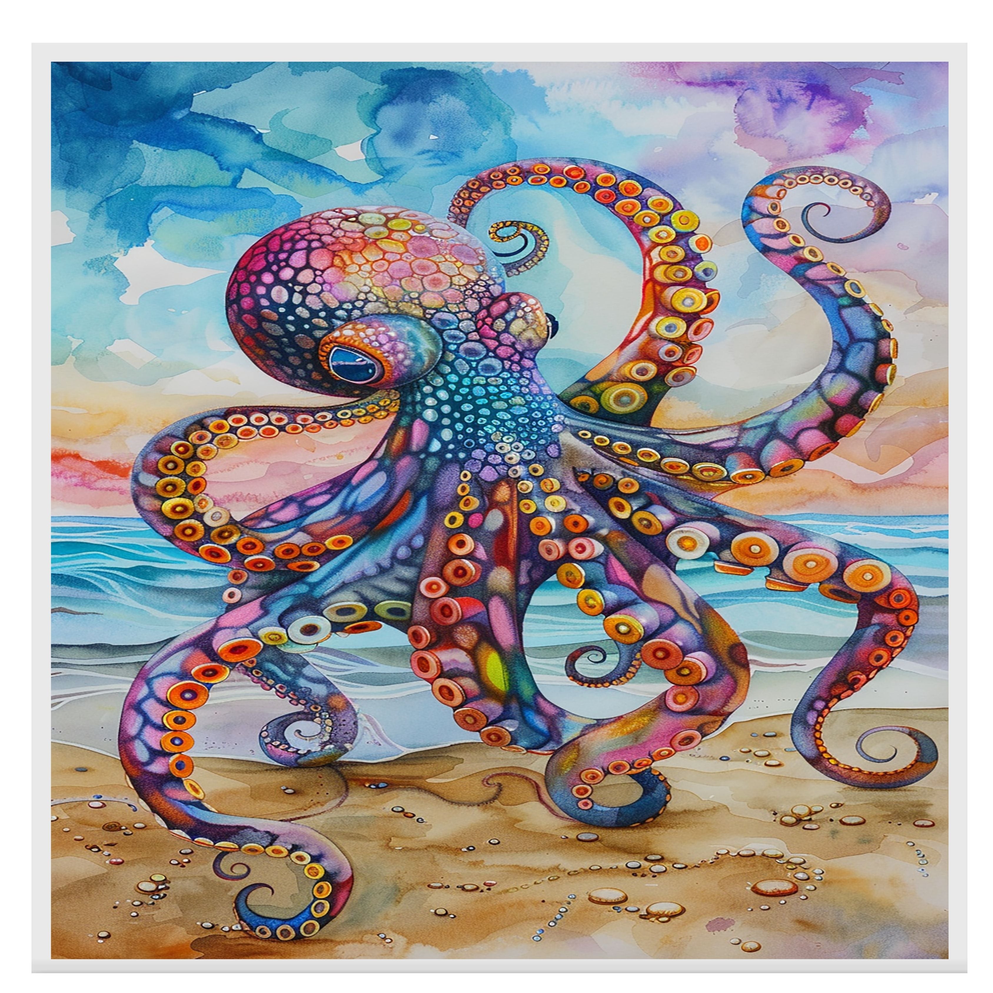 This captivating watercolor art piece features a highly detailed octopus in vibrant multicolored hues, gracefully posed on a sandy beach. Its swirling tentacles are accentuated by dynamic shapes and bold color contrasts of purples, oranges, blues, and reds. The ocean waves and soft sky add a sense of movement and tranquility, making it an eye-catching centerpiece for ocean-themed interiors or marine art lovers.