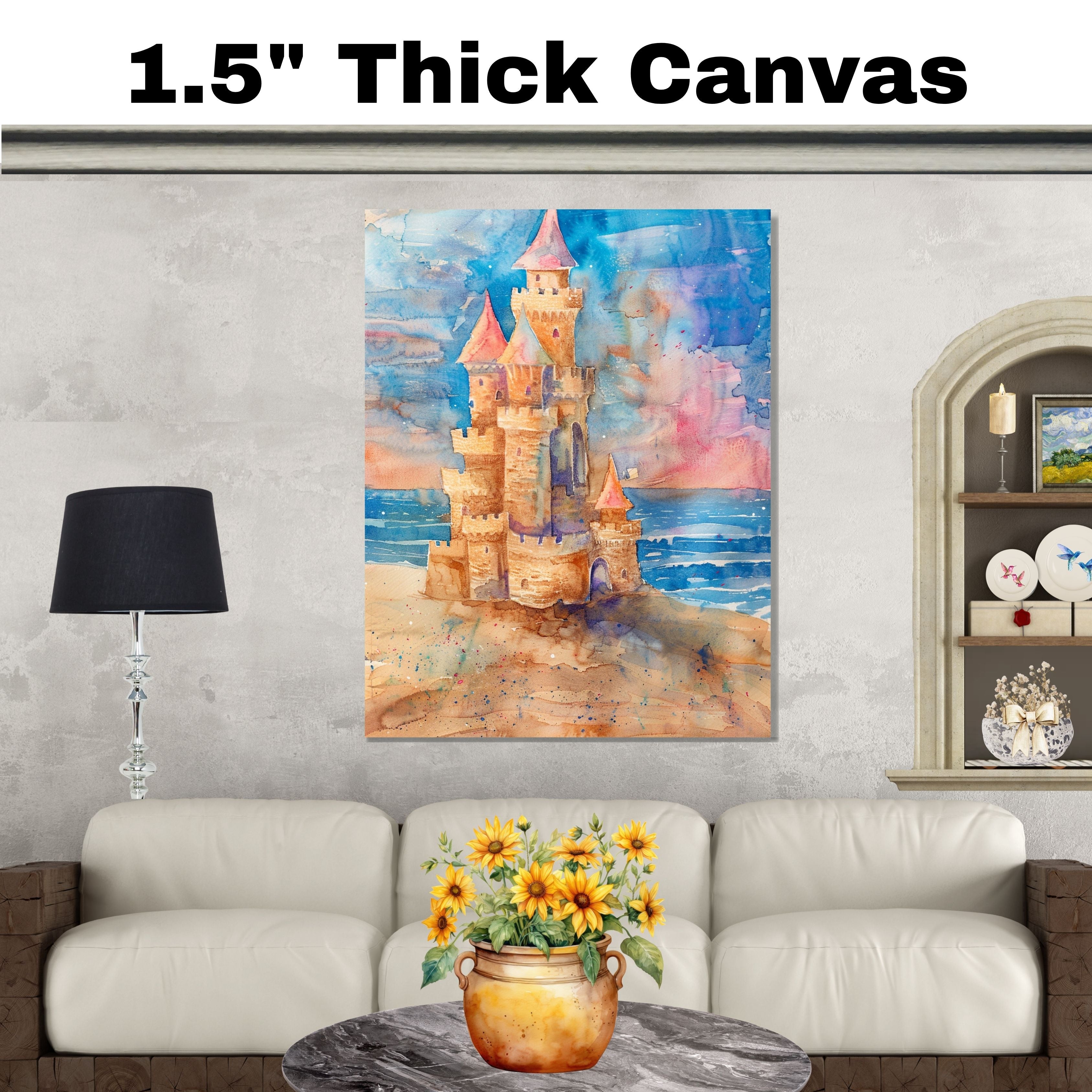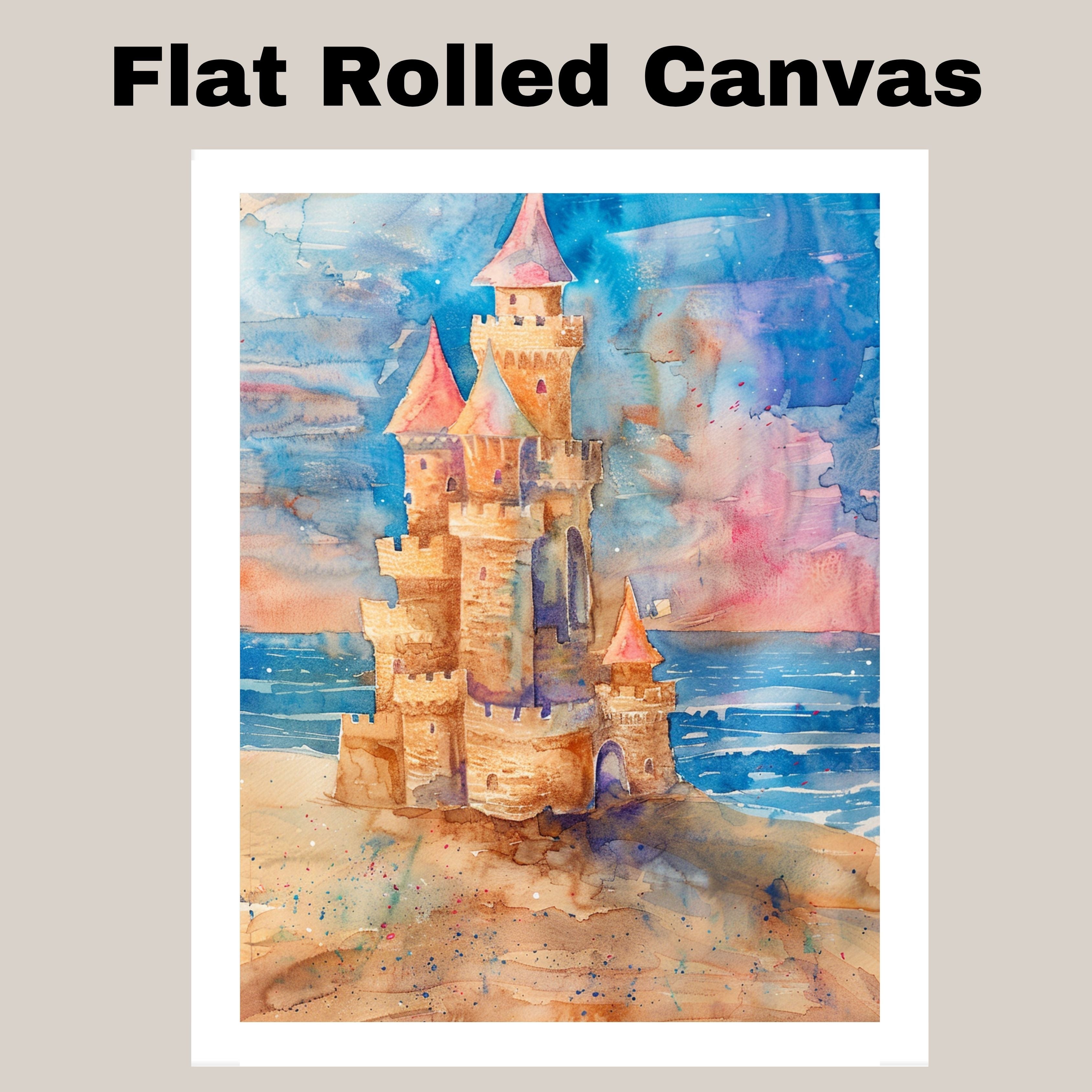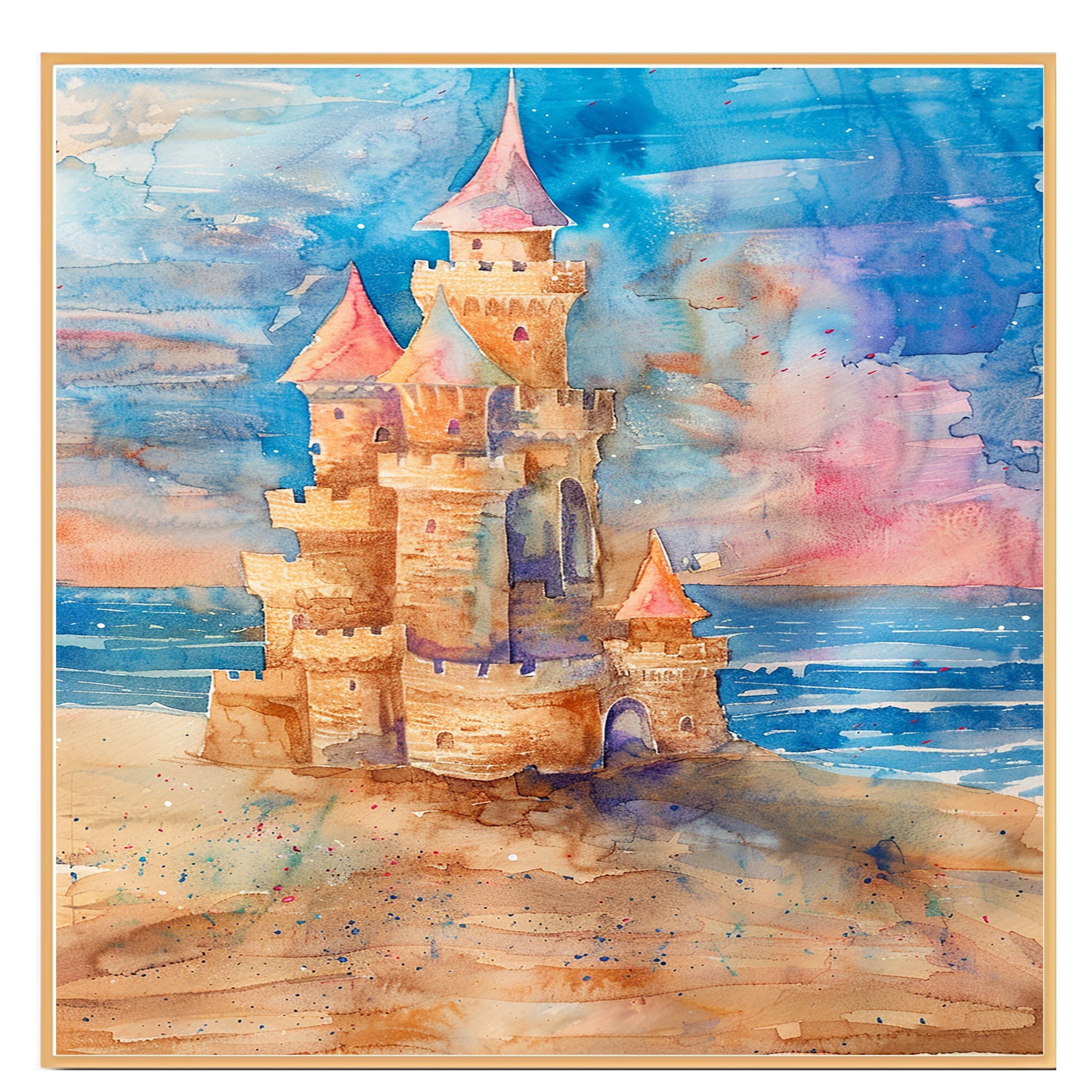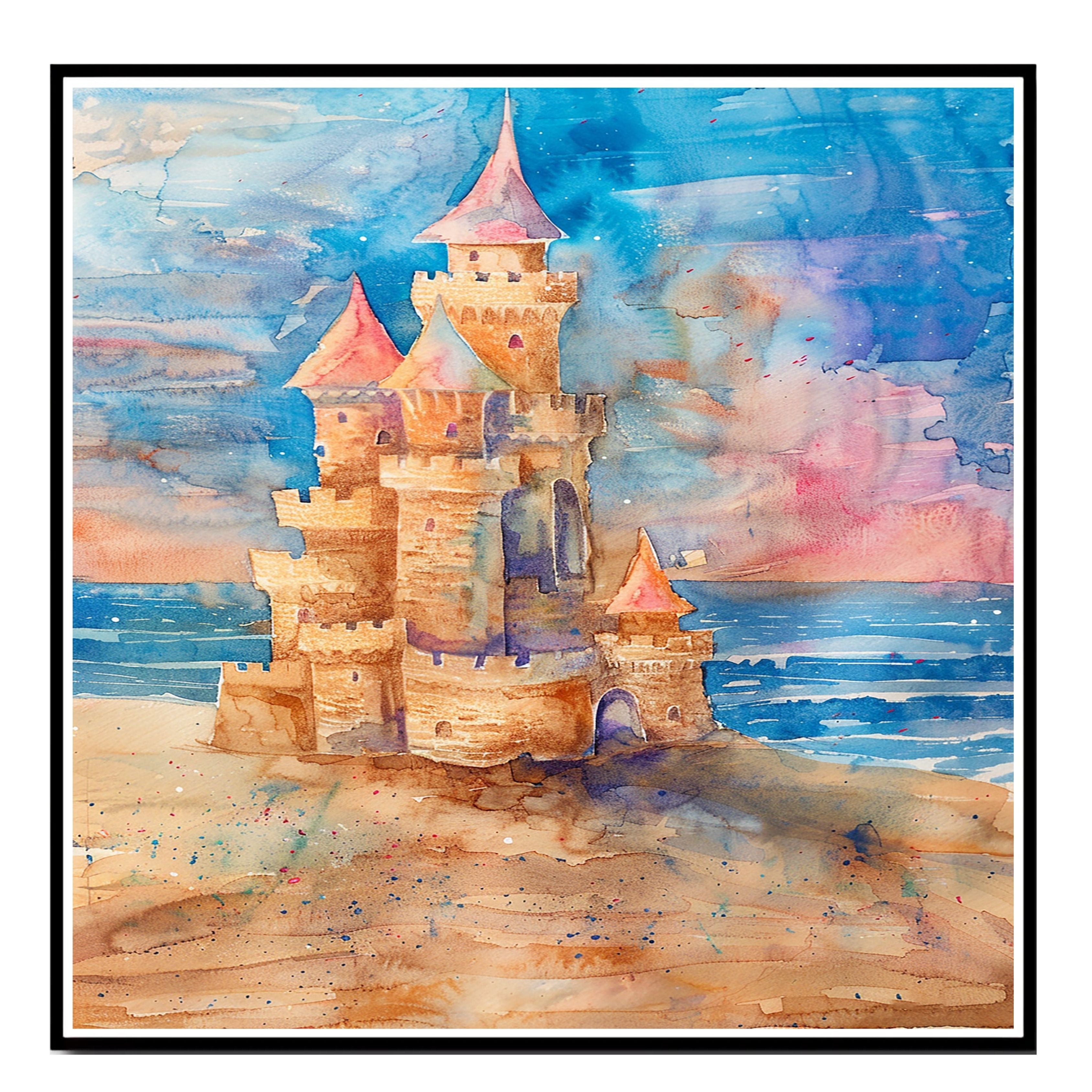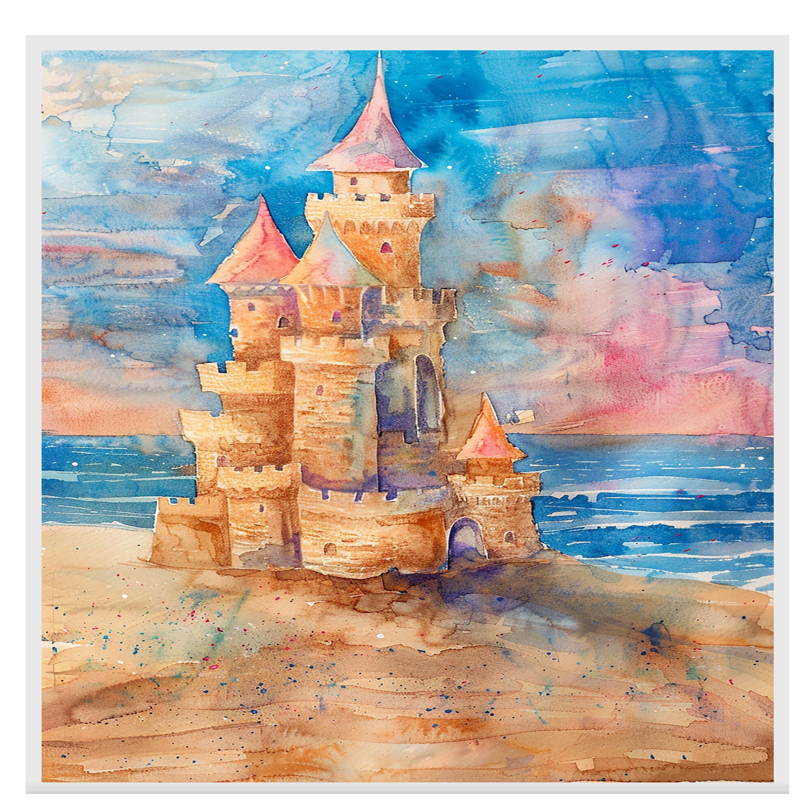 This enchanting watercolor painting showcases a whimsical sandcastle rising from a golden beach with waves lapping nearby and a dreamy, pastel sky behind. With playful turrets, spires, and castle walls rendered in rich sandy browns and warm pinks, this artwork captures the nostalgic joy of childhood beach days and fairy tale fantasies. A delightful addition to coastal, kids', or fantasy-themed spaces, this piece blends imagination and seaside charm beautifully.