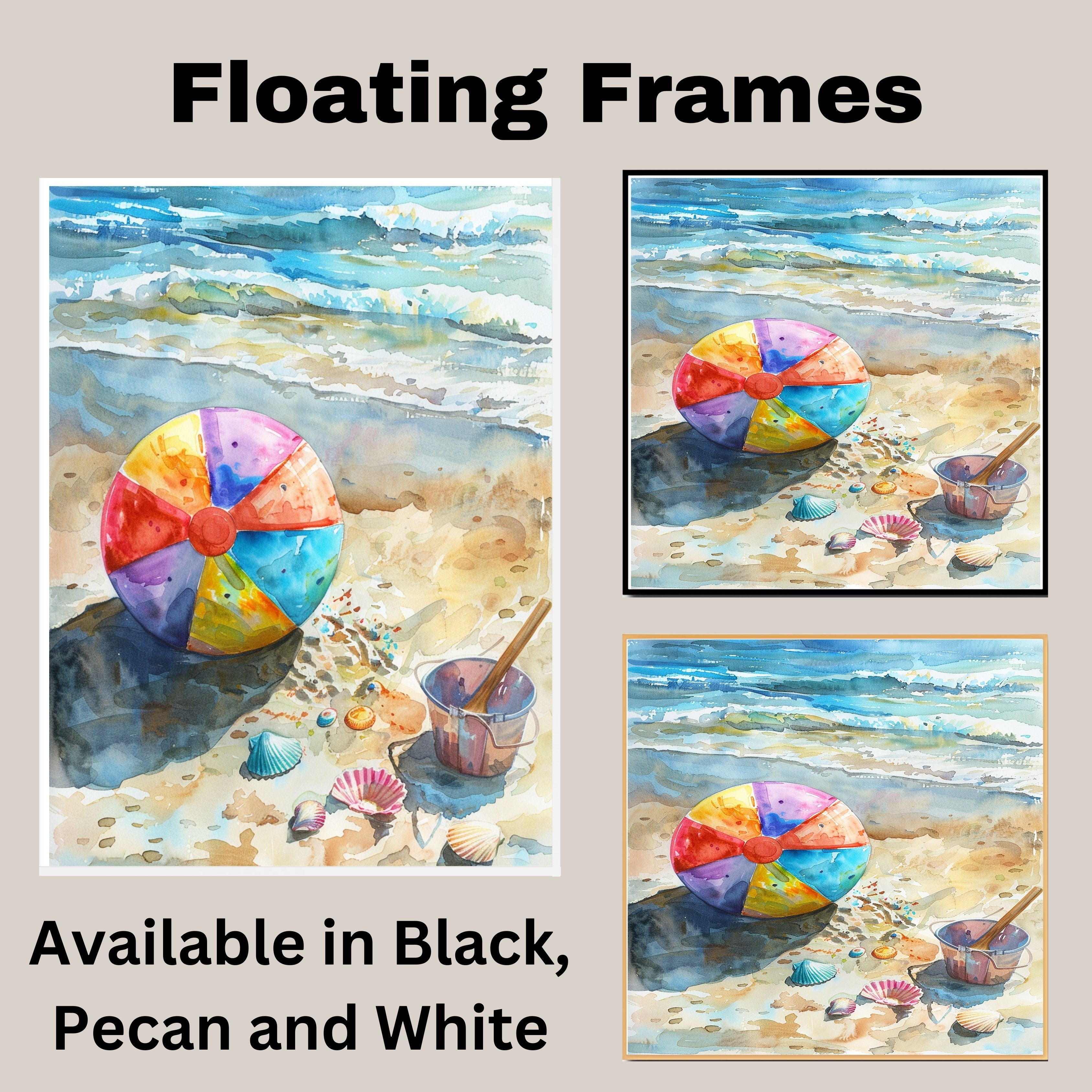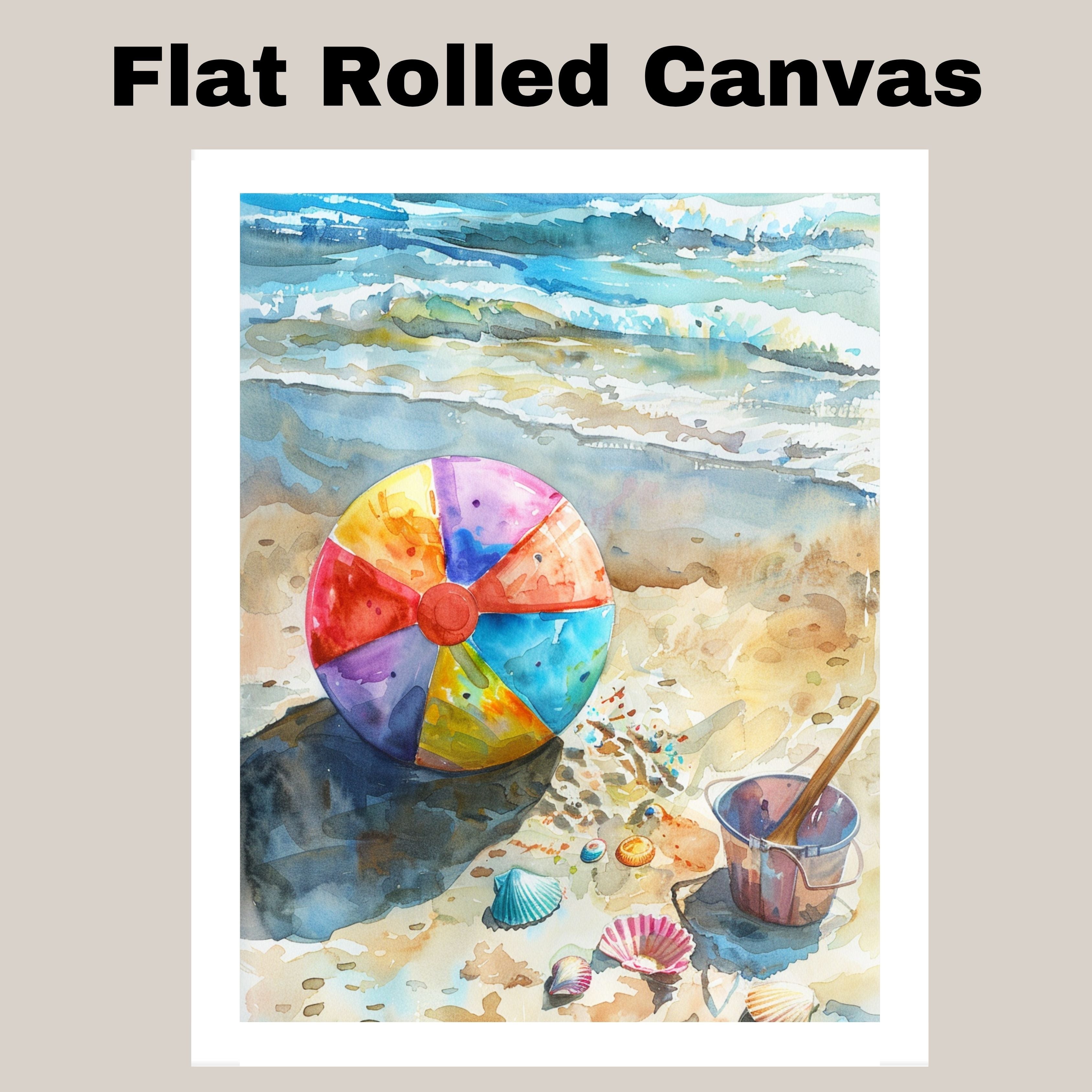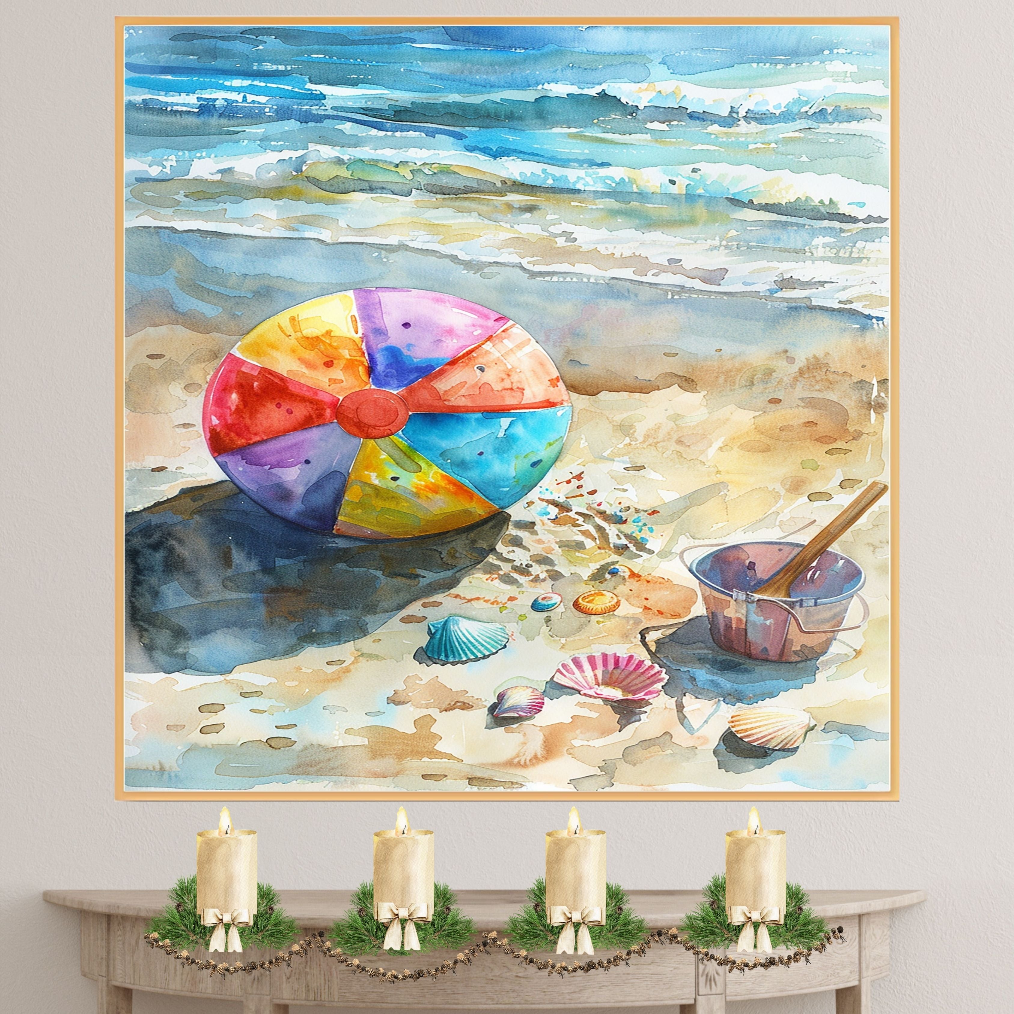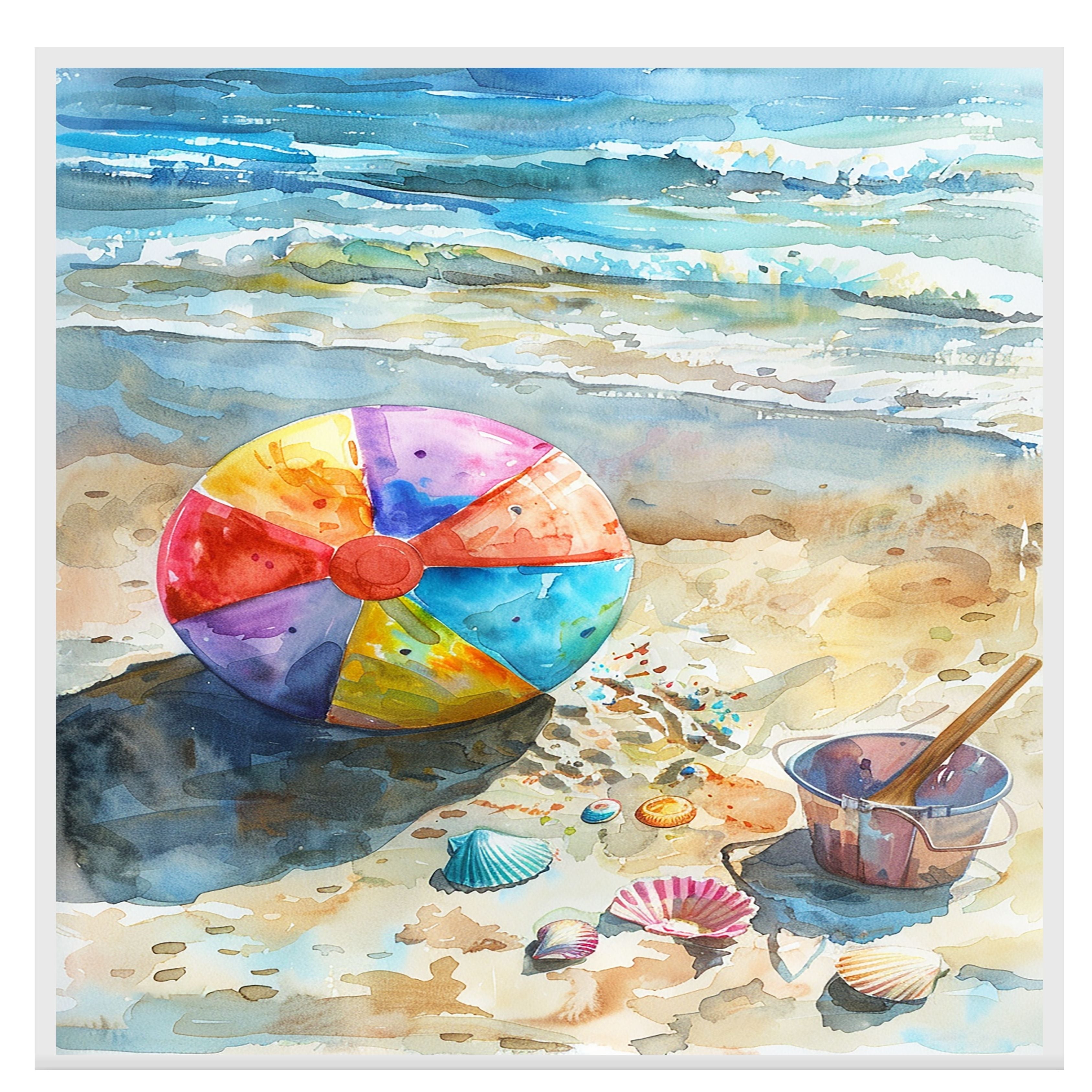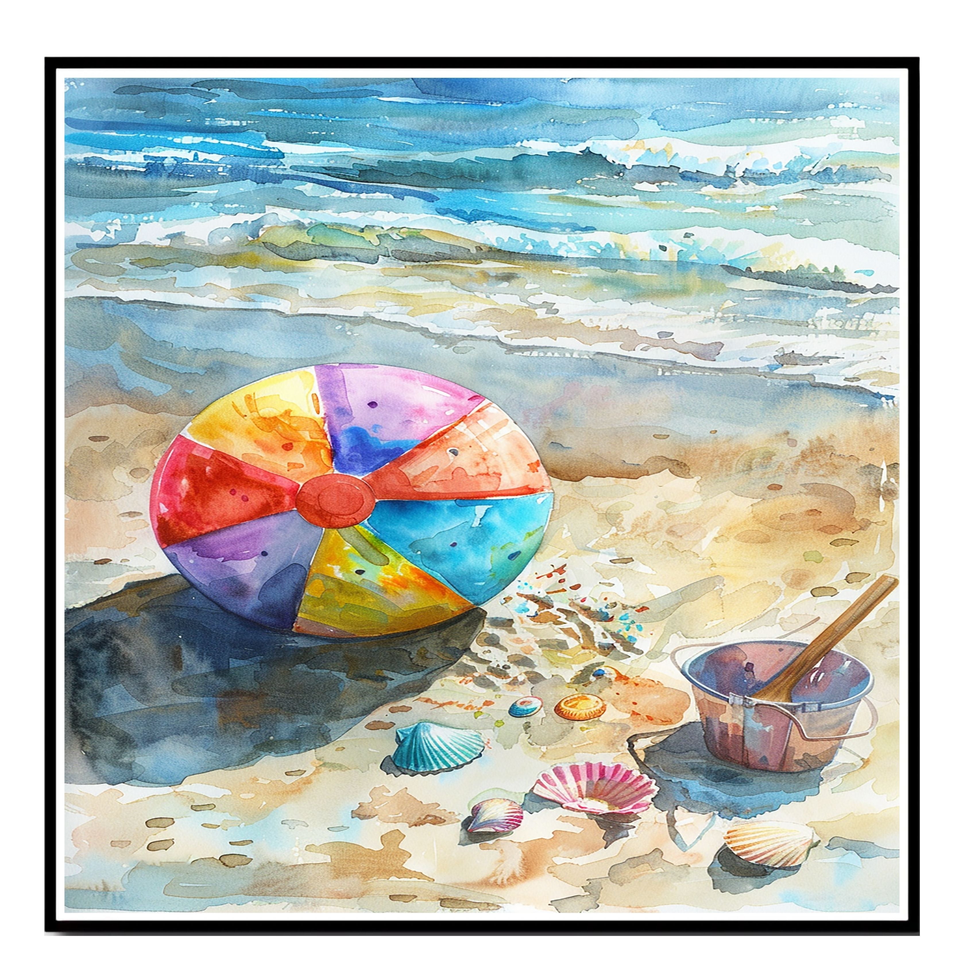 This beautifully detailed watercolor painting captures a vibrant beach ball resting on sun-kissed sand beside colorful seashells and a translucent pail. The gentle surf and bright hues evoke a peaceful summer day by the ocean, offering a playful and nostalgic coastal scene perfect for brightening up any space. A lovely tribute to seaside moments and beachside relaxation.