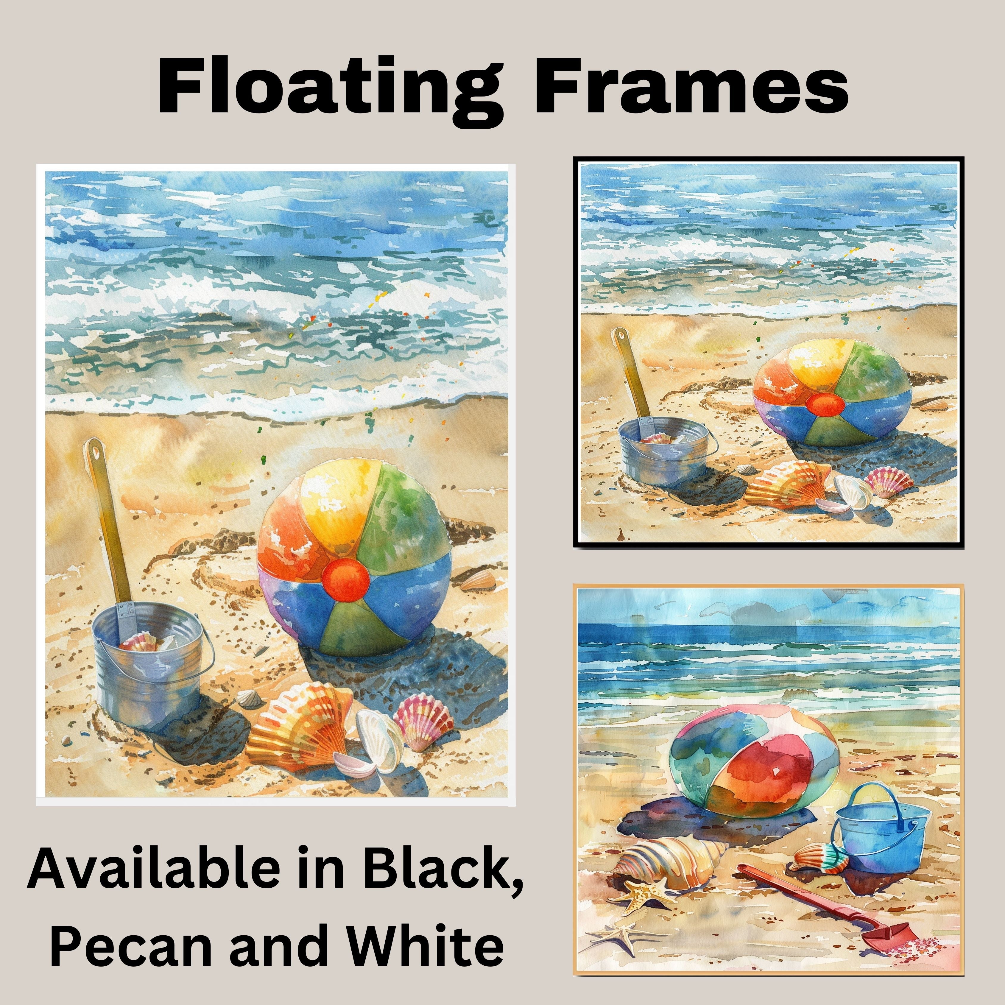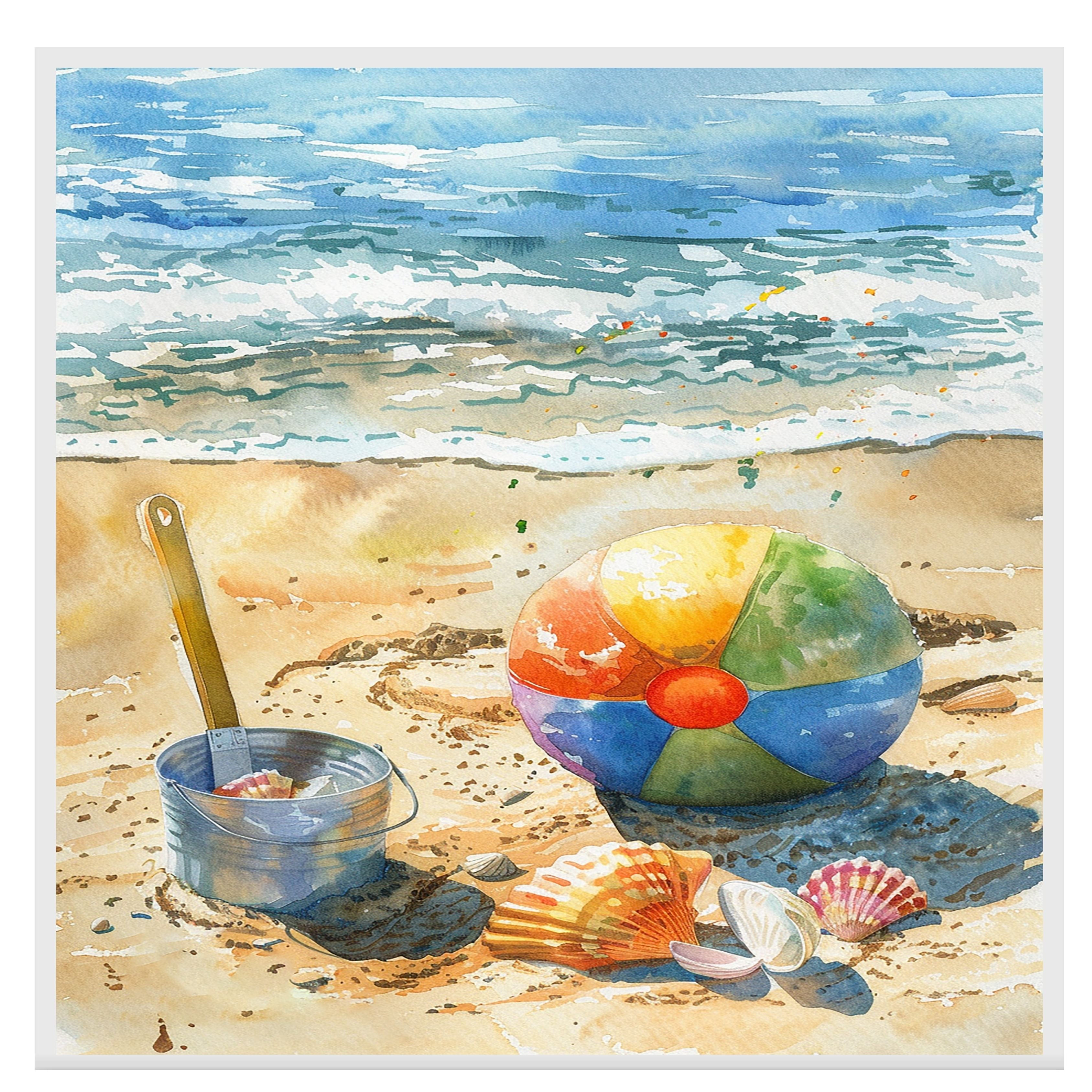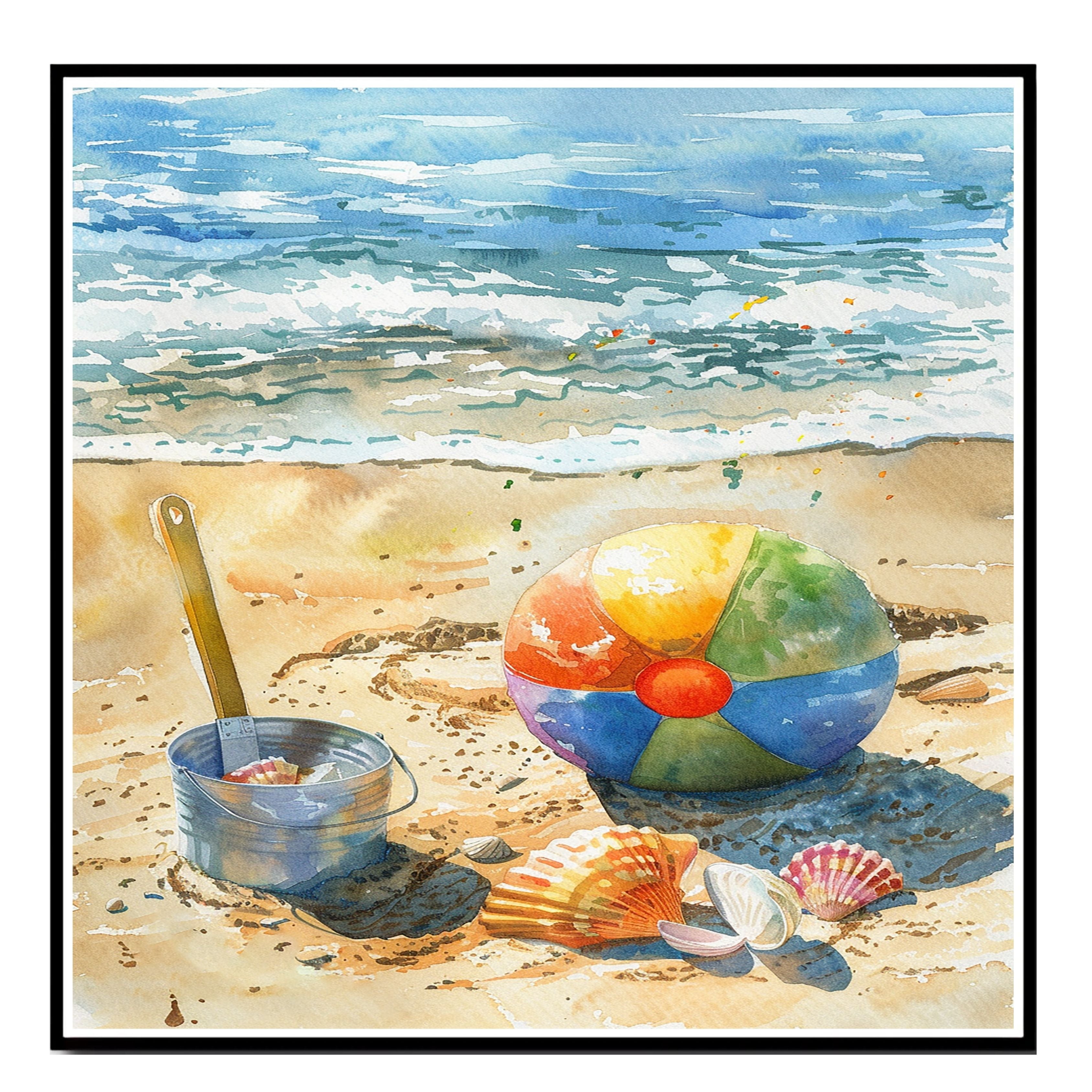 Bring the charm of summer to your space with this beautiful watercolor painting featuring a colorful beach ball, seashells, and ocean waves. The vibrant colors and serene coastal setting evoke memories of sunny days at the beach, making it perfect for any space that needs a cheerful and relaxing touch. A delightful piece for beach lovers and fans of seaside-inspired art.