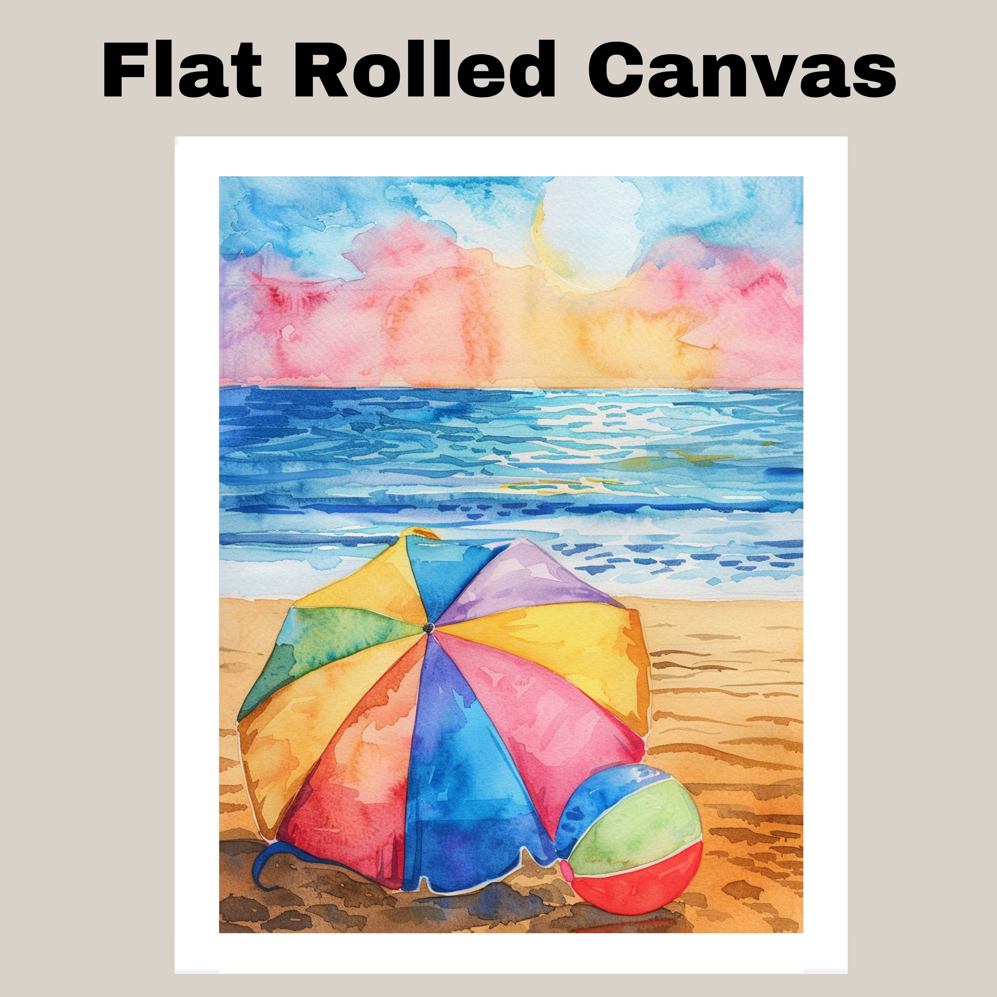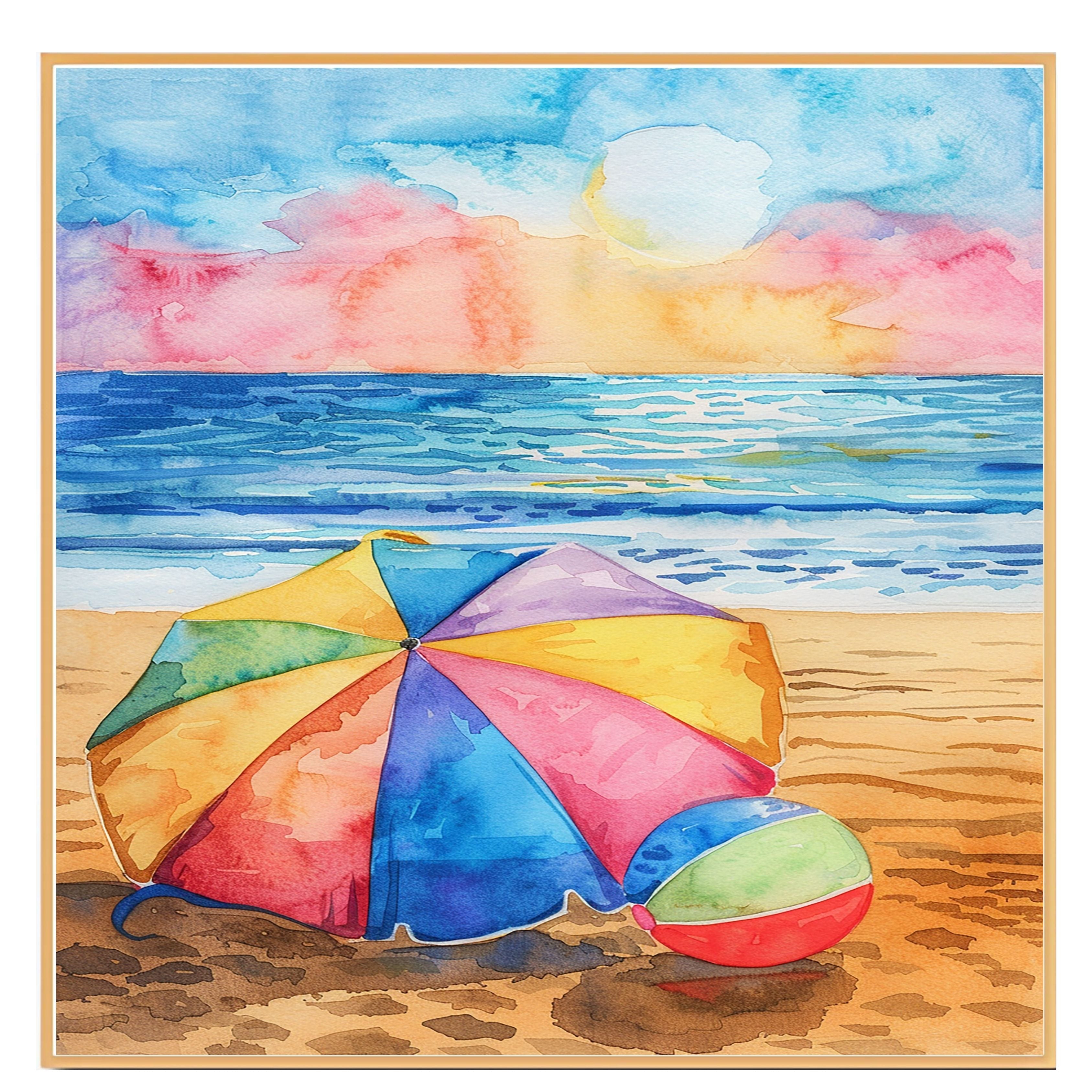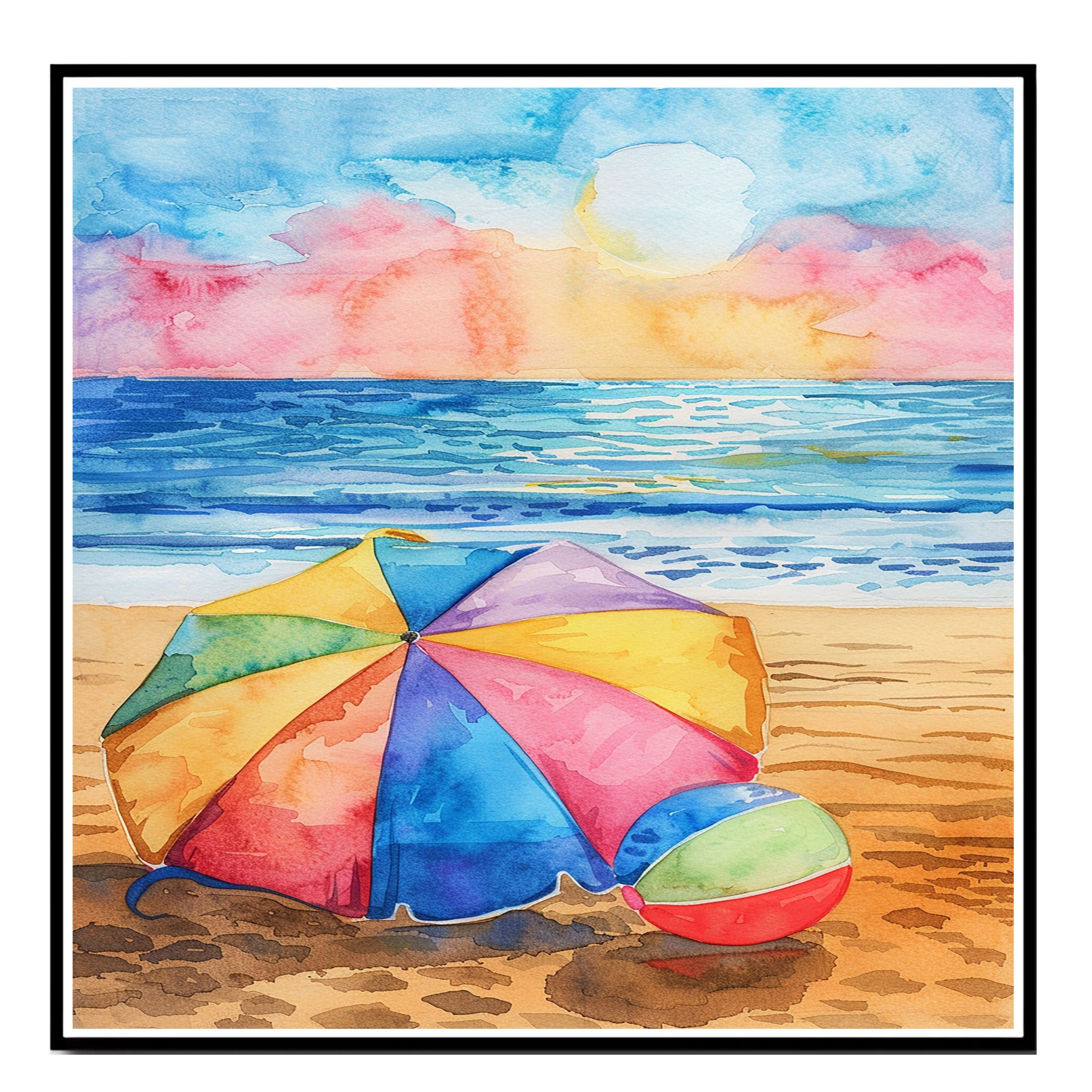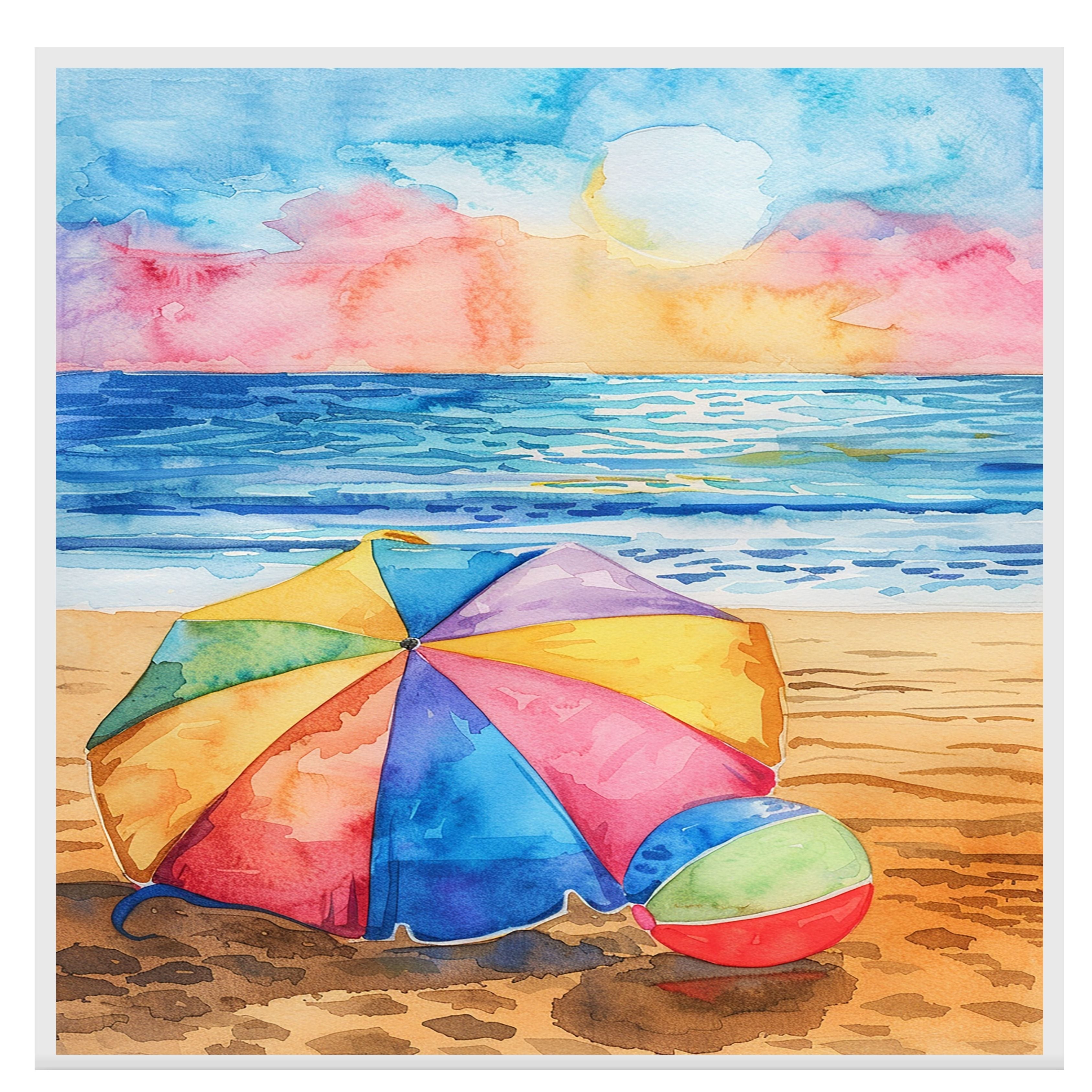This beautiful watercolor captures the magic of a coastal sunset with a colorful beach umbrella and ball resting on the sand. The sky is awash in pastel pinks, oranges, and blues, reflecting gently on the ocean waves. A serene and cheerful tribute to seaside days, this artwork is perfect for anyone who loves summer vibes, beach vacations, and colorful, uplifting art.