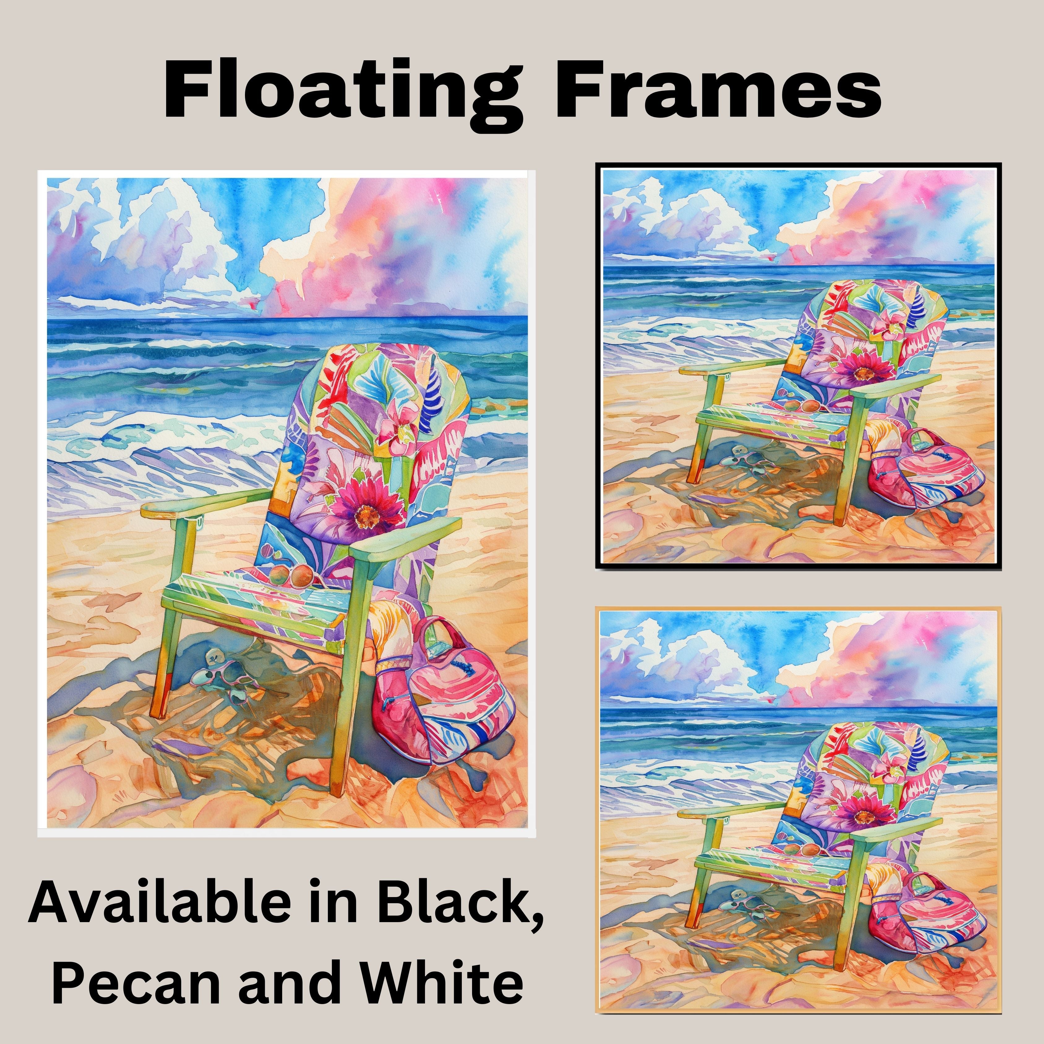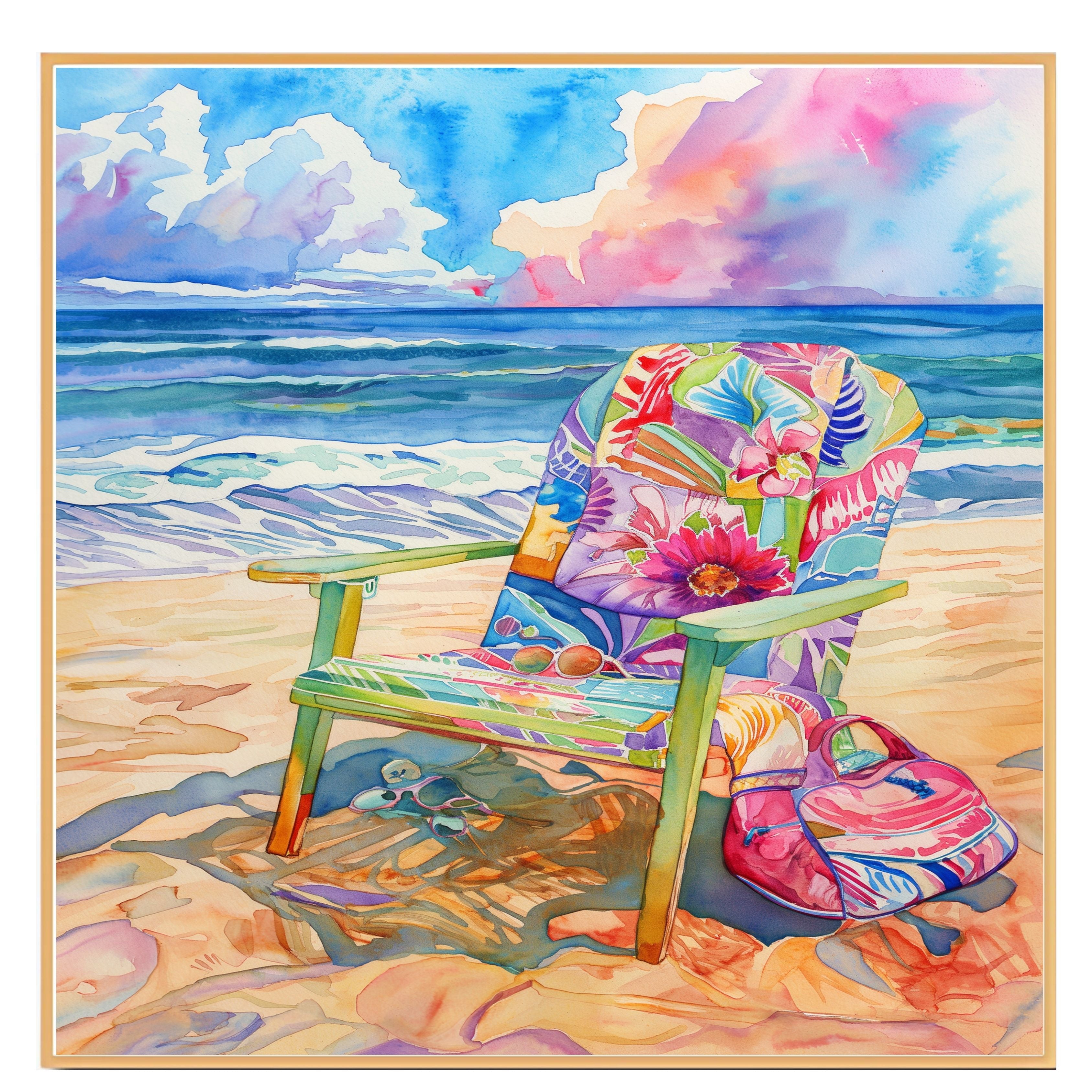 Add a burst of color and coastal calm to your space with this stunning watercolor painting. Featuring a vibrant floral beach chair, sunglasses, and a pink bag on the warm sand, the scene is set against gentle waves and a vivid sky. This artwork captures the essence of a peaceful beach day with bold patterns and soothing scenery—perfect for anyone who loves vibrant summer memories by the ocean.