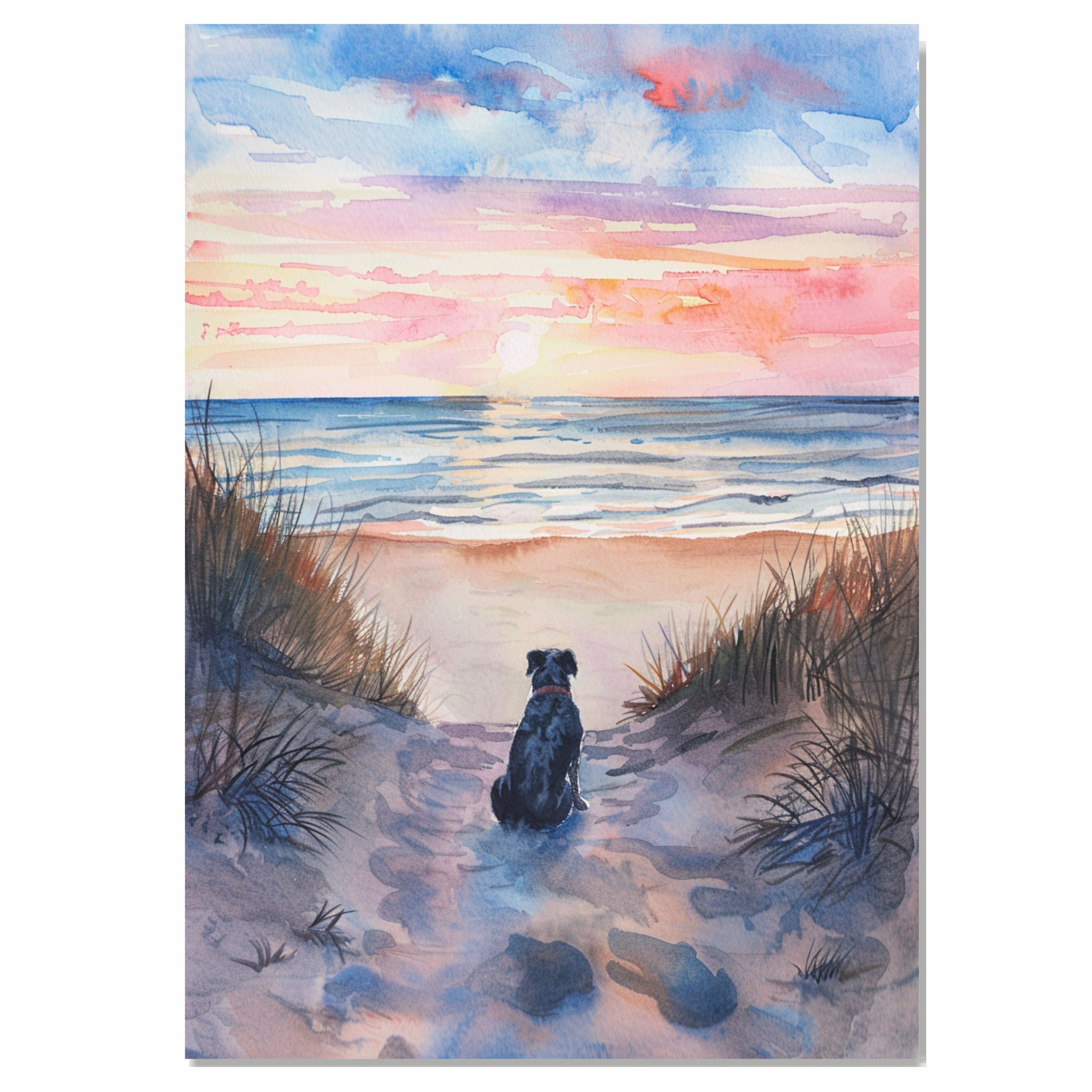 This touching watercolor painting depicts a dog peacefully sitting on a sandy dune path, gazing toward the setting sun over the ocean. Surrounded by soft grasses and warm pastel reflections in the sky, the scene radiates tranquility, loyalty, and reflection. A perfect choice for dog lovers, beach enthusiasts, and anyone who cherishes serene and emotional moments in nature.