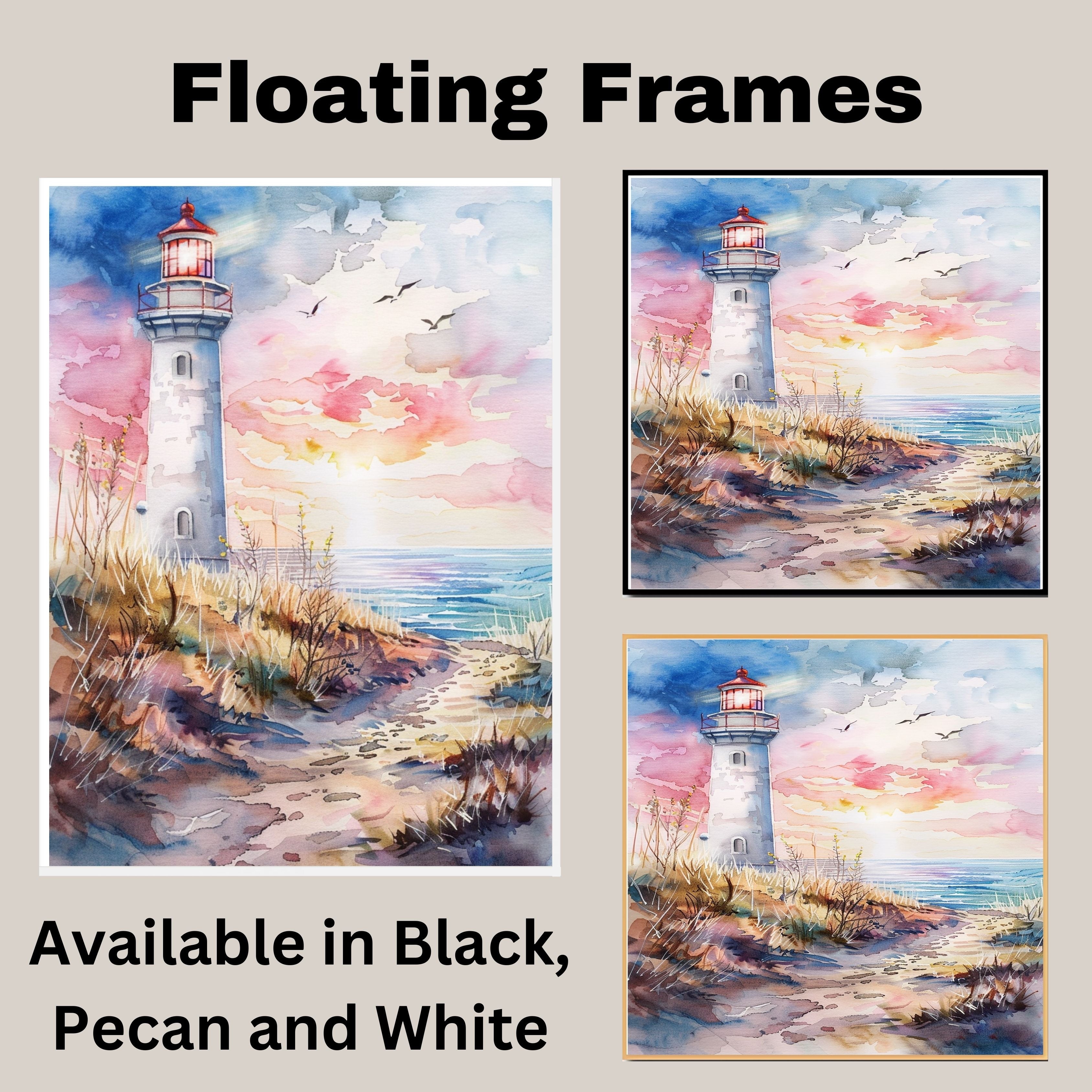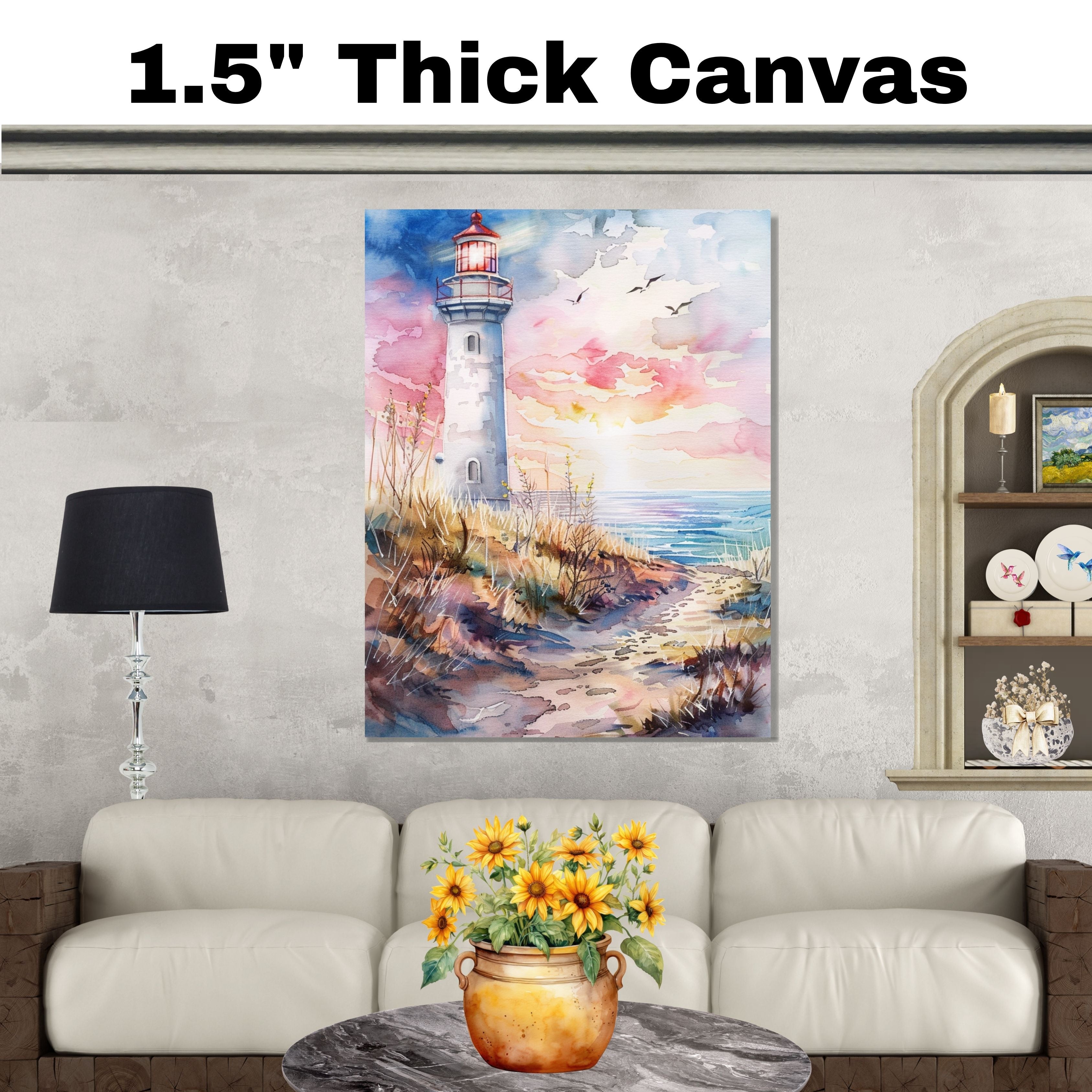 Watercolor Painting of Lighthouse Overlooking Ocean at Sunset with Coastal Path and Soaring Seagulls in Serene Setting on Ready to Hang 1.5" Thick Canvas Wrap, Floating Framed Canvas, Flat Rolled Canvas