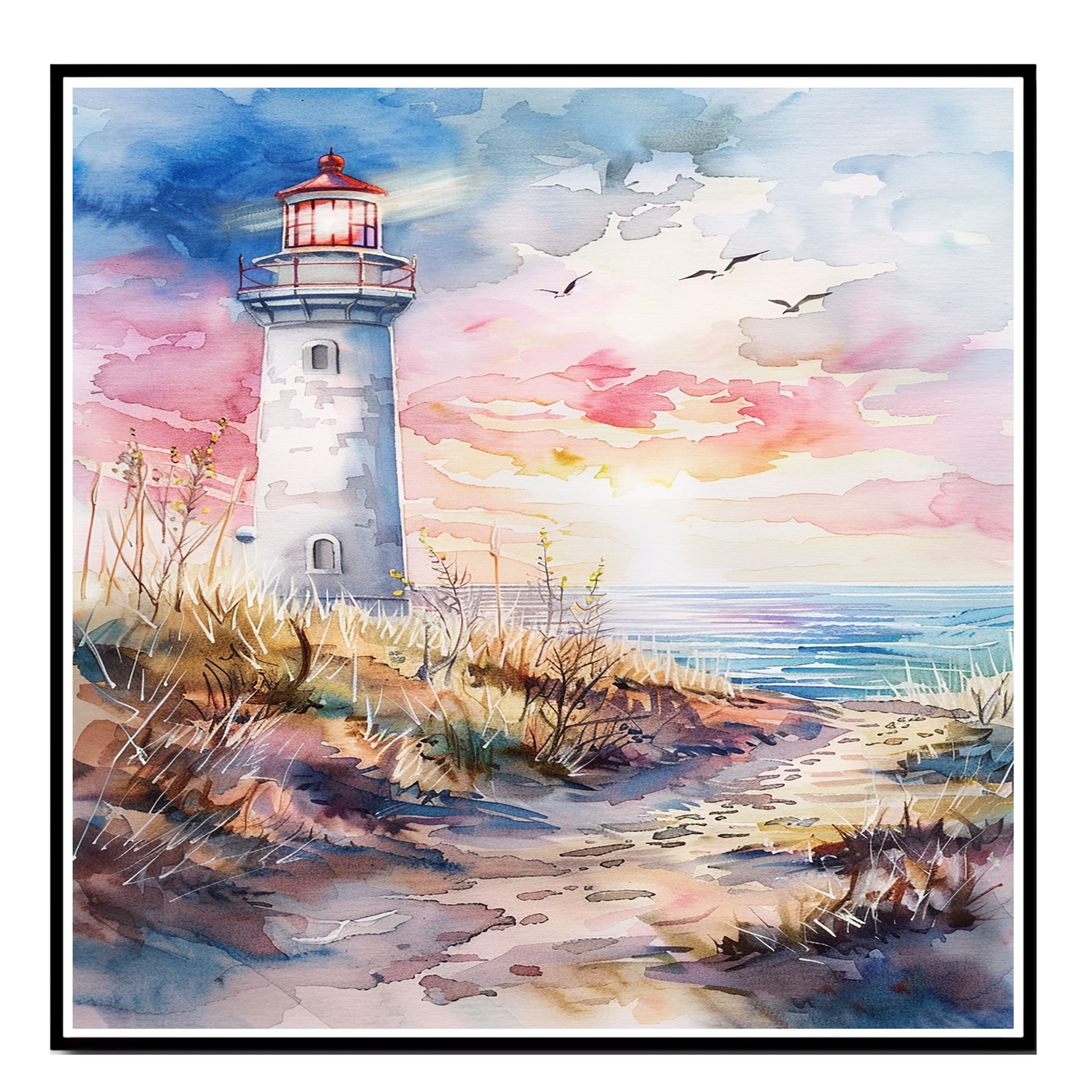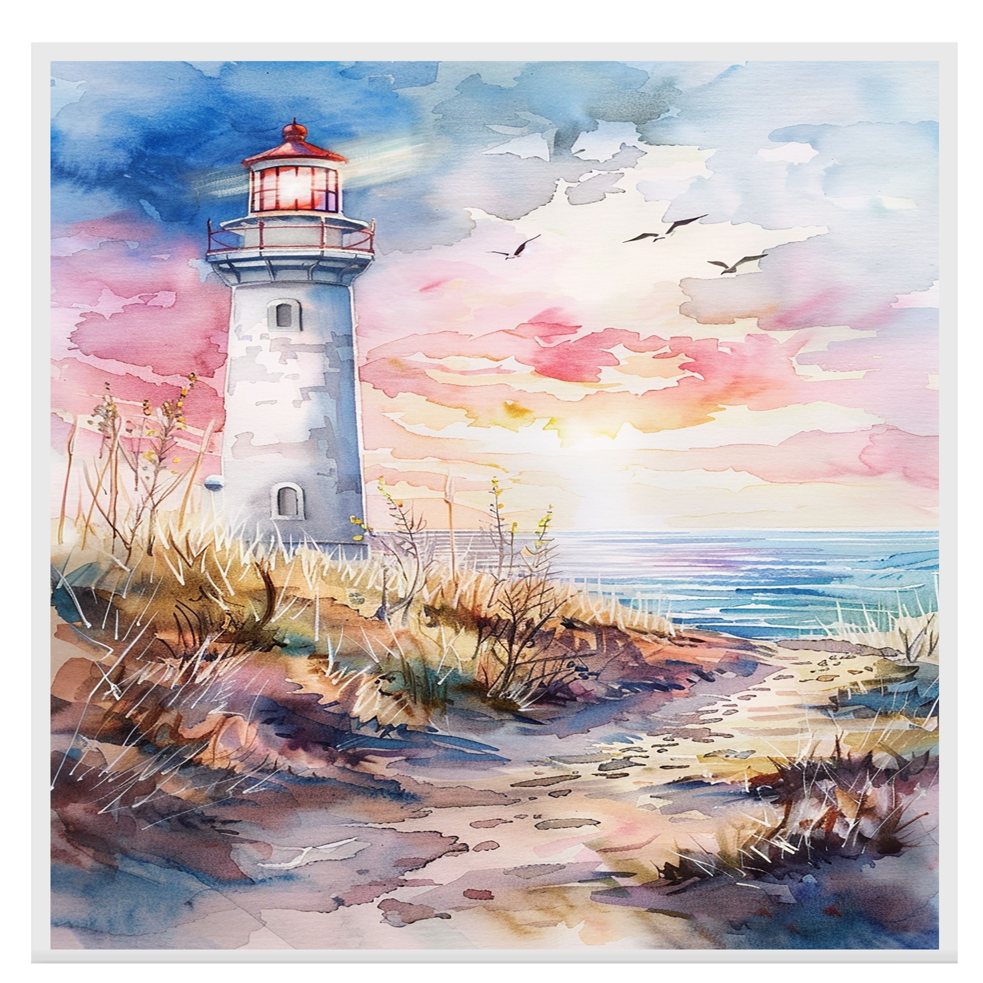 This beautiful watercolor artwork captures a lighthouse perched beside a winding coastal path, glowing softly as the sun sets over the ocean. Delicate brushwork illustrates the grasses, birds in flight, and the soft hues of the evening sky, evoking a peaceful maritime moment. Ideal for lovers of the sea, nautical scenes, or tranquil landscapes.