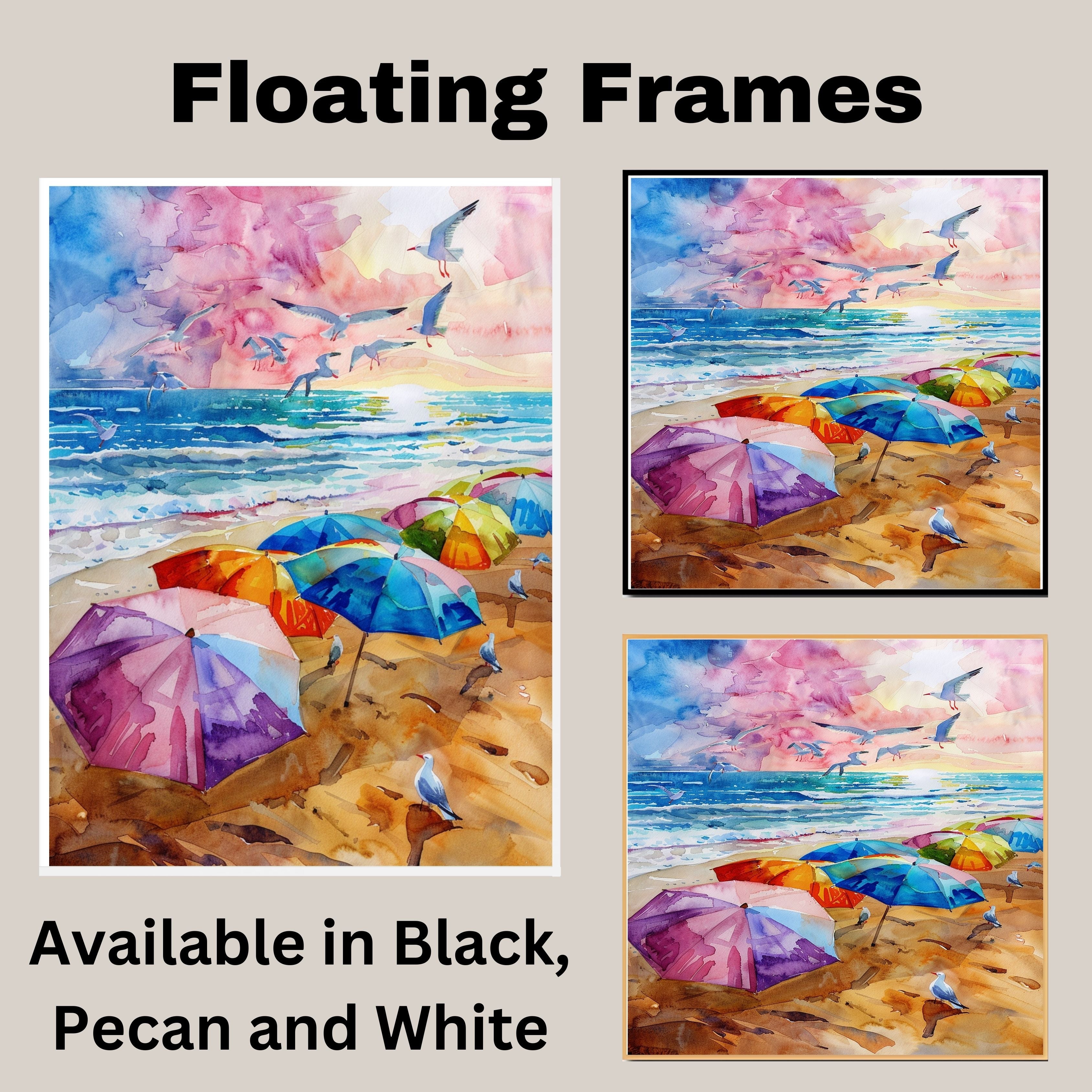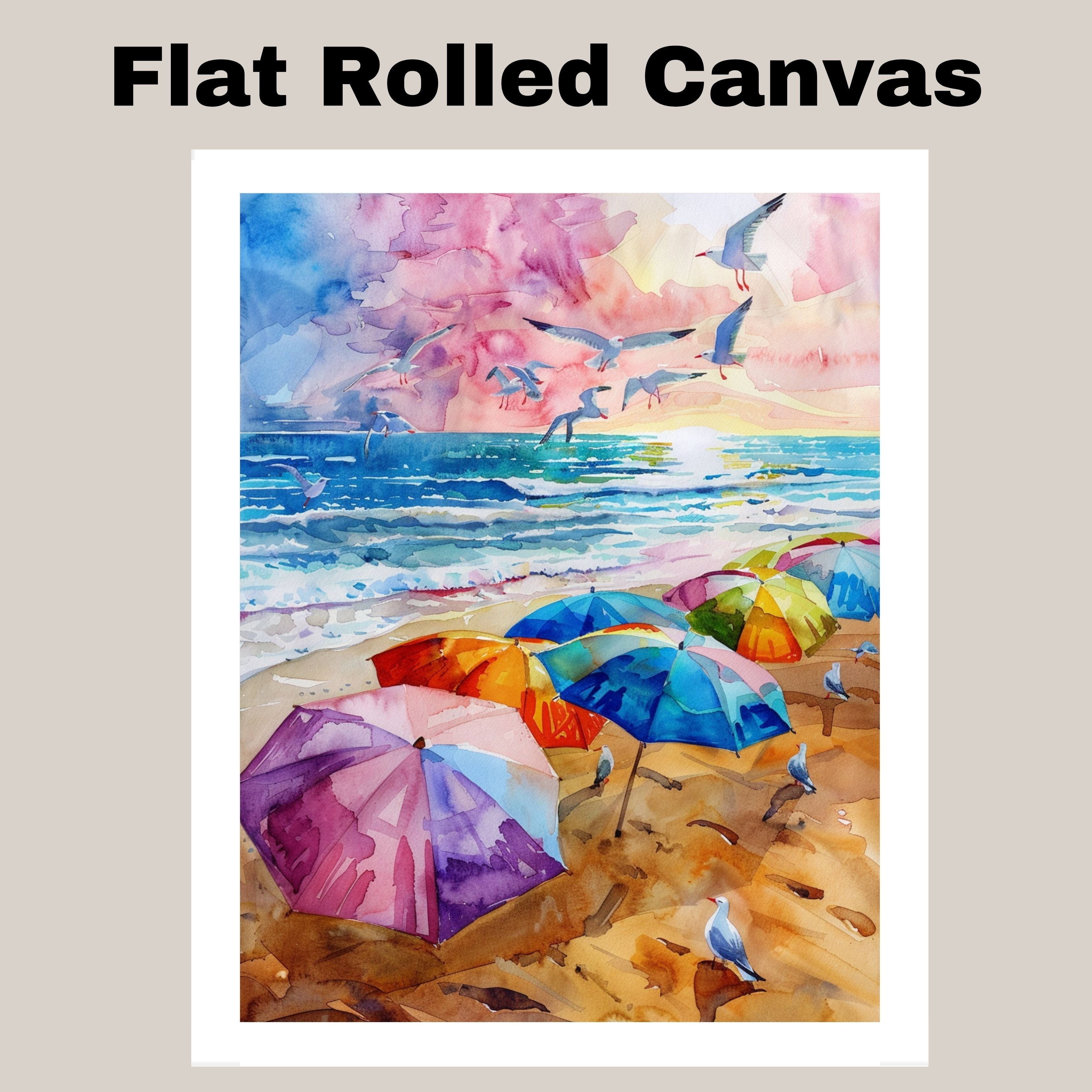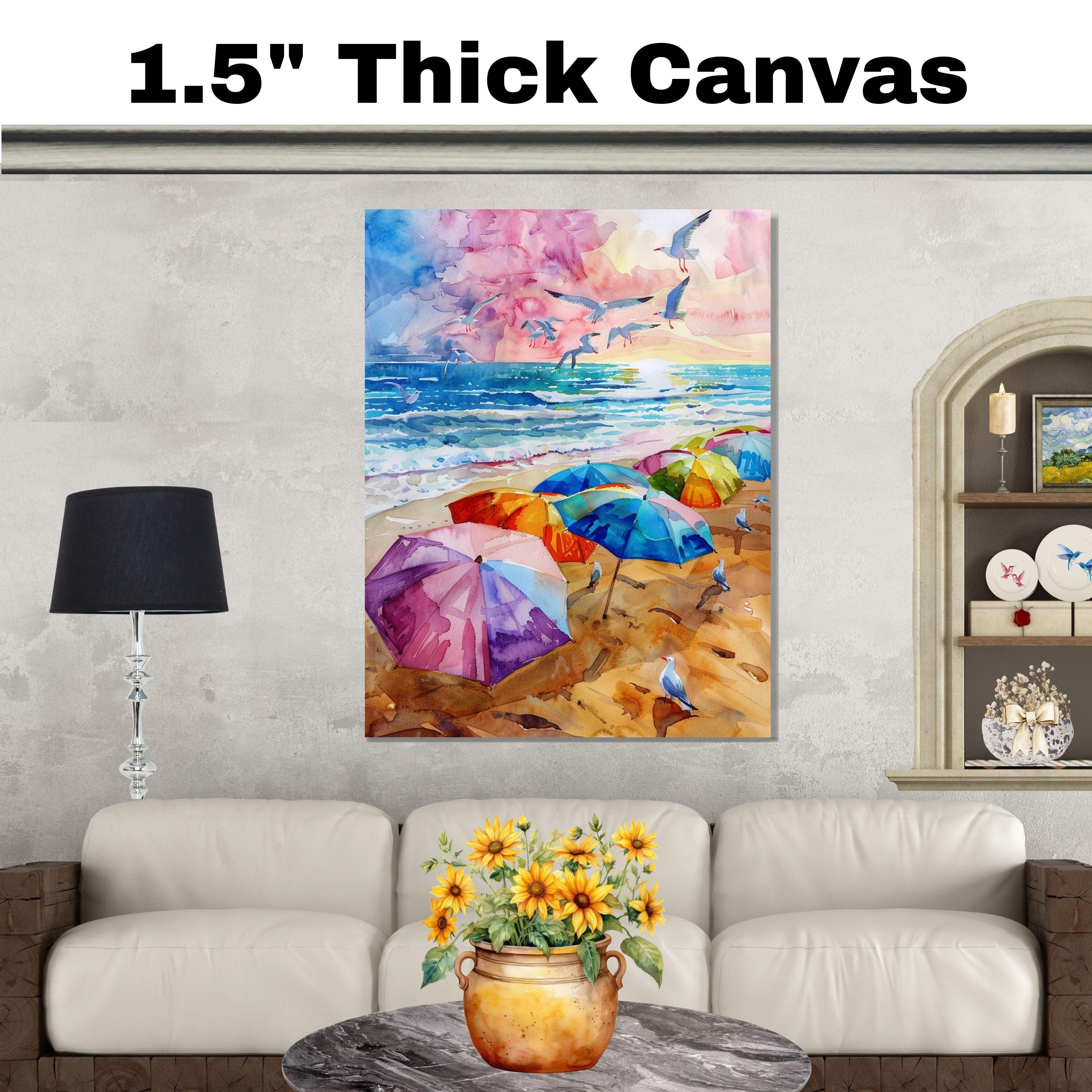 Watercolor Painting of Multicolored Beach Umbrellas with Seagulls at Sunset on Ready to Hang 1.5" Thick Canvas Wrap, Floating Framed Canvas, Flat Rolled Canvas