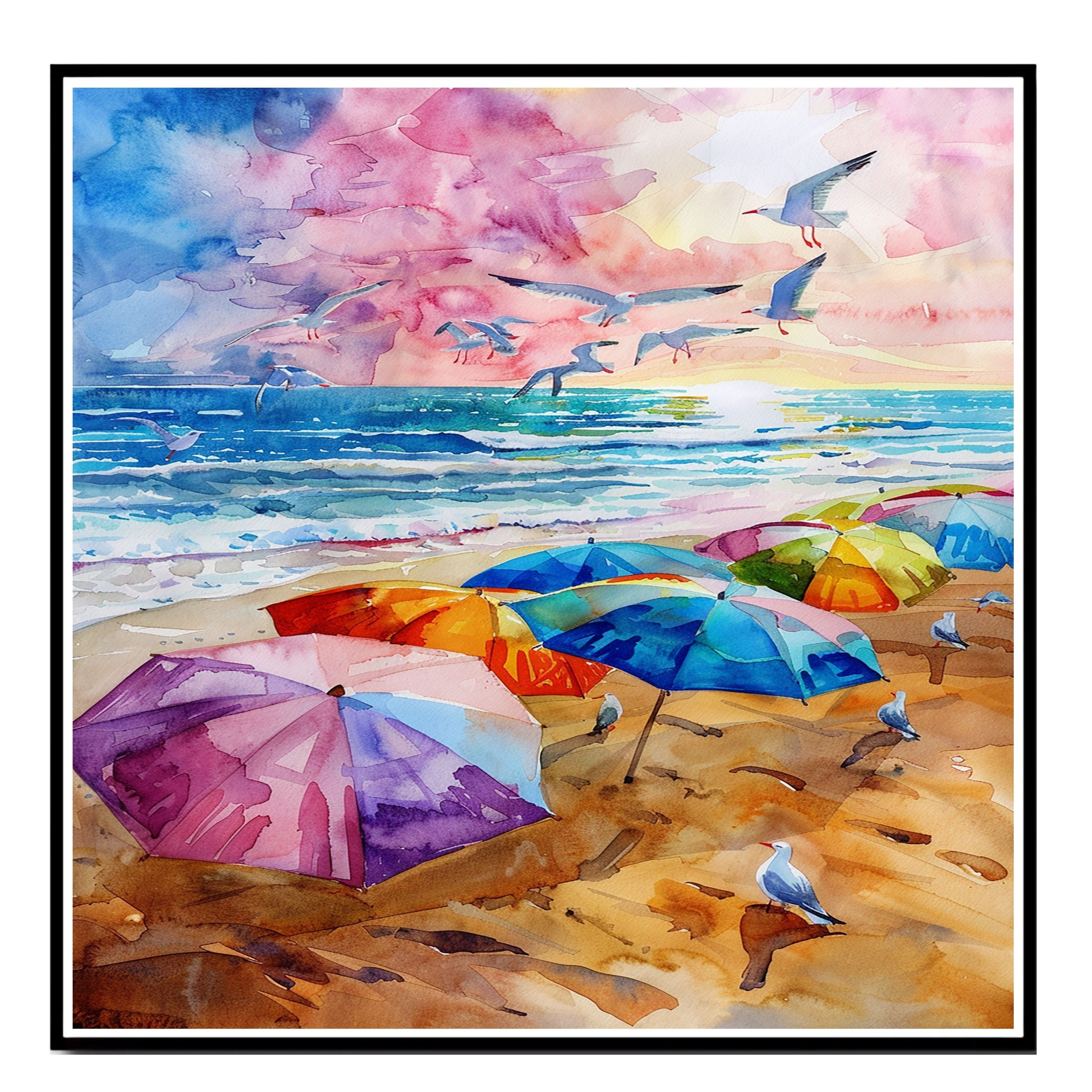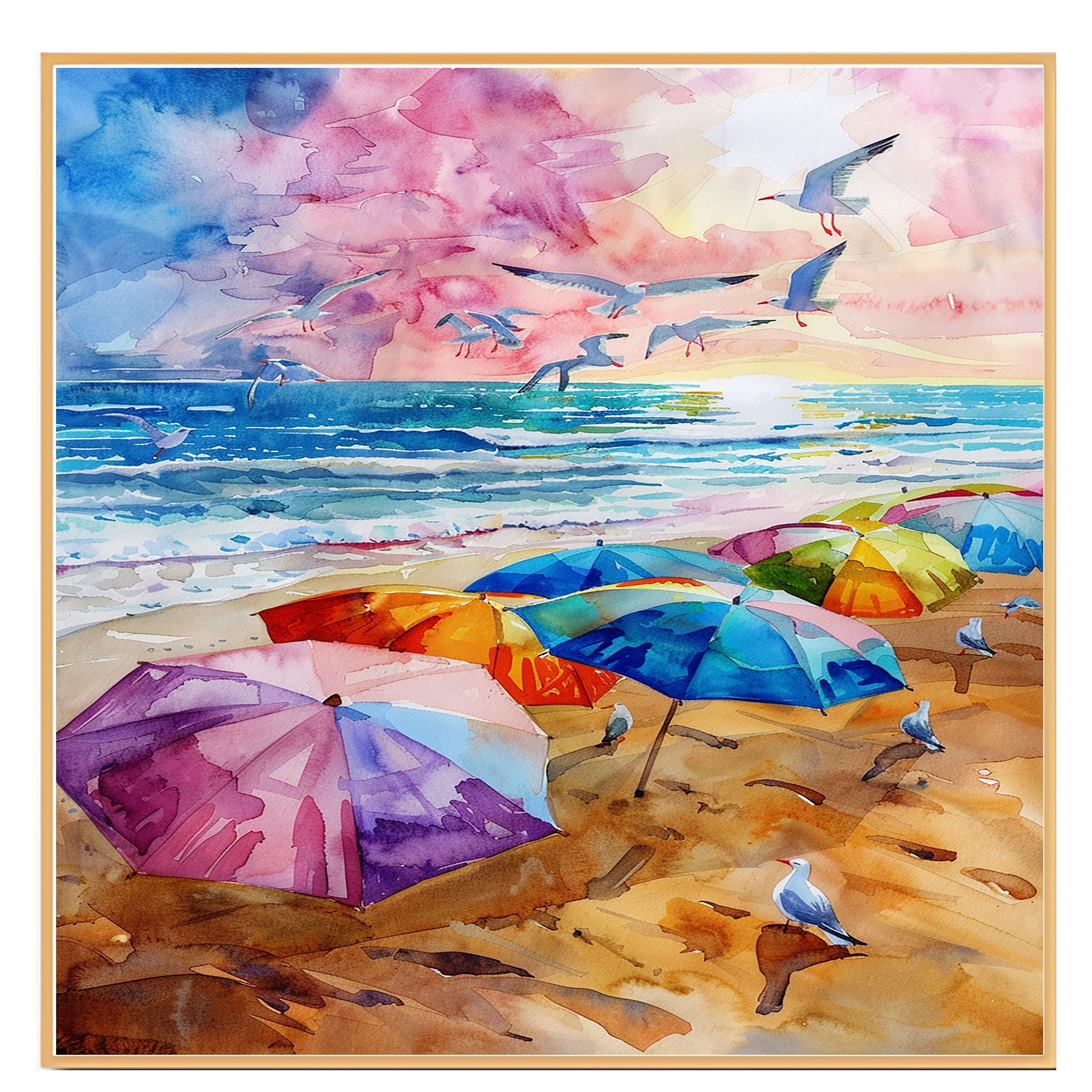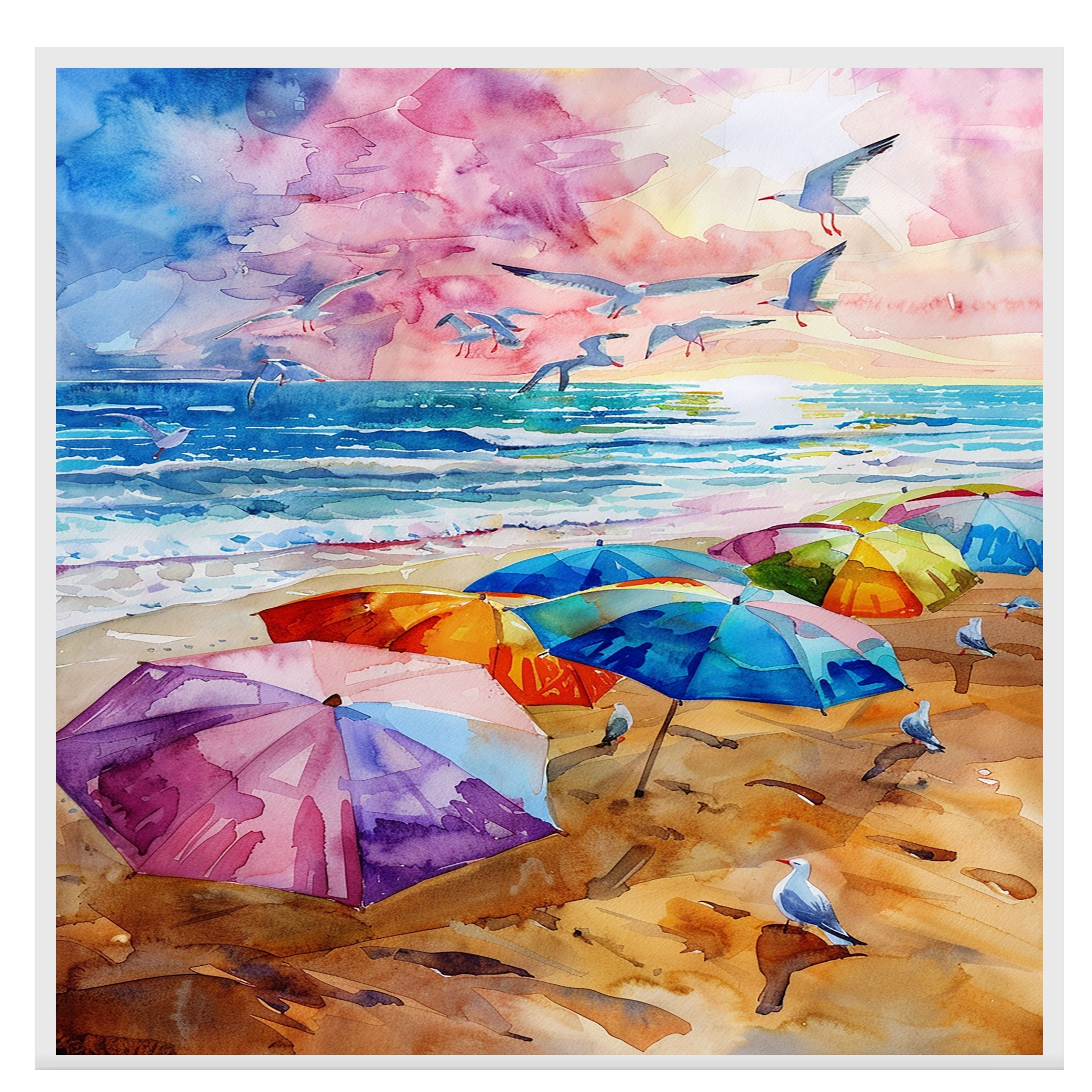 A vivid watercolor artwork showcasing colorful beach umbrellas on a sandy shore as seagulls soar above the...