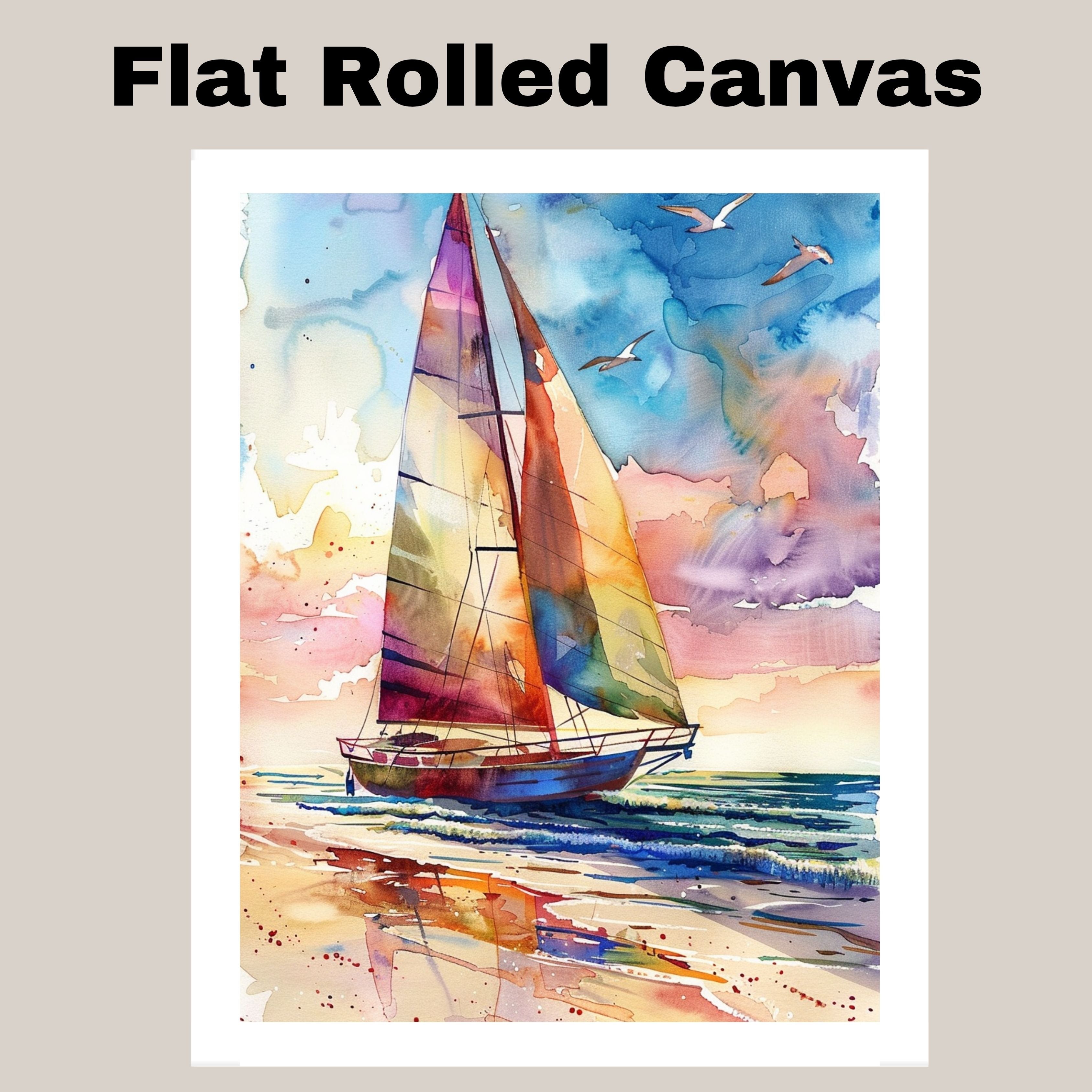 Watercolor Painting of Multicolored Sailboat on Ocean with Sunset Sky and Seagulls on Ready to Hang 1.5" Thick Canvas Wrap, Floating Framed Canvas, Flat Rolled Canvas