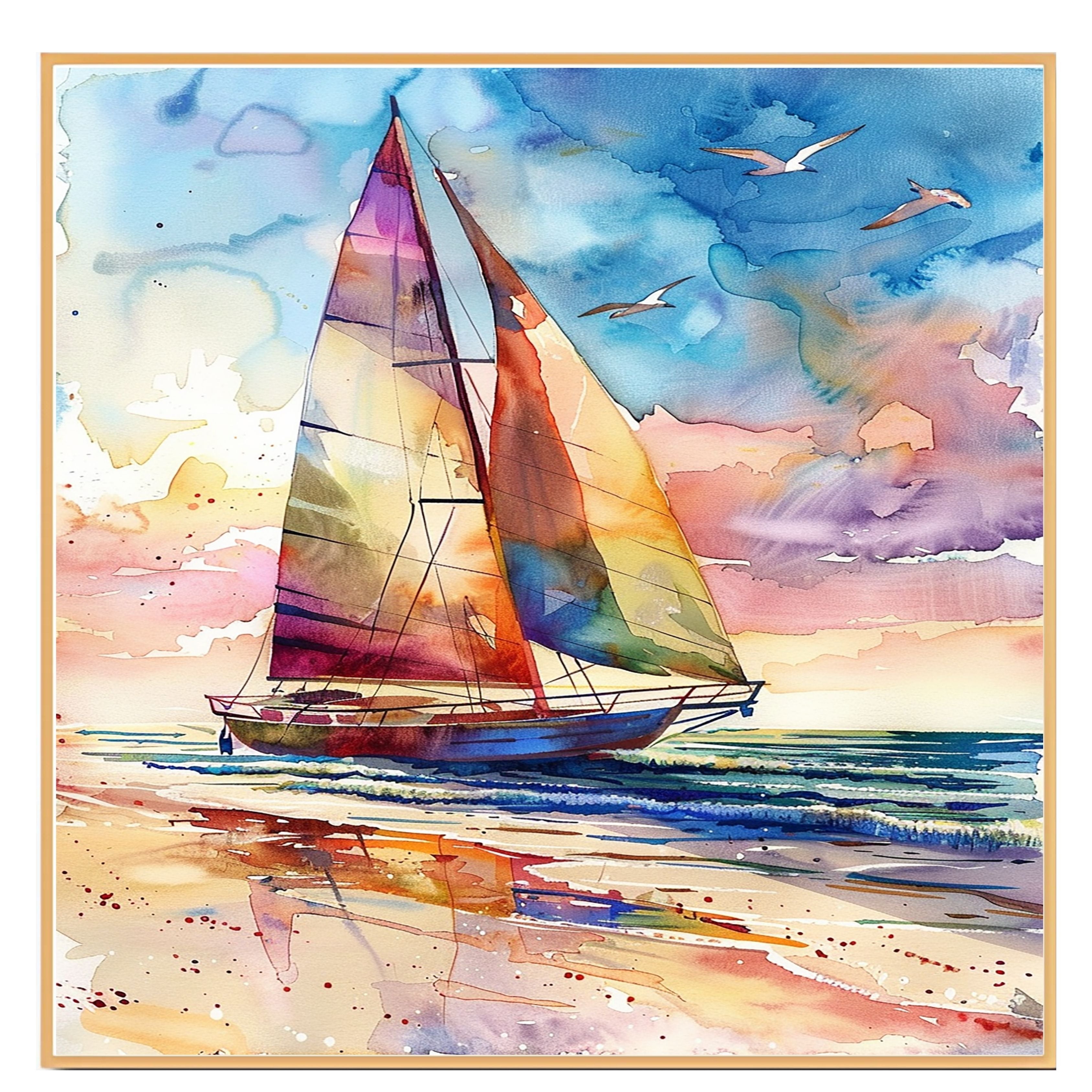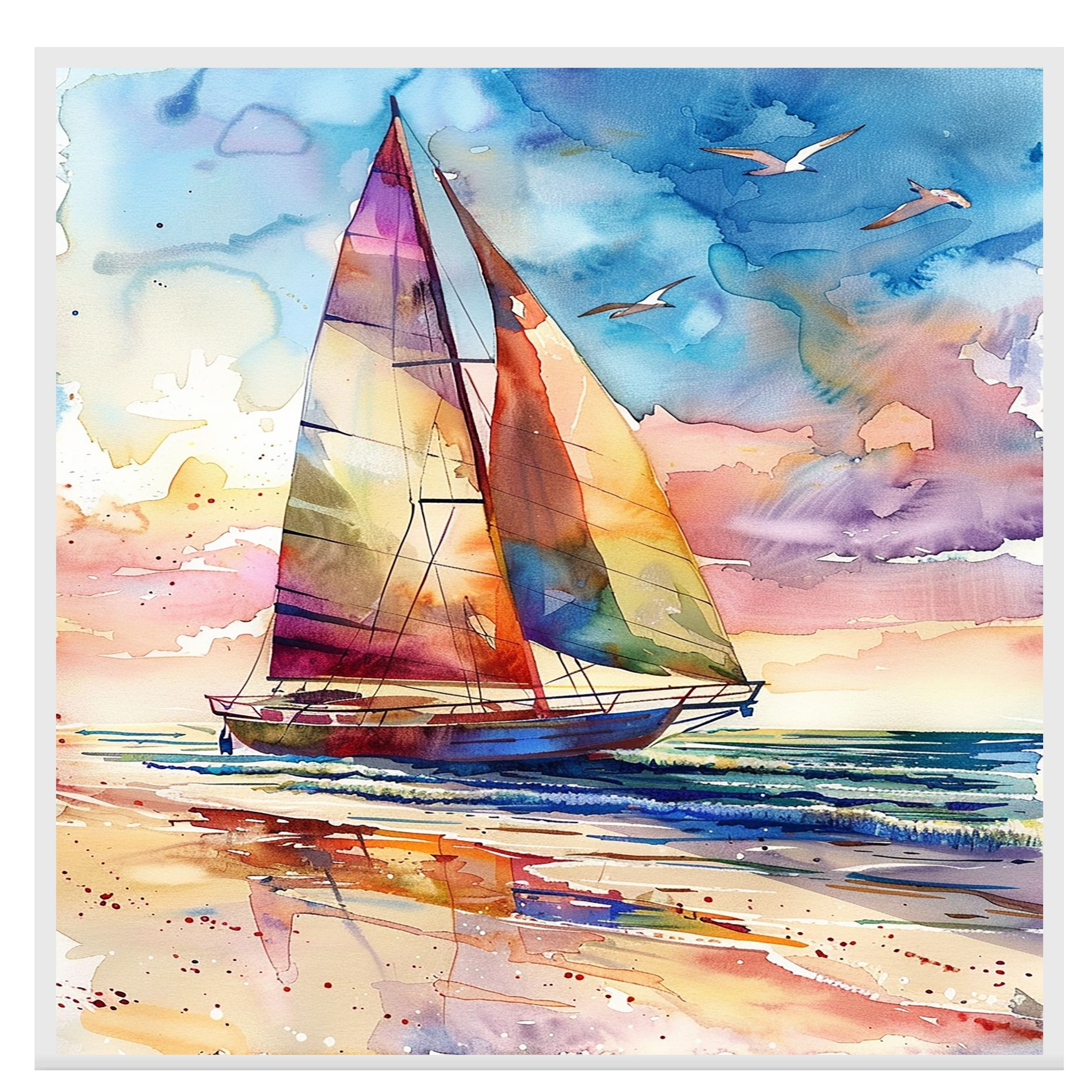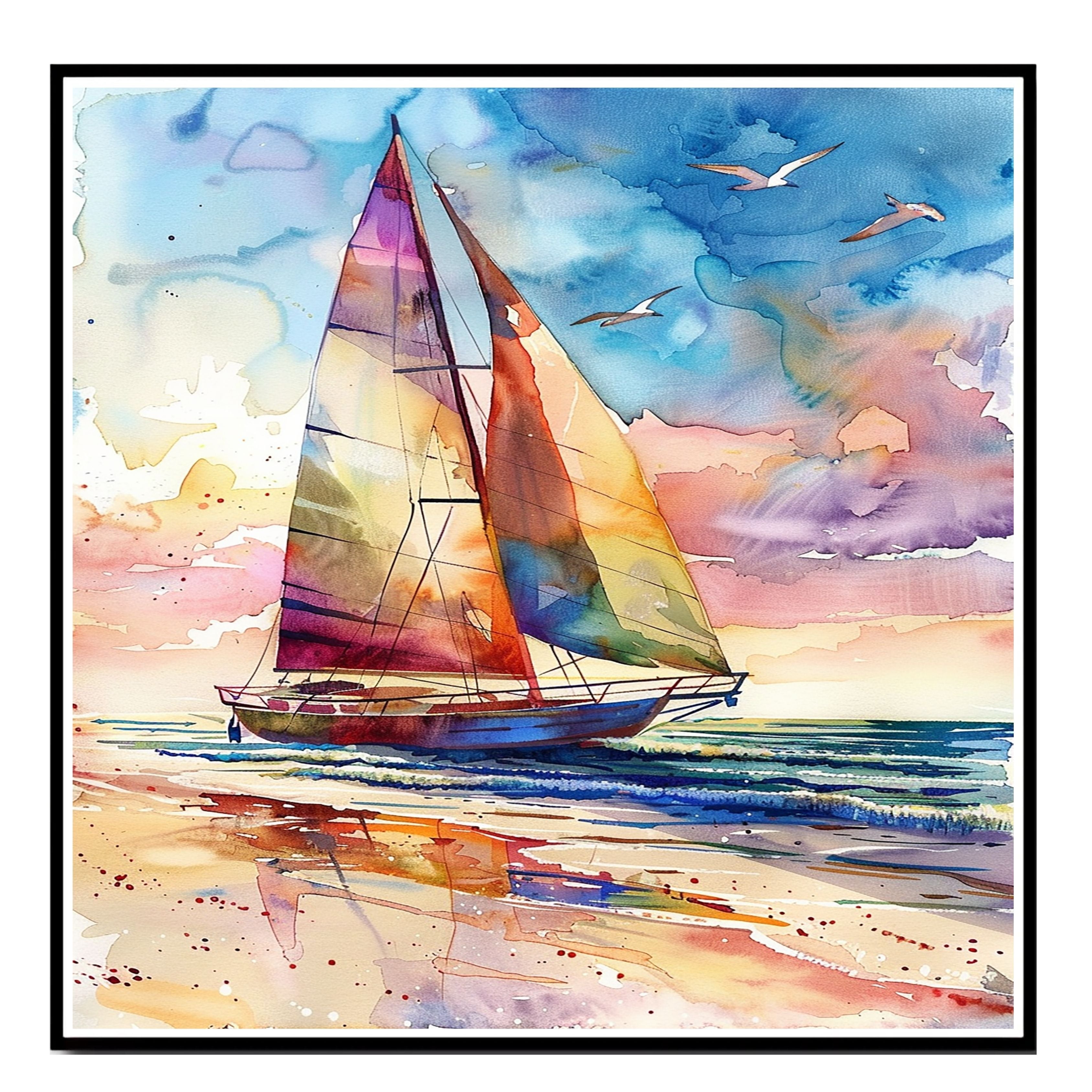 Sail into tranquility with this vibrant watercolor painting of a multicolored sailboat gliding across calm seas at sunset. The soft reflections, vivid sails, and soaring seagulls evoke freedom and peace—perfect for nautical lovers, beach enthusiasts, and those dreaming of open horizons.