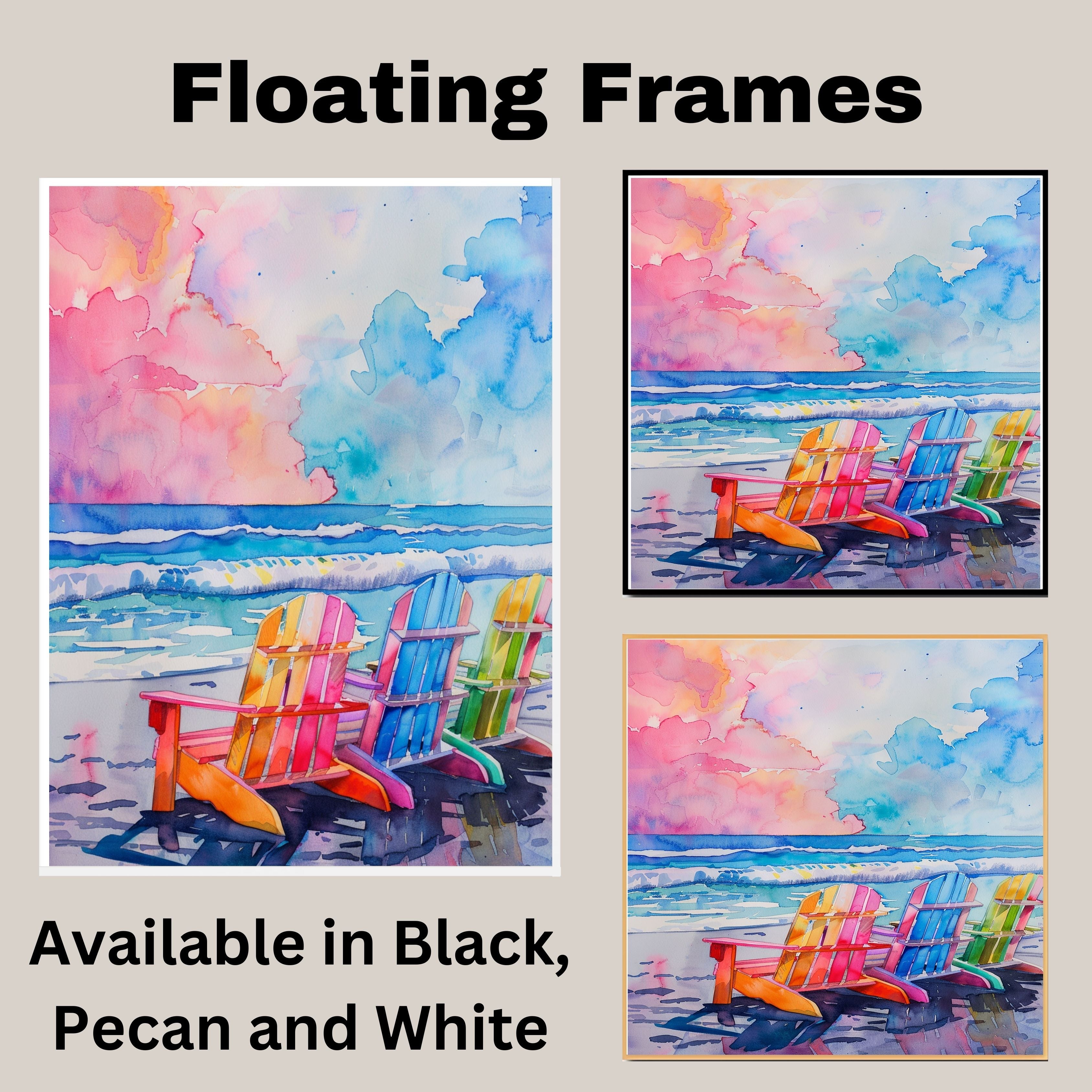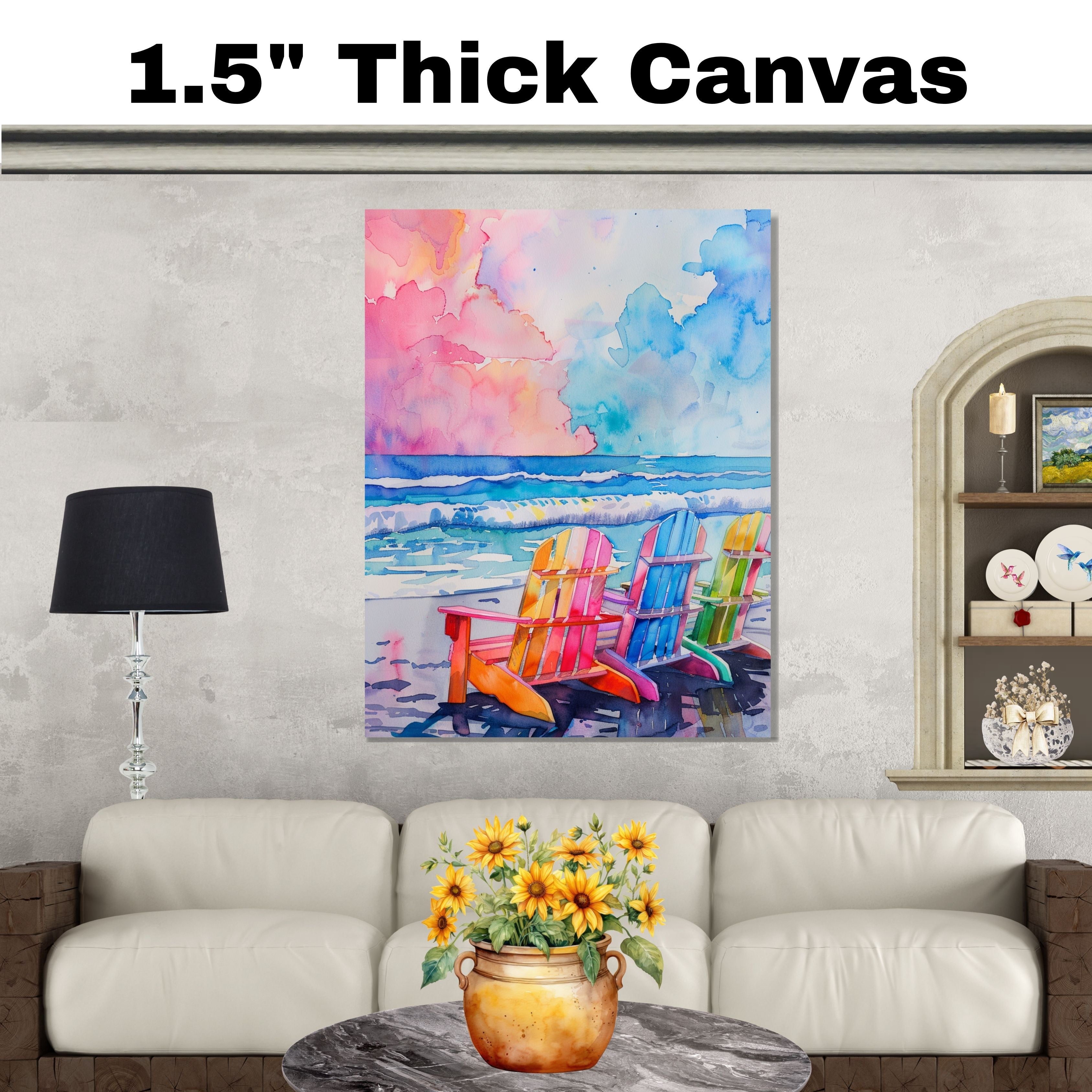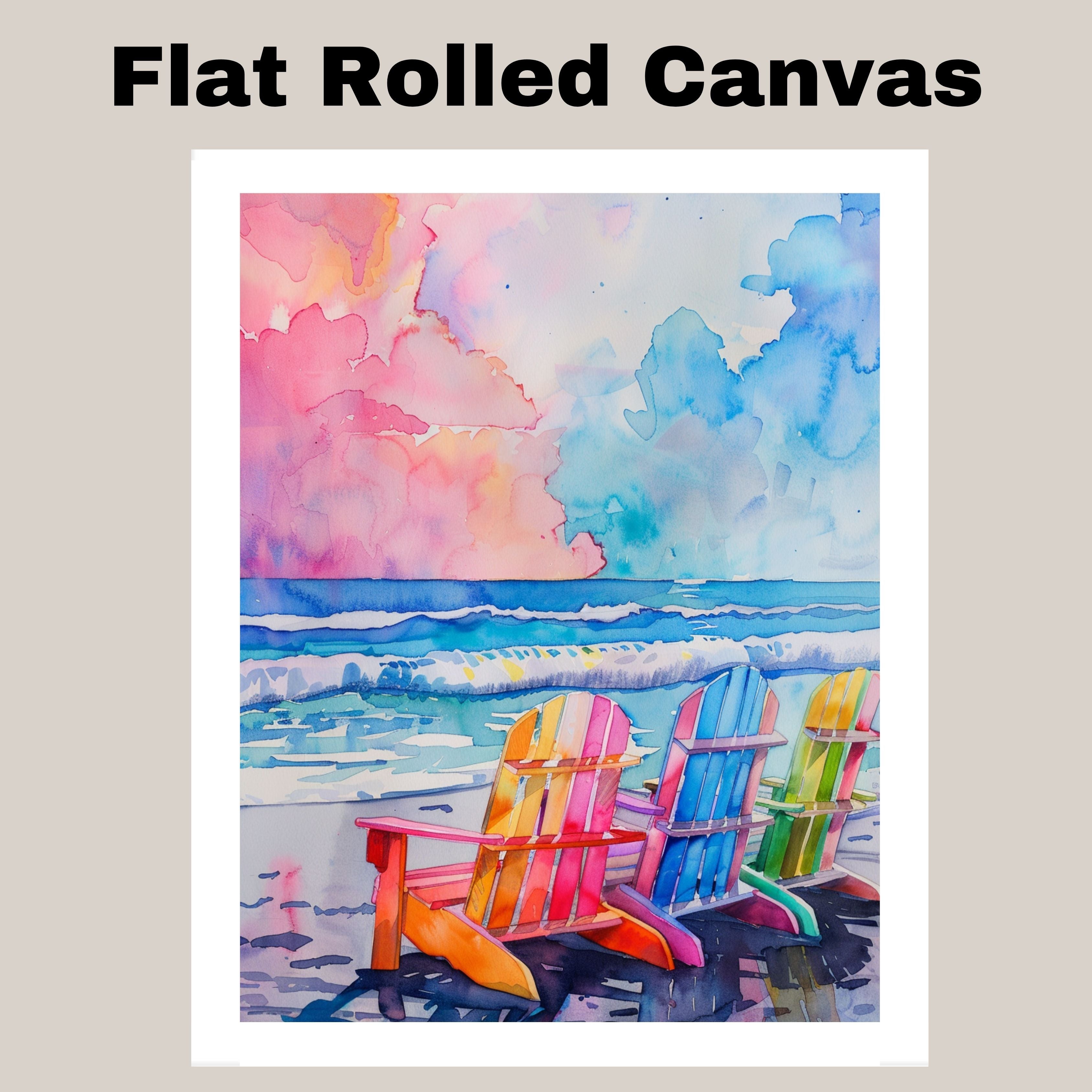 Watercolor Painting of Rainbow Beach Chairs on the Shoreline with Vibrant Ocean Waves and Pastel Sunset Sky on Ready to Hang 1.5" Thick Canvas Wrap, Floating Framed Canvas, Flat Rolled Canvas