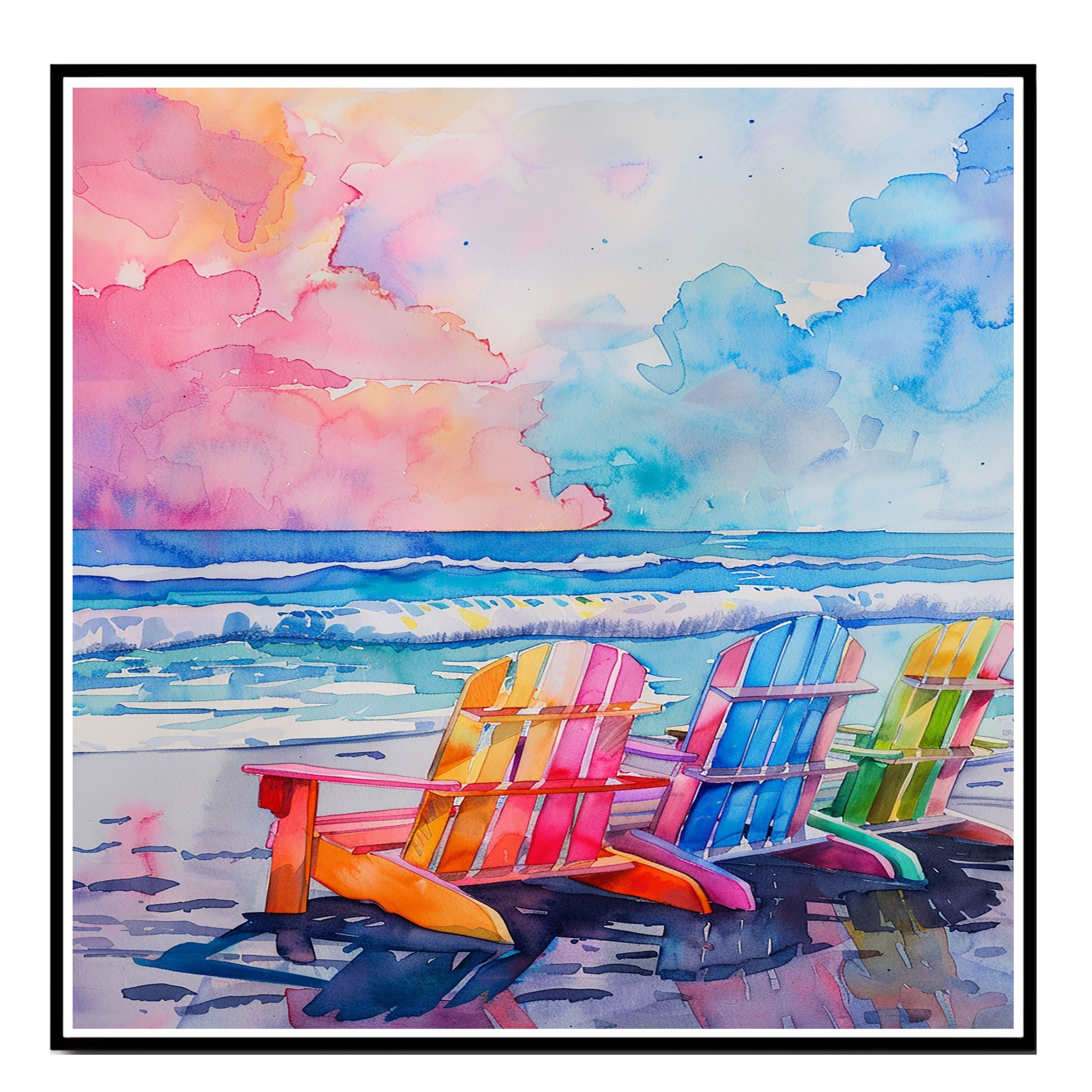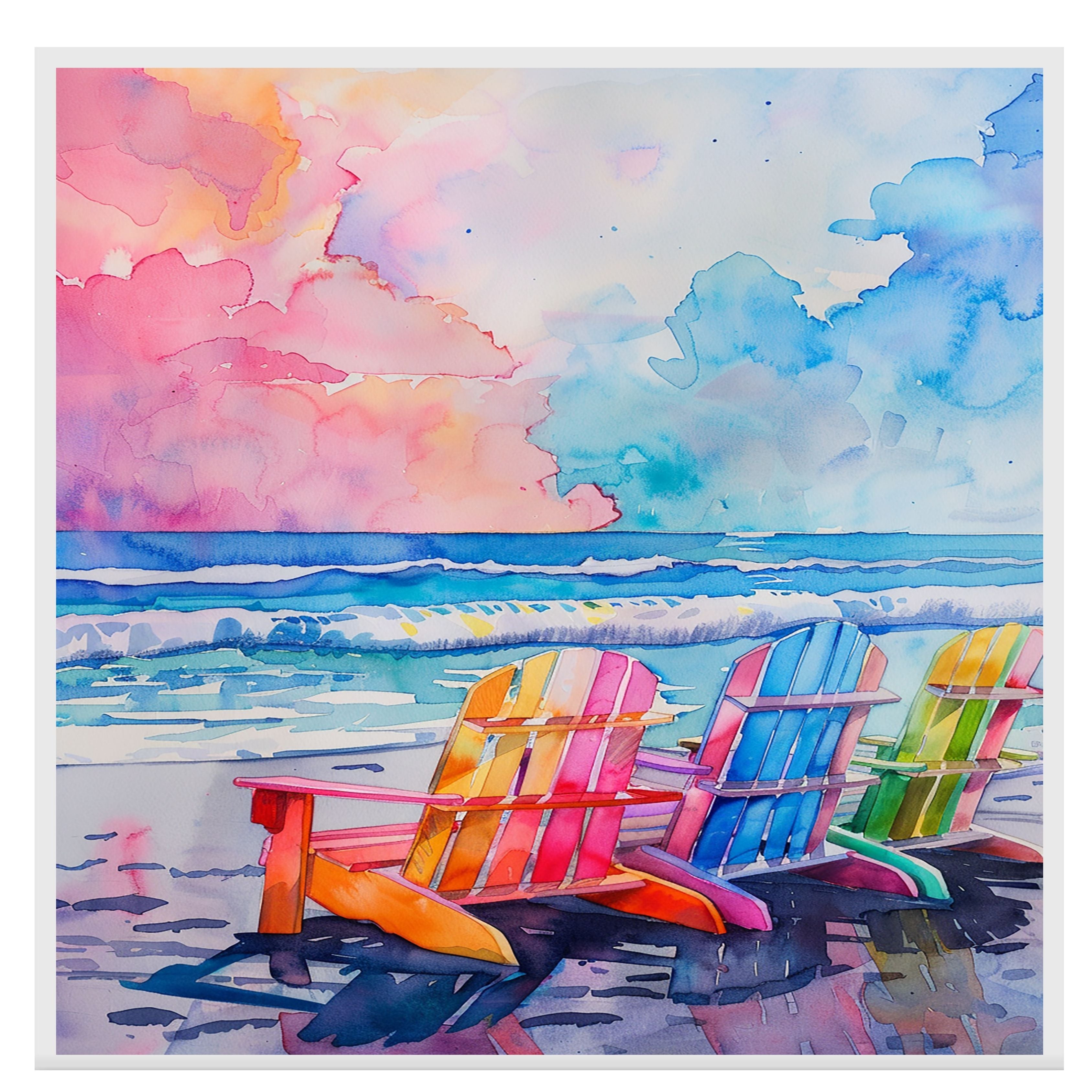 Celebrate the serenity of the seaside with this vibrant watercolor artwork featuring rainbow-colored beach chairs along the ocean shore. Soft pastels and crashing waves create a dreamy beachside vibe, perfect for adding coastal energy to any space. A lively blend of color and calm.