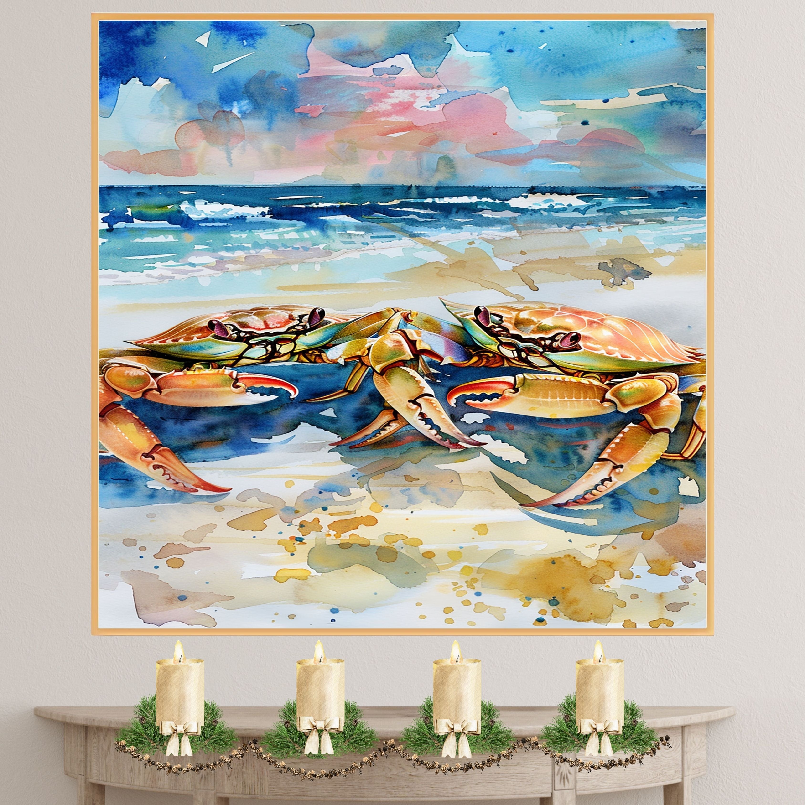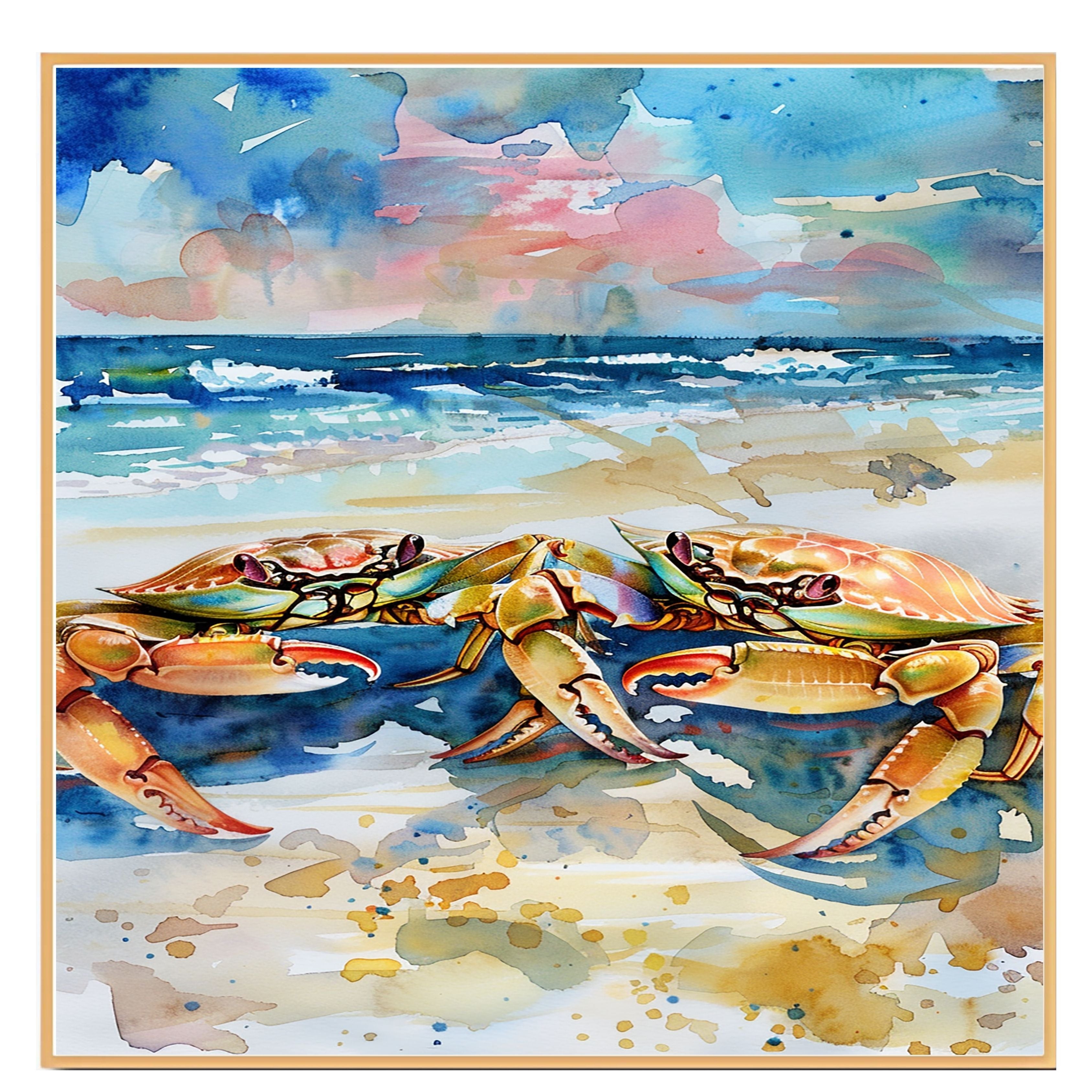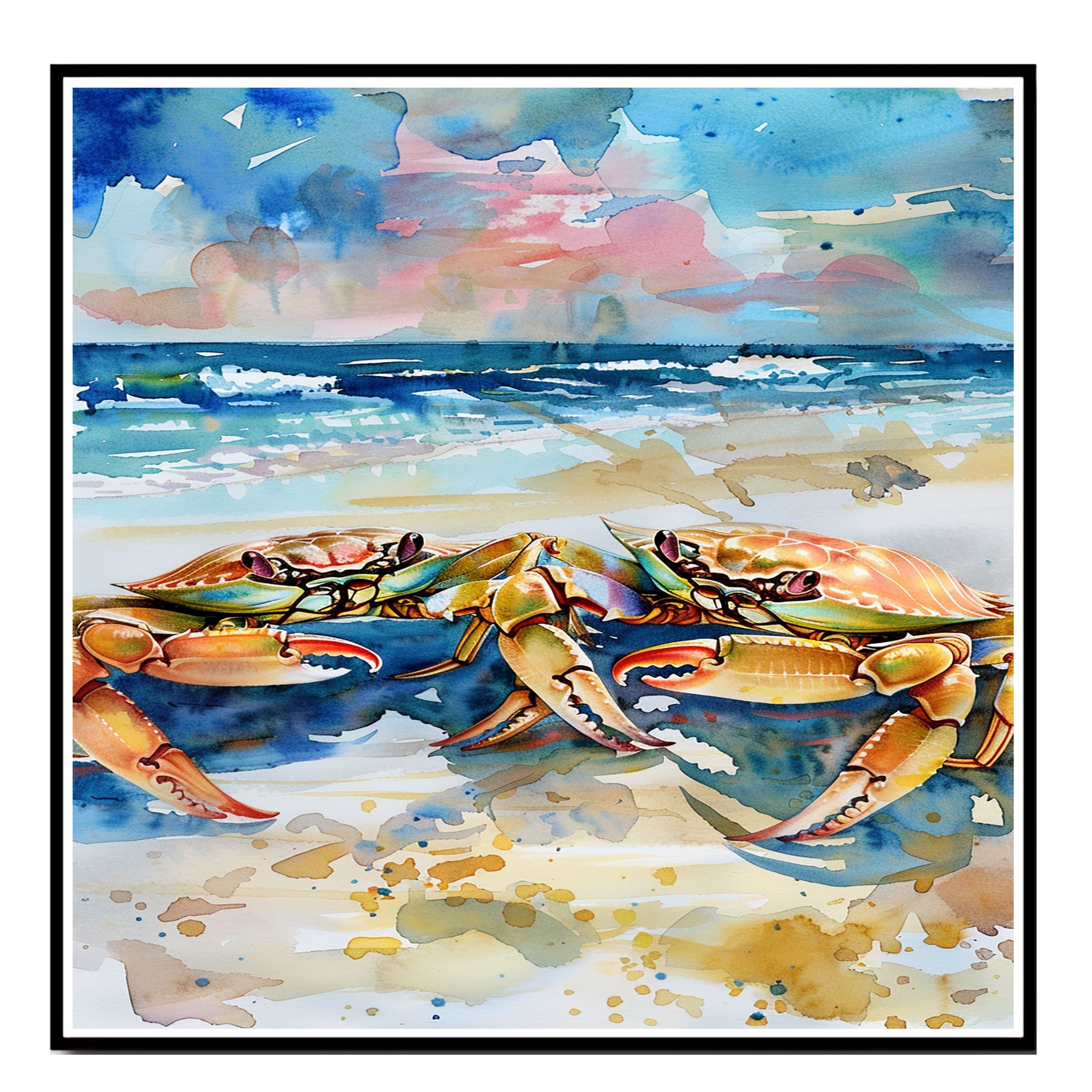This stunning watercolor artwork features two vividly colored crabs on a sunlit beach with ocean waves and a pastel sky in the background. The painting's vibrant tones of orange, yellow, and turquoise add a playful yet elegant touch to coastal-themed spaces. Ideal for beach lovers and marine life art collectors.