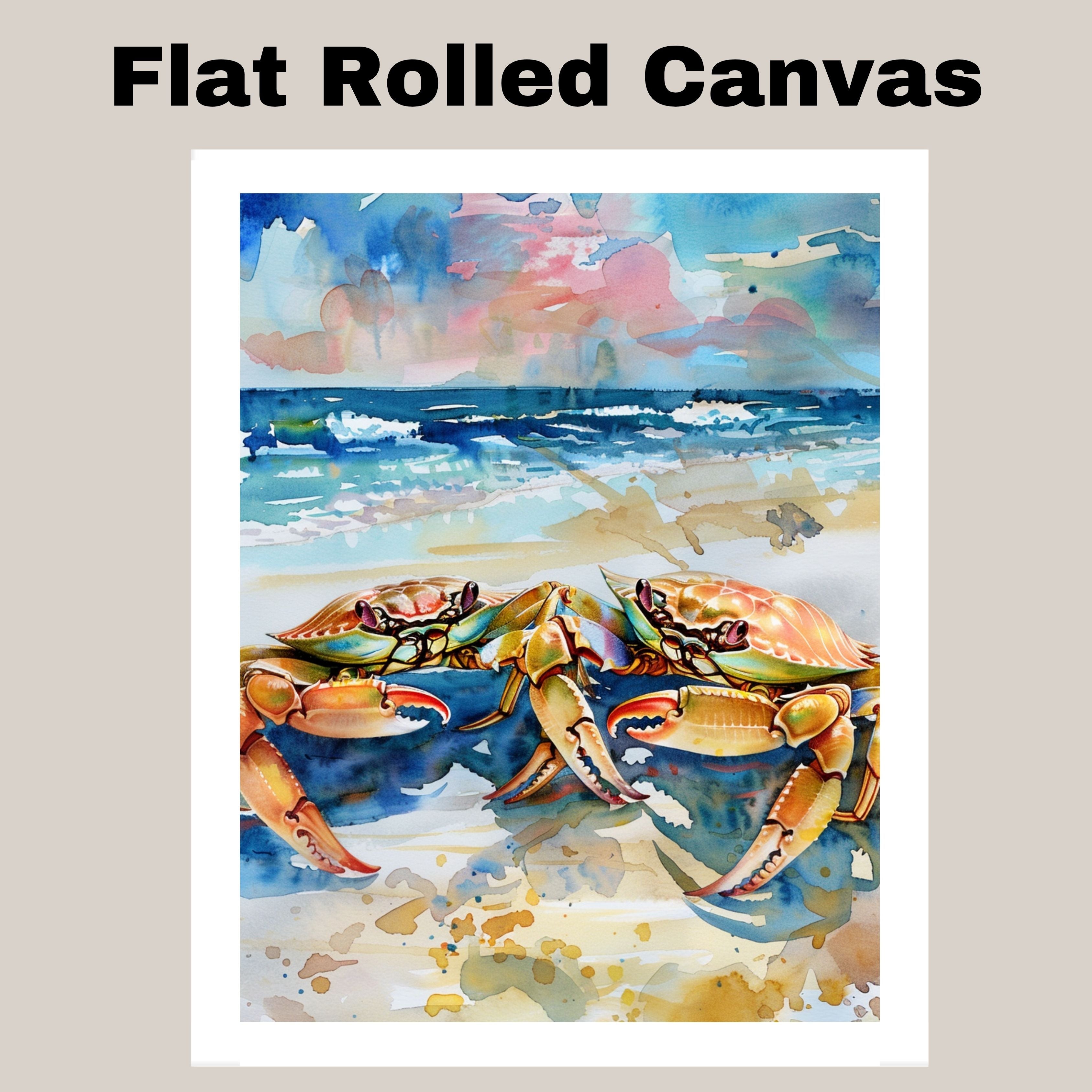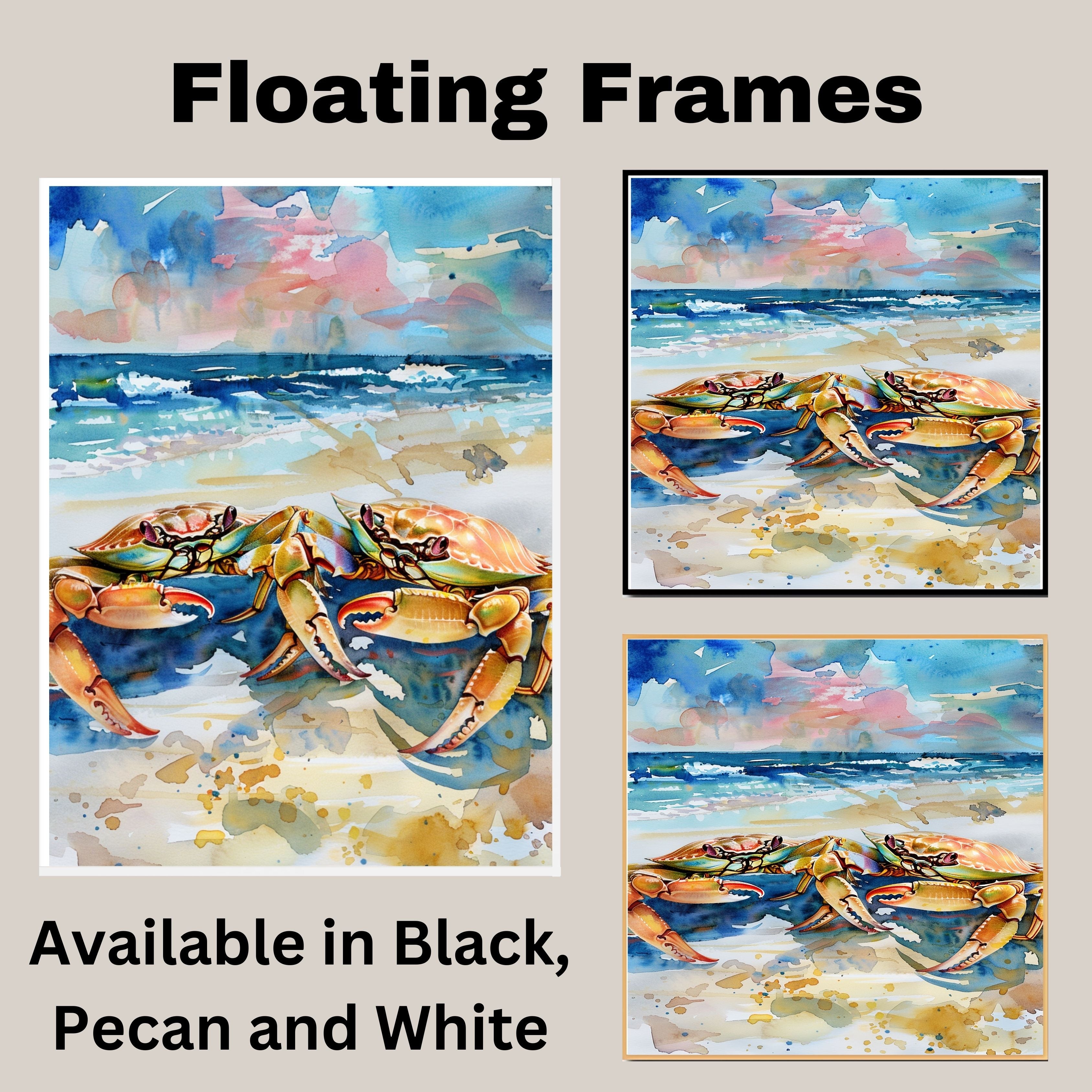Watercolor Painting of Two Multicolored Crabs on Beach – Coastal Ocean Art Print with Sea and Sunset Background on Ready to Hang 1.5" Thick Canvas Wrap, Floating Framed Canvas, Flat Rolled Canvas