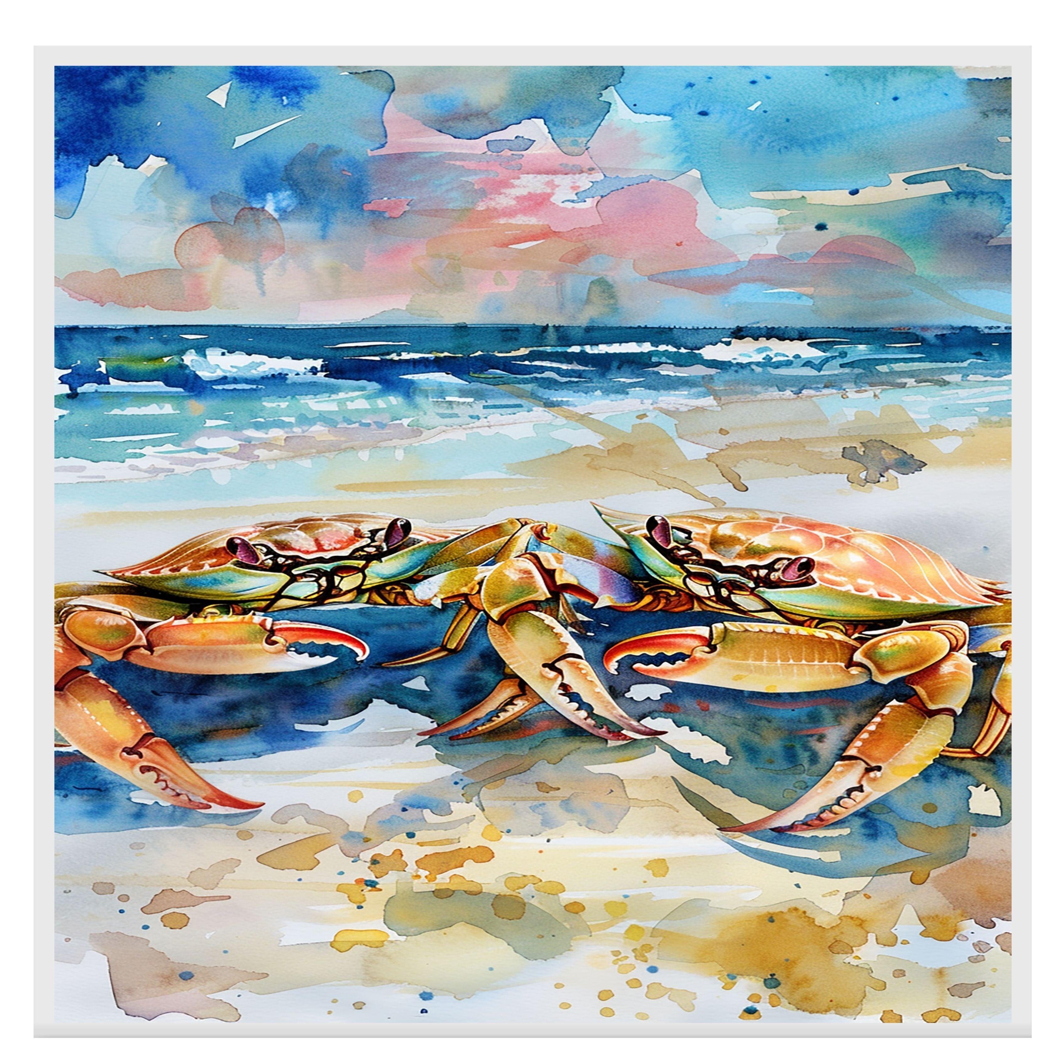 This stunning watercolor artwork features two vividly colored crabs on a sunlit beach with ocean waves and...