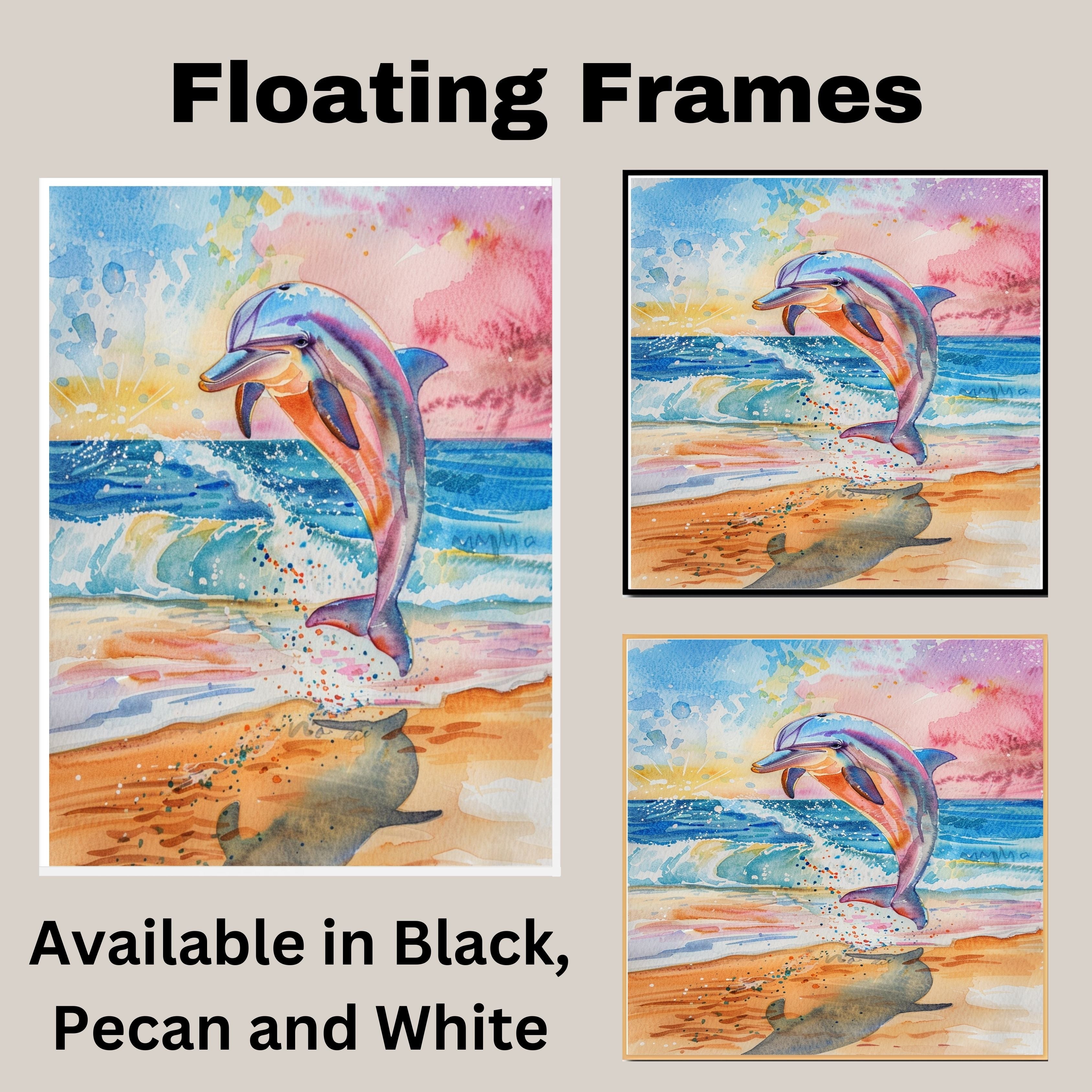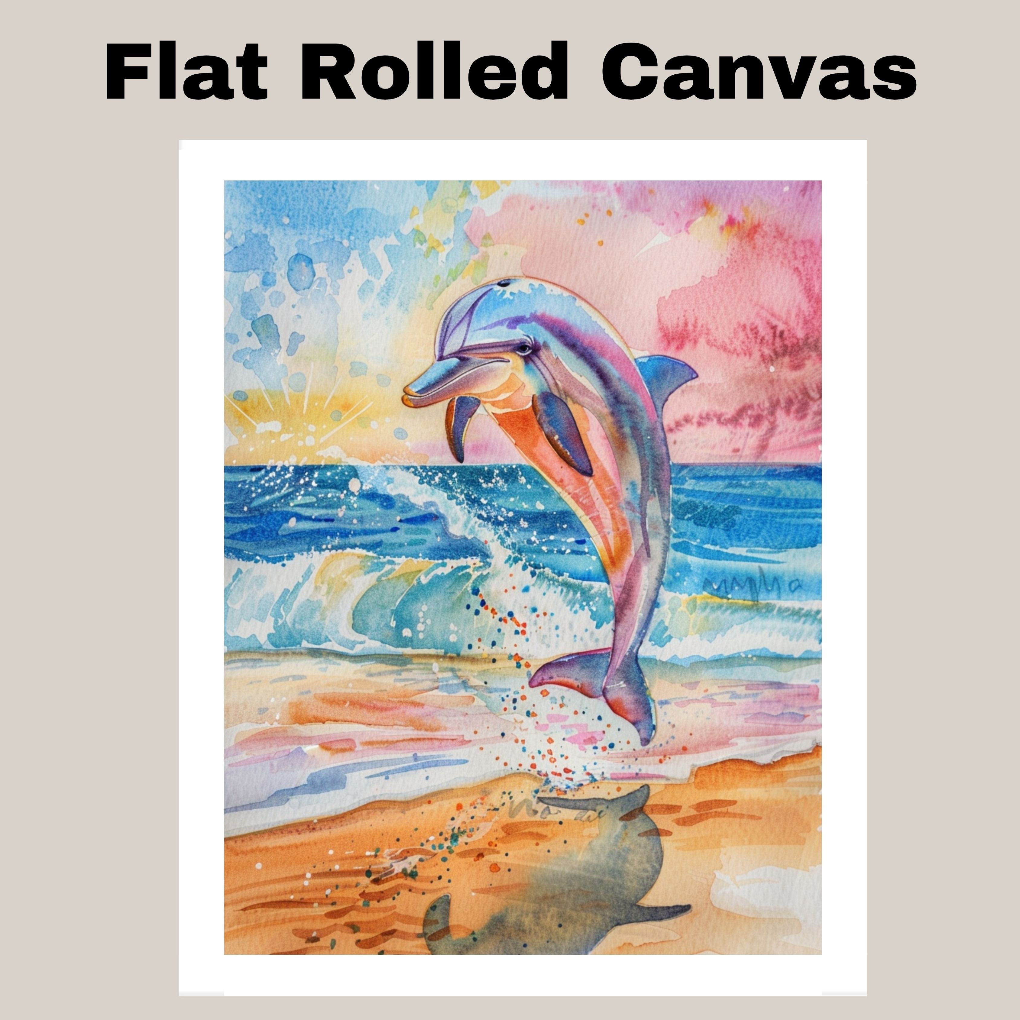 Watercolor Painting of Vibrant Dolphin Leaping Above Ocean Shore with Splashing Waves and Sunset Reflections on the Sand on Ready to Hang 1.5" Thick Canvas Wrap, Floating Framed Canvas, Flat Rolled Canvas