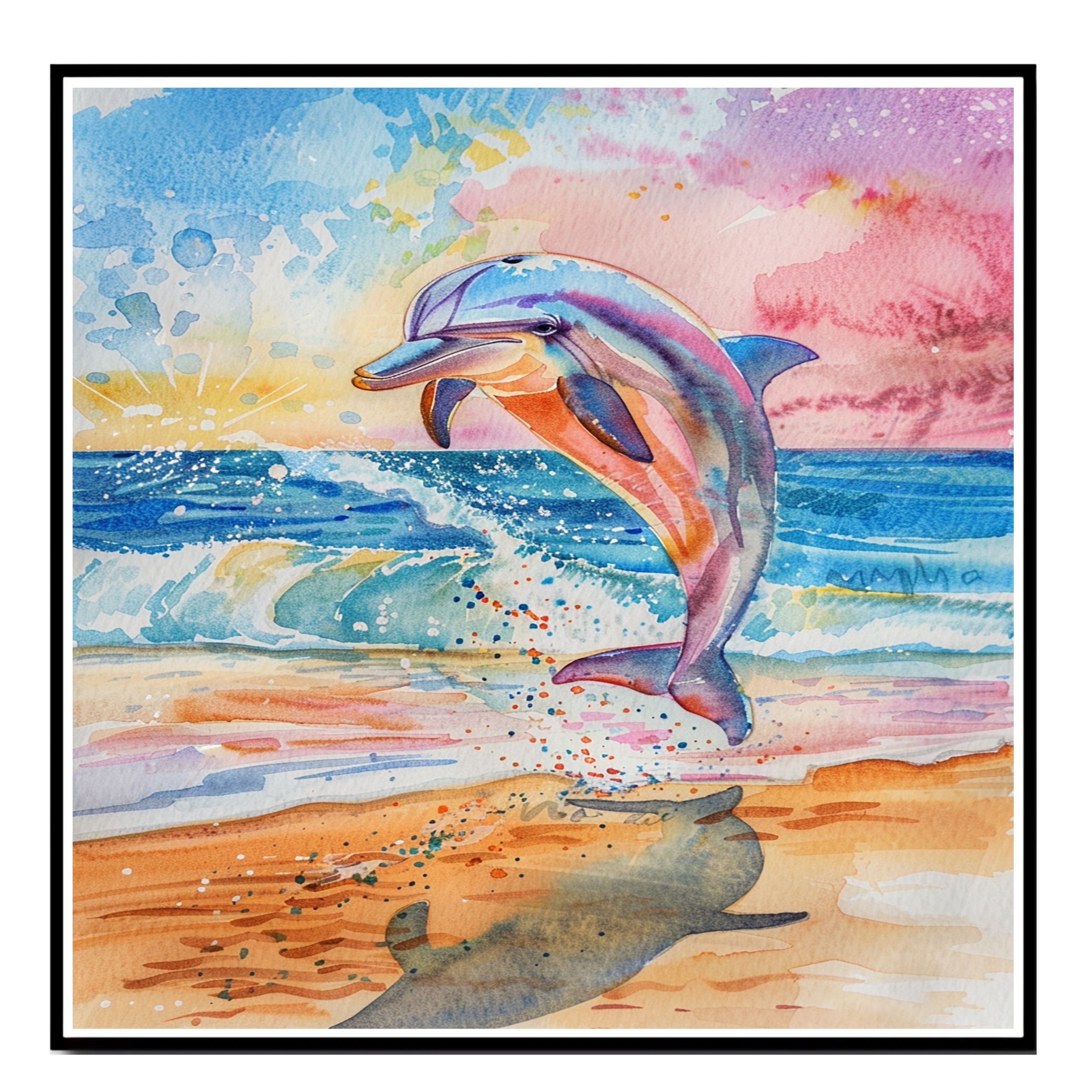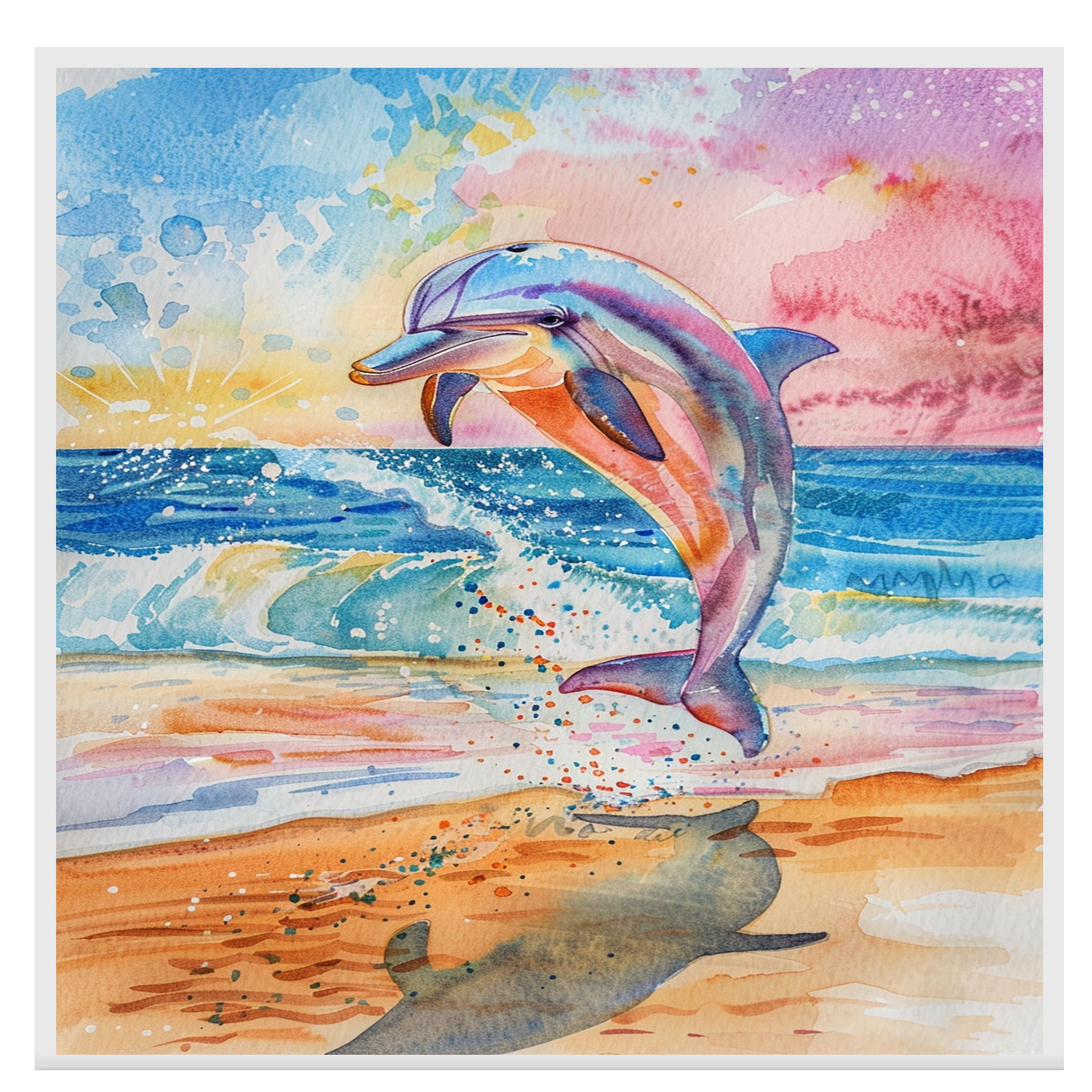 This vibrant watercolor captures the joyful energy of a dolphin leaping from the ocean near the shore, casting a shadow across the sand as the sun sets. Bold strokes and a spectrum of colors—from pinks and purples to blues and golden tones—bring this beachside moment to life. Perfect for those who love marine animals, beach themes, and lively coastal artwork.