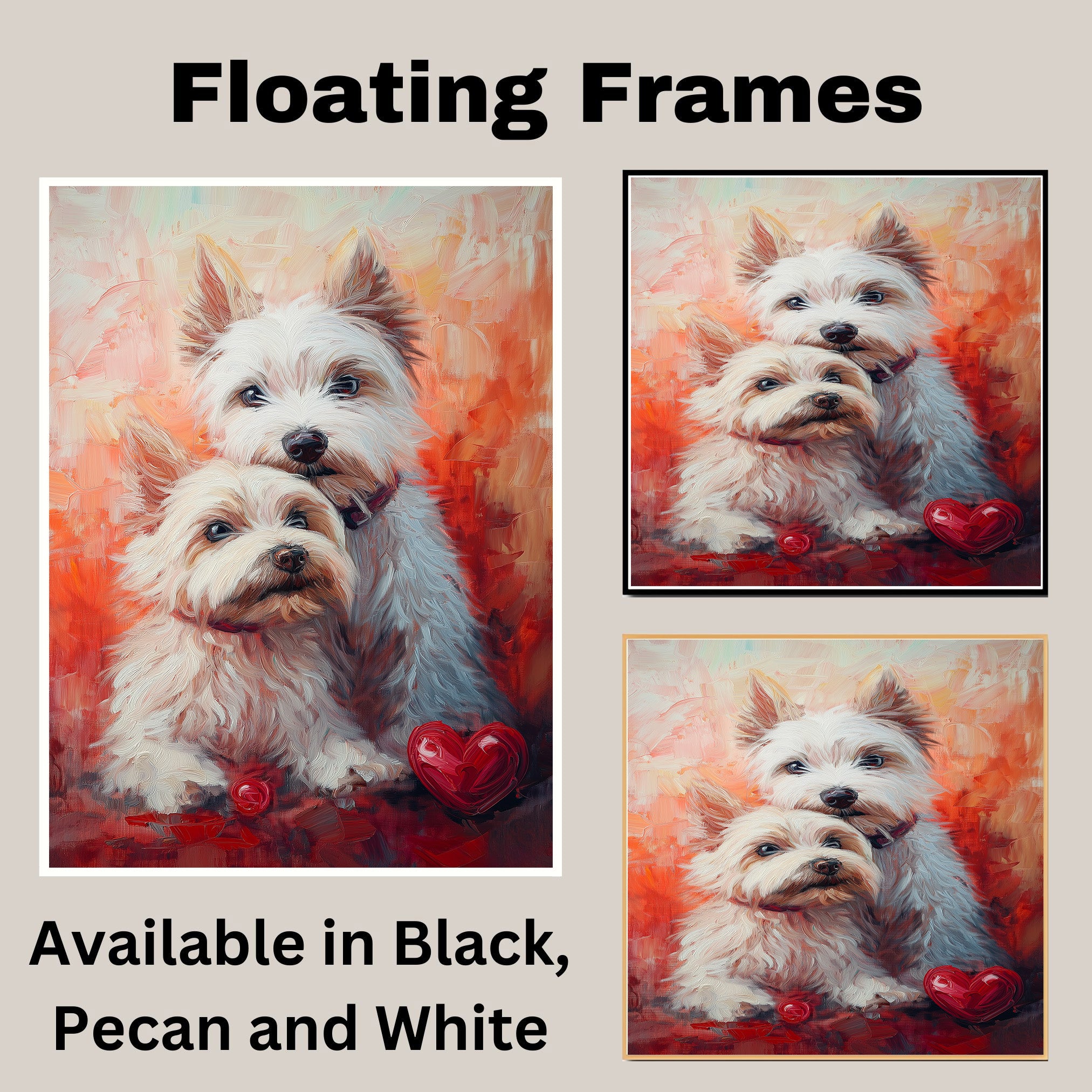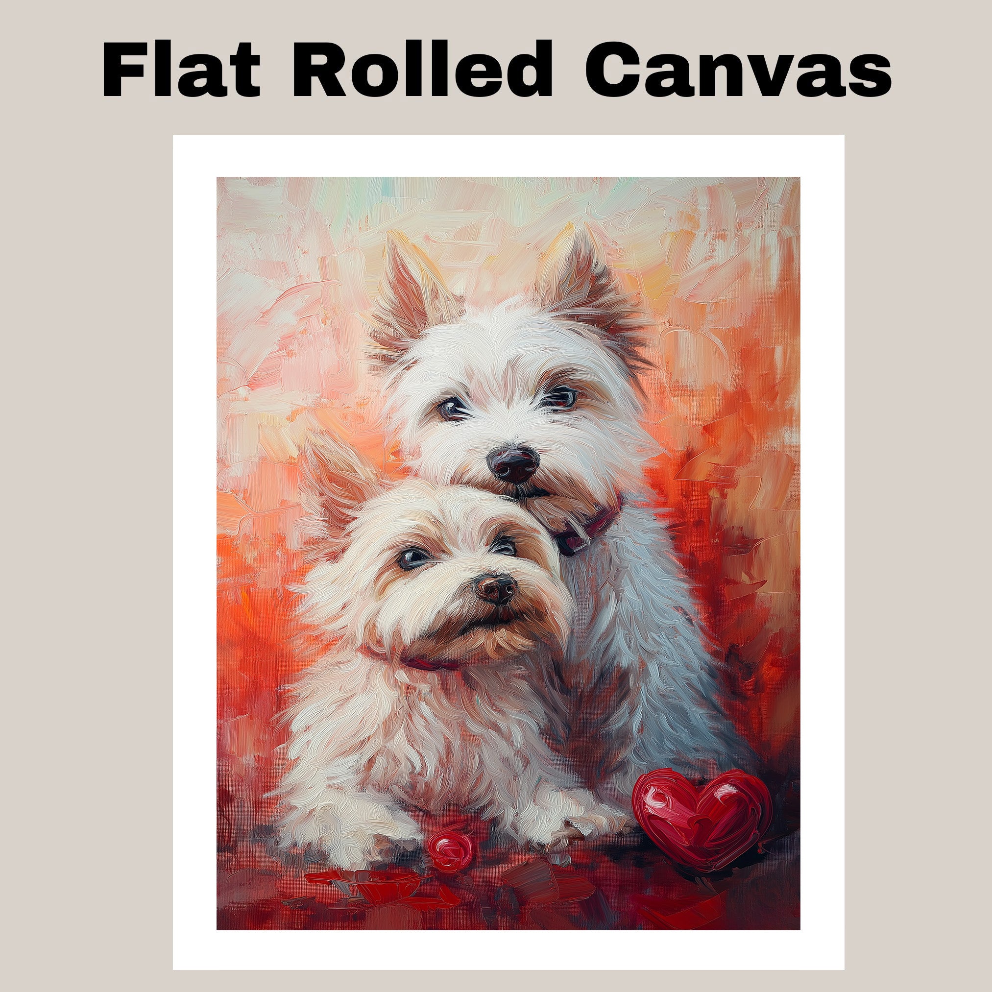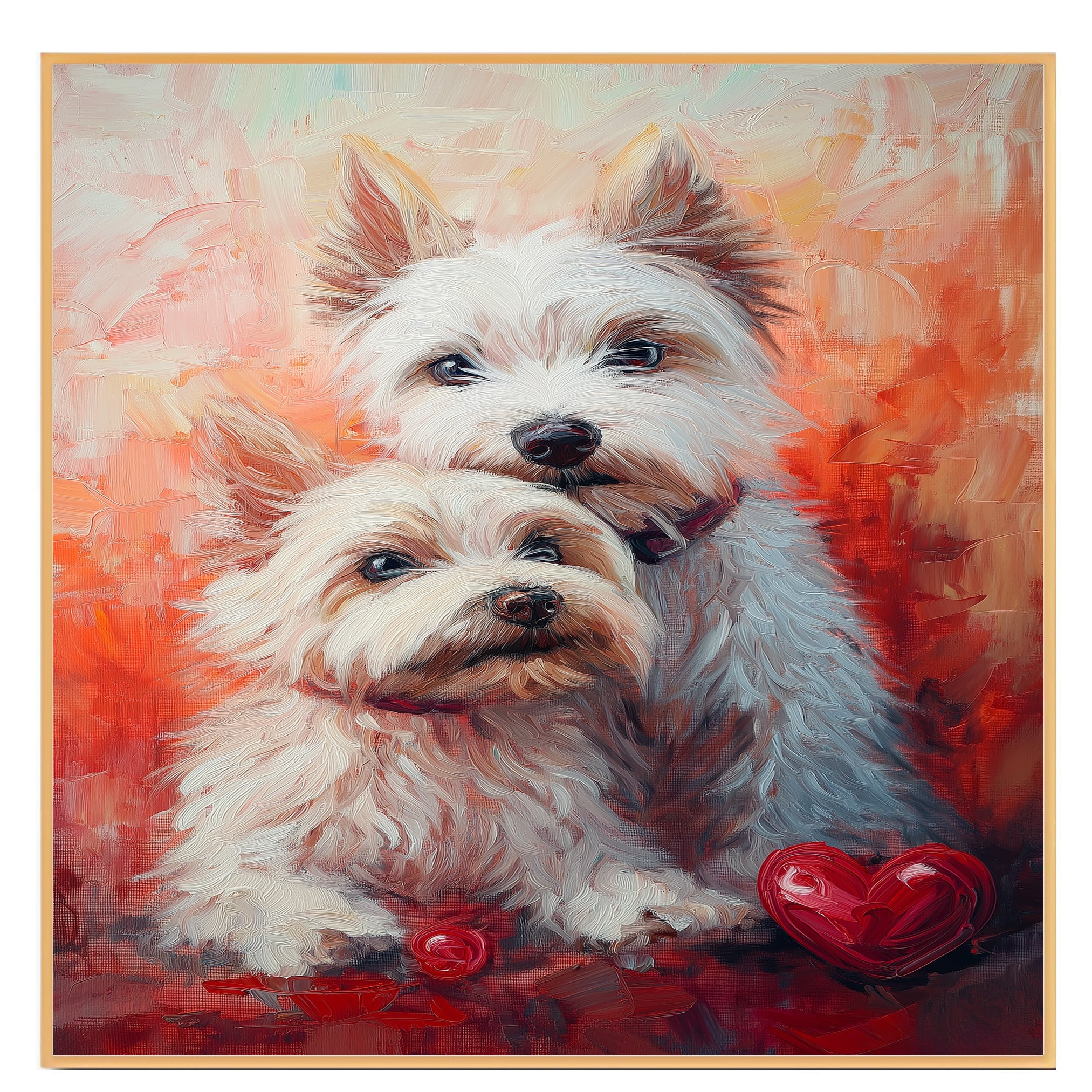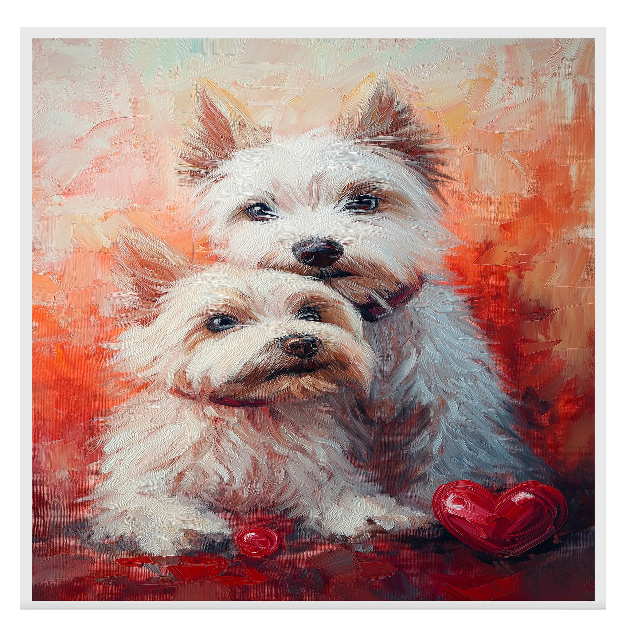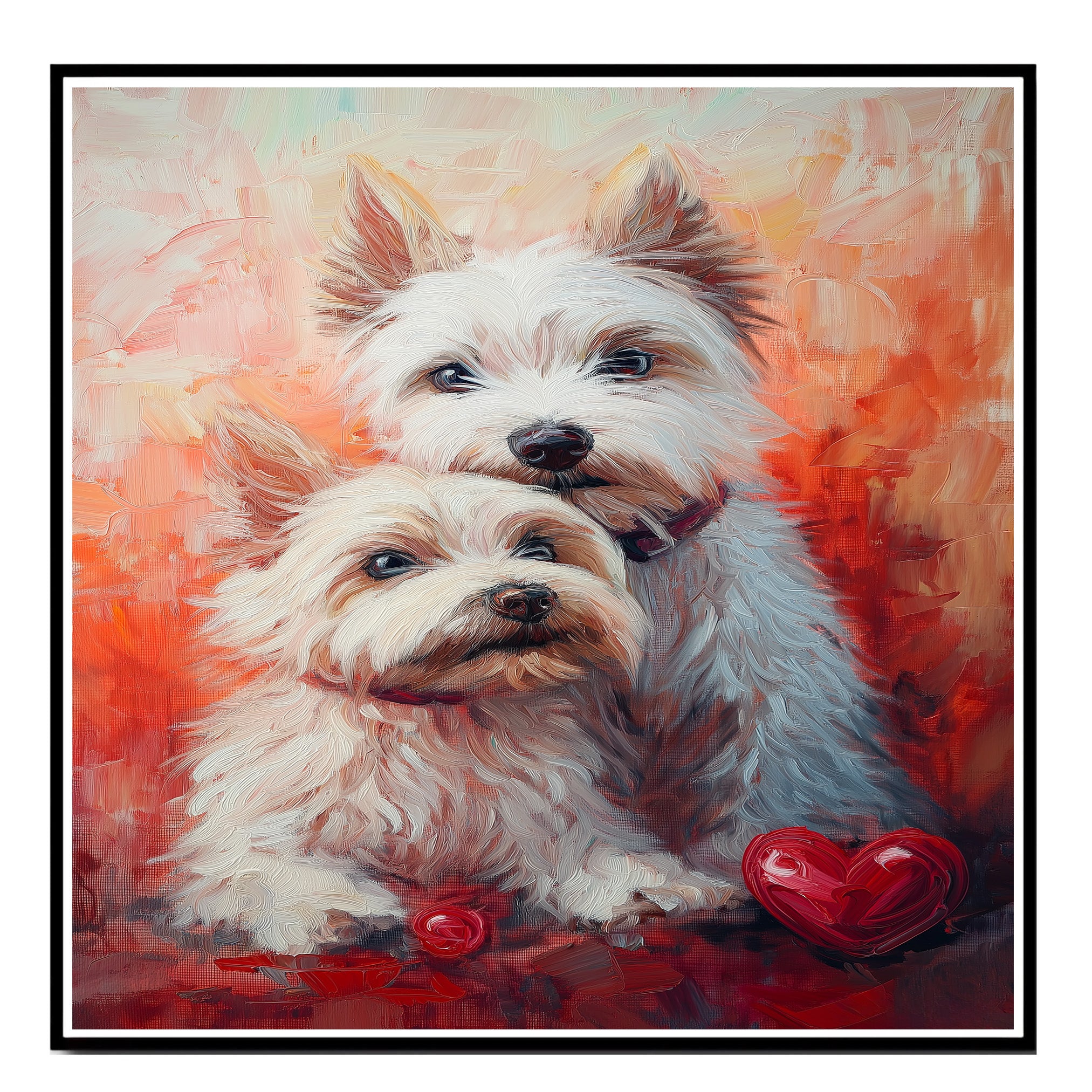 Celebrate love and loyalty with this adorable West Highland Terrier couple painting featuring red hearts. The soft brushstrokes and charming expressions bring warmth and joy to any cozy home, rustic decor, or pet lover's space. A perfect gift for dog lovers.