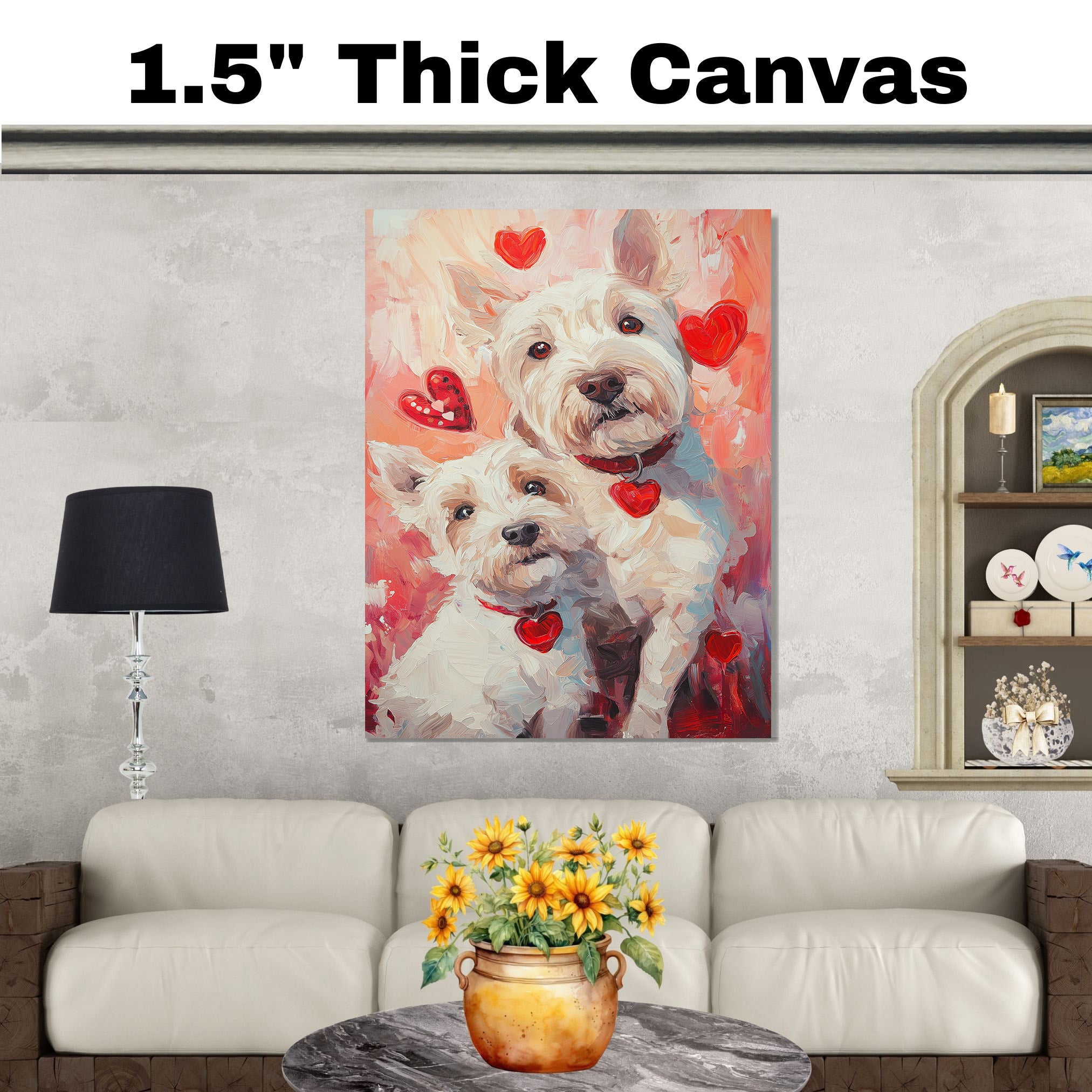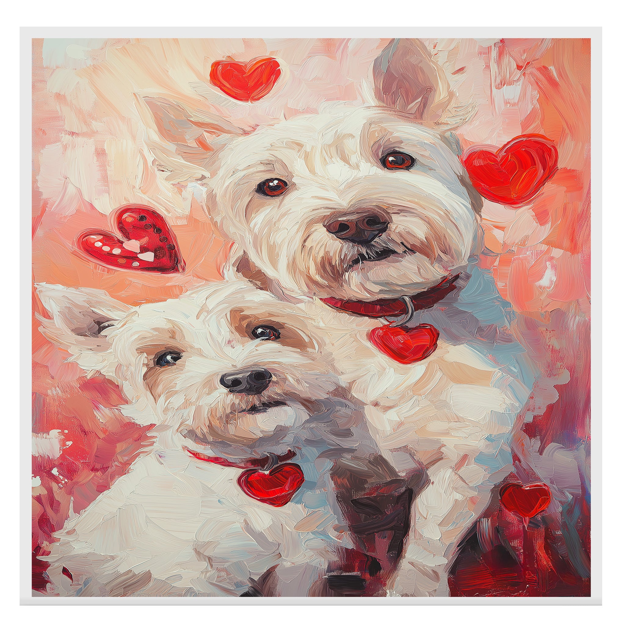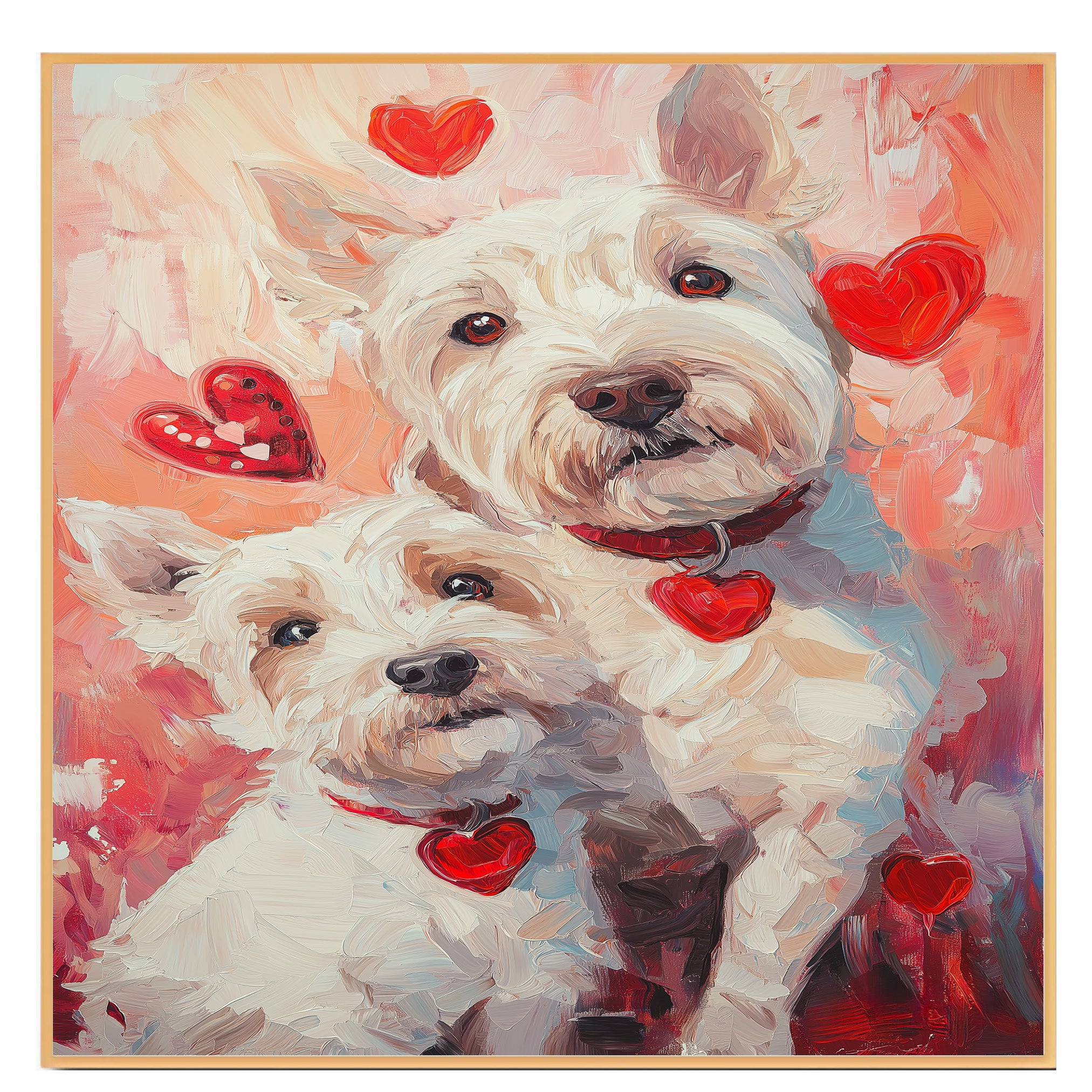 Celebrate loyalty and love with this West Highland White Terrier couple portrait. Featuring a tender, heartwarming style, this charming painting is a perfect gift for dog lovers, bringing warmth and rustic charm to any home.