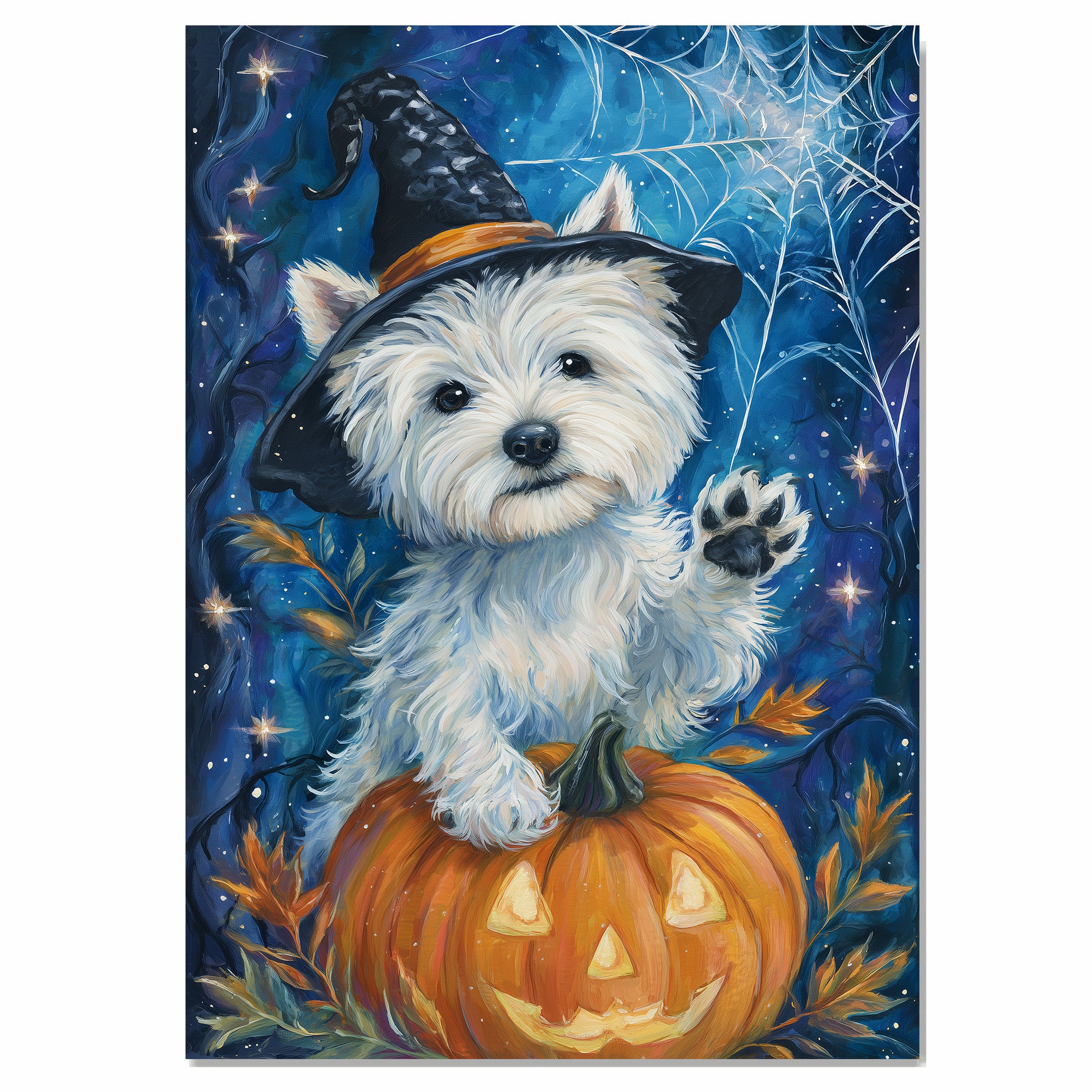 This Halloween painting features a West Highland White Terrier puppy in a black witch hat with an orange band. The pup sits atop a glowing jack o lantern with paw raised, framed by spiderwebs, autumn leaves, and a magical night sky. Perfect gift for dog lovers.