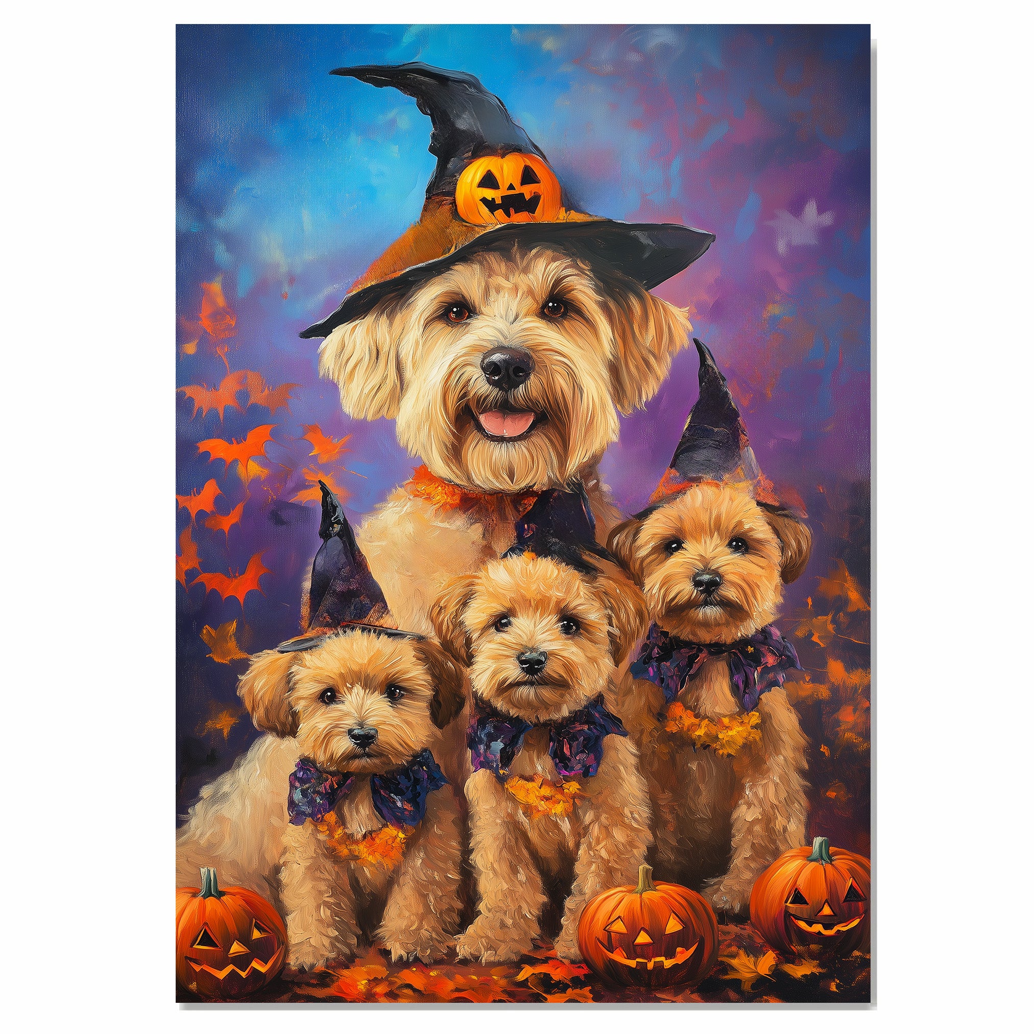 Wheaten Terrier Dog Halloween Wall Art Rustic Fall Canvas with Pumpkins Witch Hats and Autumn Leaves Farmhouse Pet Decor on Ready to Hang 1.5" Thick Canvas Wrap, Floating Framed Canvas, Flat Rolled Canvas