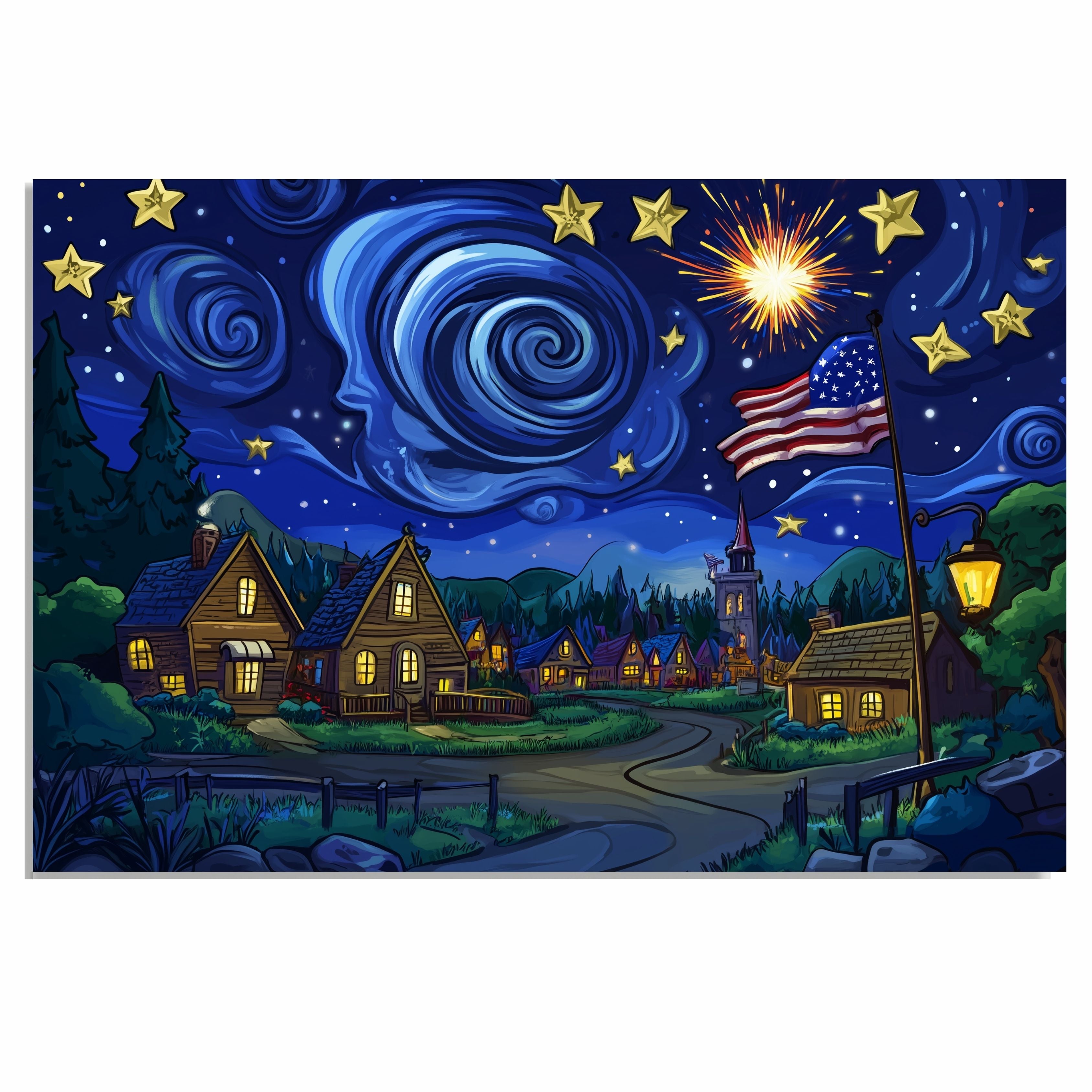 Celebrate the magic of the 4th of July with this lively and imaginative artwork of a cozy village aglow under a swirling starry sky. Bursting with colorful fireworks, golden stars, and waving American flags, this joyful piece captures the spirit of freedom, fun, and small-town celebration. Perfect for those who love patriotic charm with a touch of whimsy.