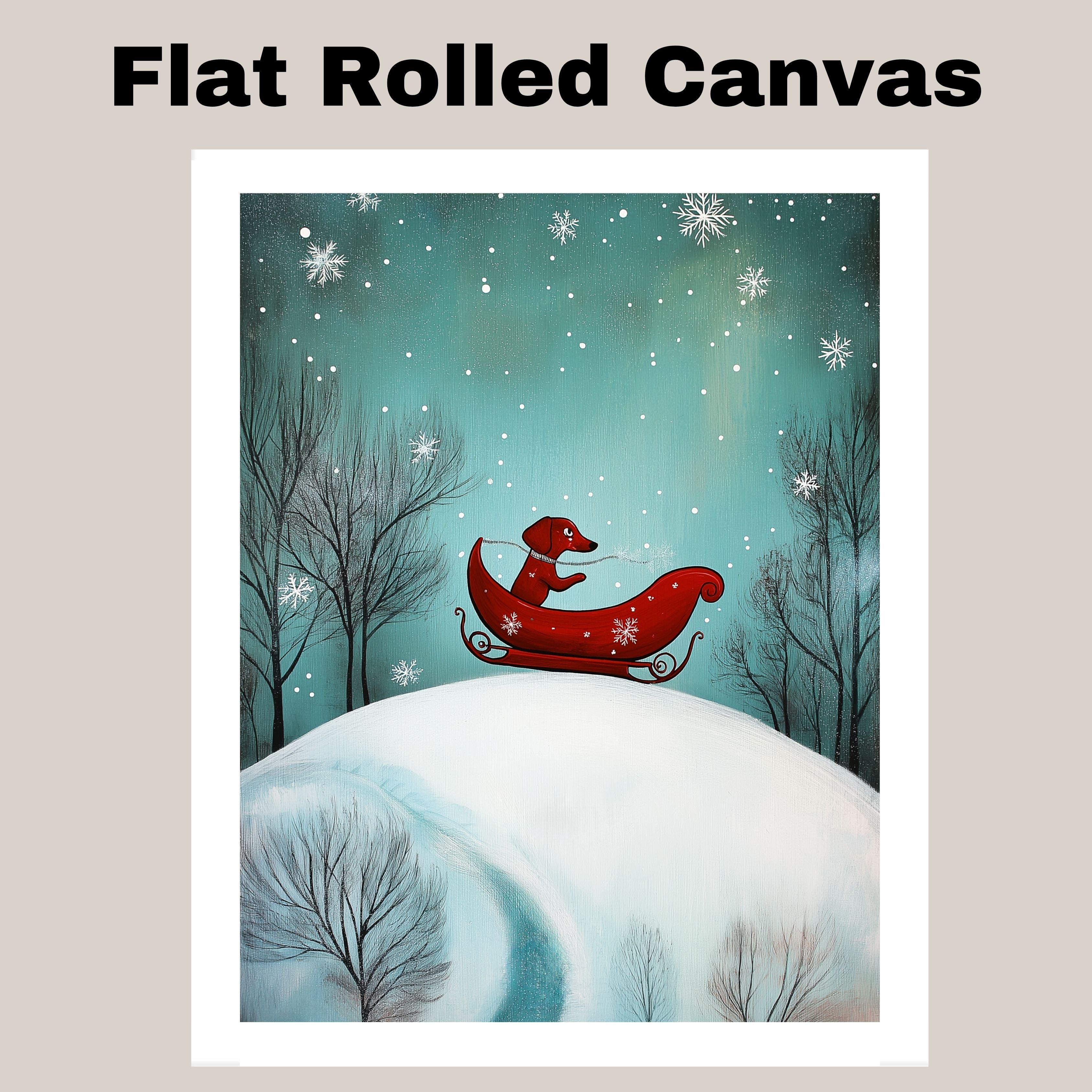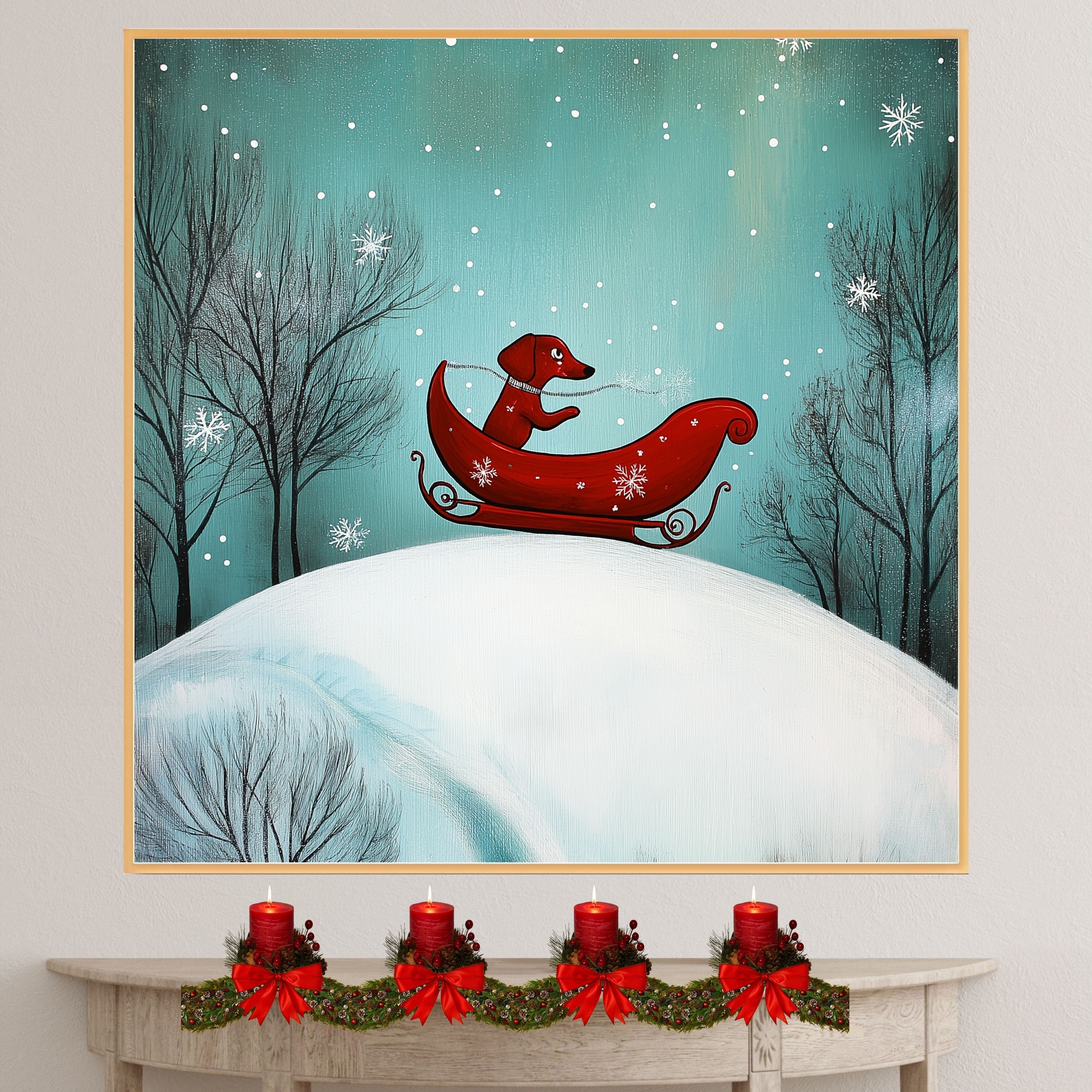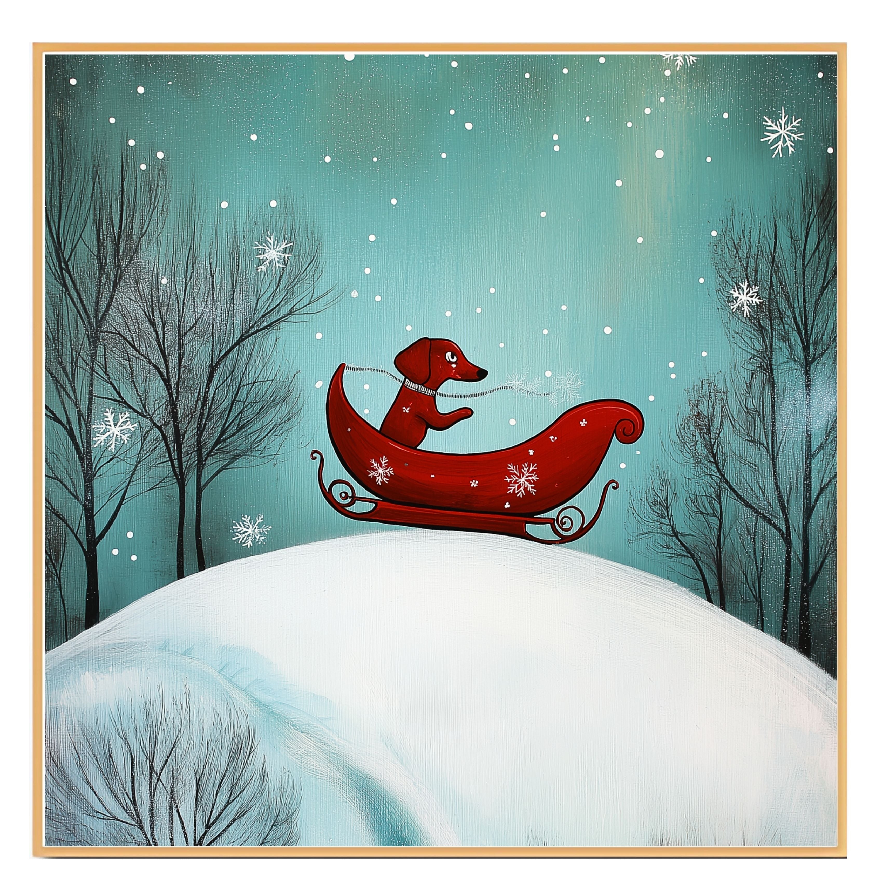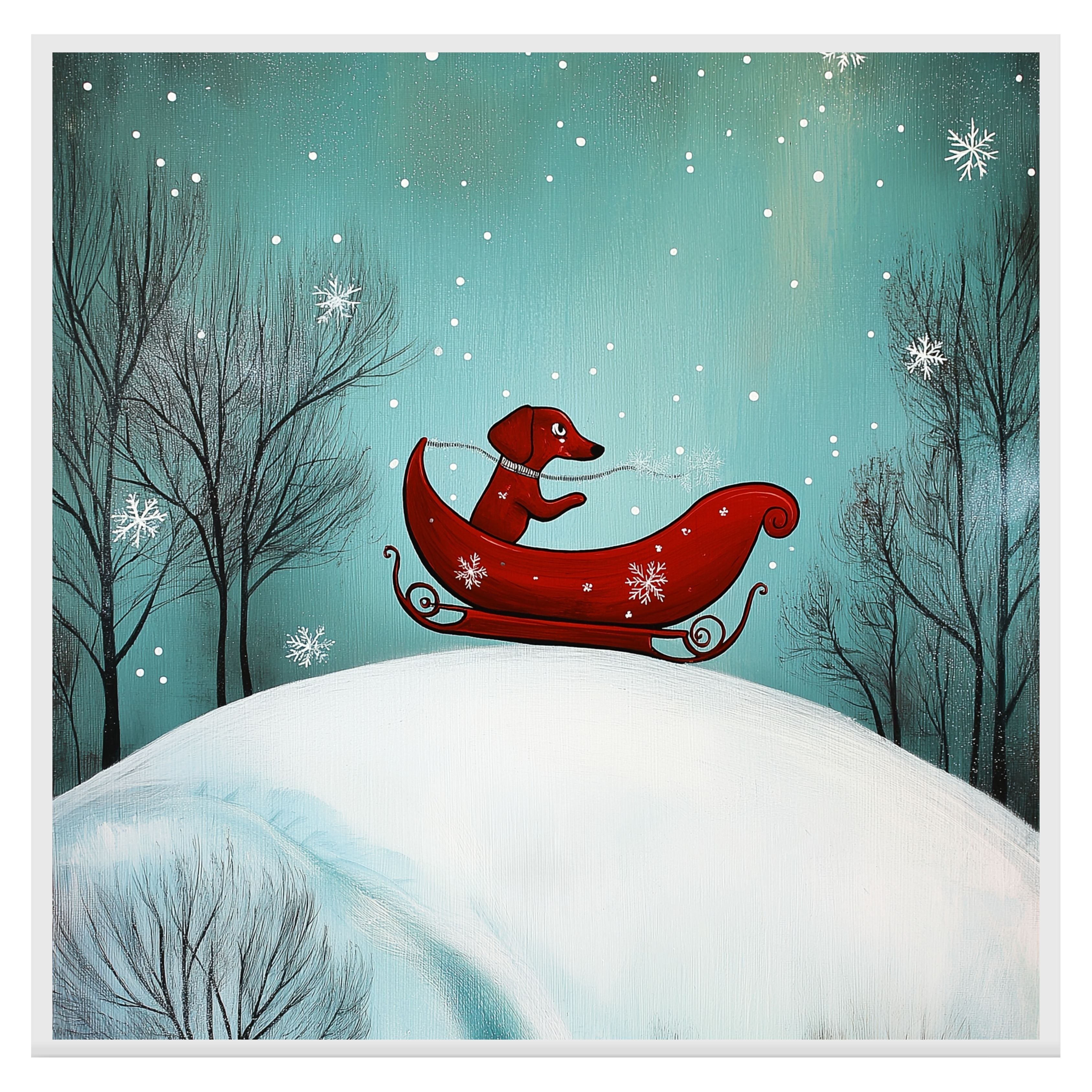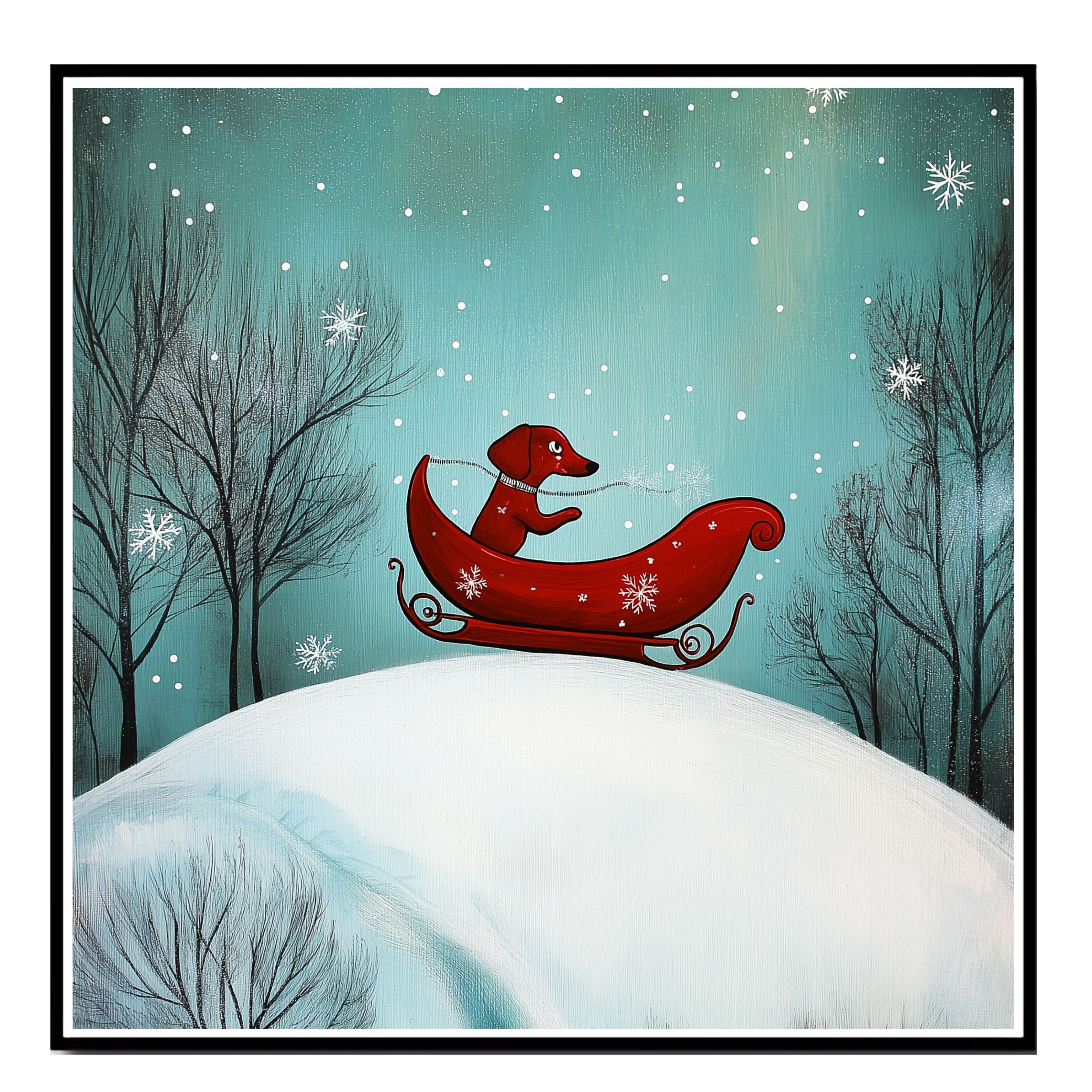 Add charm and serenity to your holiday décor with this whimsical Christmas artwork of a dachshund riding a red sleigh down a peaceful snowy hill under a teal winter sky. Adorned with delicate snowflakes and gentle trees, this scene captures the magic of the season—perfect for dog lovers and festive home decoration.