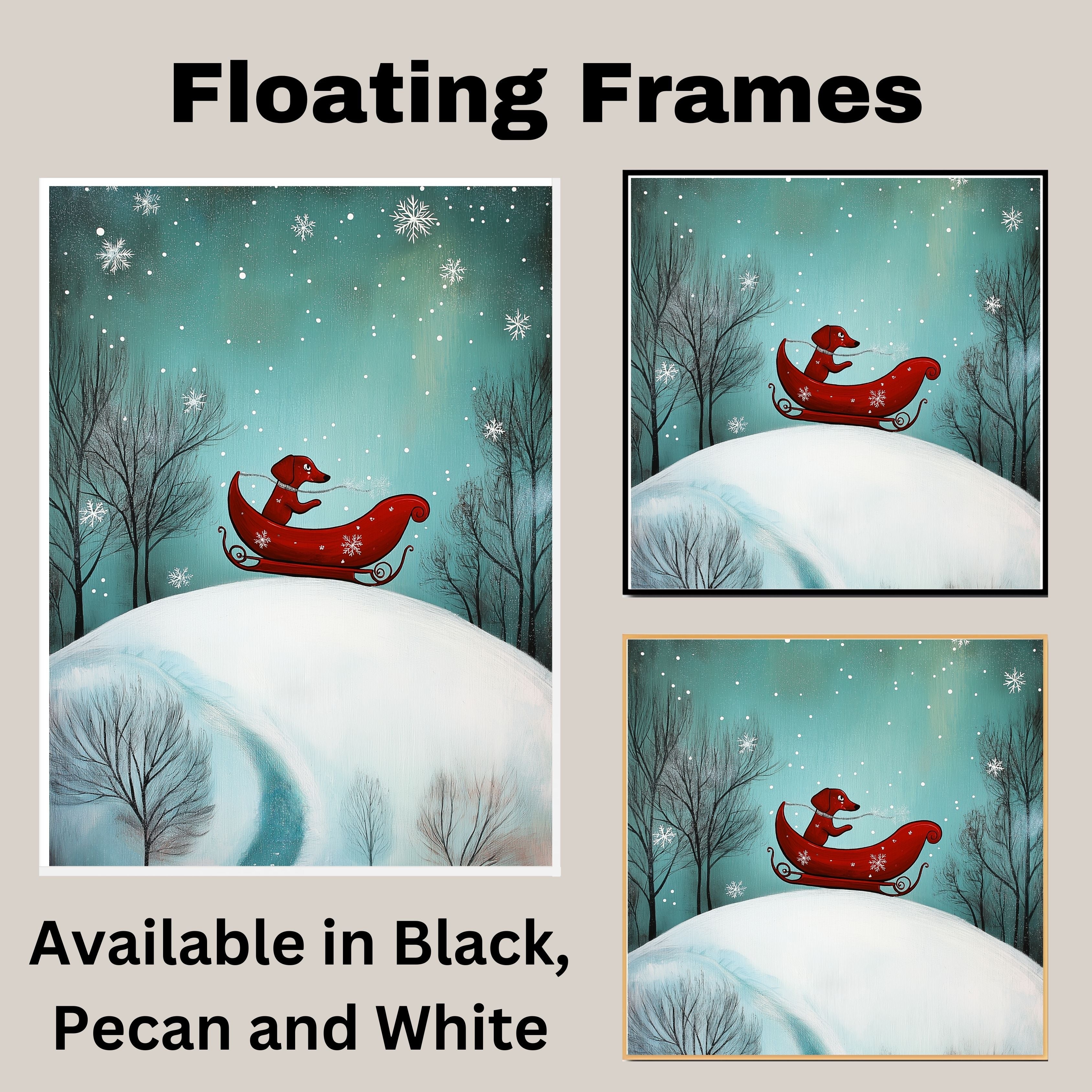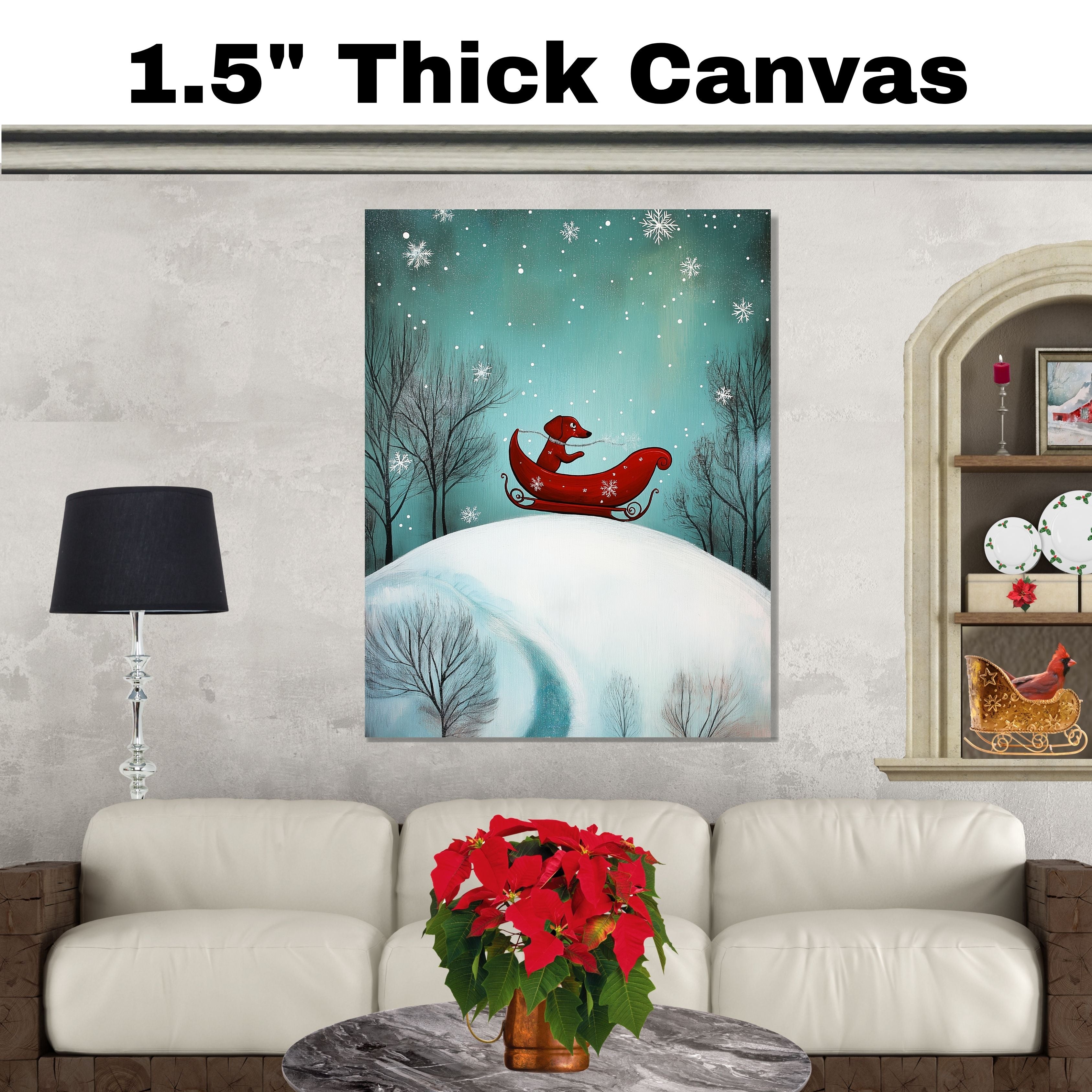 Whimsical Christmas Dachshund in Red Sleigh on Snowy Hill Under Teal Sky Playful Winter Dog Art for Holiday Home Décor and Animal Lovers on Ready to Hang 1.5" Thick Canvas Wrap, Floating Framed Canvas, Flat Rolled Canvas