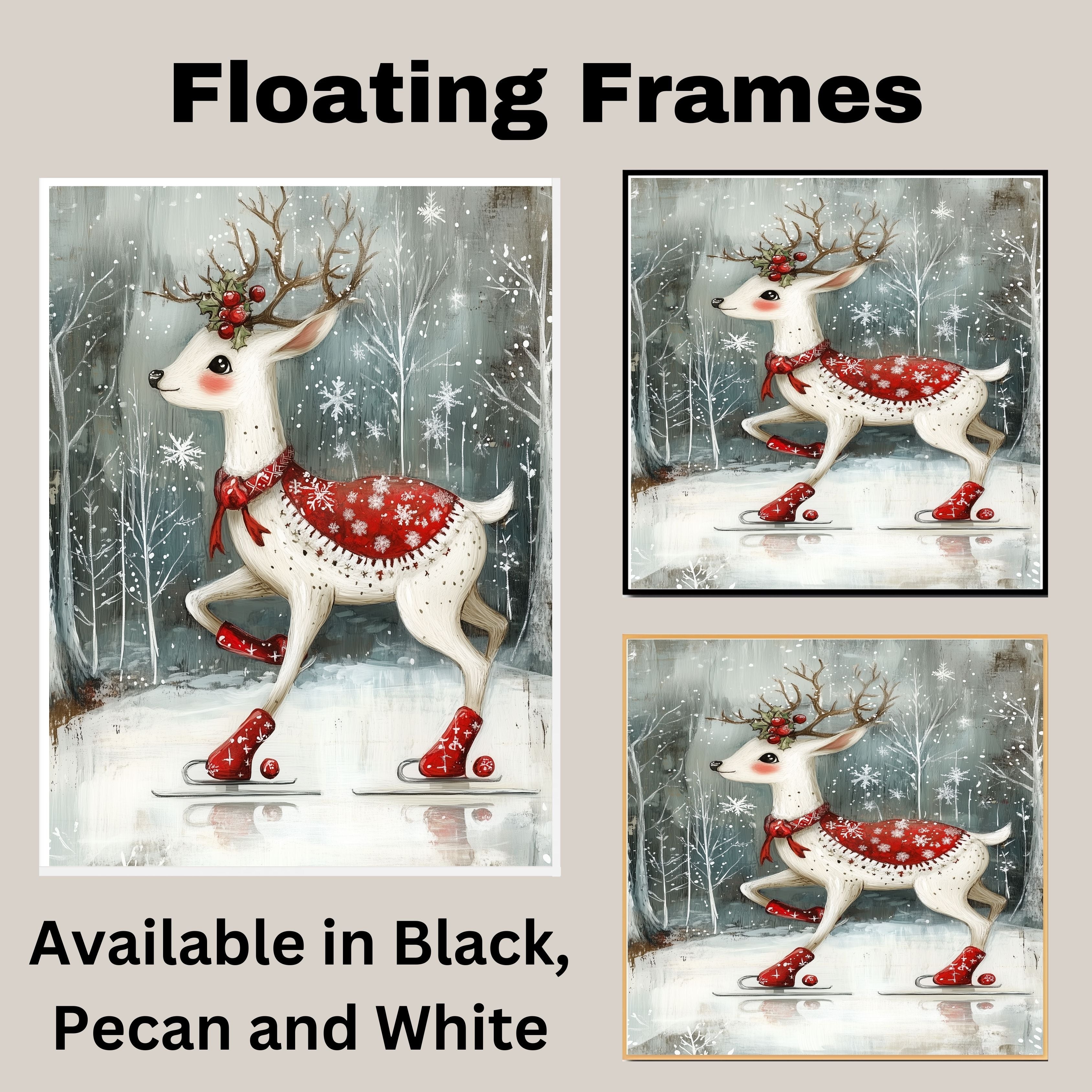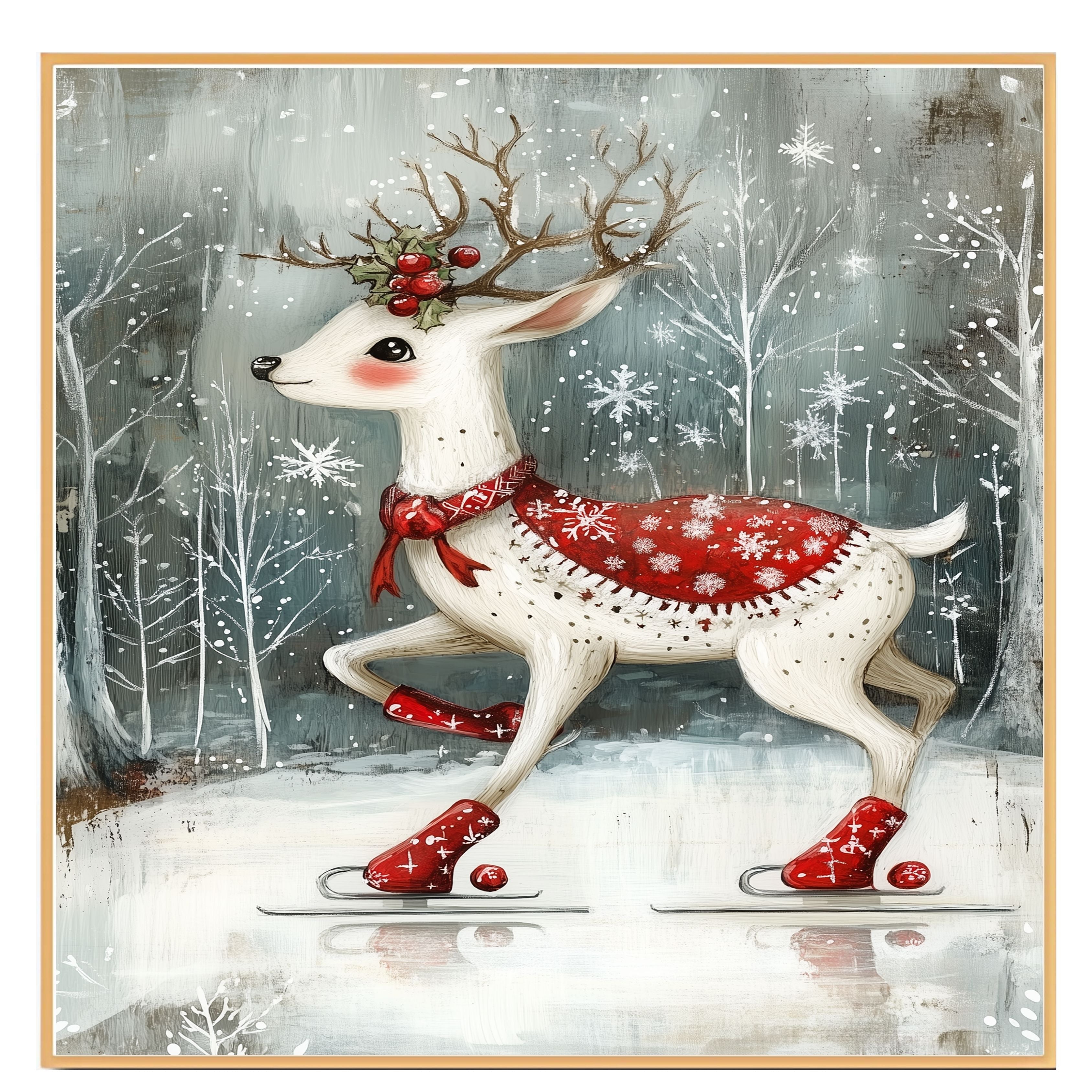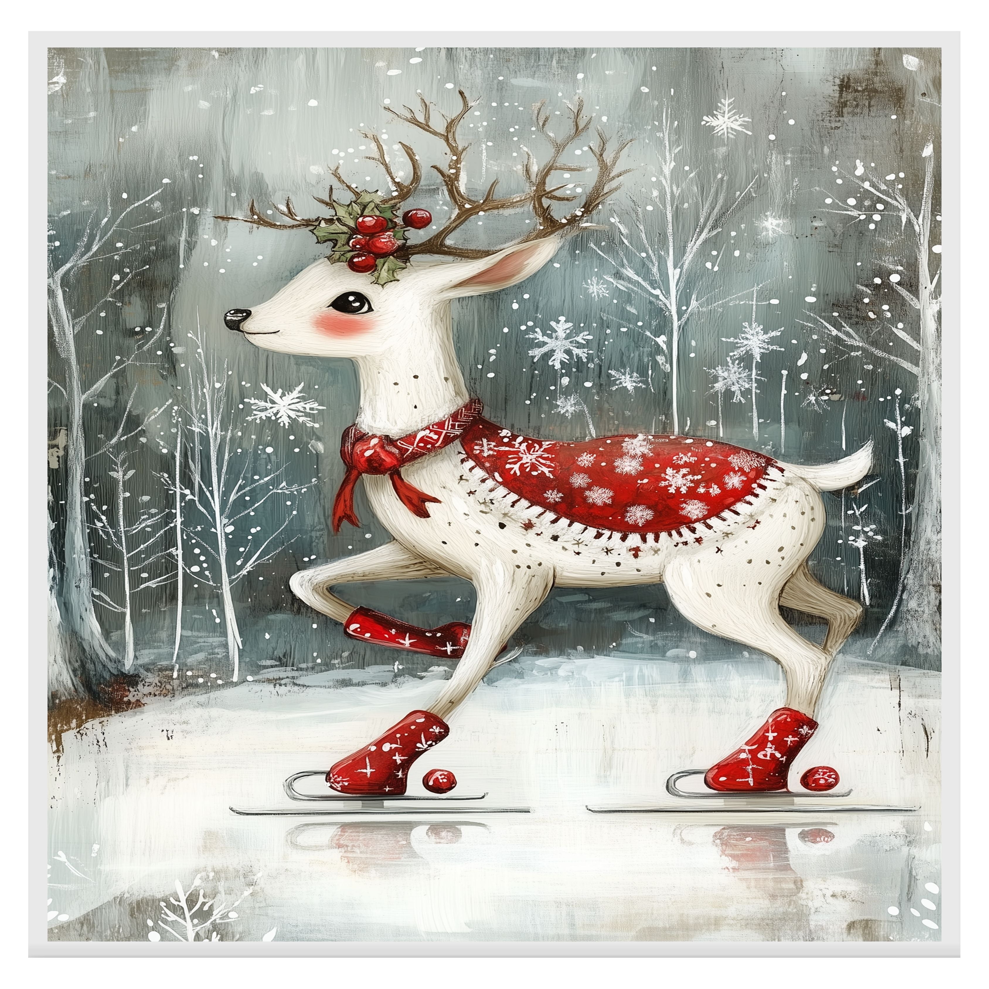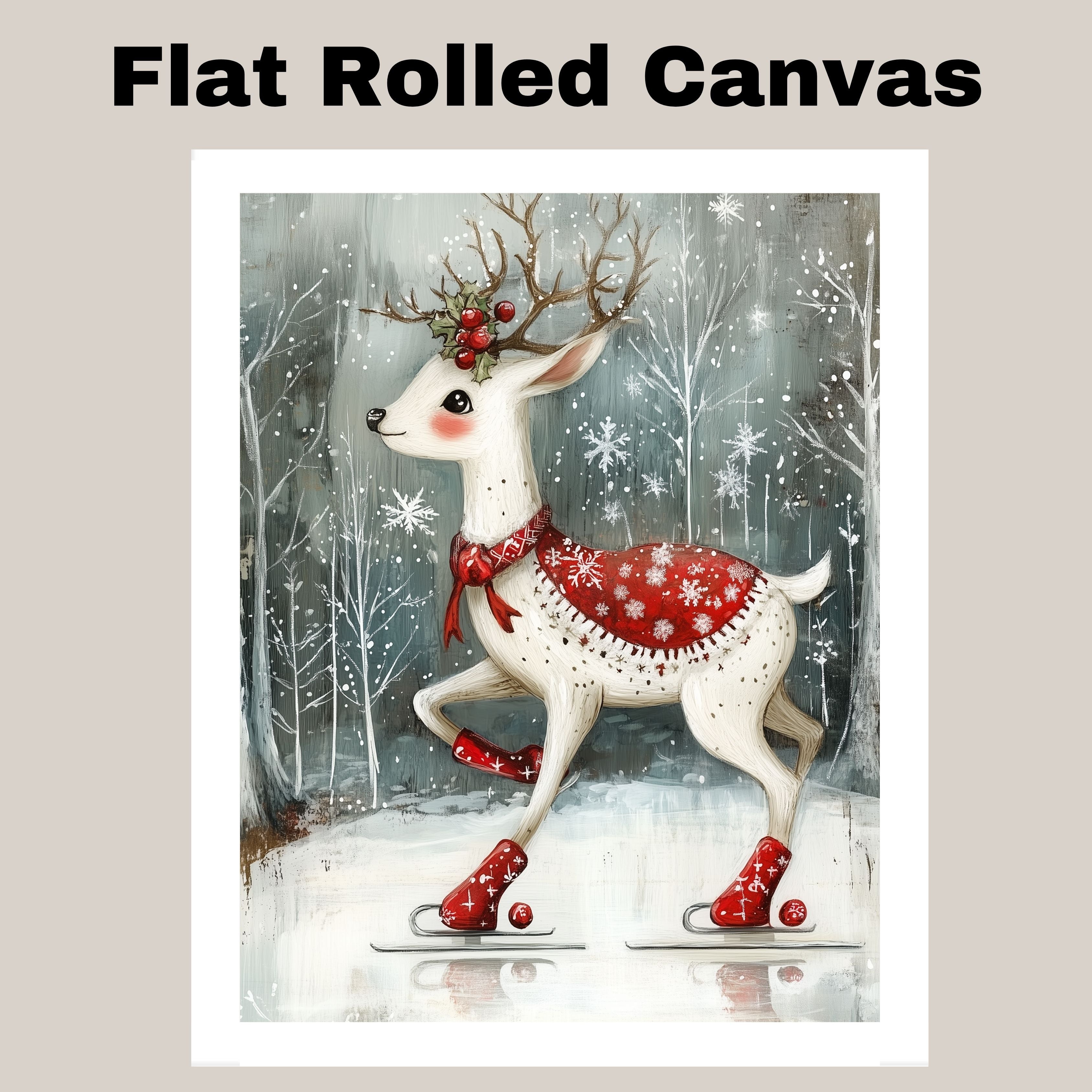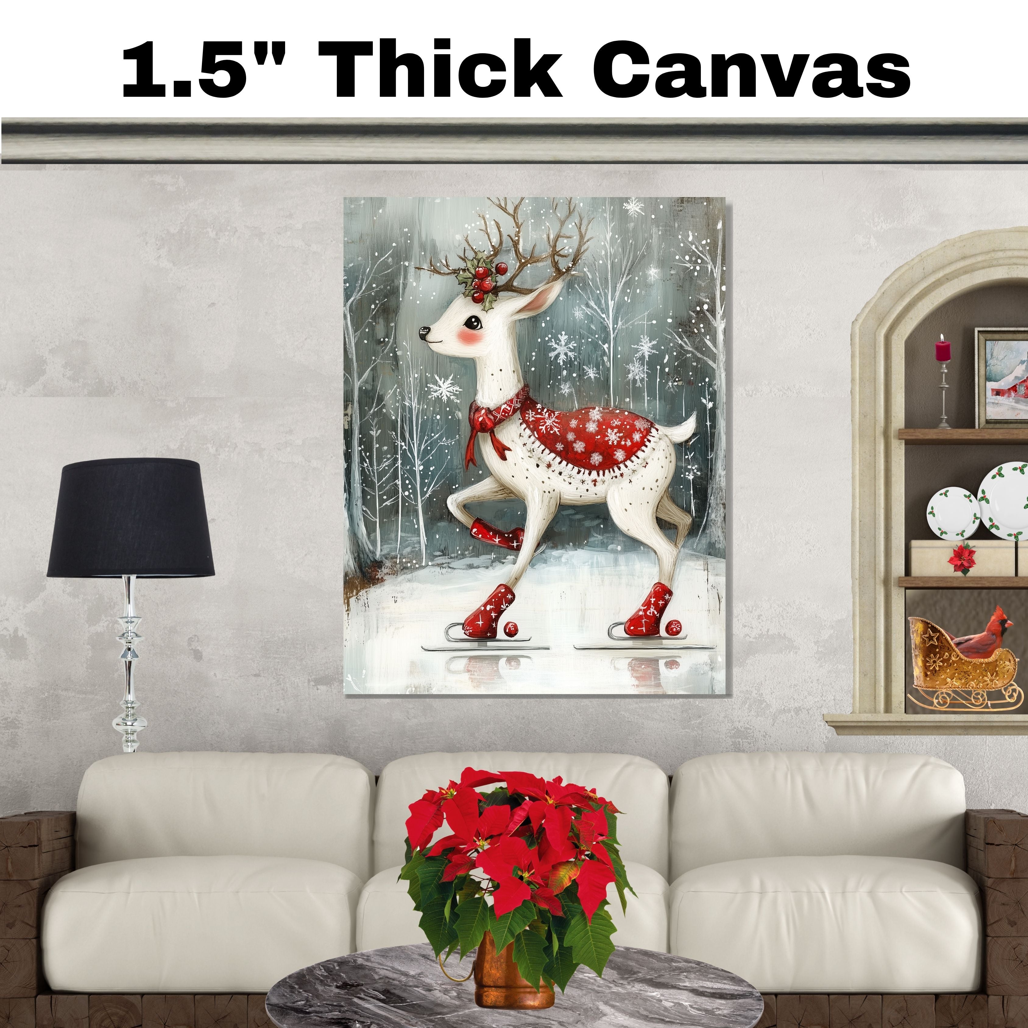 Whimsical Christmas Deer Ice Skating in Red Snowflake Blanket with Holly Antlers Woodland Winter Illustration Holiday Nursery Wall Art or Canvas Print on Ready to Hang 1.5" Thick Canvas Wrap, Floating Framed Canvas, Flat Rolled Canvas