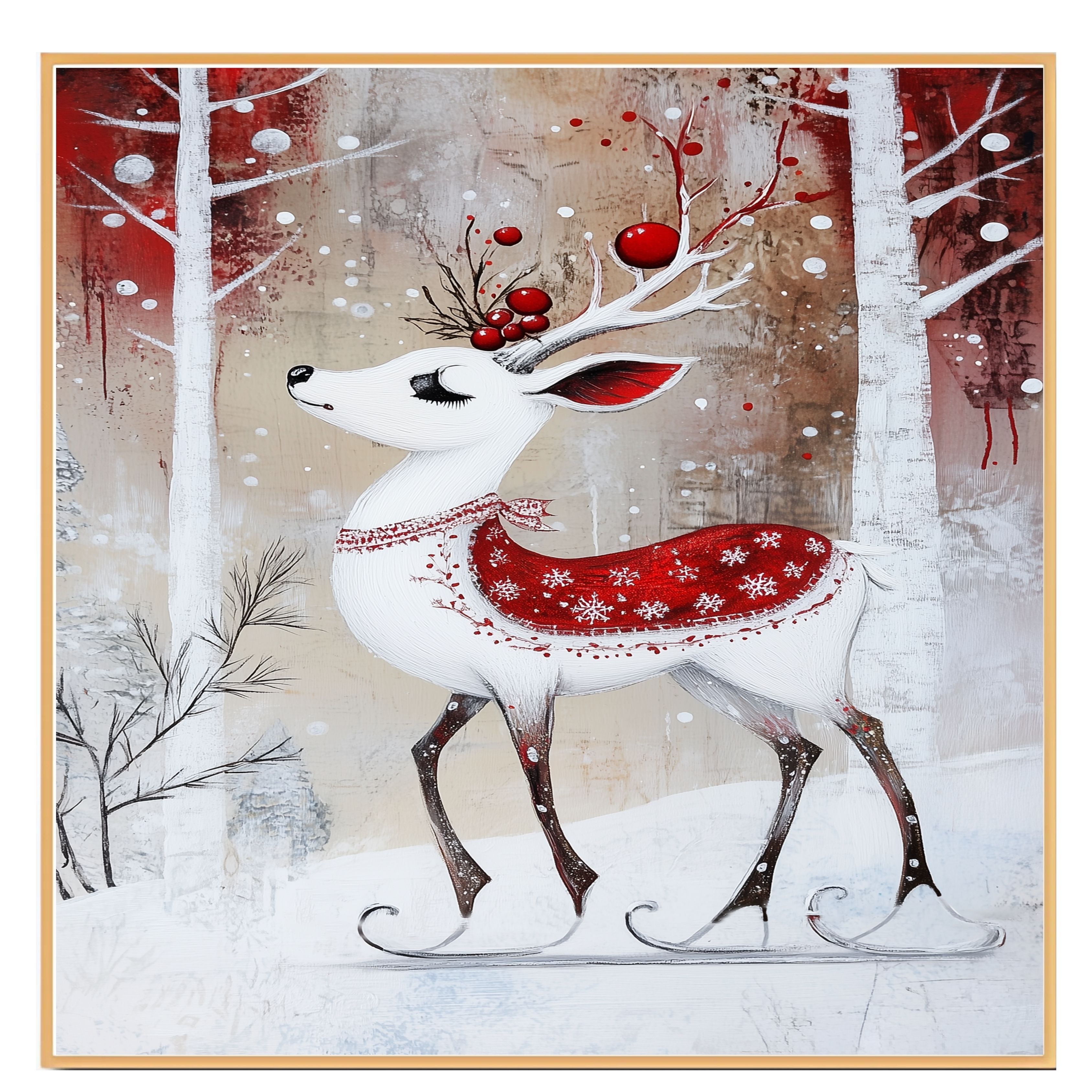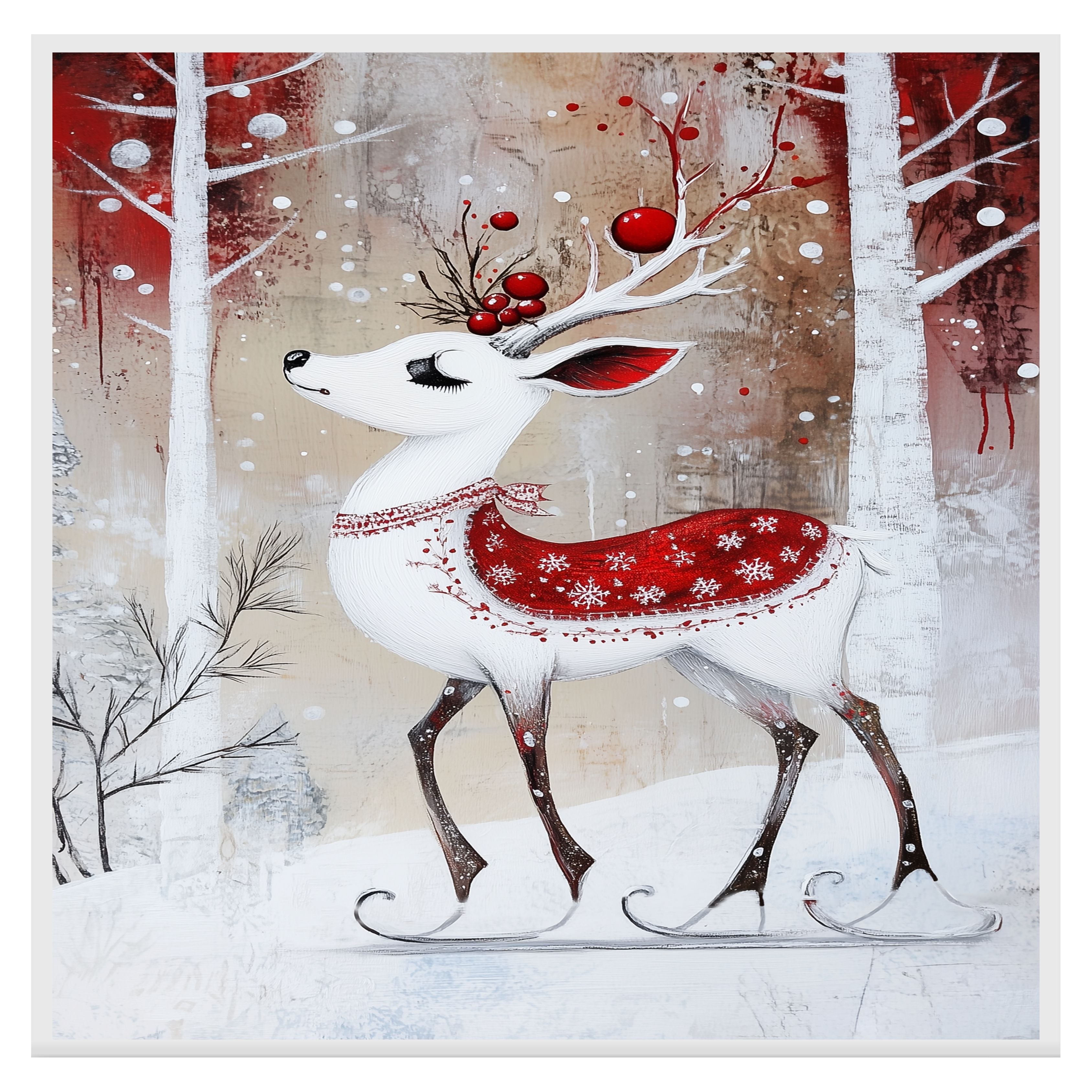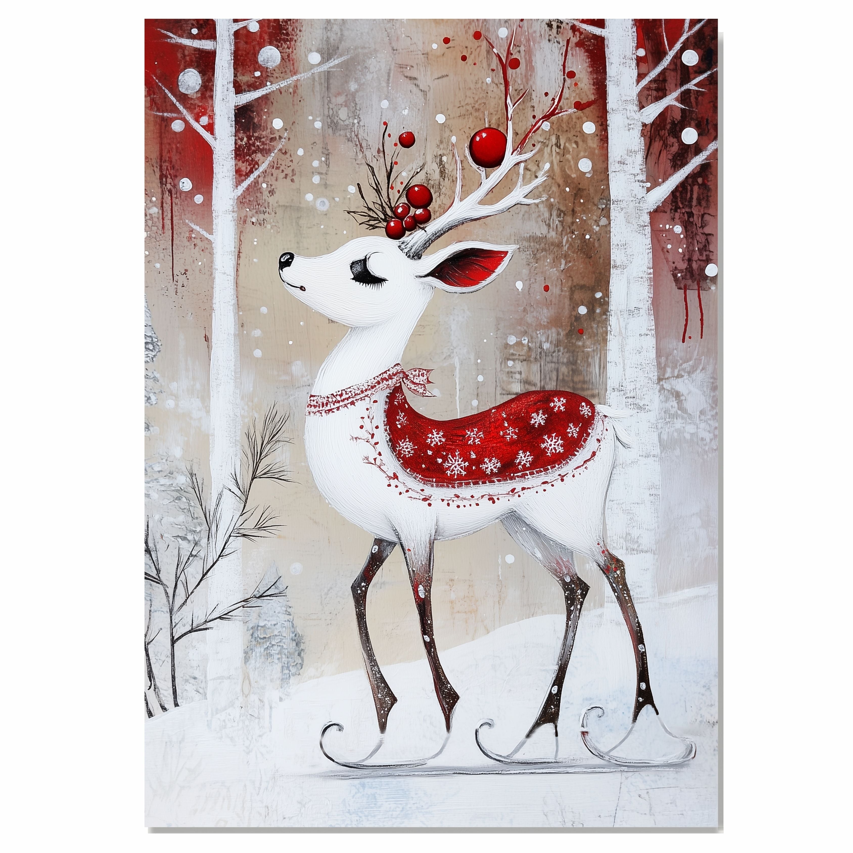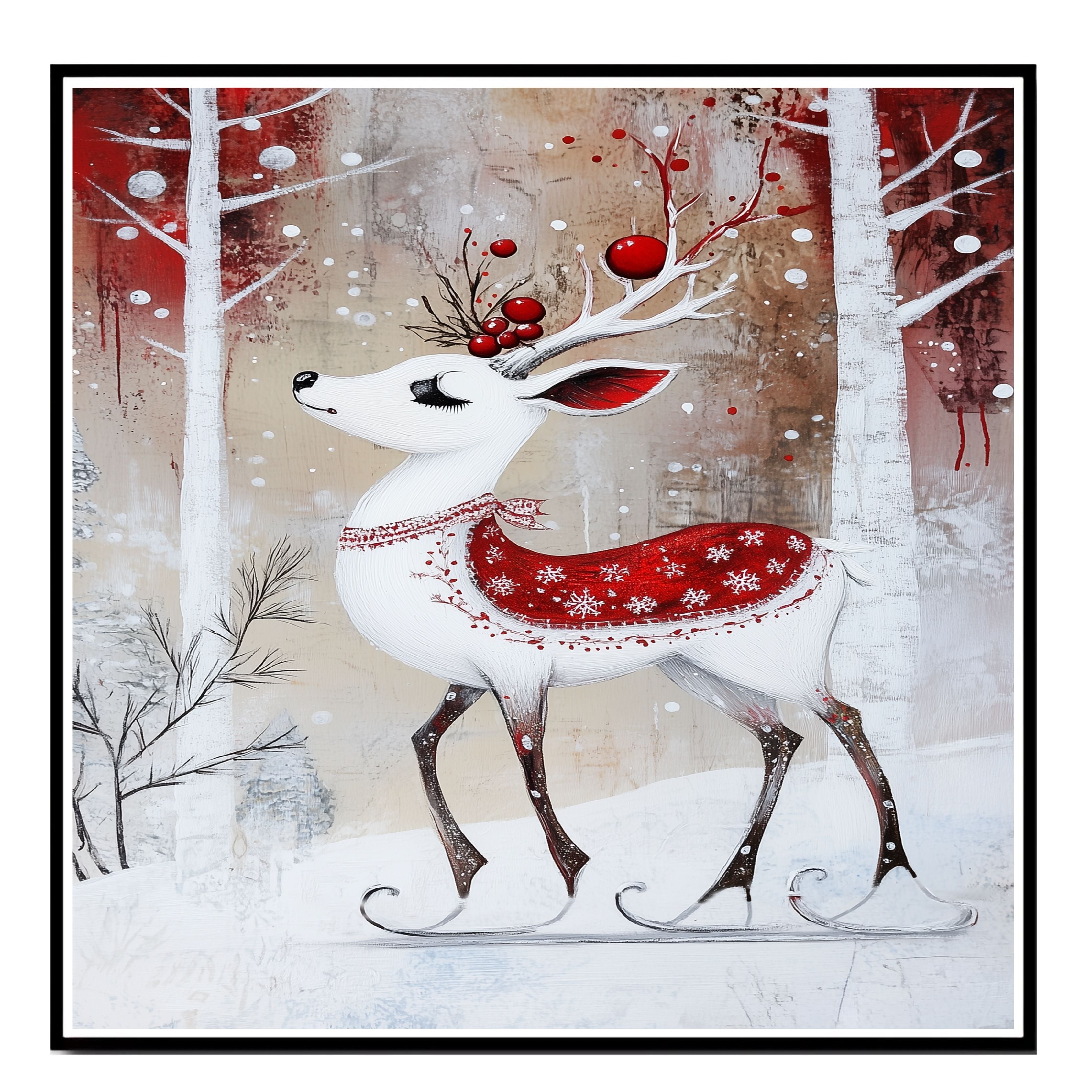 Celebrate the season with this enchanting Christmas deer illustration. Gliding gracefully on ice skates, this elegant white deer wears a snowflake-covered red blanket and has winter berries adorning its antlers. A magical woodland background adds charm and warmth to this piece, making it perfect for holiday wall decor, nursery art, or a whimsical winter gallery.