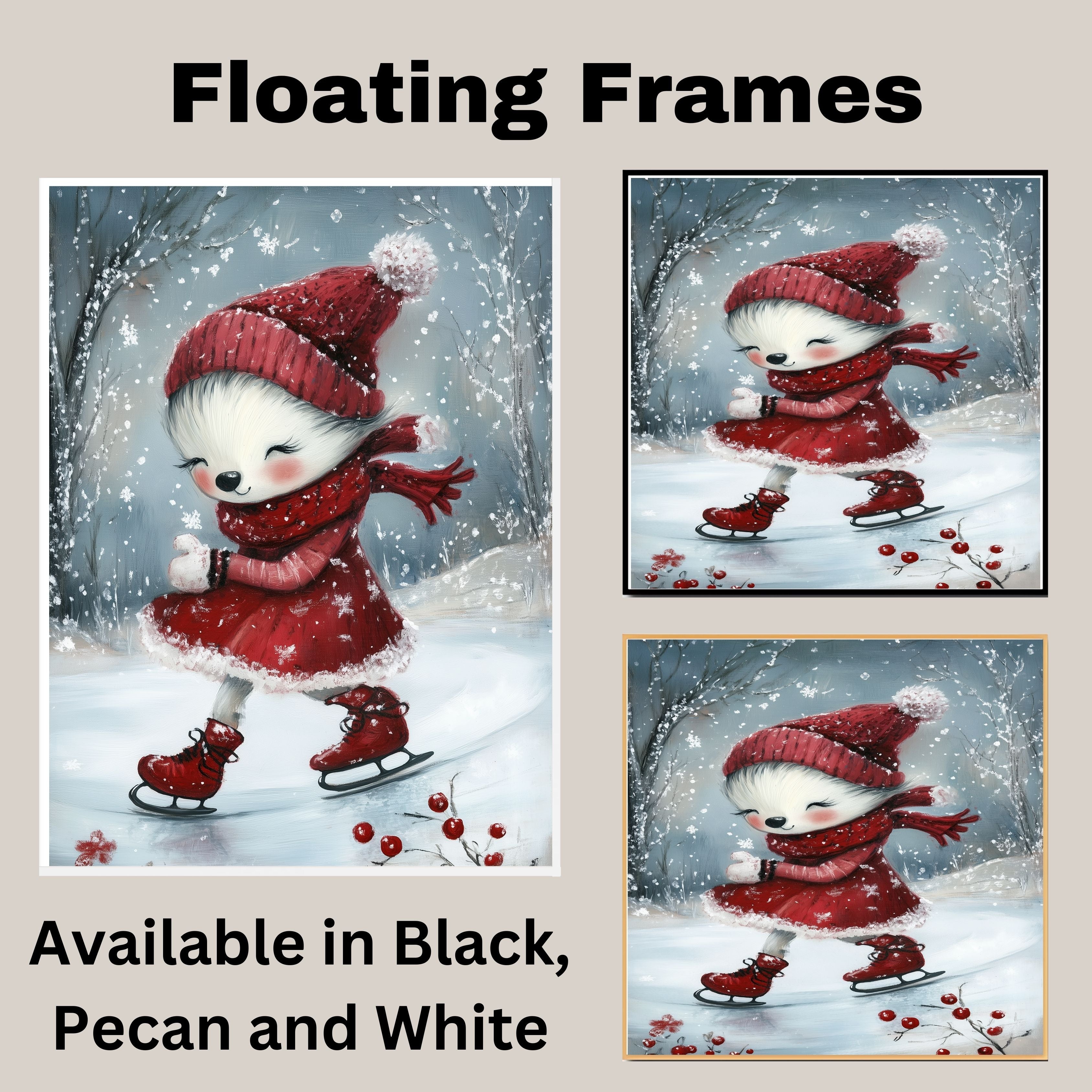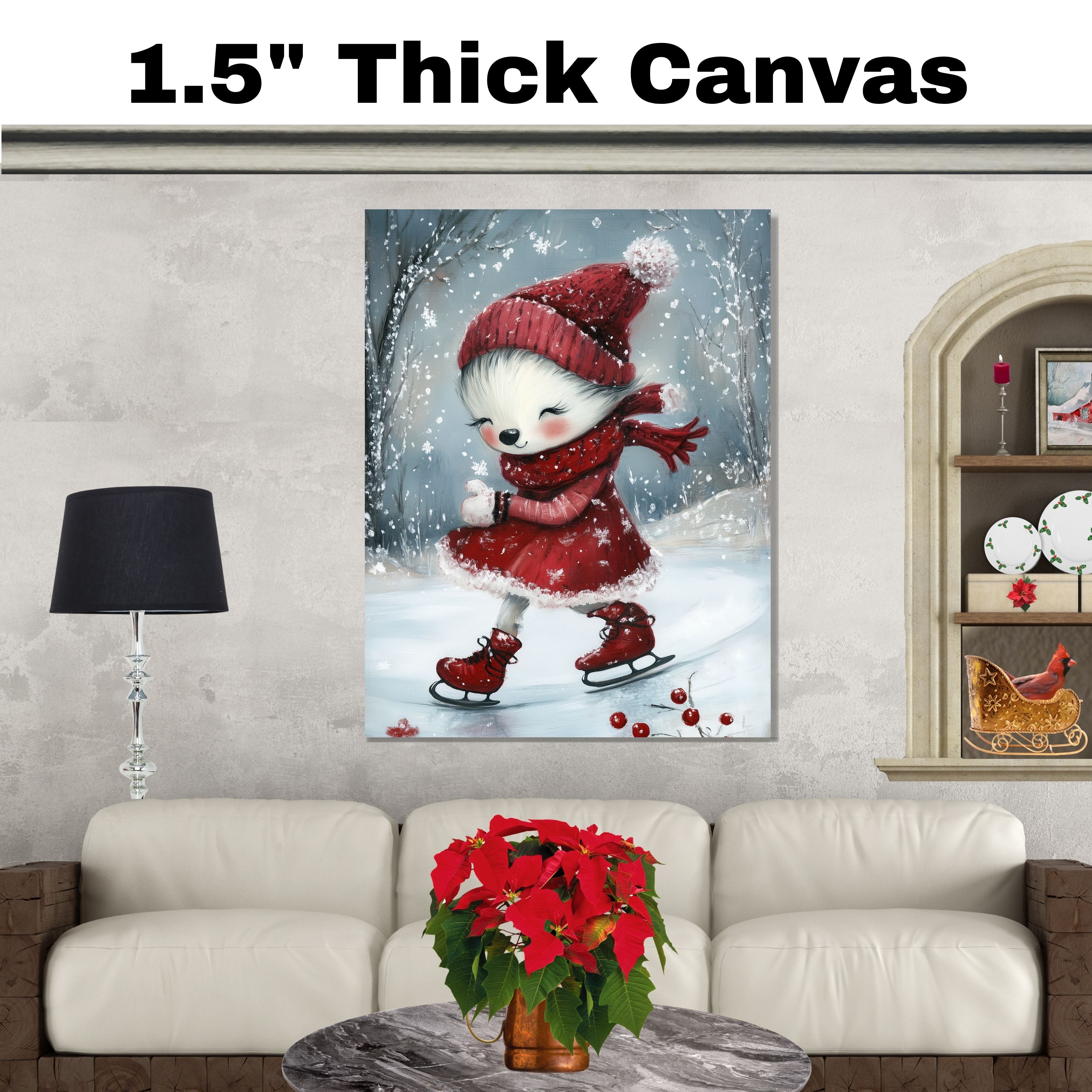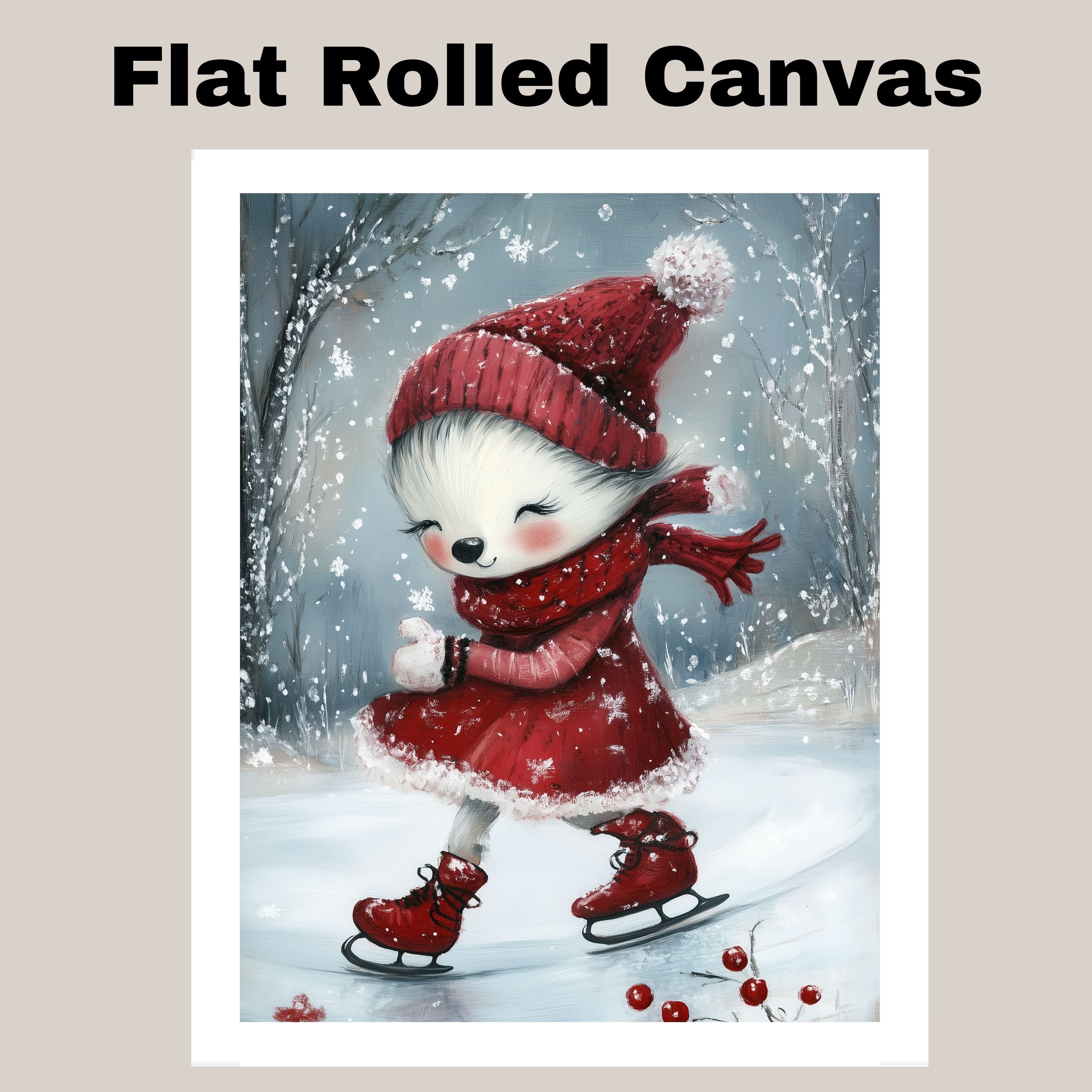 Whimsical Christmas Dog Ice Skating in Red Dress Winter Art Print or Canvas for Holiday Decor and Cute Seasonal Gift on Ready to Hang 1.5" Thick Canvas Wrap, Floating Framed Canvas, Flat Rolled Canvas