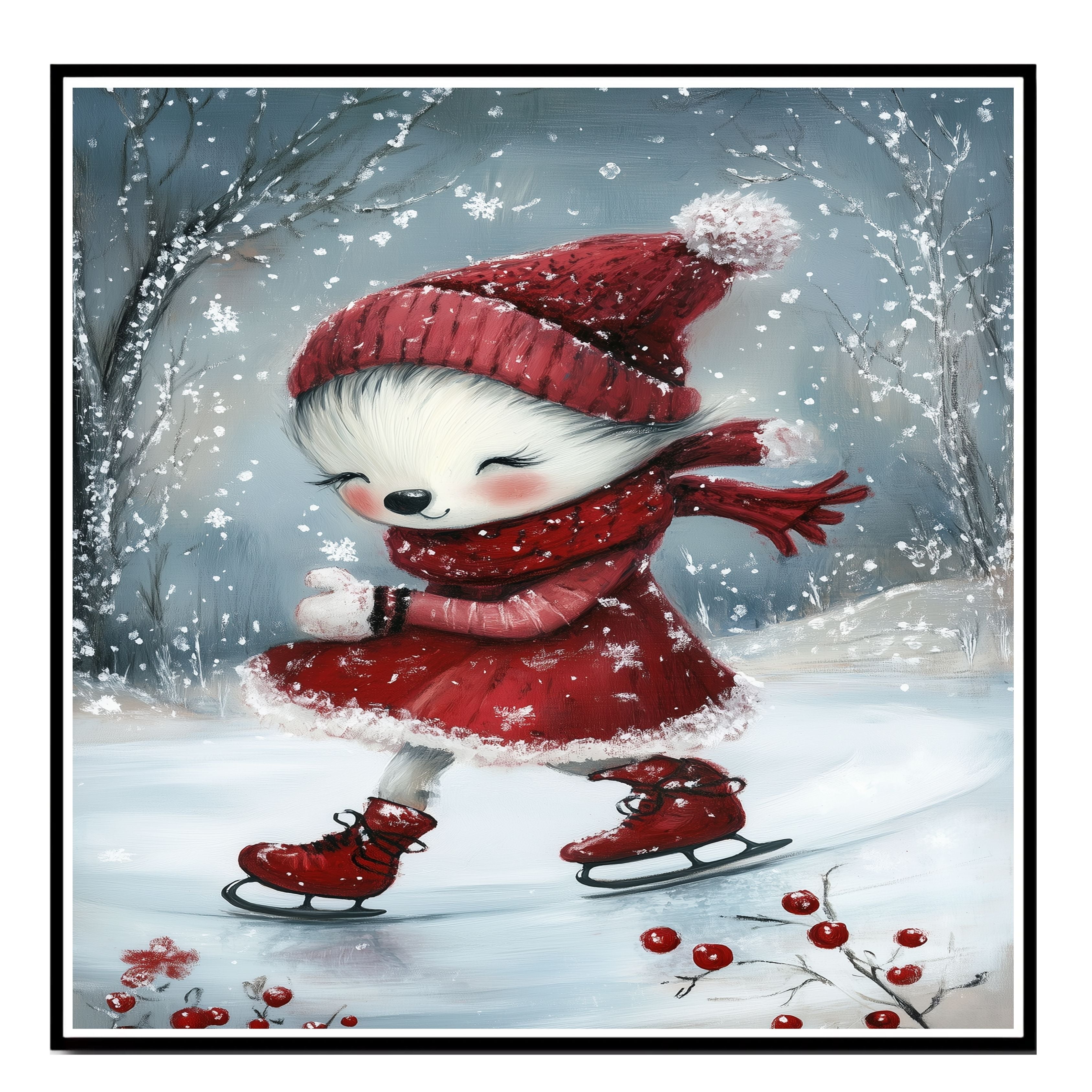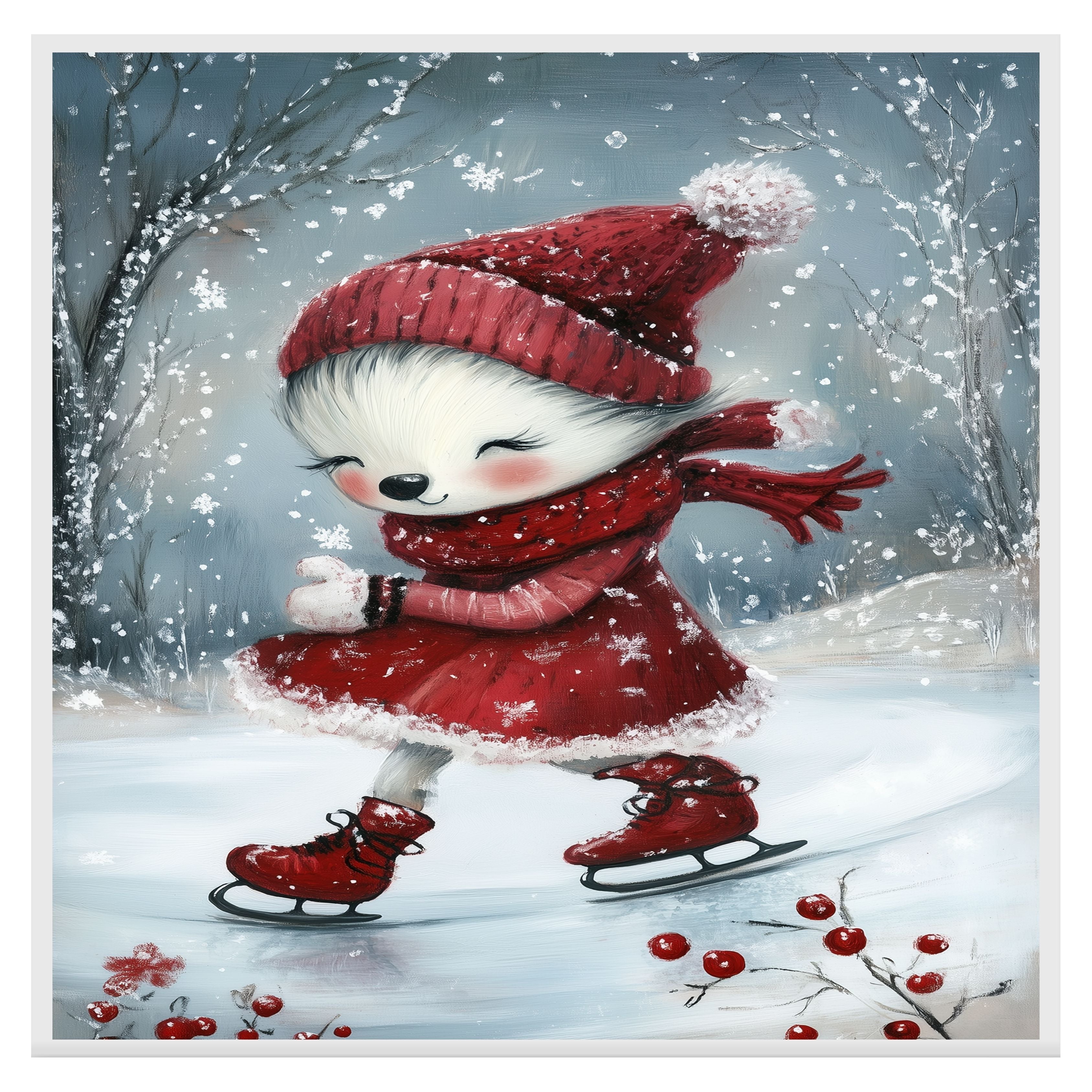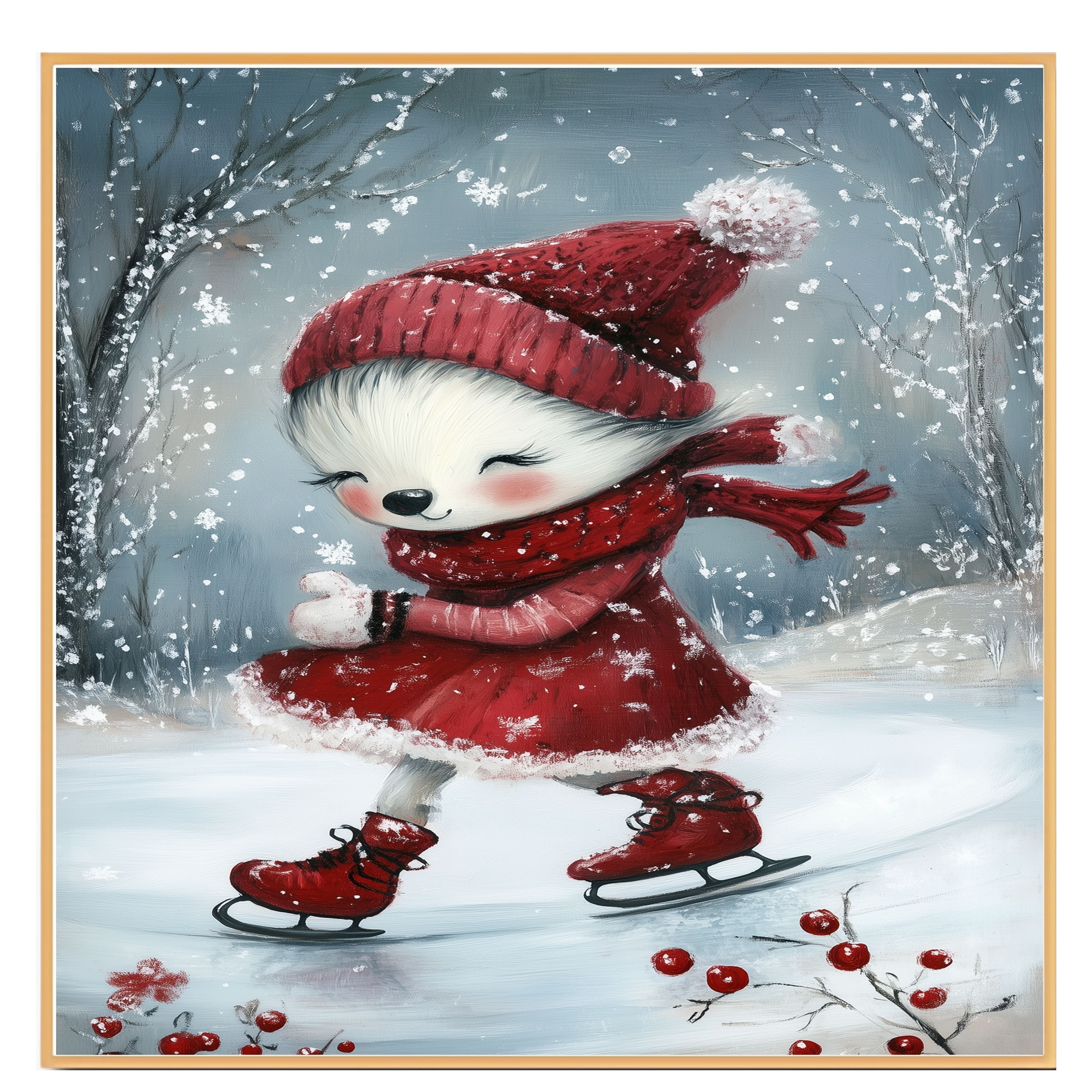 Bring heartwarming charm to your holiday decor with this whimsical Christmas dog illustration. Dressed in a fluffy red dress, knit hat, and scarf, this sweet pup joyfully glides across a snowy ice rink under gently falling snowflakes. The soft painterly style and cozy details create a festive winter scene full of magic and delight. Perfect as a seasonal art print or canvas, this piece makes a lovely holiday gift for dog lovers, winter decor enthusiasts, and anyone who enjoys cute and joyful Christmas art.