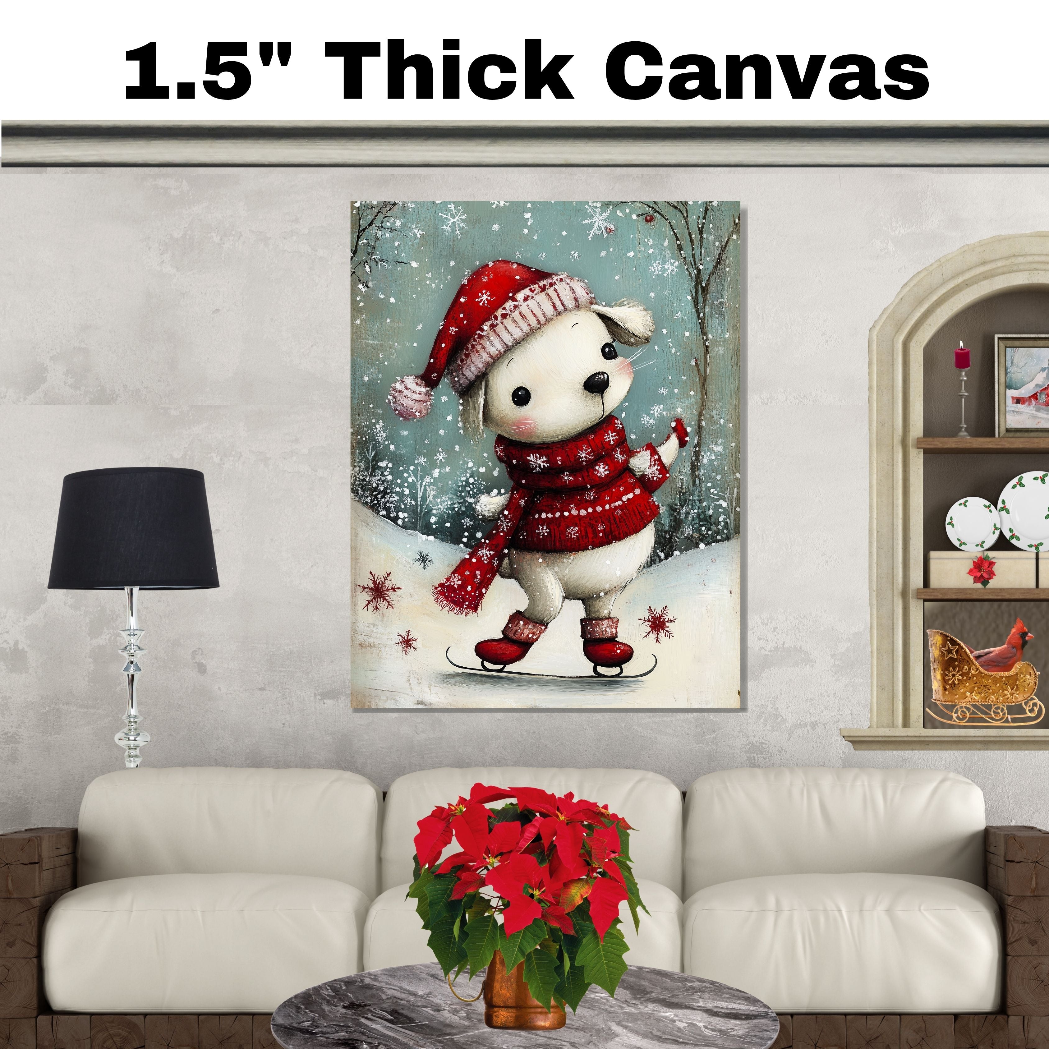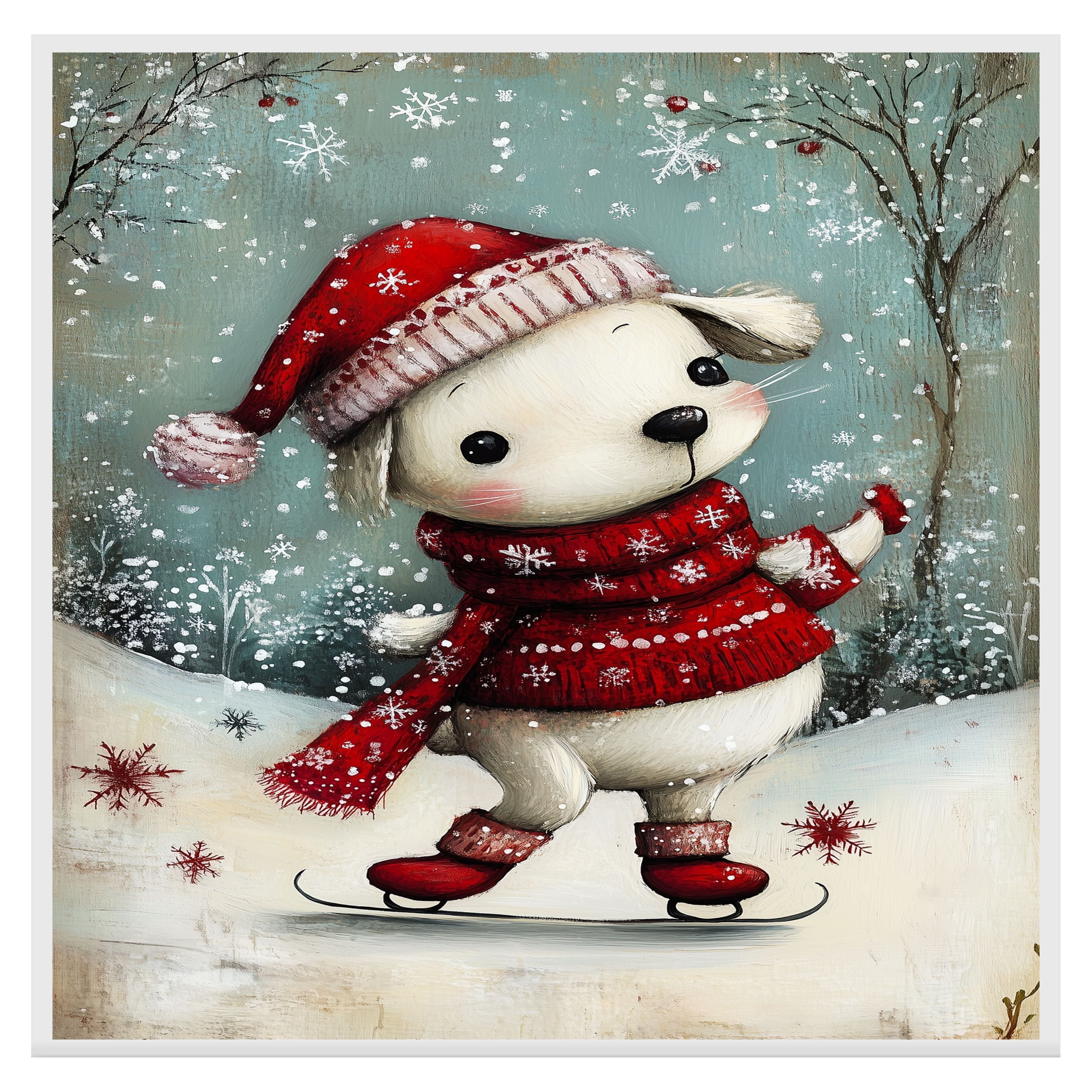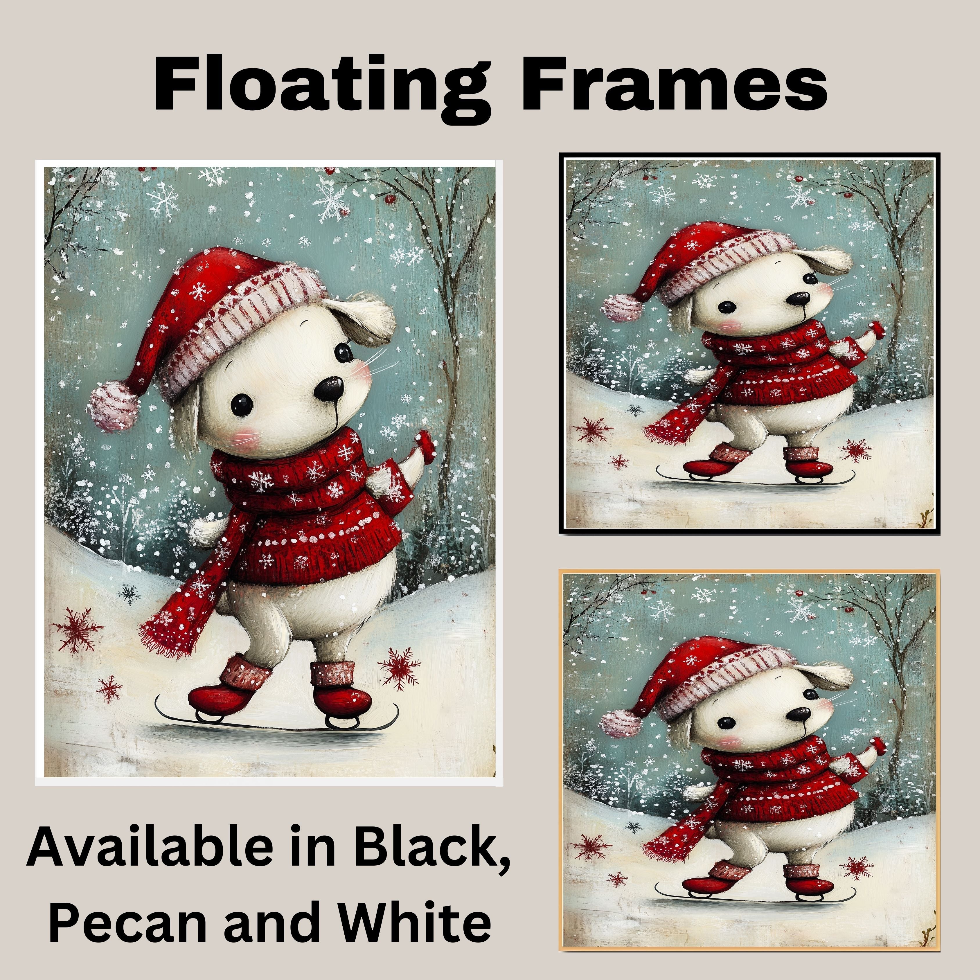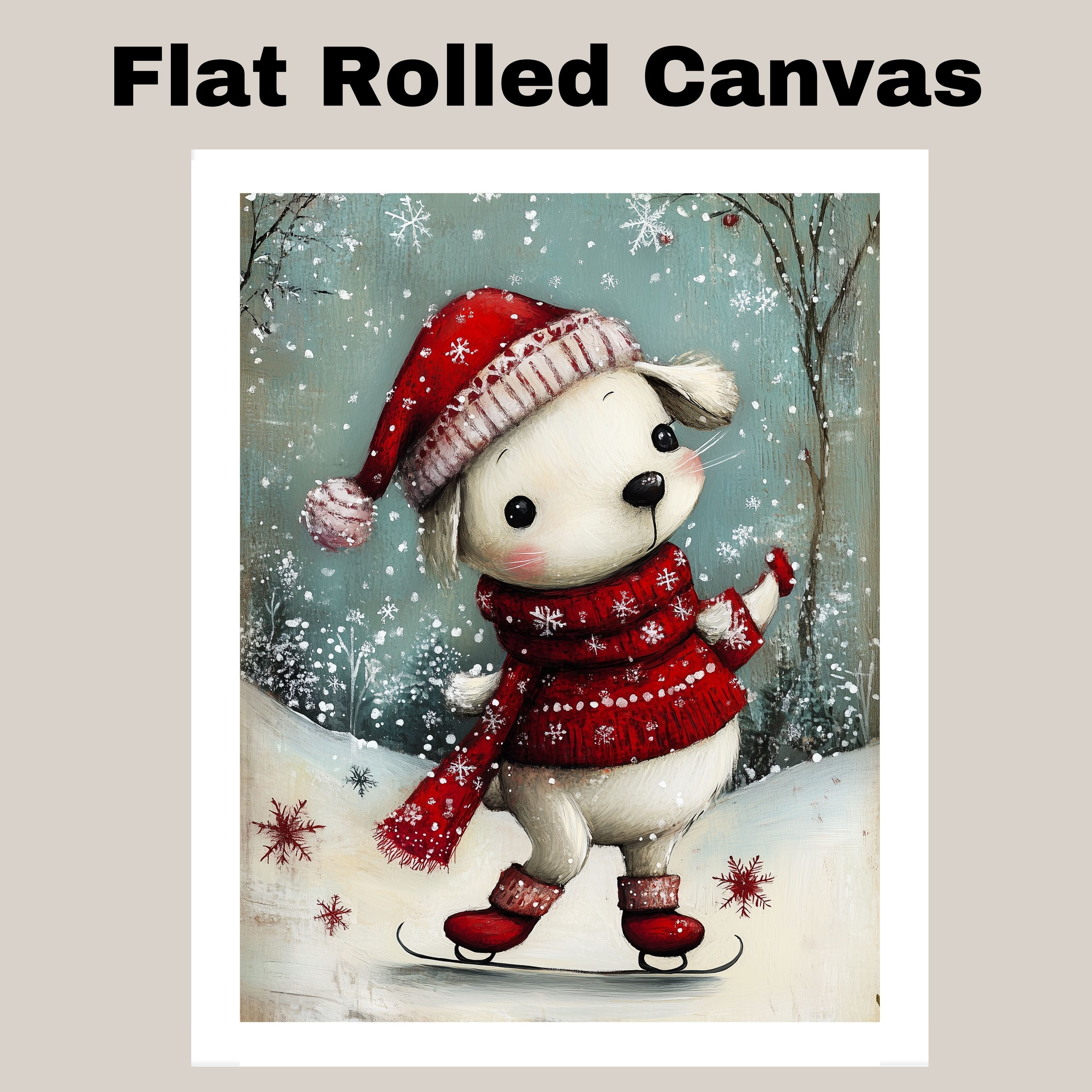 Whimsical Christmas Dog Ice Skating in Red Hat and Scarf Winter Art Print or Canvas for Festive Holiday Decor on Ready to Hang 1.5" Thick Canvas Wrap, Floating Framed Canvas, Flat Rolled Canvas