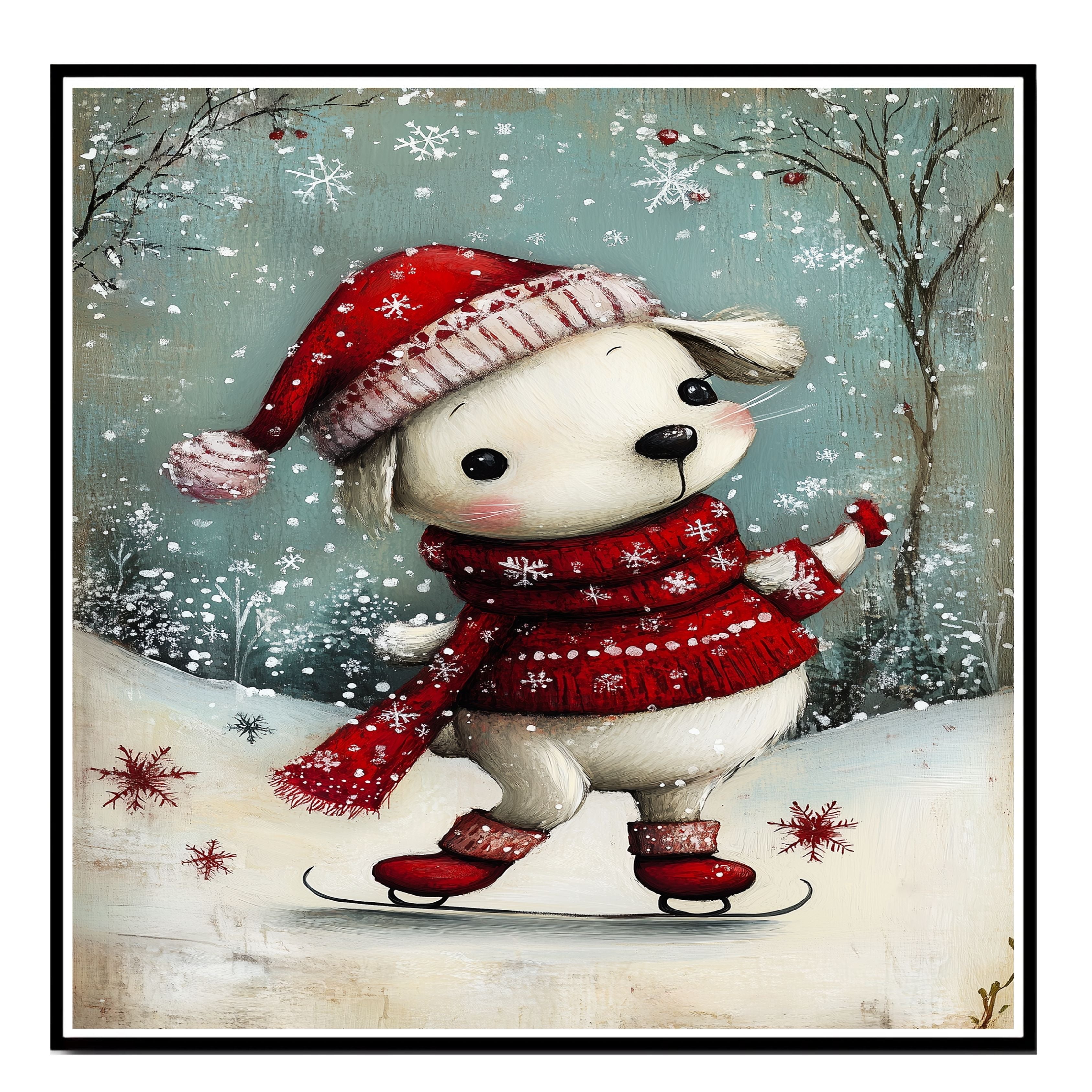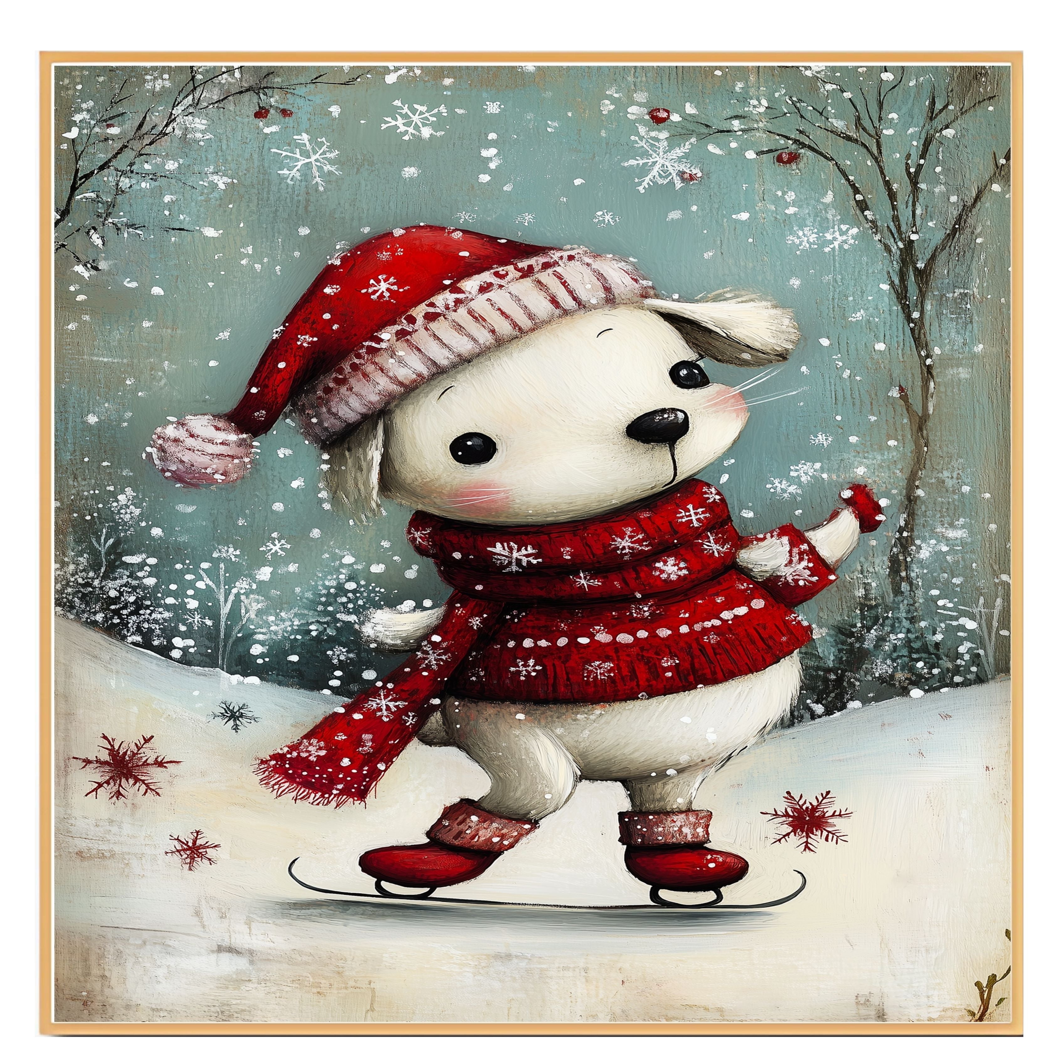 Celebrate the spirit of the season with this charming Christmas dog illustration. This sweet pup is bundled up in a red knit hat, scarf, and cozy red booties, gracefully skating across a snowy path while snowflakes gently fall. The artwork’s soft, hand-painted style adds a whimsical touch that’s perfect for warming up any holiday decor. Ideal as a seasonal art print or canvas, it’s a thoughtful gift for dog lovers, families, and anyone who adores playful winter scenes.