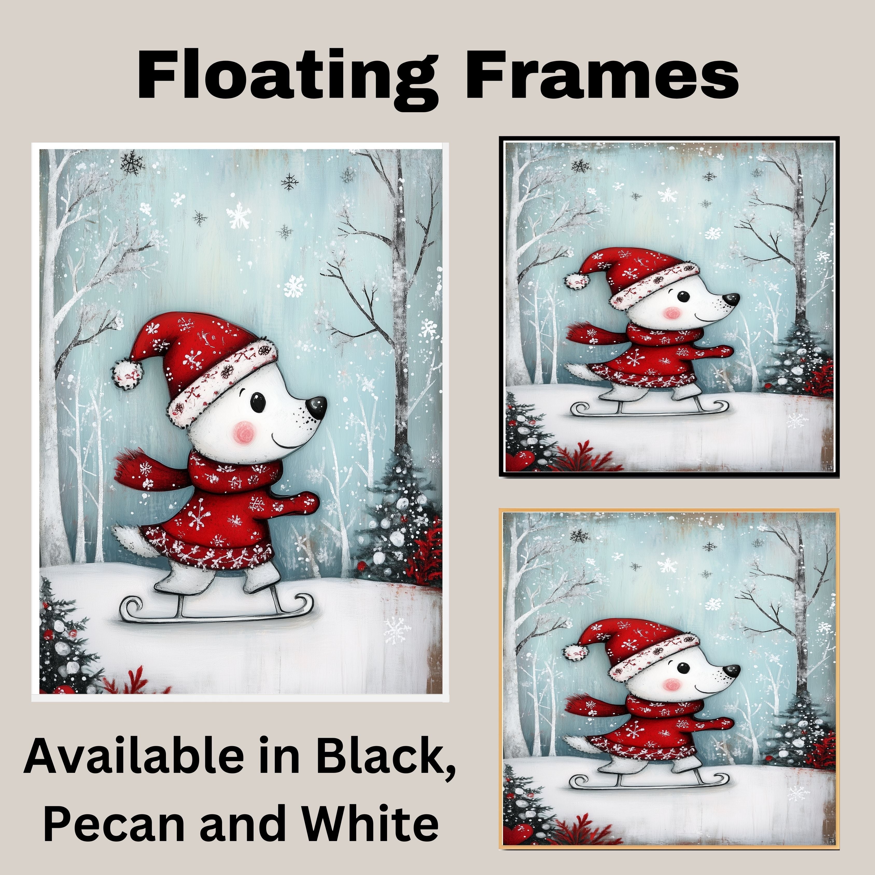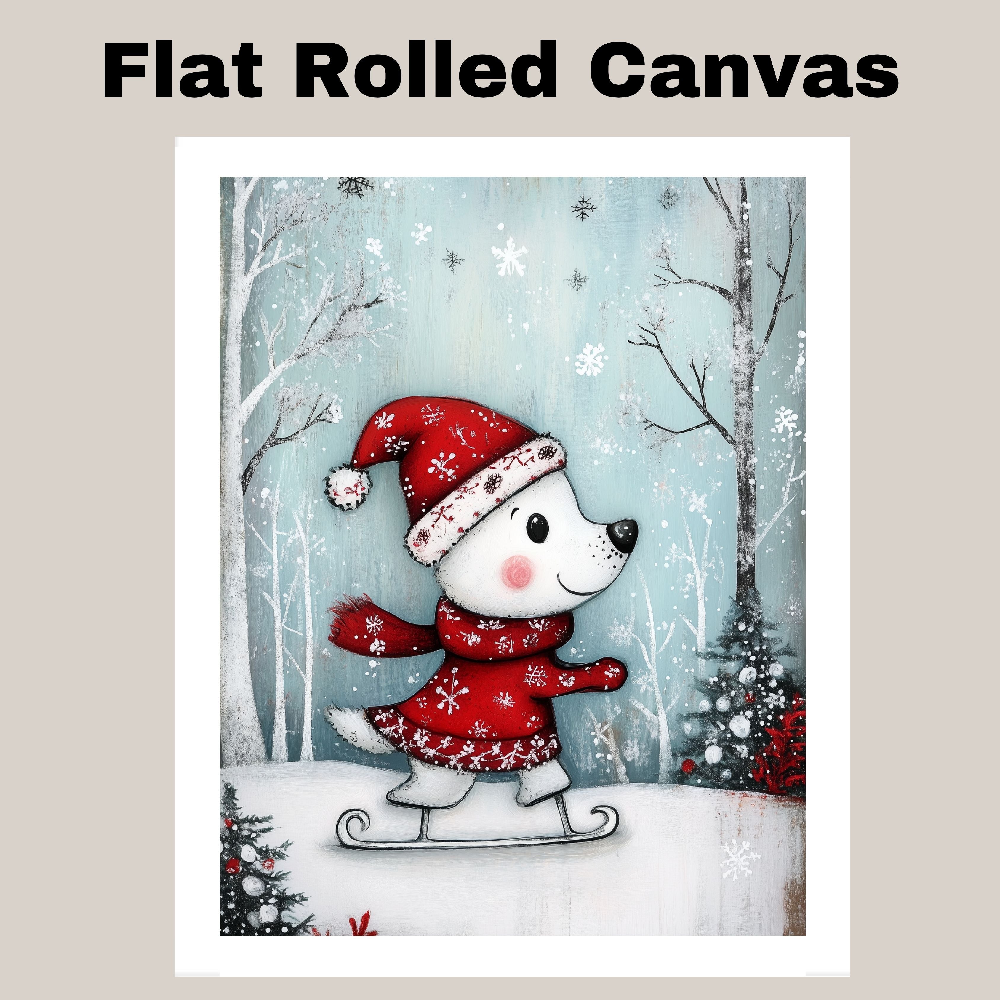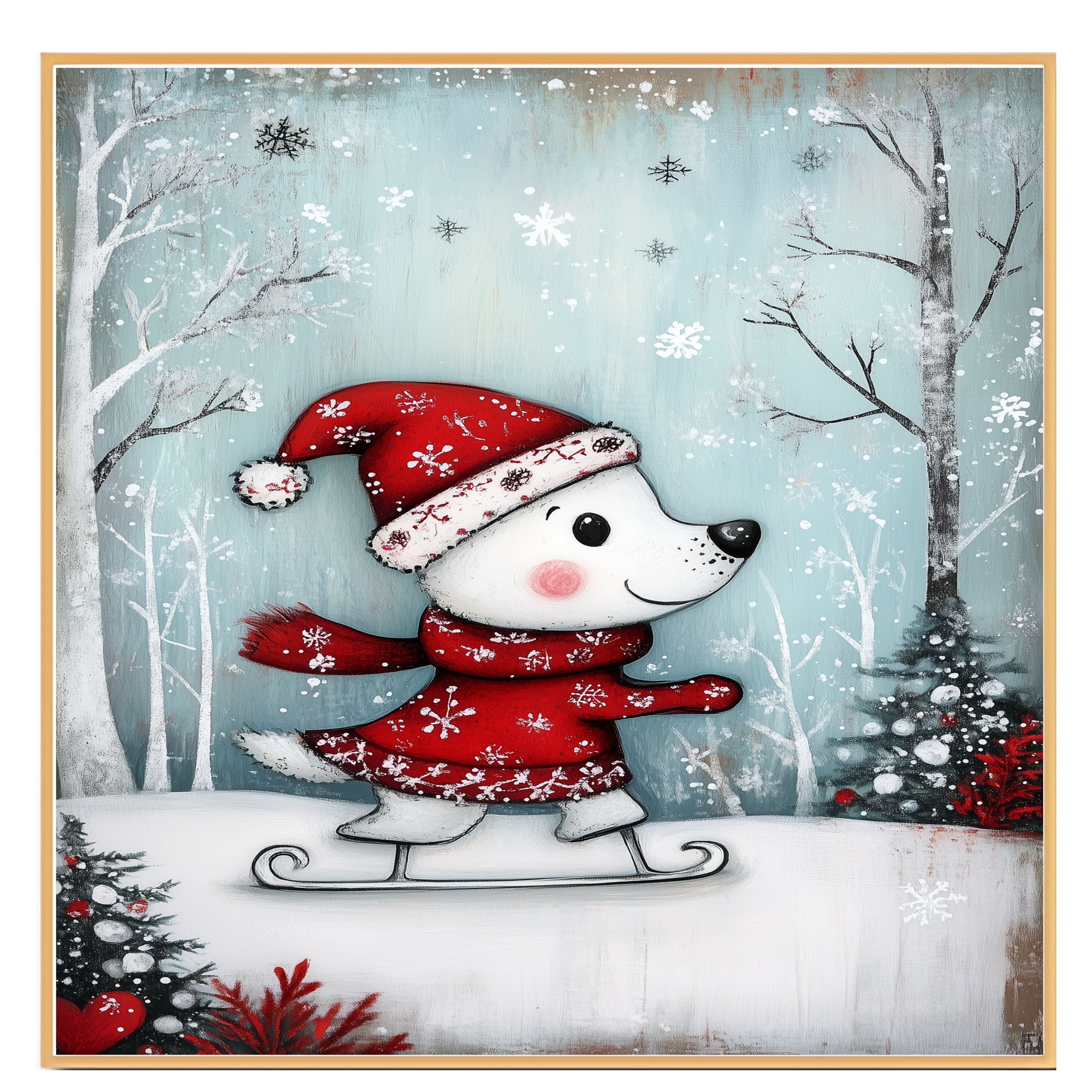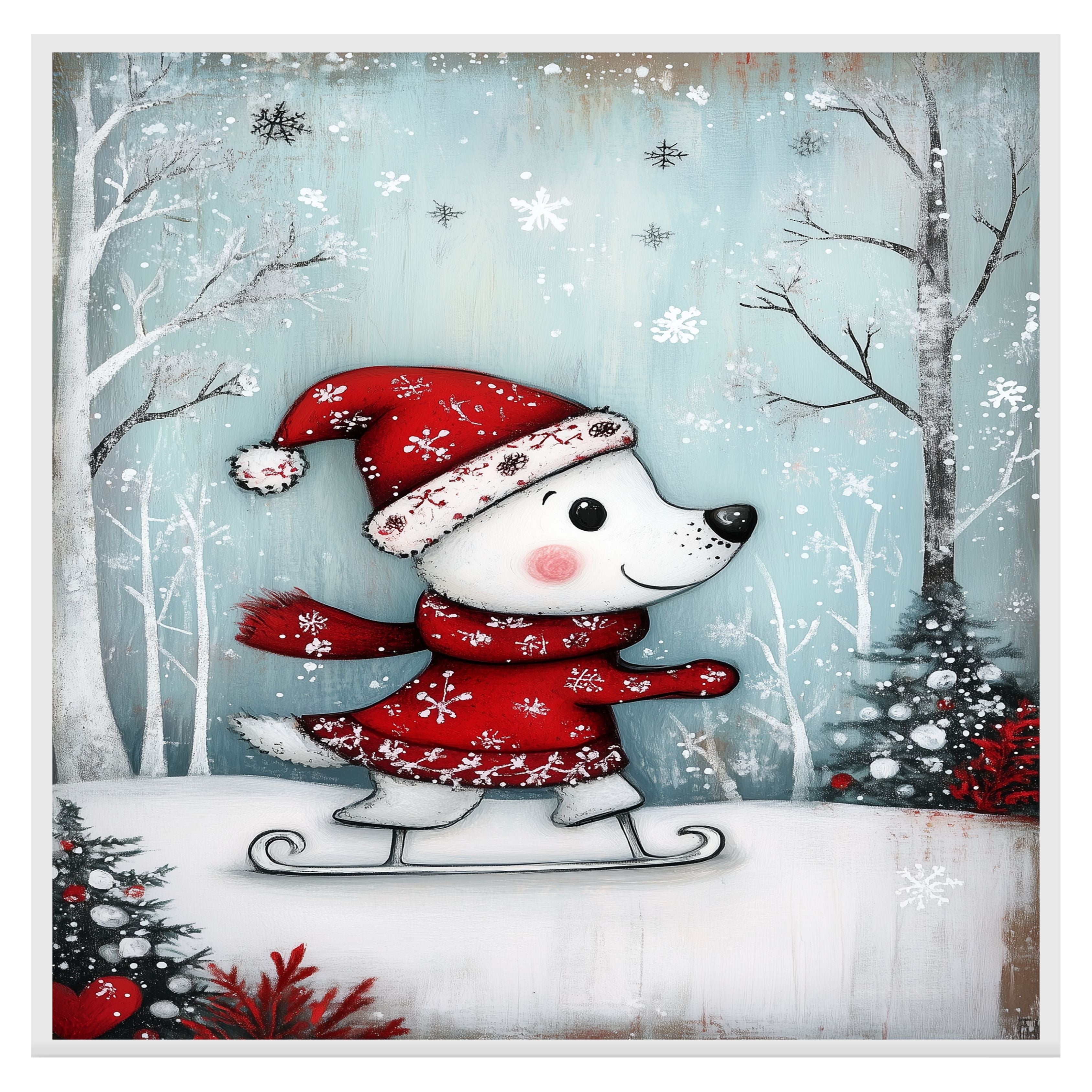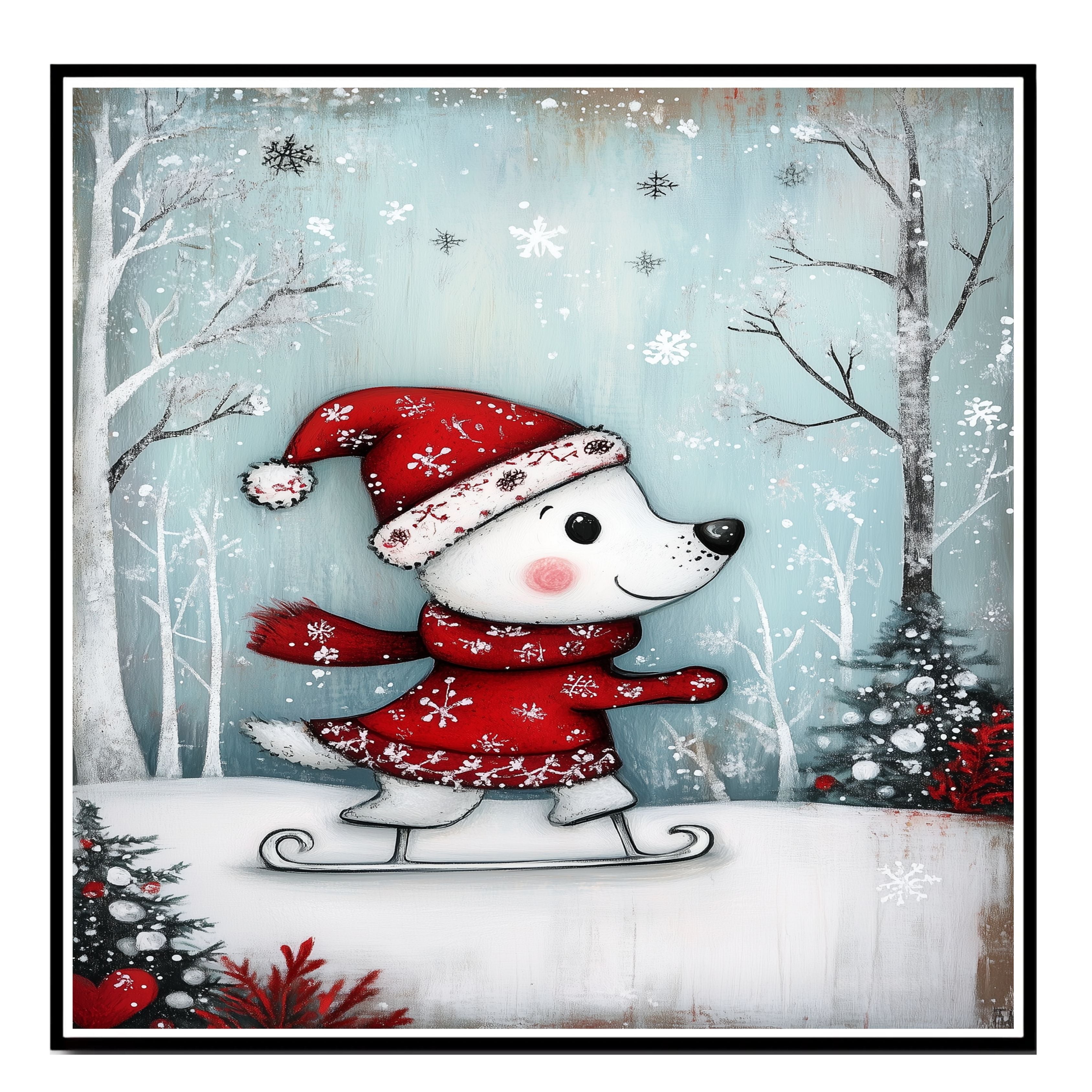 Bring a smile to your winter decor with this delightful Christmas dog illustration. This cheerful white pup is all bundled up in a red snowflake sweater and Santa hat, gliding across a snowy landscape on skates. With a charming expression and a bright seasonal palette, this piece adds warmth and joy to any space. Perfect for a nursery, entryway, or holiday gallery wall, it also makes a heartwarming gift for dog lovers and festive decor enthusiasts.