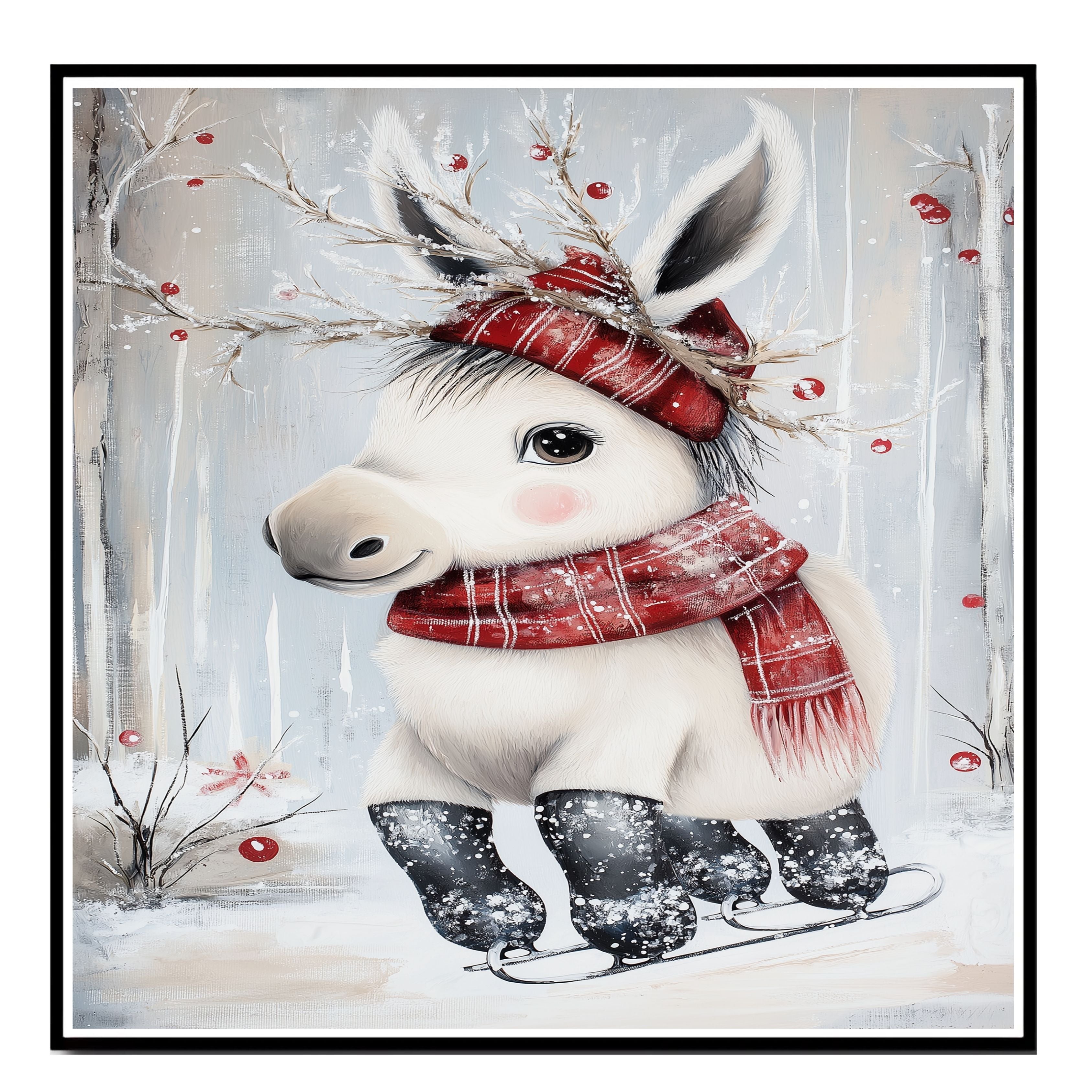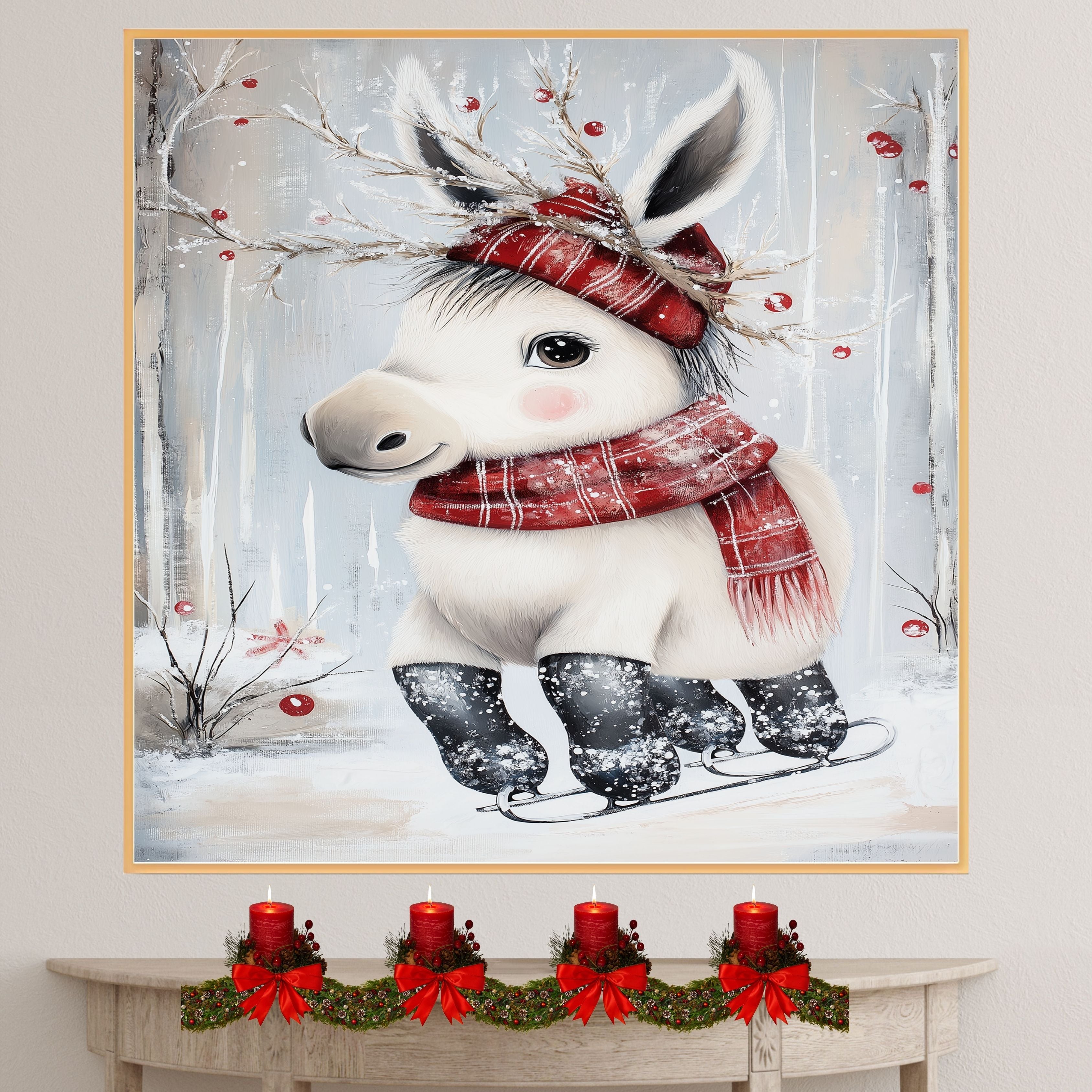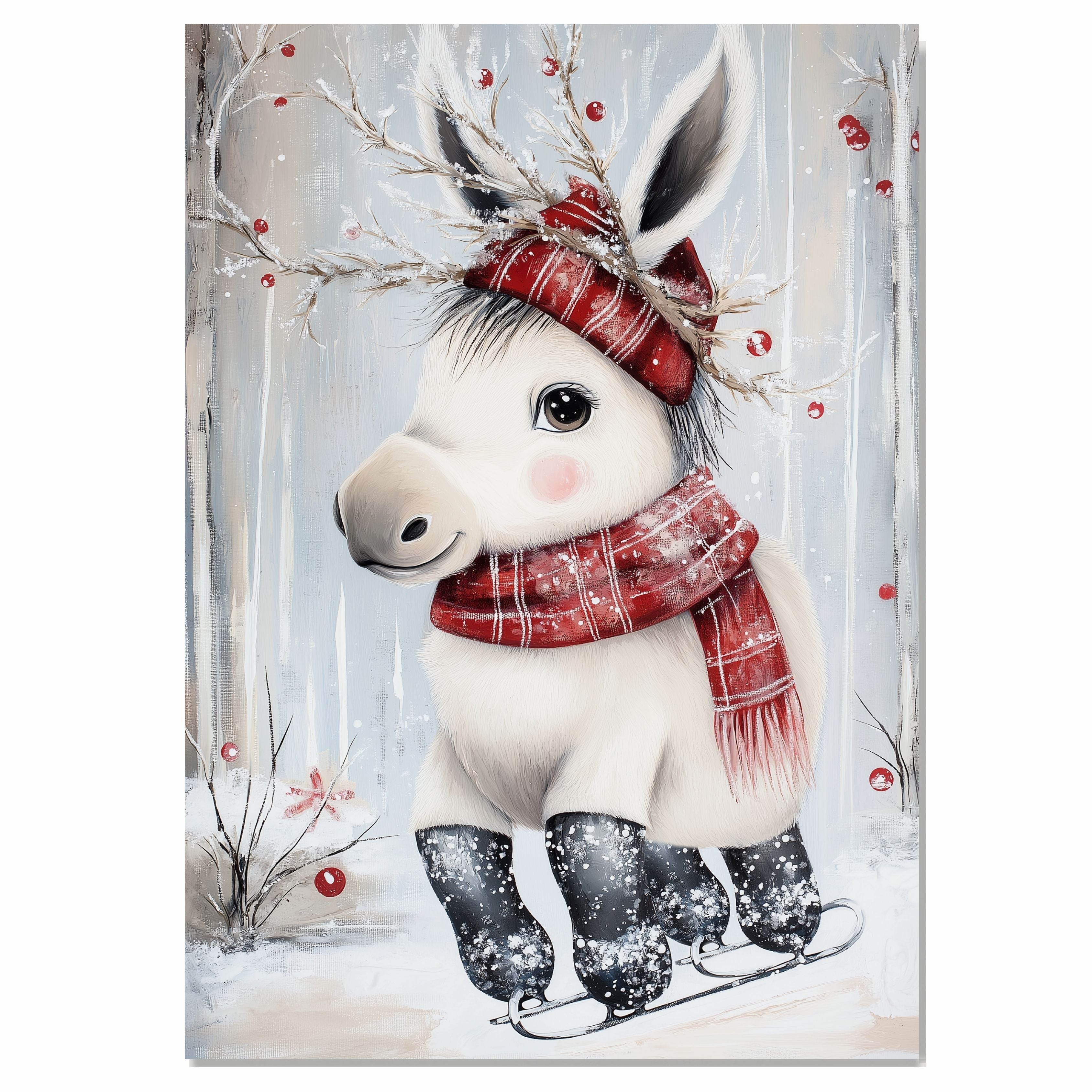 Step into a storybook winter scene with this adorable Christmas donkey wearing a cozy red plaid scarf and whimsical antler hat. With its sparkling skates and gentle snowy backdrop, this festive fellow captures the spirit of the season. Ideal for children's rooms, rustic holiday décor, or anyone who loves magical woodland creatures with charm and cheer.