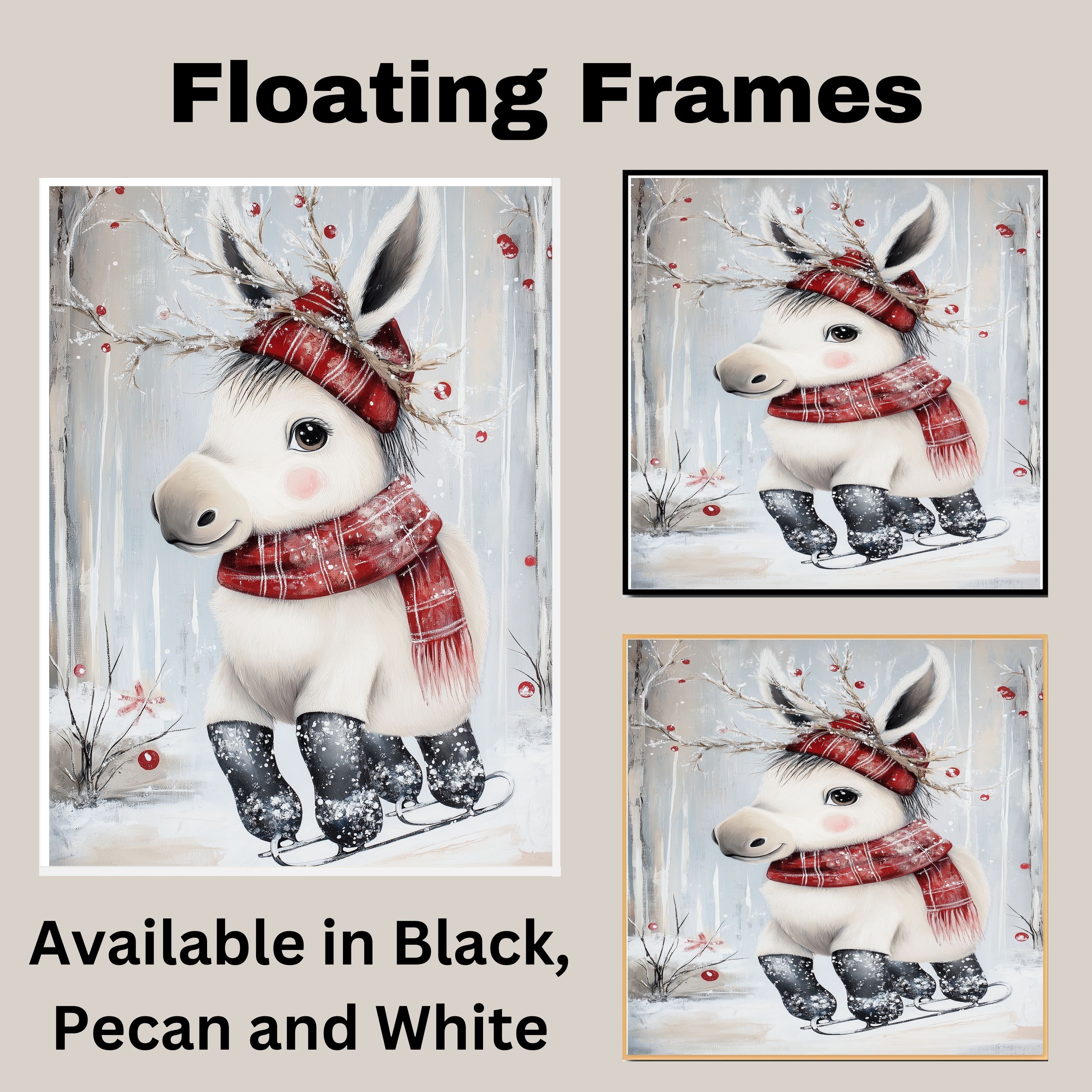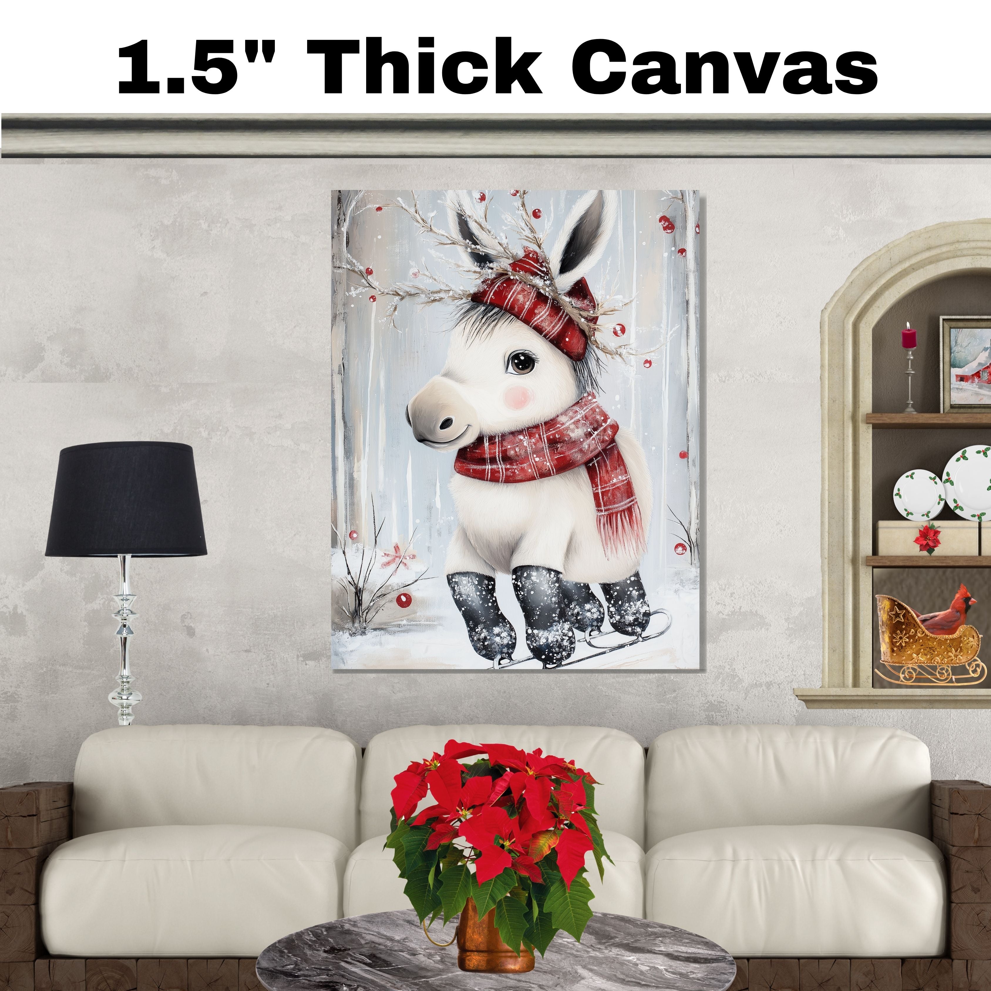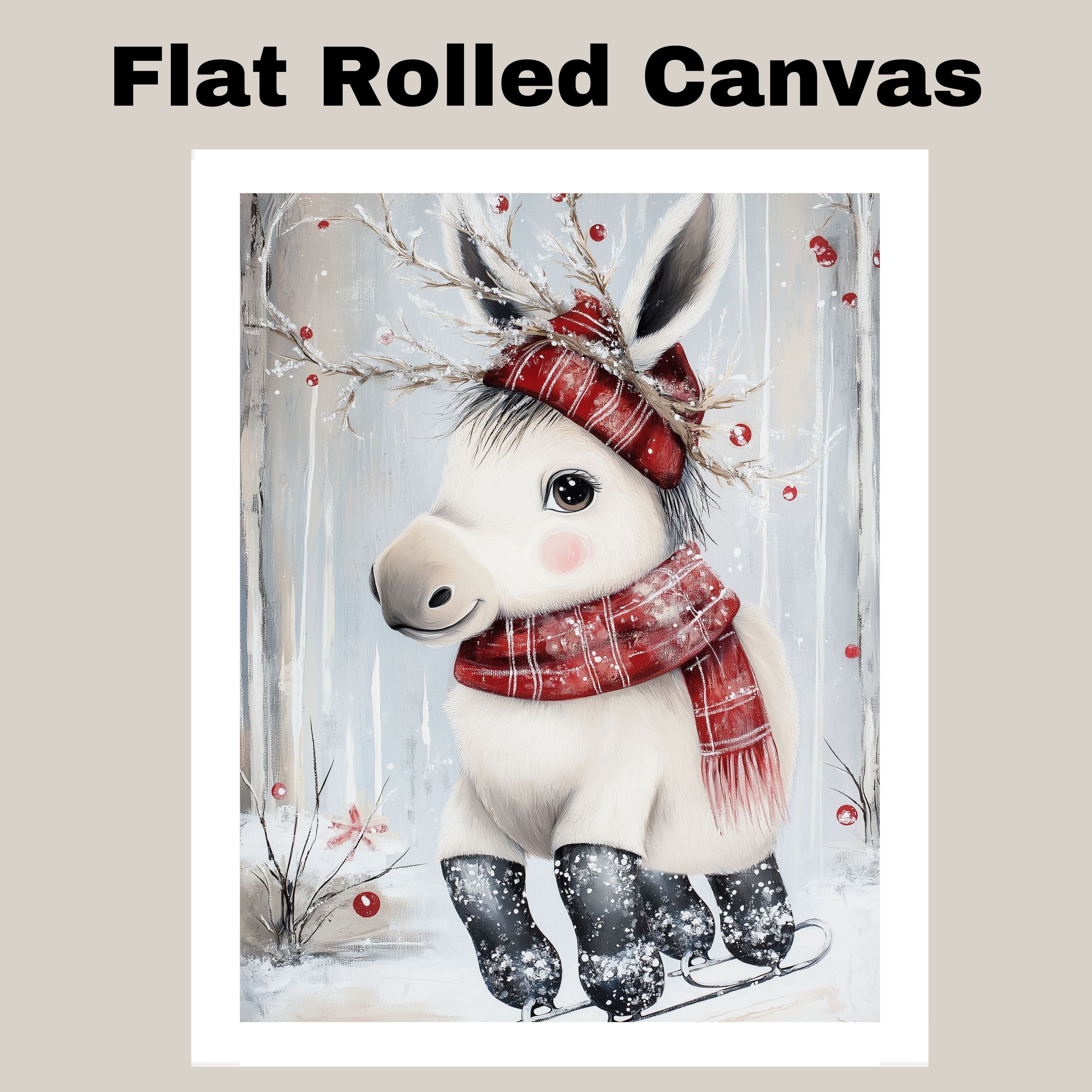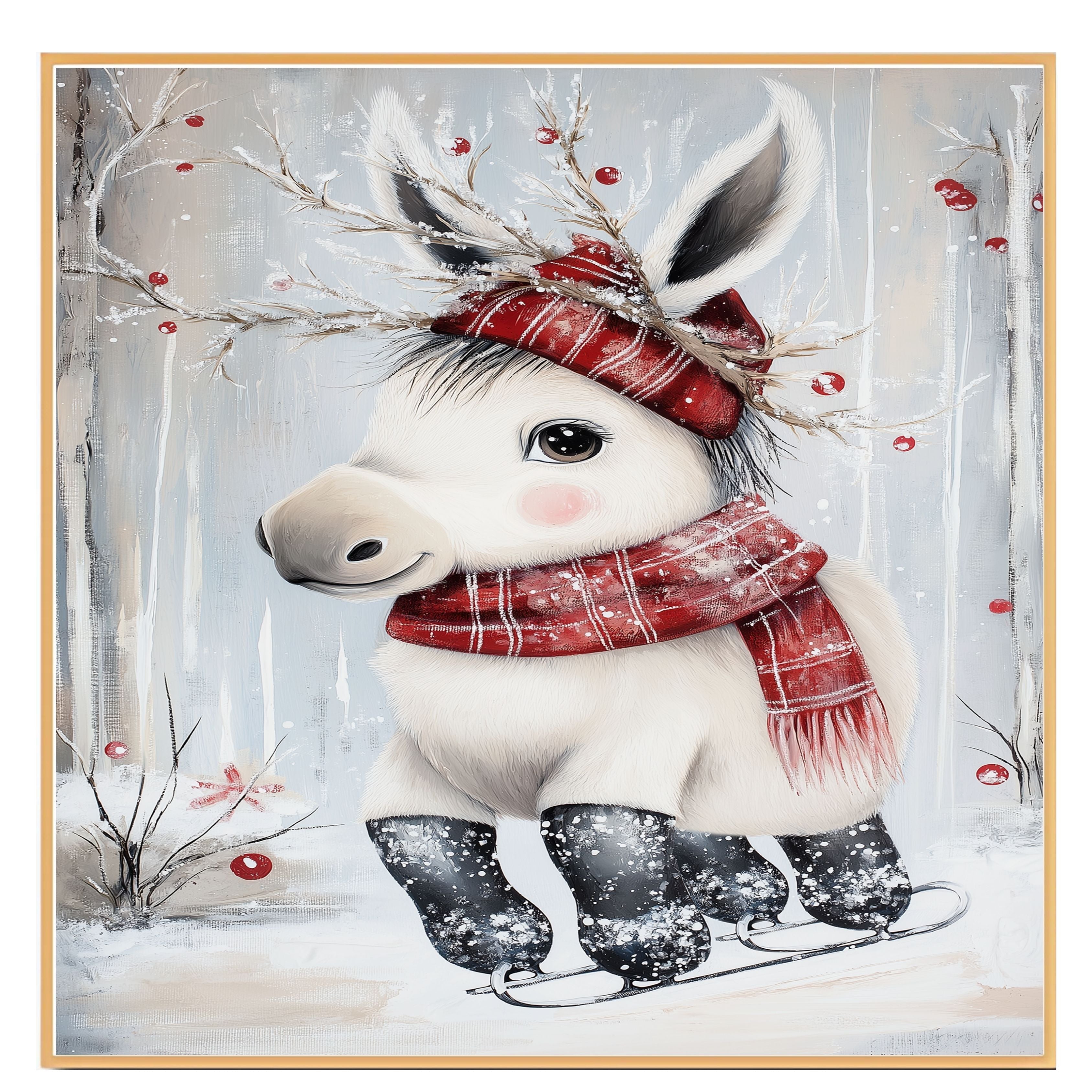Step into a storybook winter scene with this adorable Christmas donkey wearing a cozy red plaid scarf and whimsical antler hat. With its sparkling skates and gentle snowy backdrop, this festive fellow captures the spirit of the season. Ideal for children's rooms, rustic holiday décor, or anyone who loves magical woodland creatures with charm and cheer.