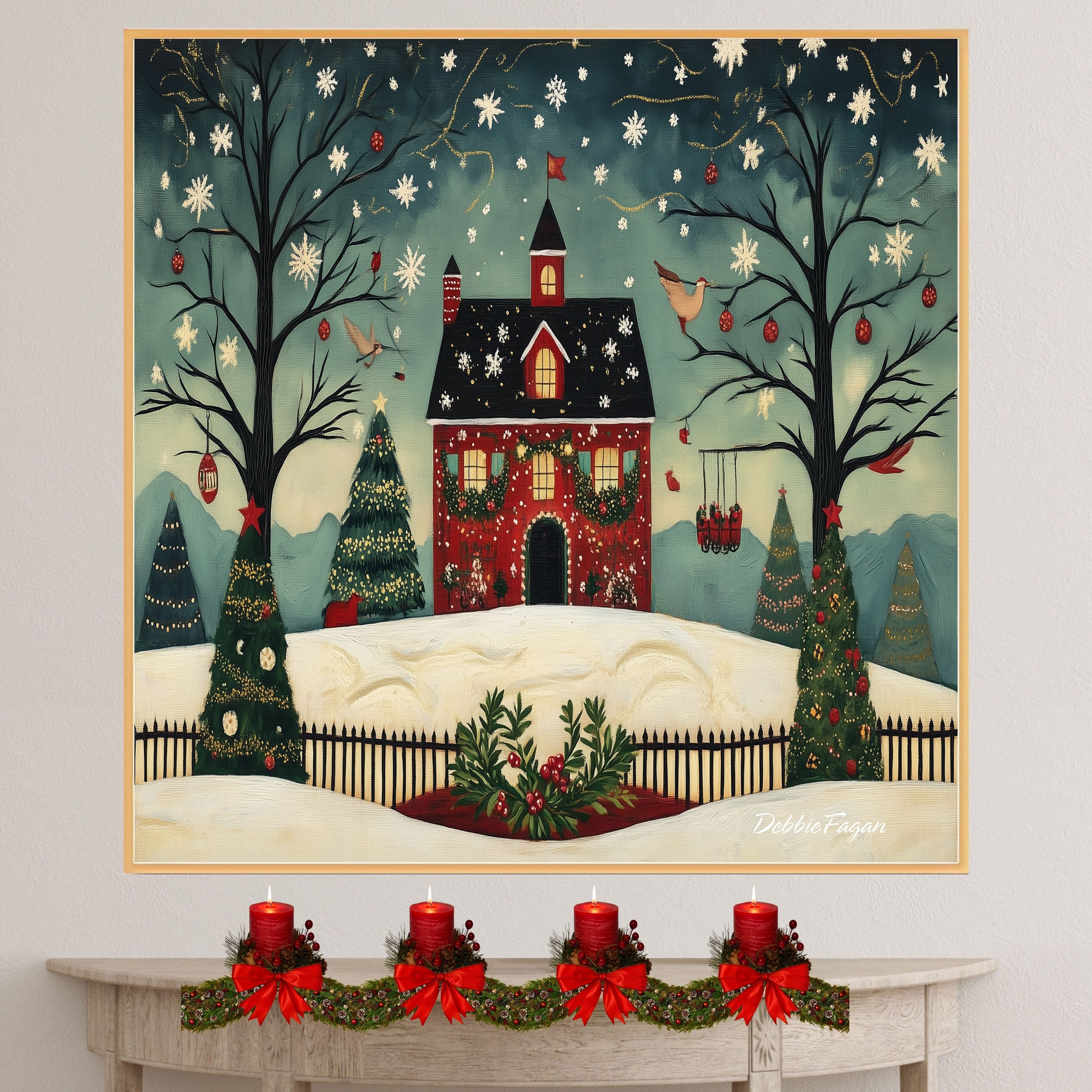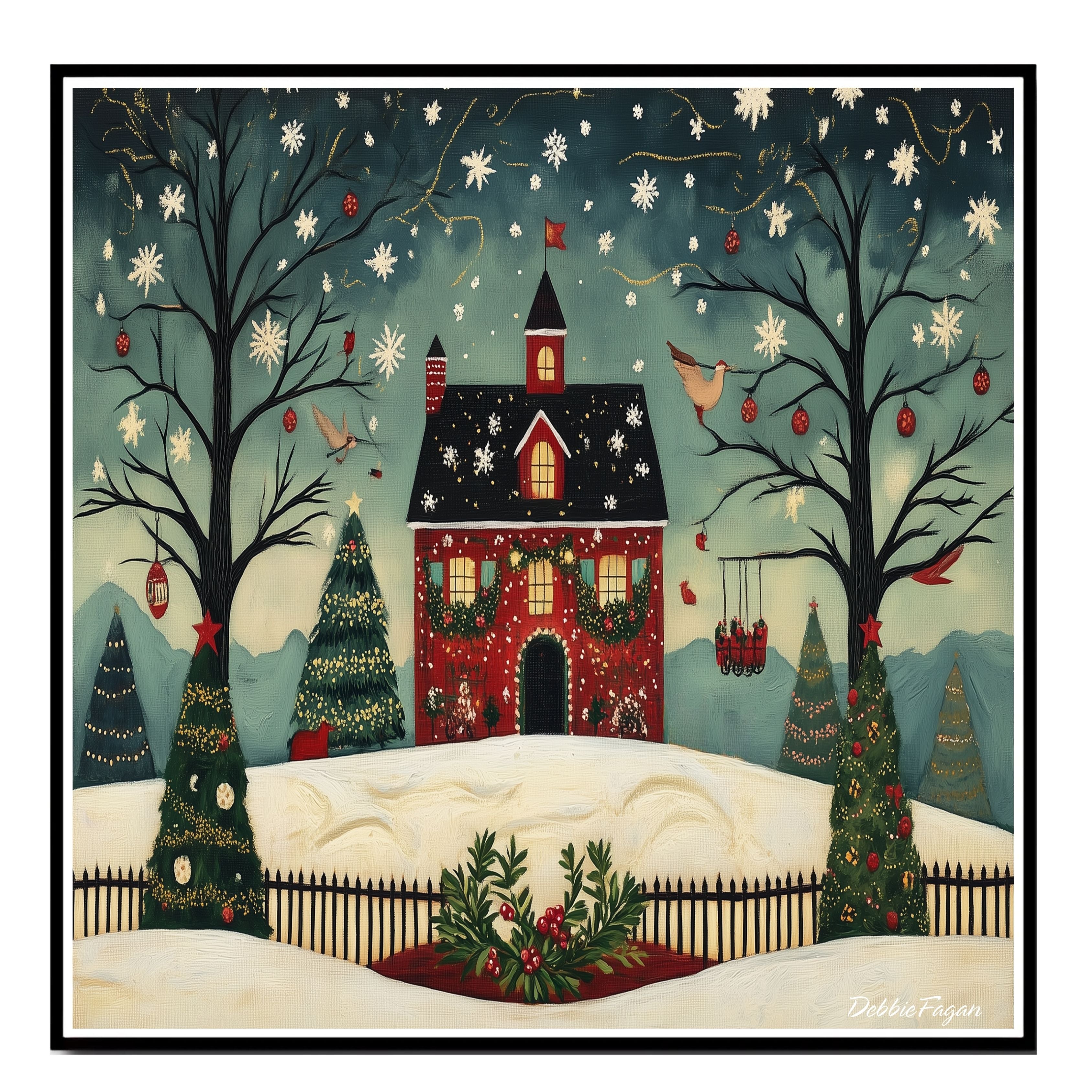 This enchanting folk art painting features a cozy red house adorned with holiday garlands, snowy trees with ornaments, playful birds, and falling snowflakes in a serene mountain village.