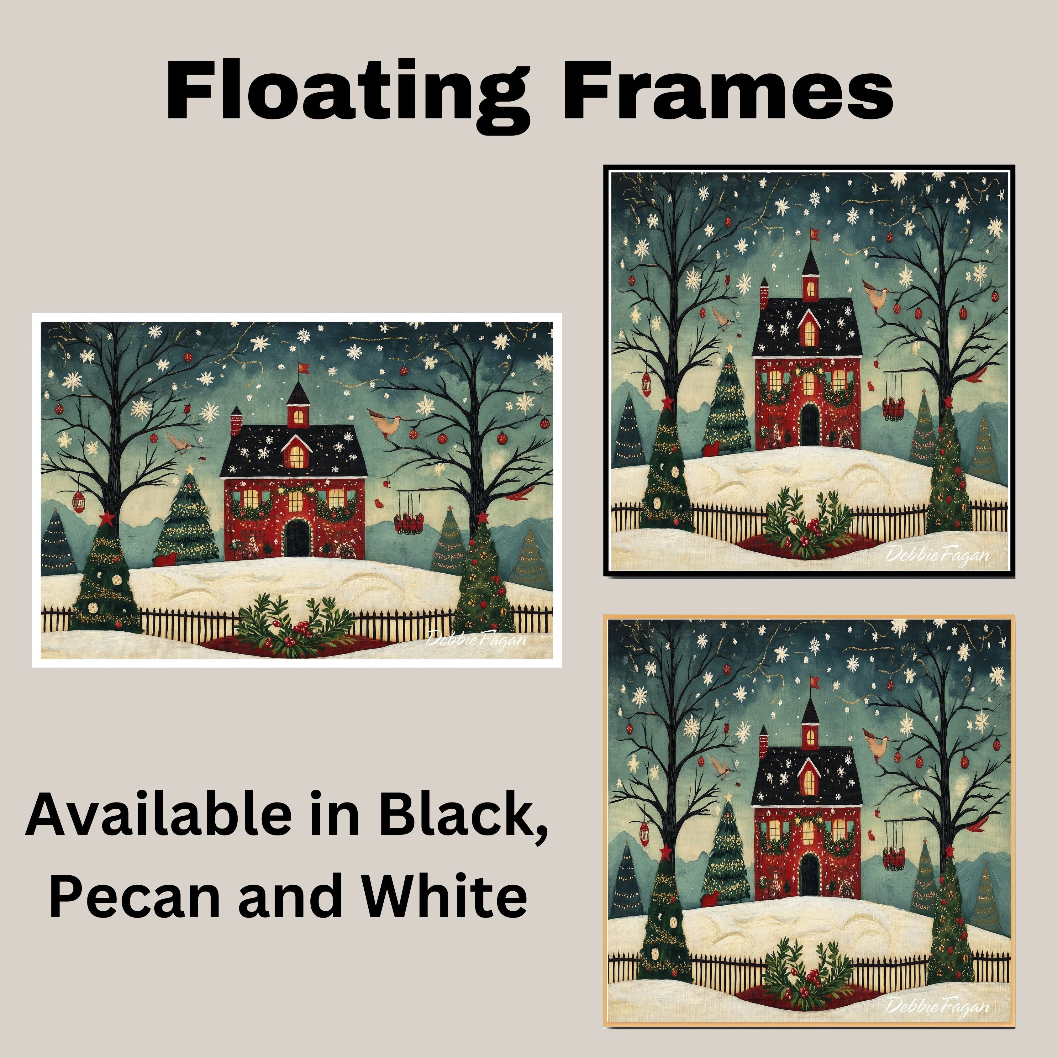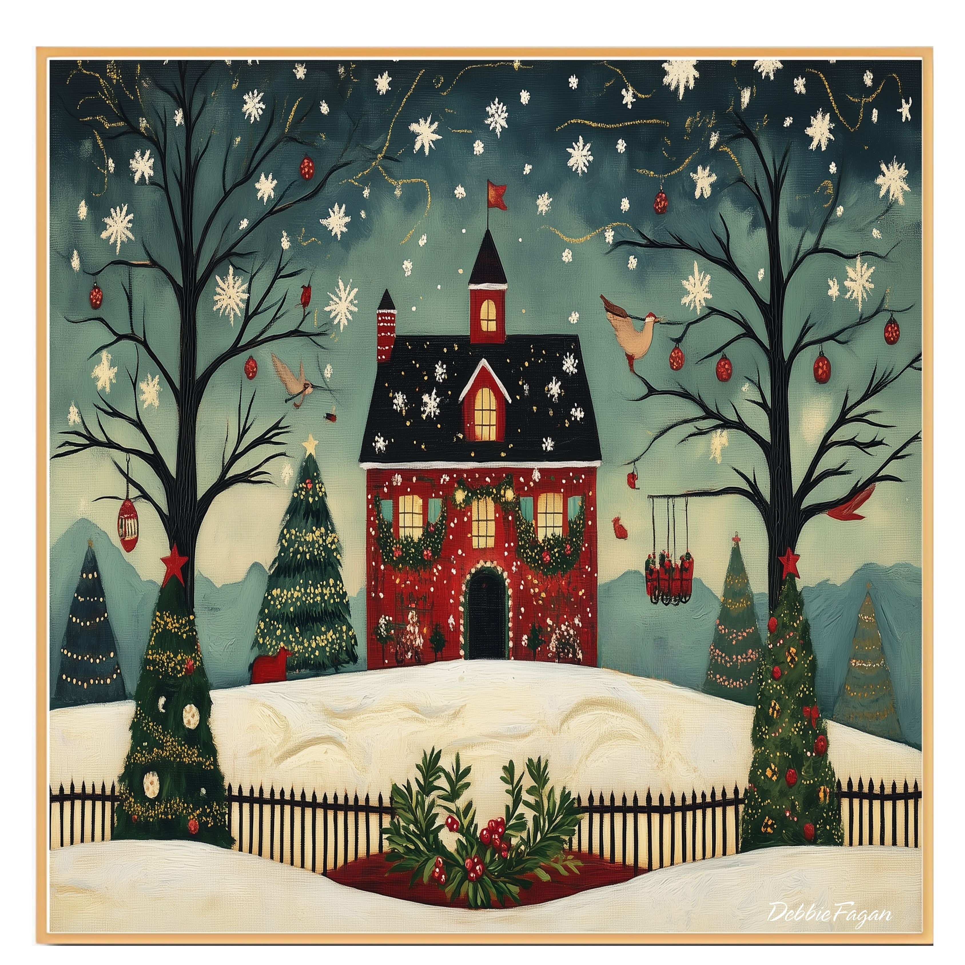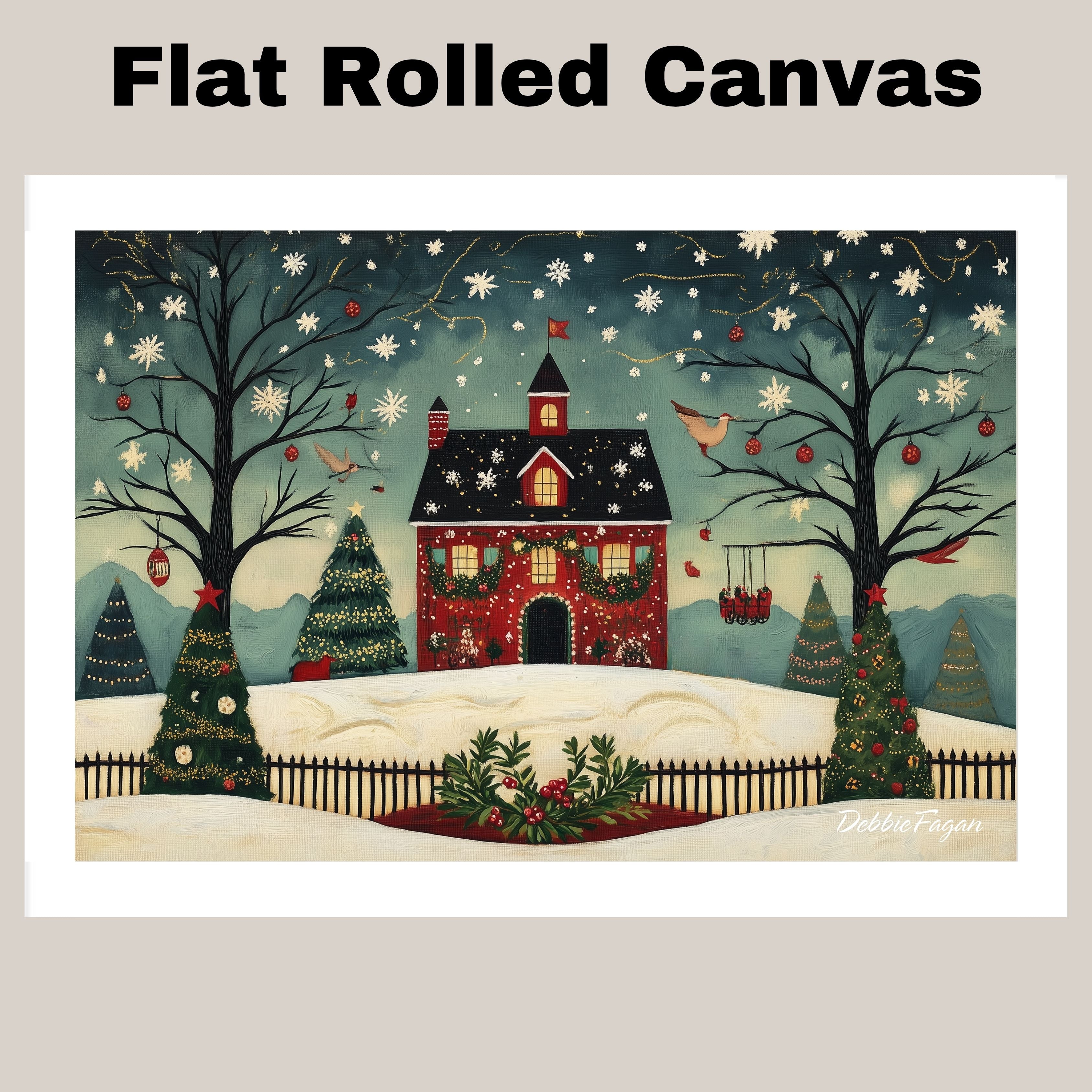 Whimsical Christmas Folk Art of Red House, Decorated Trees, Snowflakes, and Birds in a Peaceful Winter Wonderland on Ready to Hang 1.5" Thick Canvas Wrap, Floating Framed Canvas, Flat Rolled Canvas