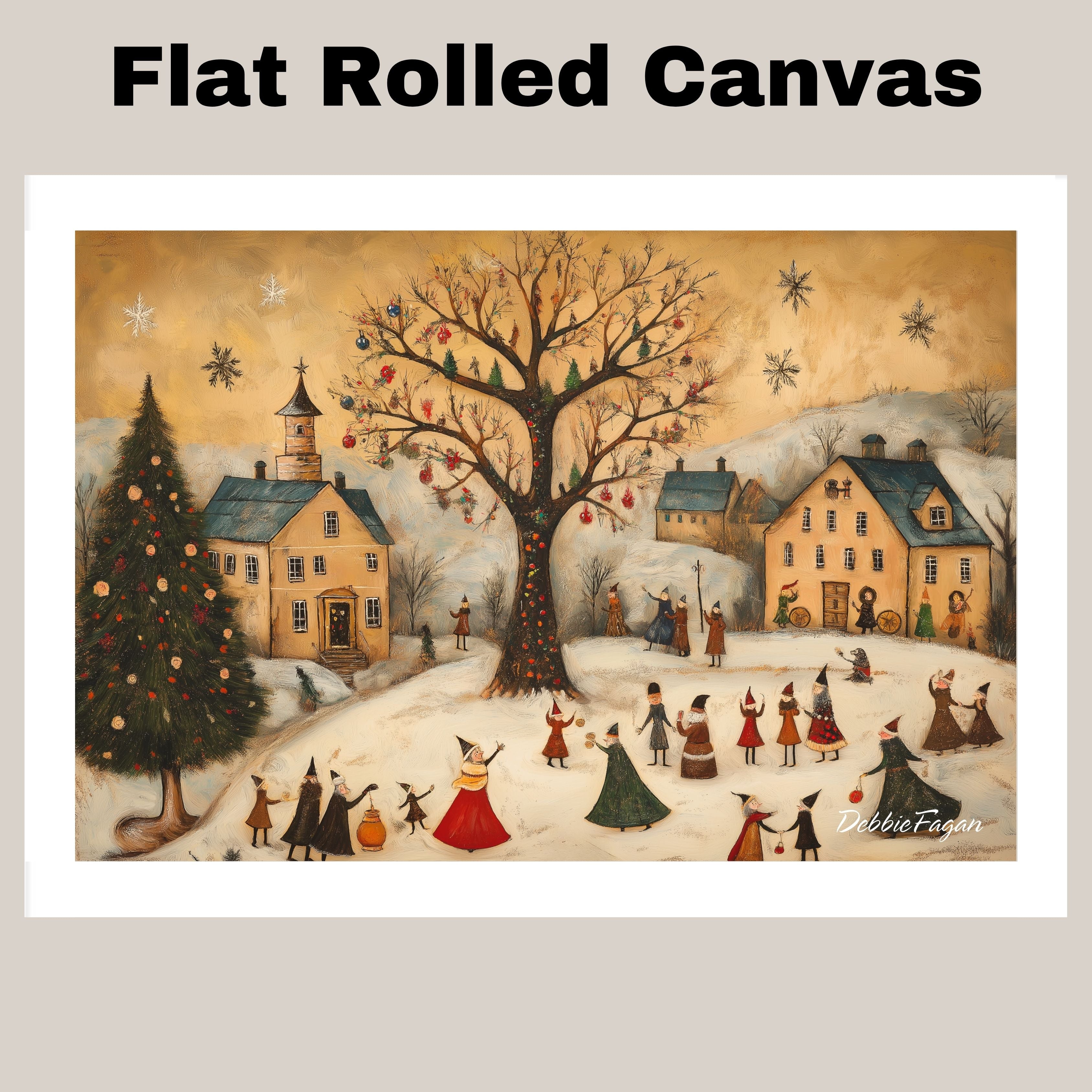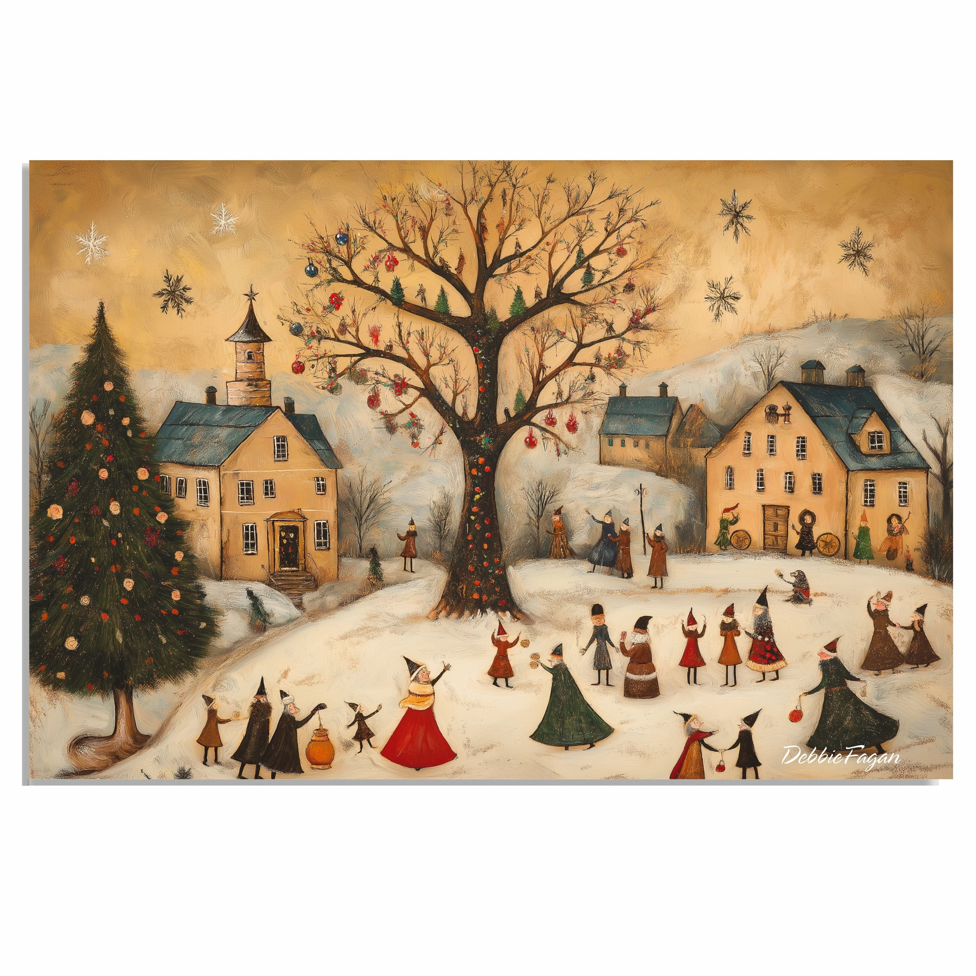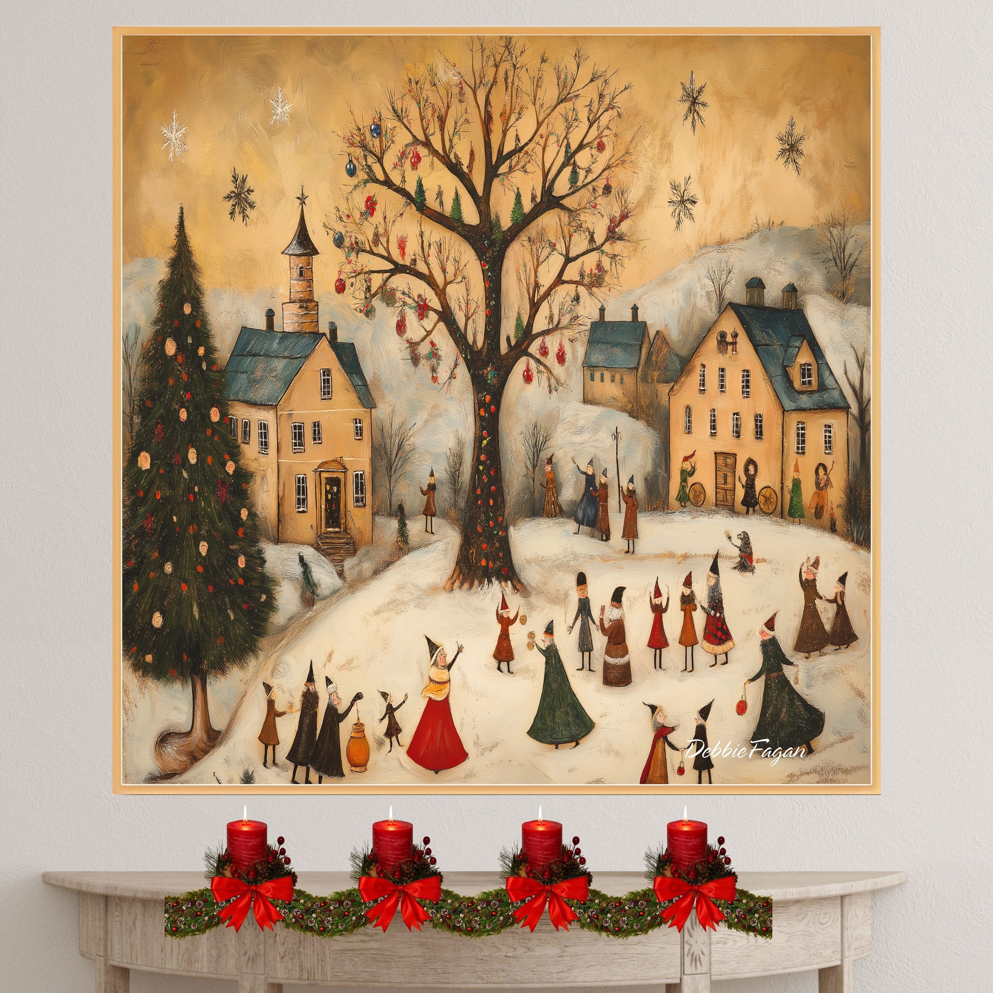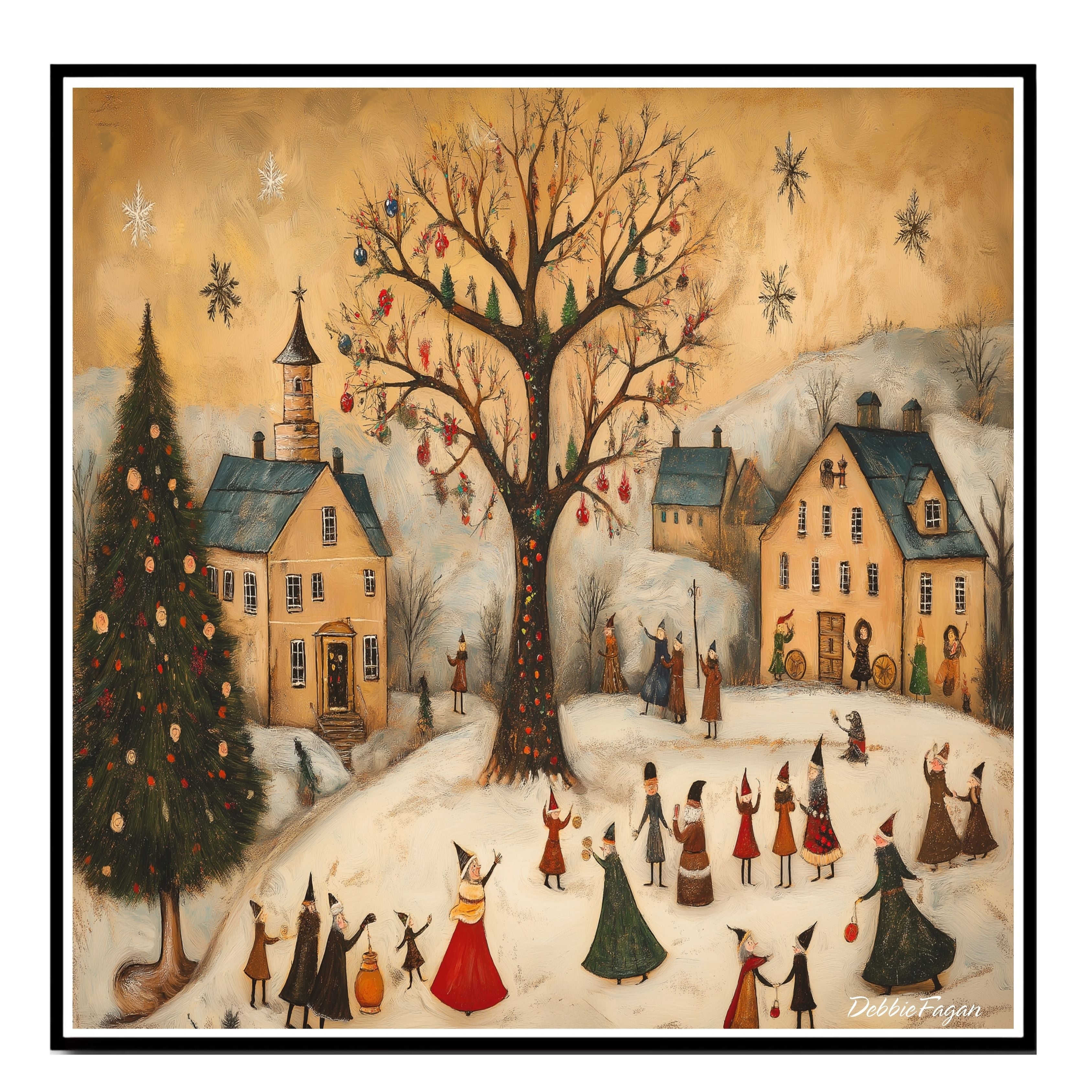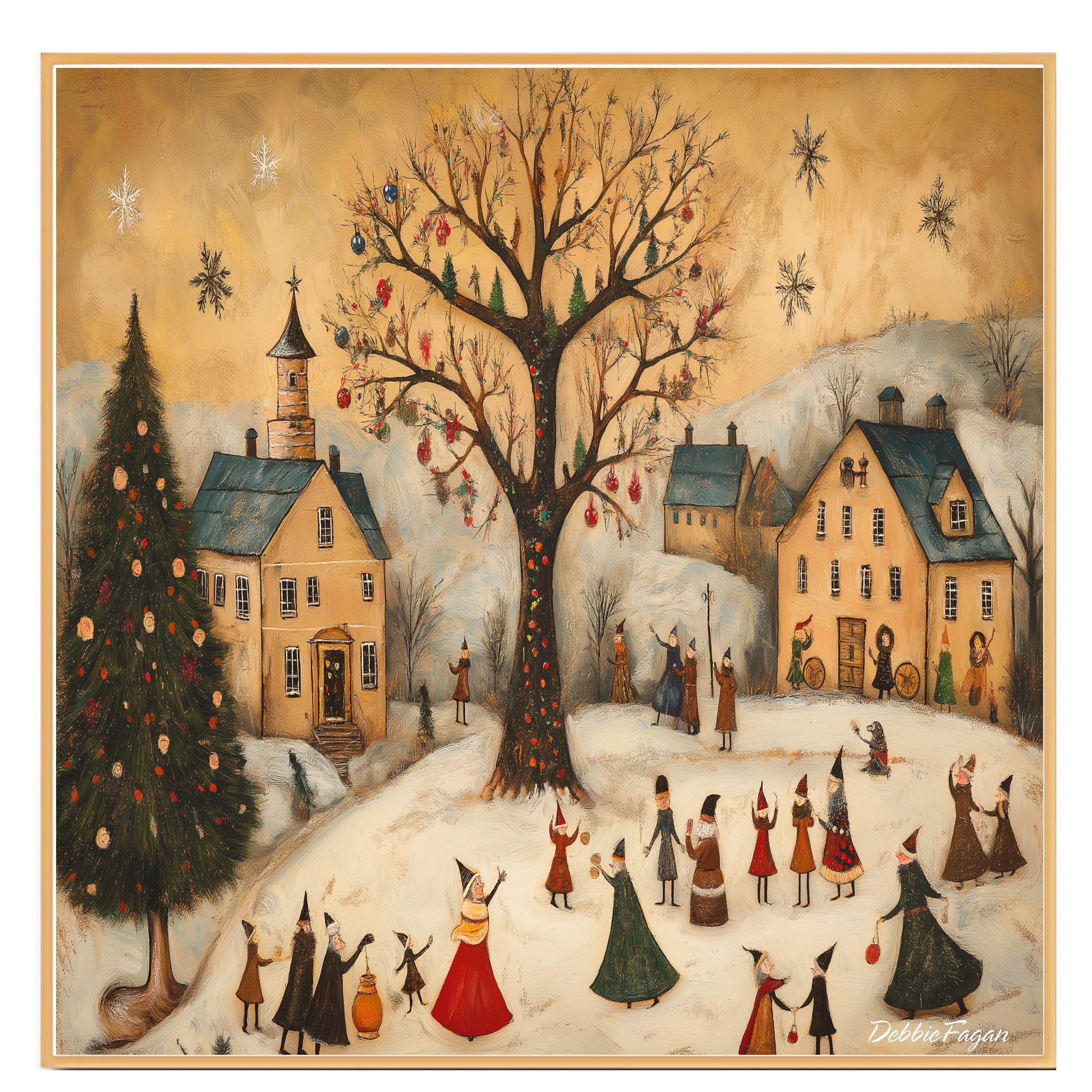 This delightful folk art painting captures a snowy village filled with Christmas cheer—carolers, decorated trees, charming houses, and joyful townsfolk dancing beneath a glowing sky.