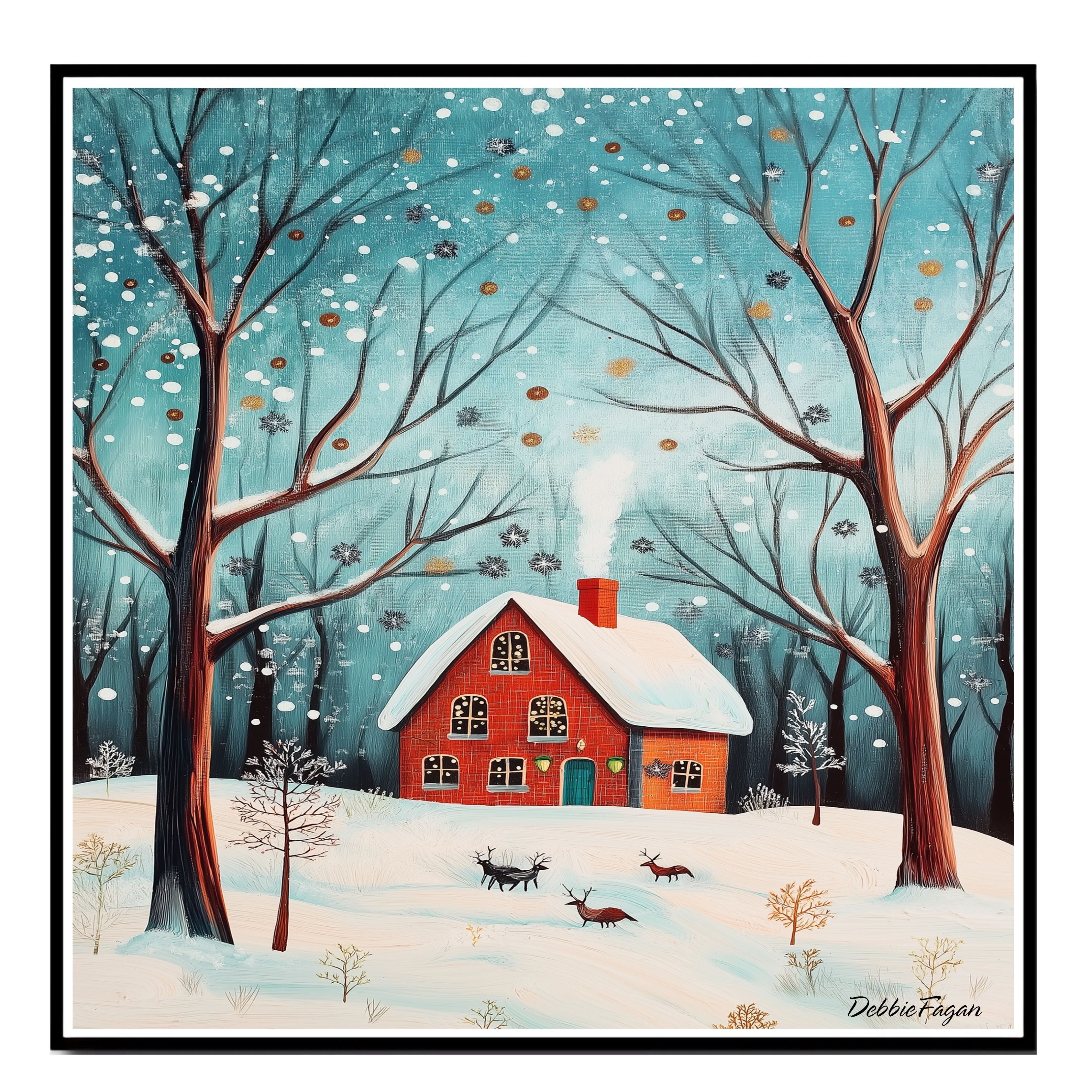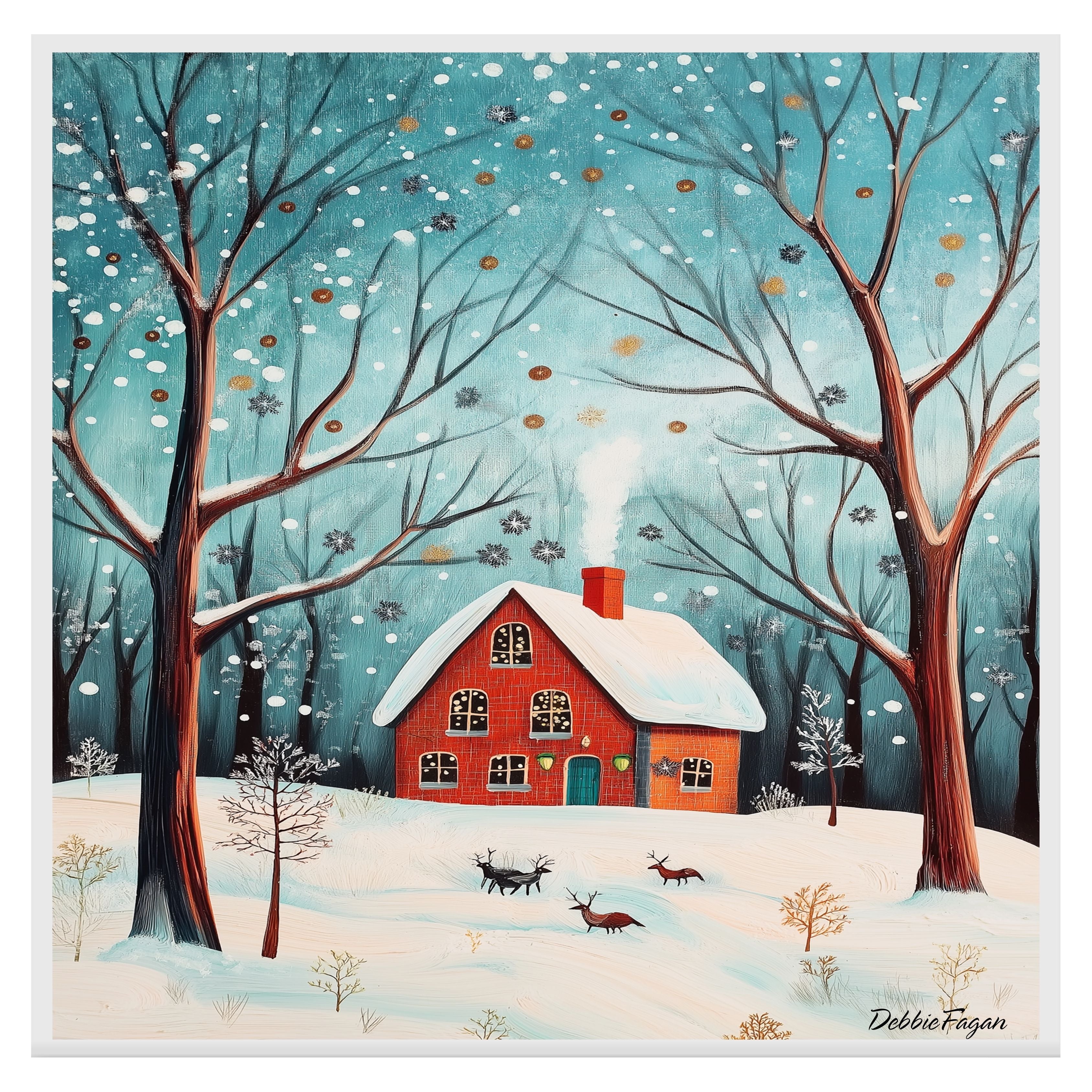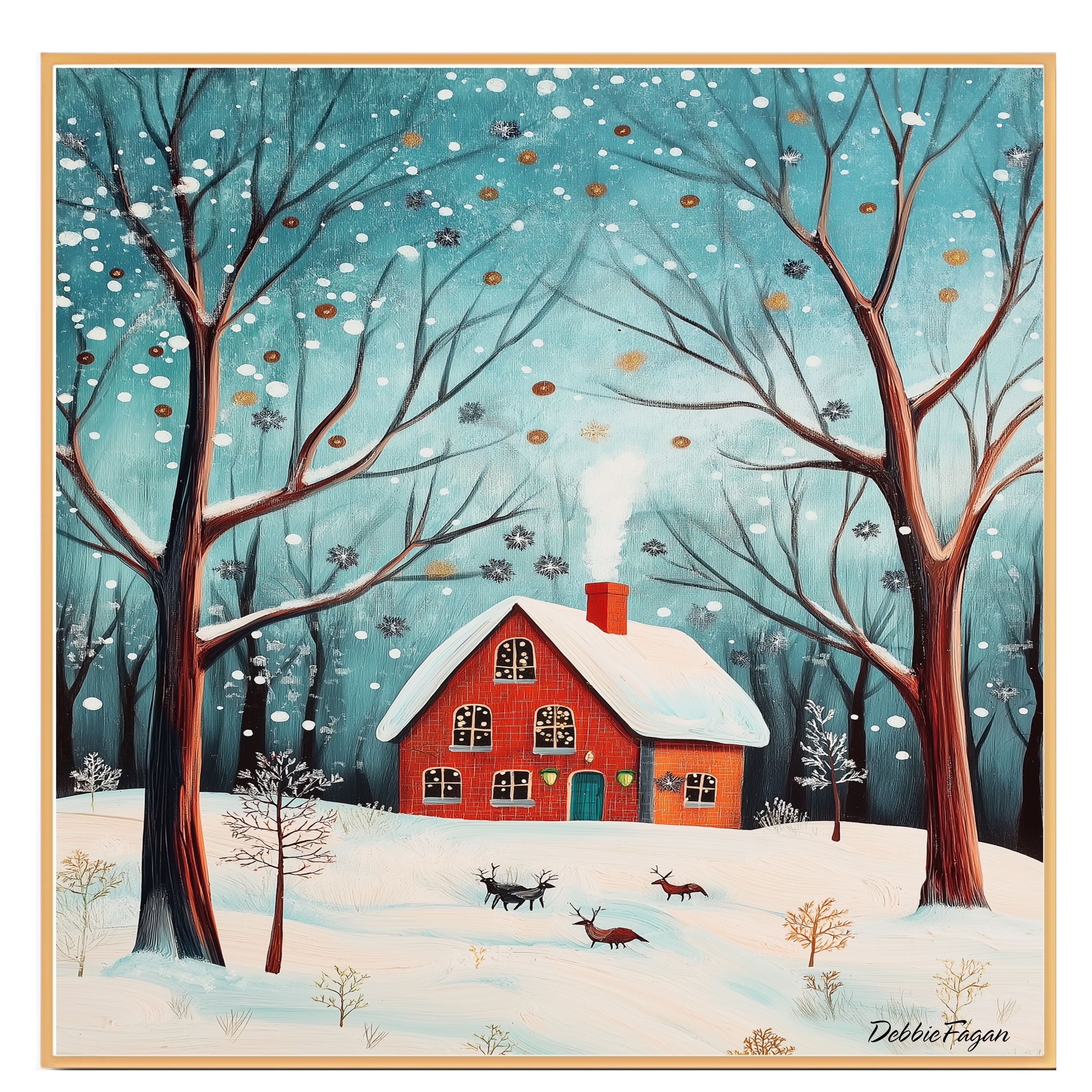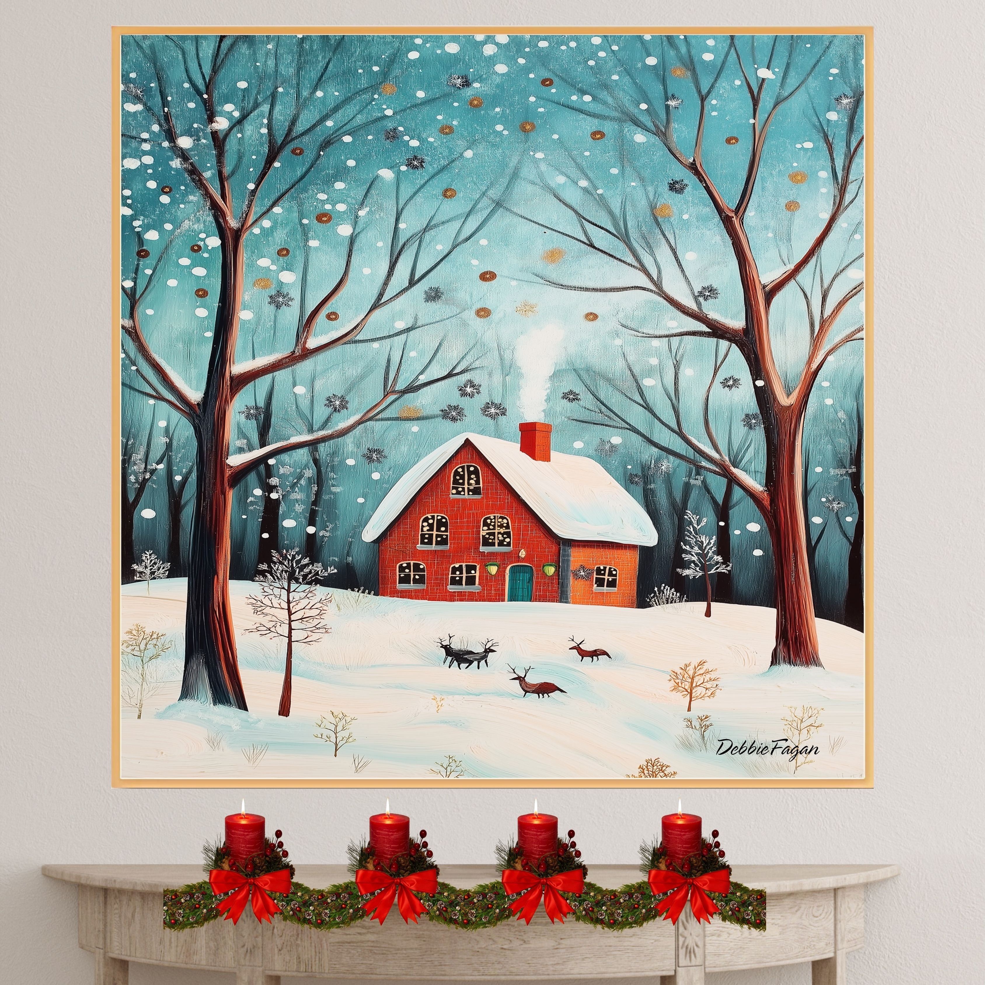 This nostalgic folk art painting captures a quiet snowy village lit by warm windows, with horse-drawn sleighs, wreaths, and festive charm under a starry sky.