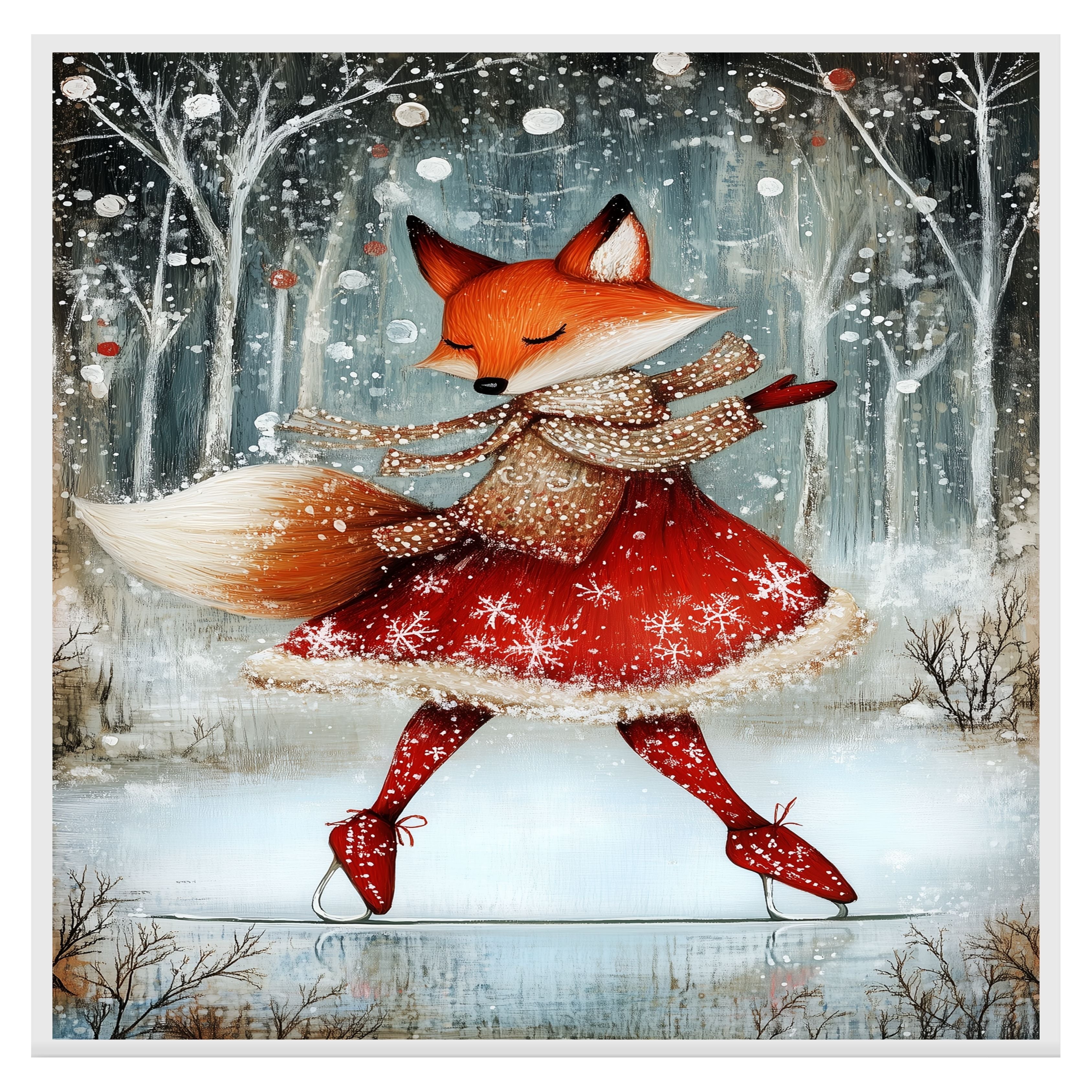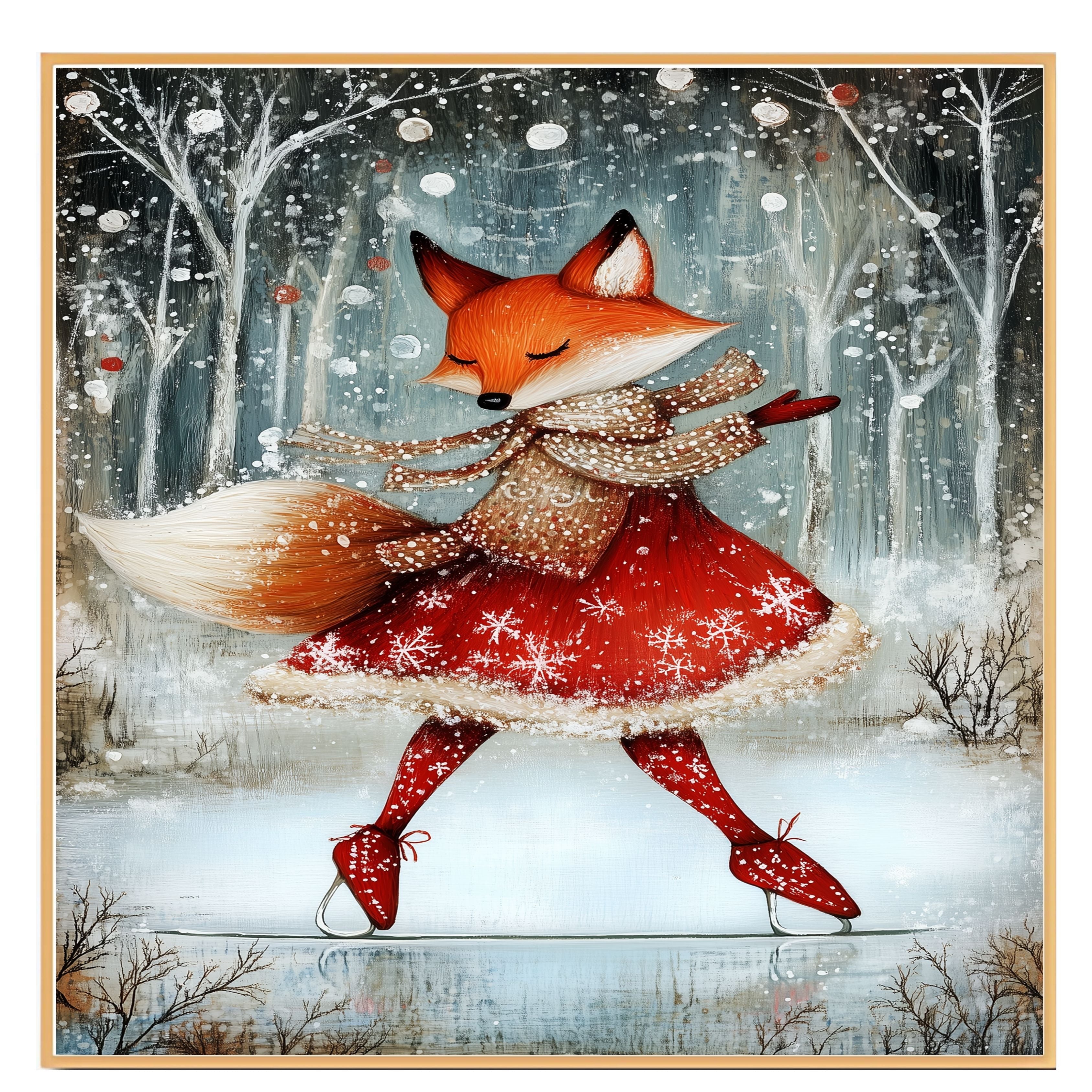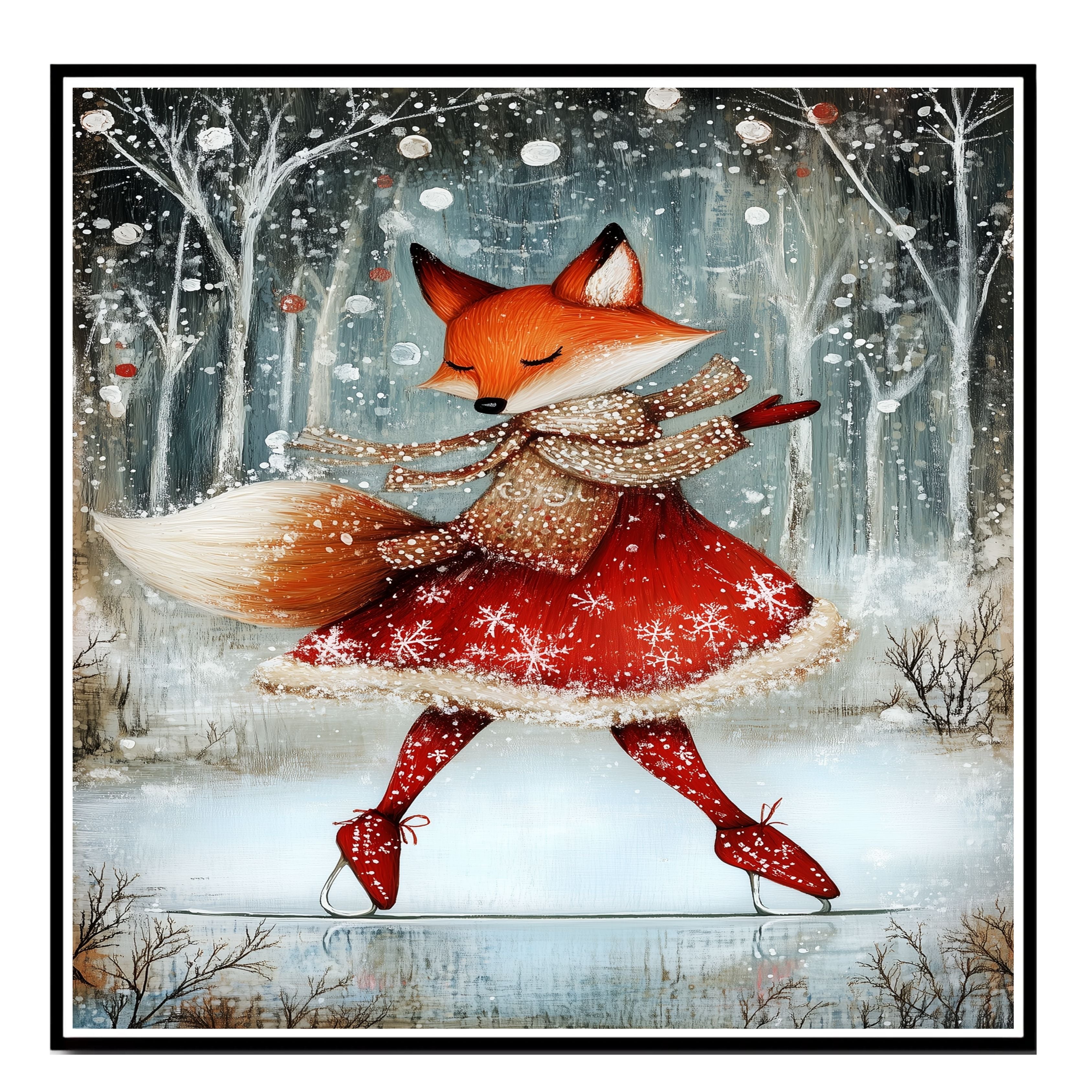 Add a touch of holiday magic with this whimsical Christmas fox ice skating in a red dress. Set in a snowy forest, this charming print is perfect for kids’ rooms, nurseries, or cozy seasonal decor. The joyful winter woodland scene is ideal for Christmas and winter lovers who adore animals and festive cheer. Makes a great gift or delightful addition to your holiday gallery wall.