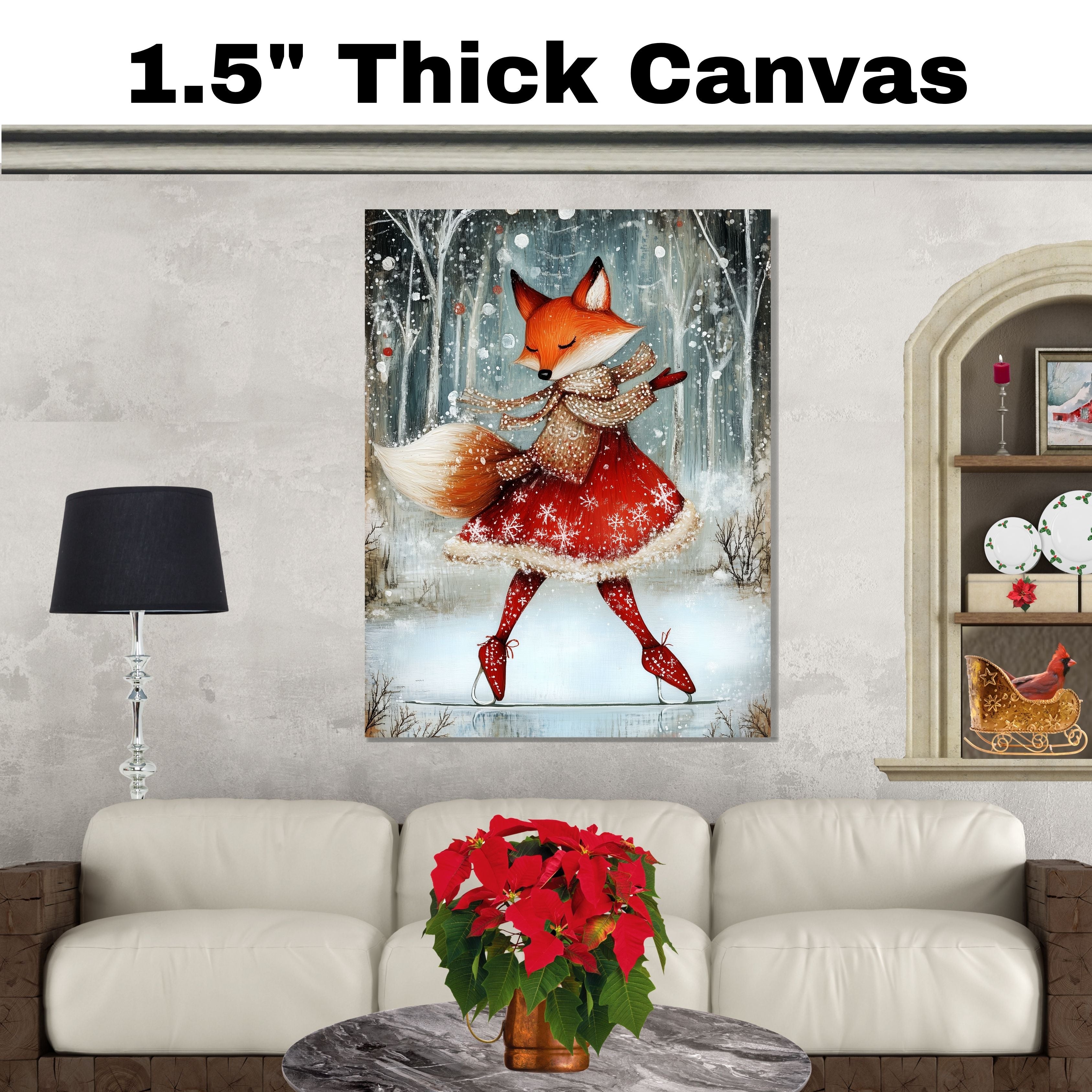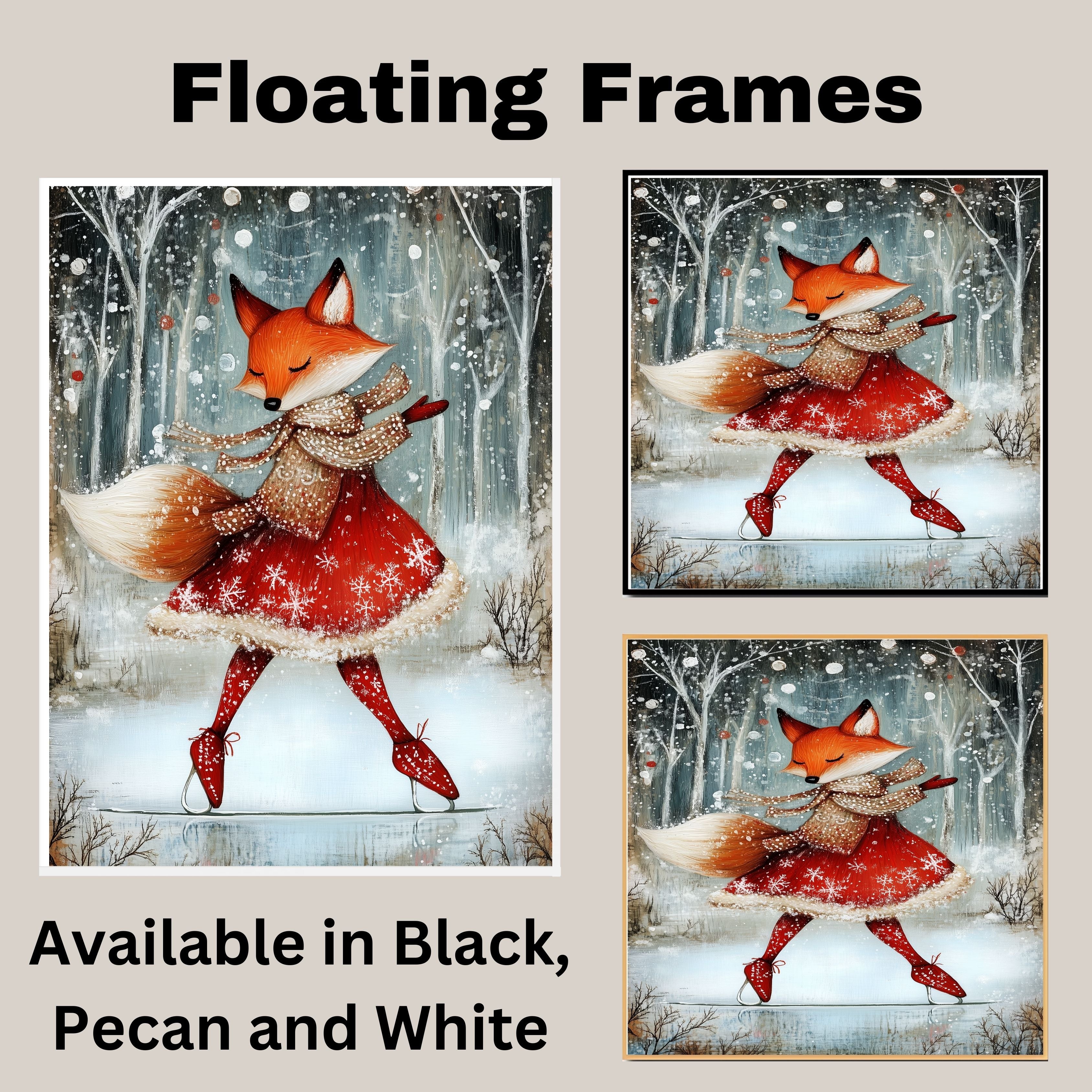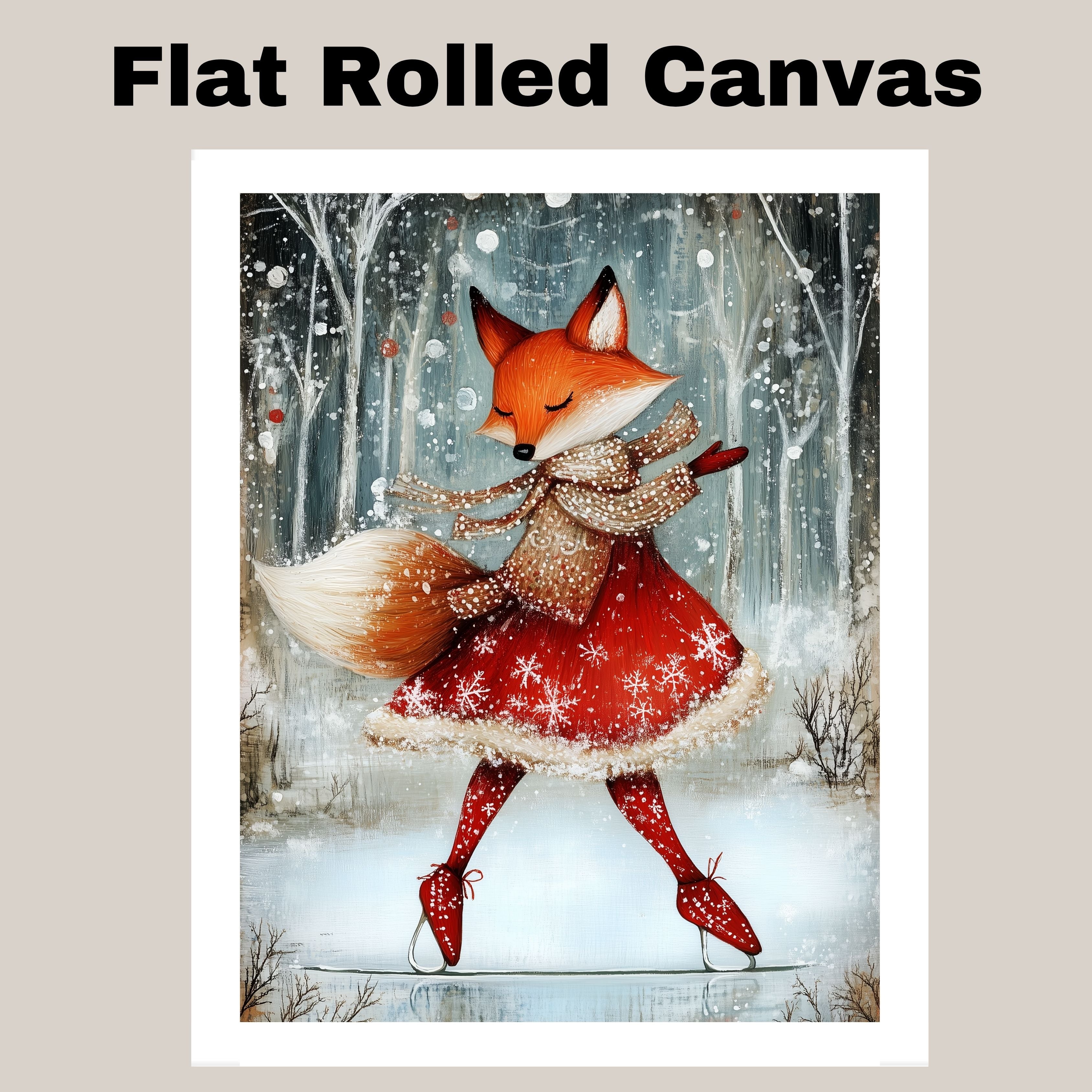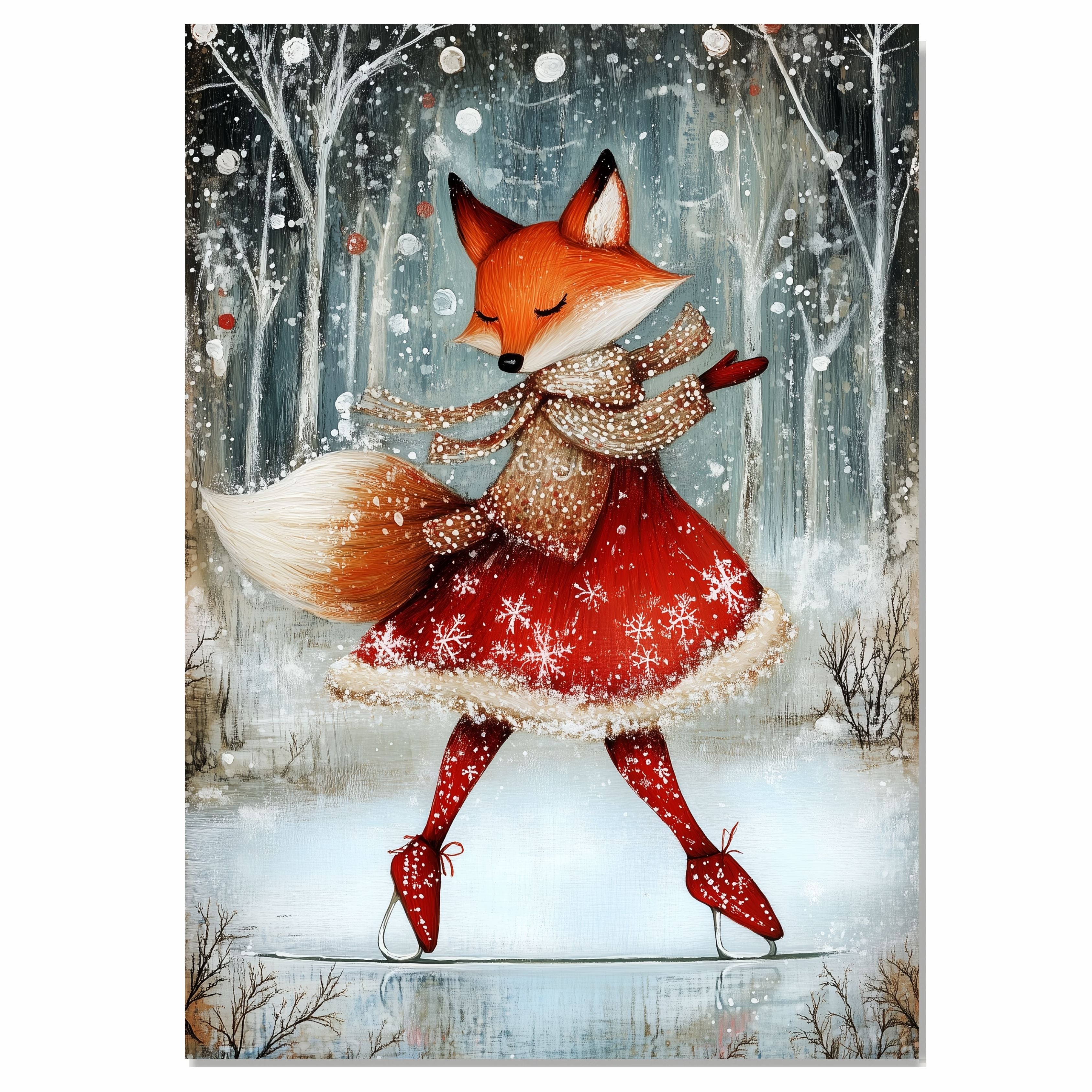 Add a touch of holiday magic with this whimsical Christmas fox ice skating in a red dress. Set in a snowy forest, this charming print is perfect for kids’ rooms, nurseries, or cozy seasonal decor. The joyful winter woodland scene is ideal for Christmas and winter lovers who adore animals and festive cheer. Makes a great gift or delightful addition to your holiday gallery wall.